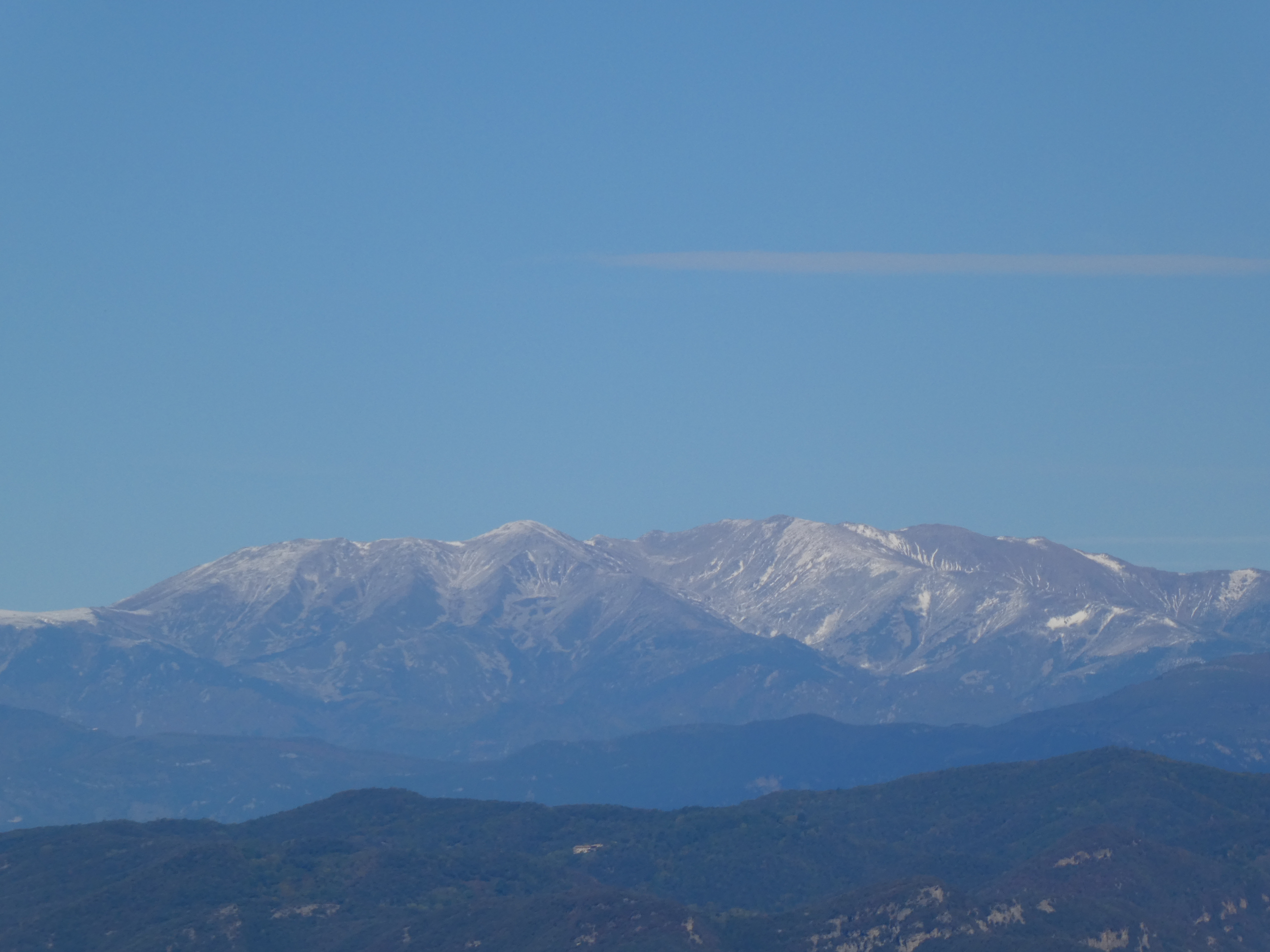 Zoom sur le massif du Canigou avec le Pic dels Set Homes (2651 m) à gauche, le Puig Roja (2724 m) au centre-gauche, le Puig dels Tres Vents (2731 m) et le Puig del Roc Negre (2714 m) au centre-droit