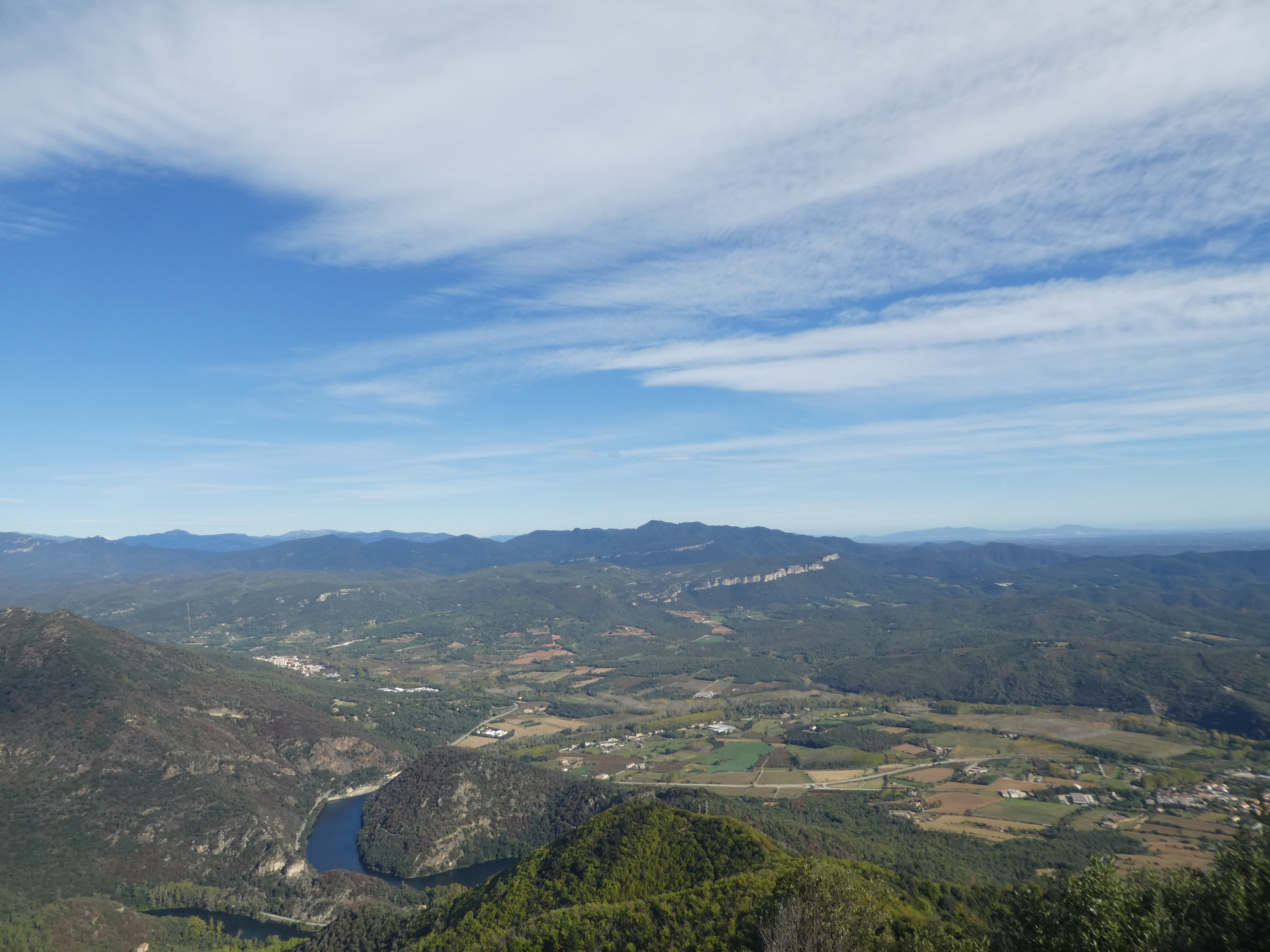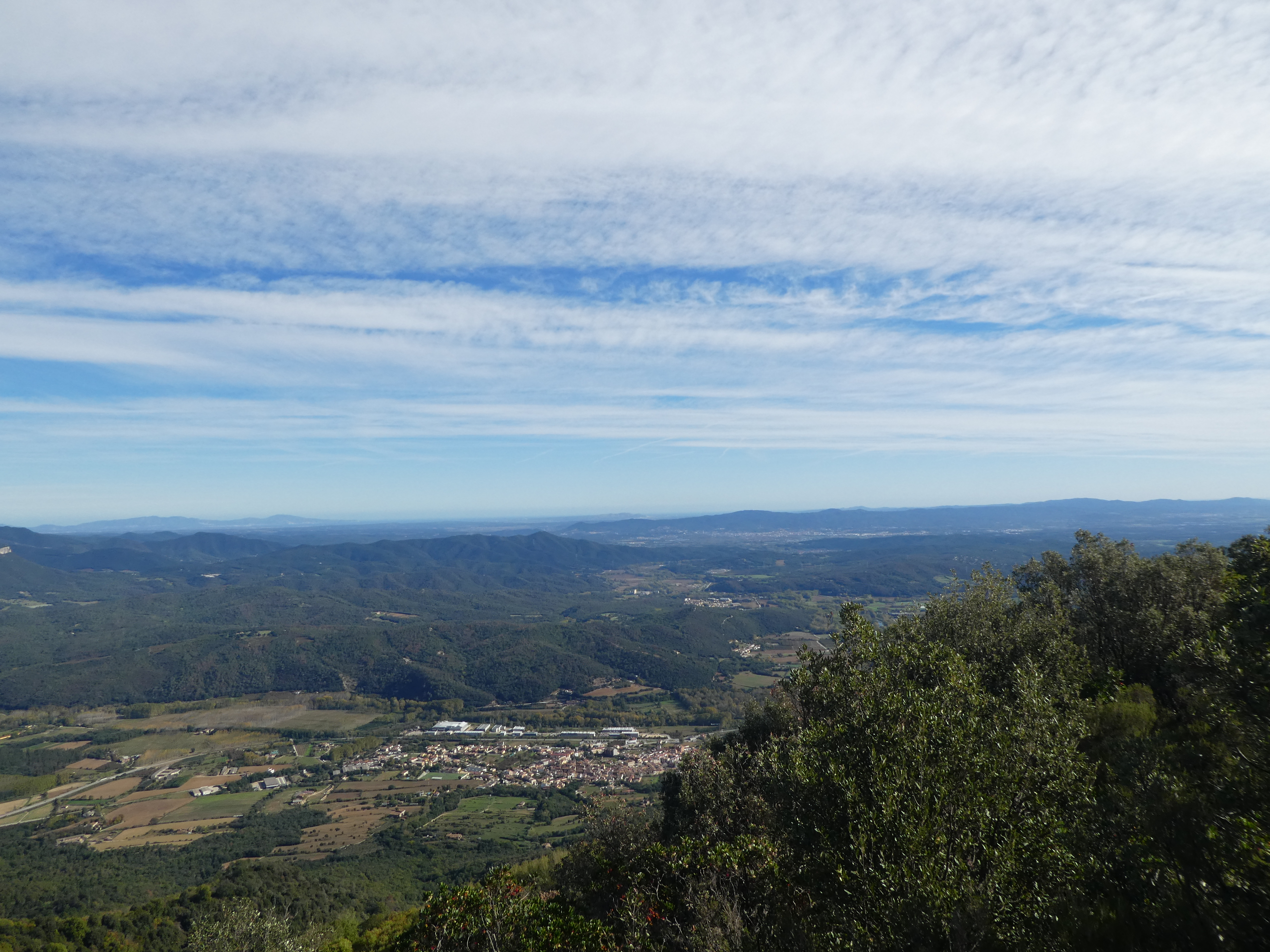 Arrivée au sommet du Puigdefrou ou Puig d'Afrou (839 m) : beau panorama sur les sommets de la Garrotxa, du Ripollès, du Conflent, de l'Empordà, du Gironès, de la Selva ainsi que la Vall del Ter et la plaine de l'Empordà
