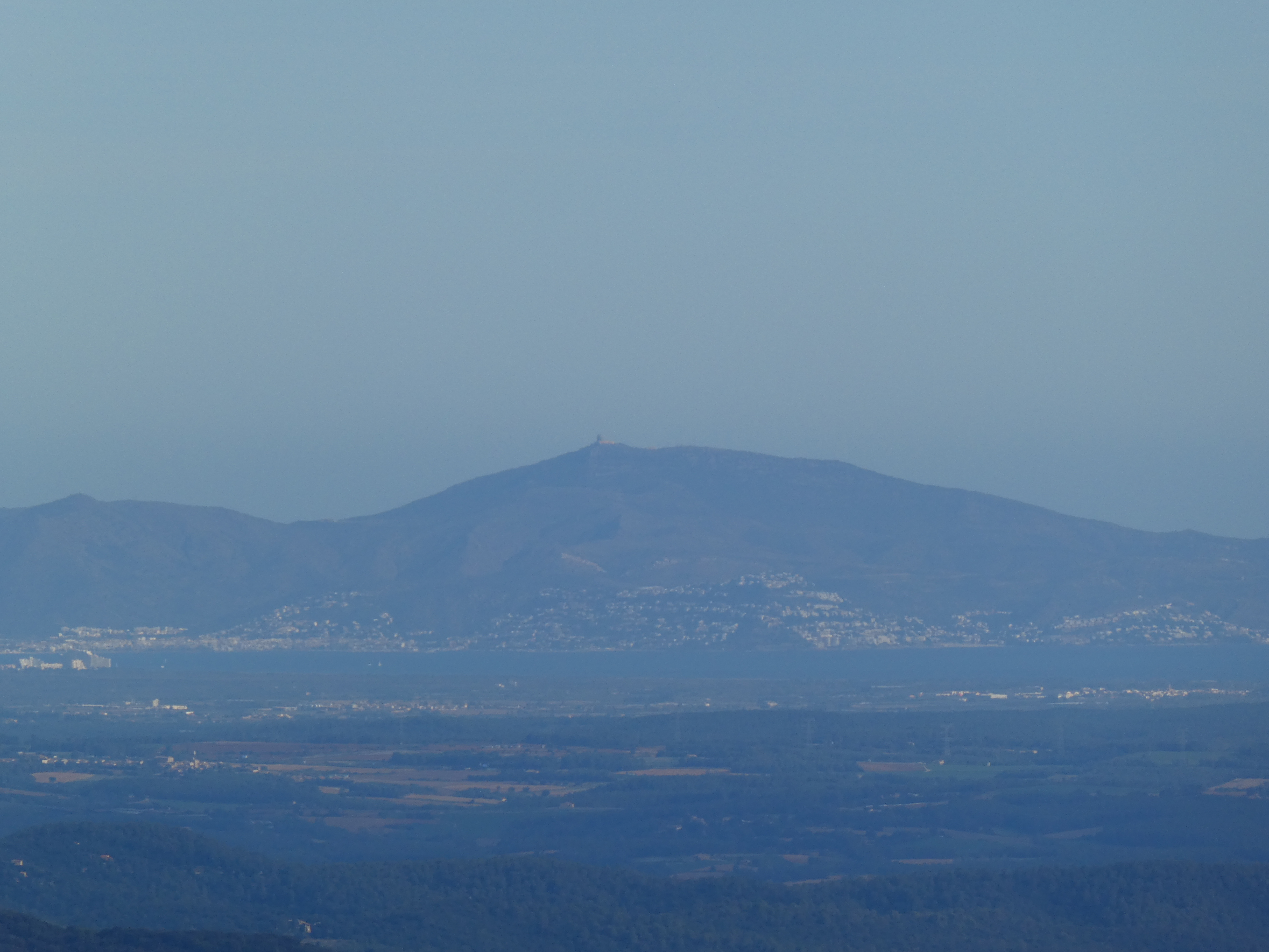 Zoom sur el Pení (608 m) et la station balnéaire de Roses en bas située à 58 kilomètres