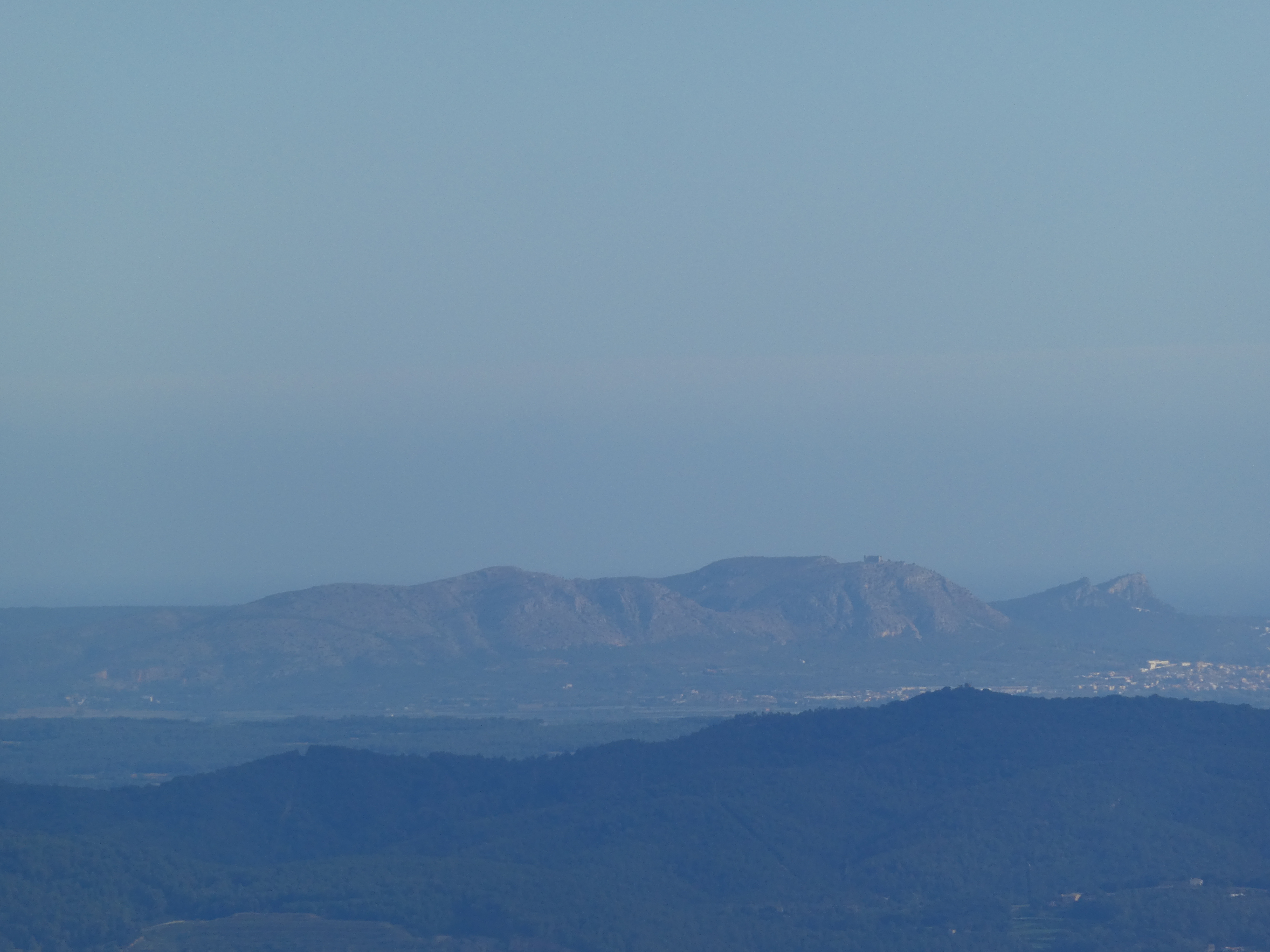Zoom sur la Muntanya del Montgrí avec le Puig Rodó (307 m) à gauche, le Castell del Montgrí (301 m) au centre, et la Roca Maura (225 m) dominant la station balnéaire de l'Estartit