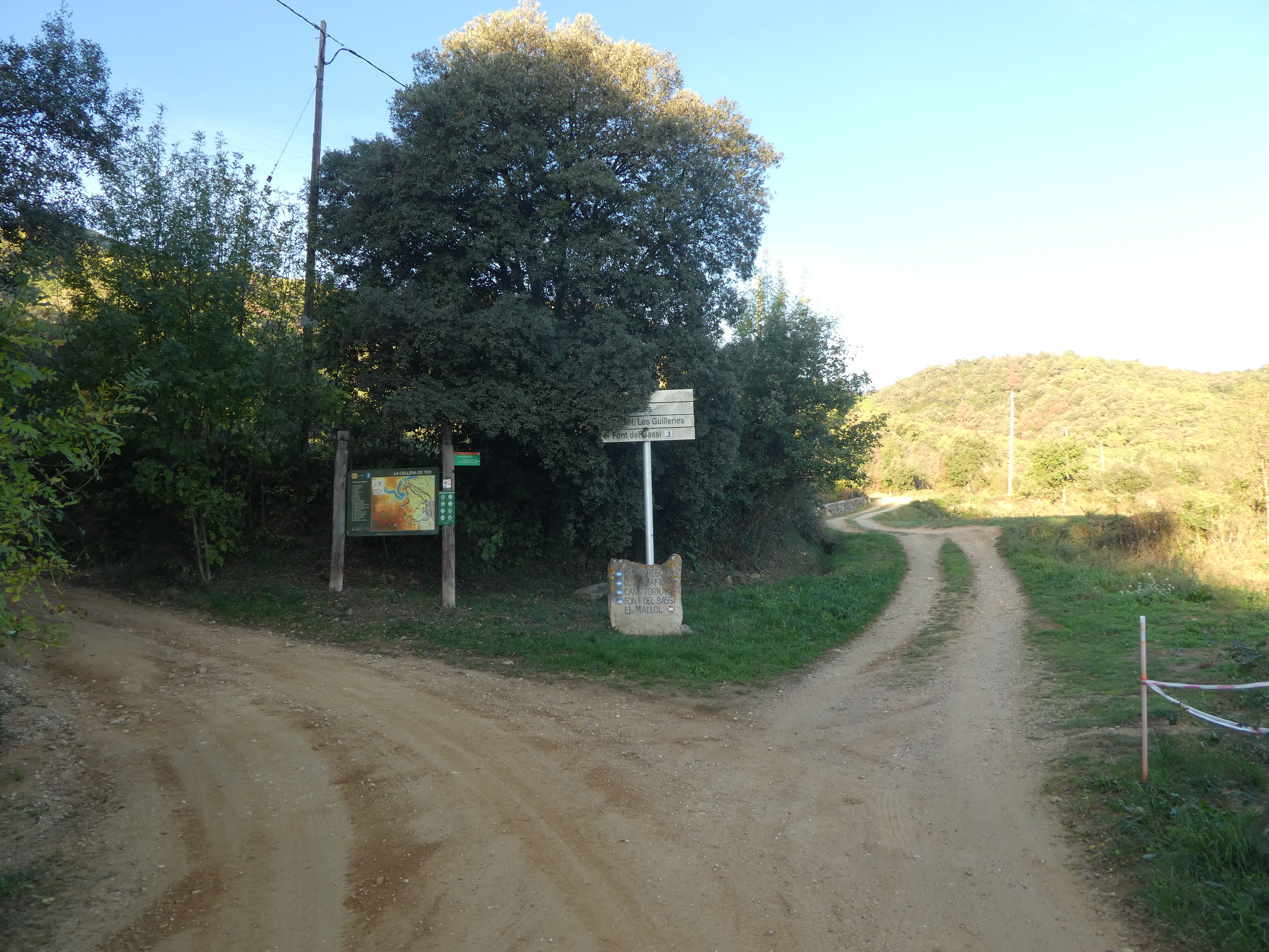 A ce croisement situé près du lieu-dit "la Roca" marqué par la présence d'un plot directionnel (1000 mètres après avoir passé la Font del Bassi), suivre le large chemin partant tout droit direction Puigdefrou, balisé sporadiquement en balises VTT n°25