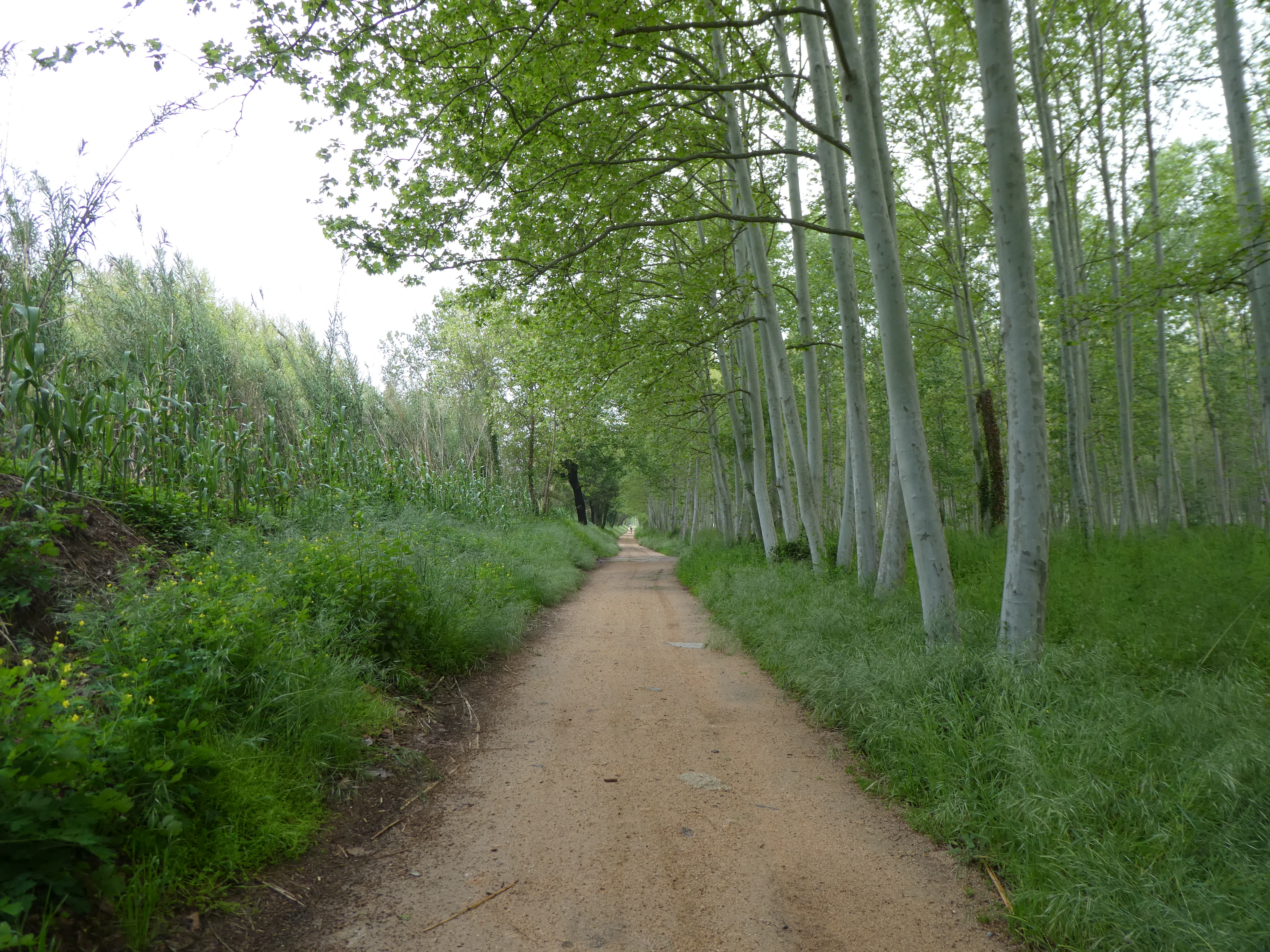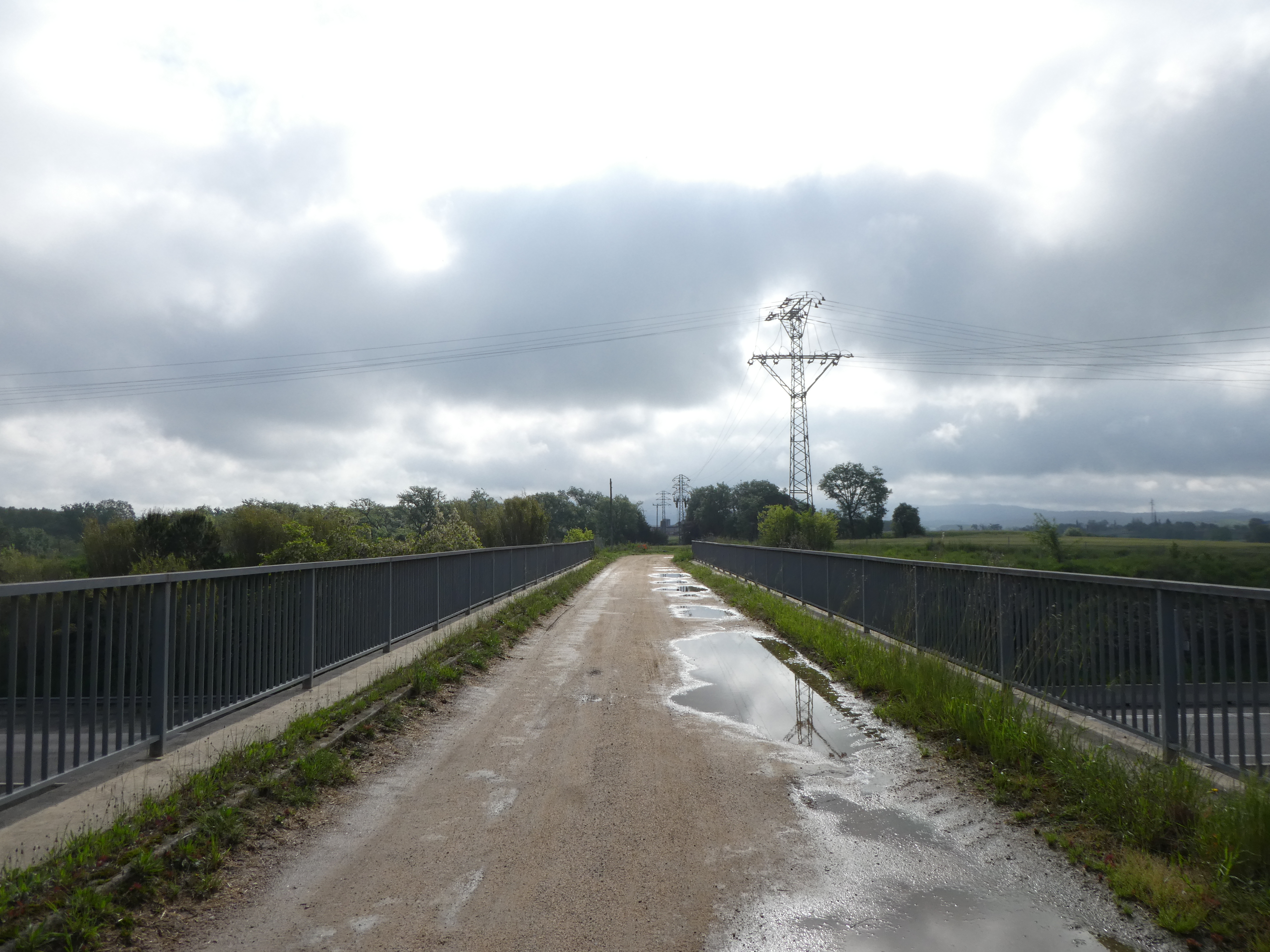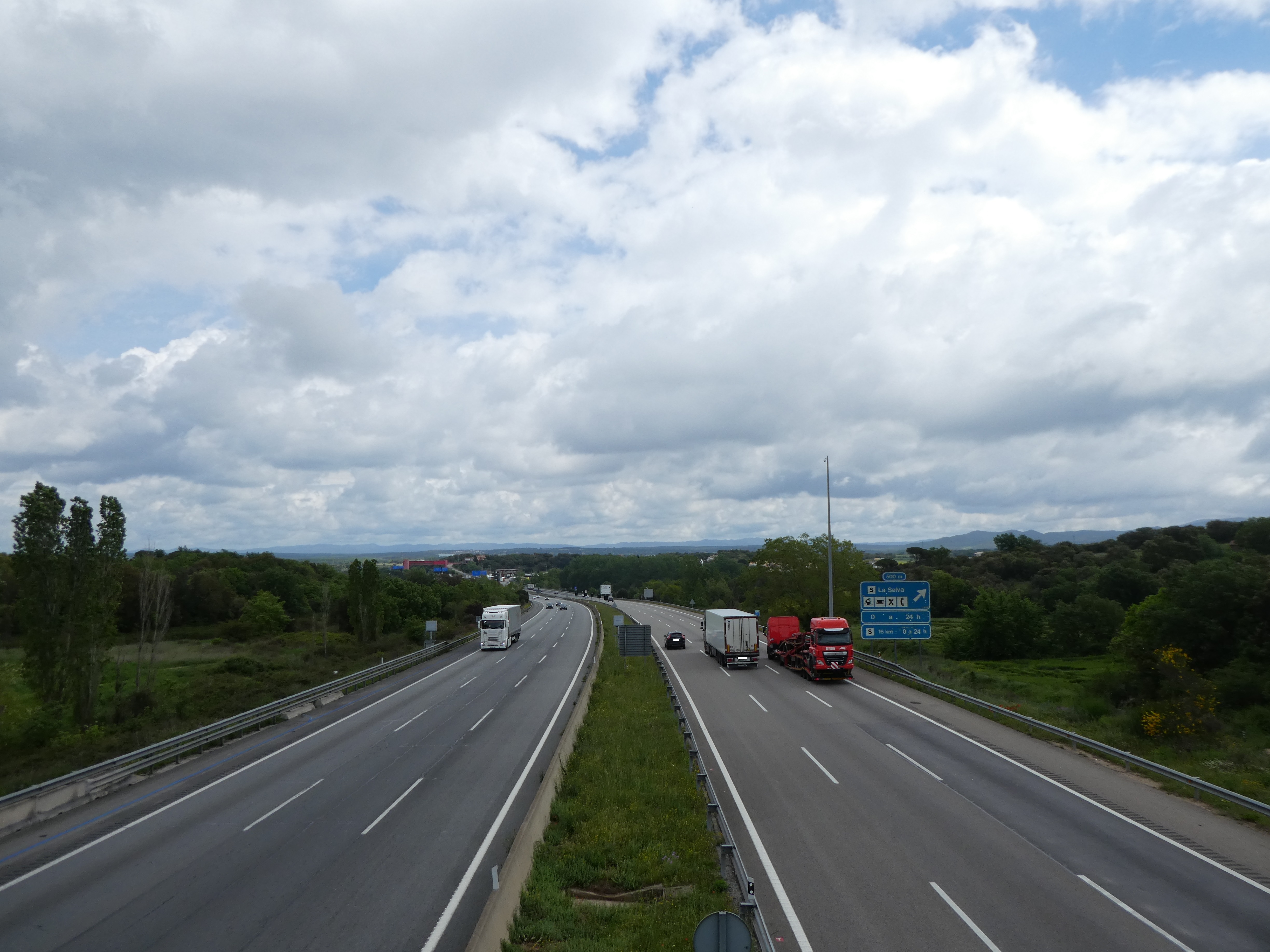 A ce croisement situé juste avant le pont enjambant l'AP-7 marqué par la présence d'un panneau directionnel (600 mètres après le précédent), suivre le chemin partant sur la gauche direction Maçanet de la Selva, balisé en orange