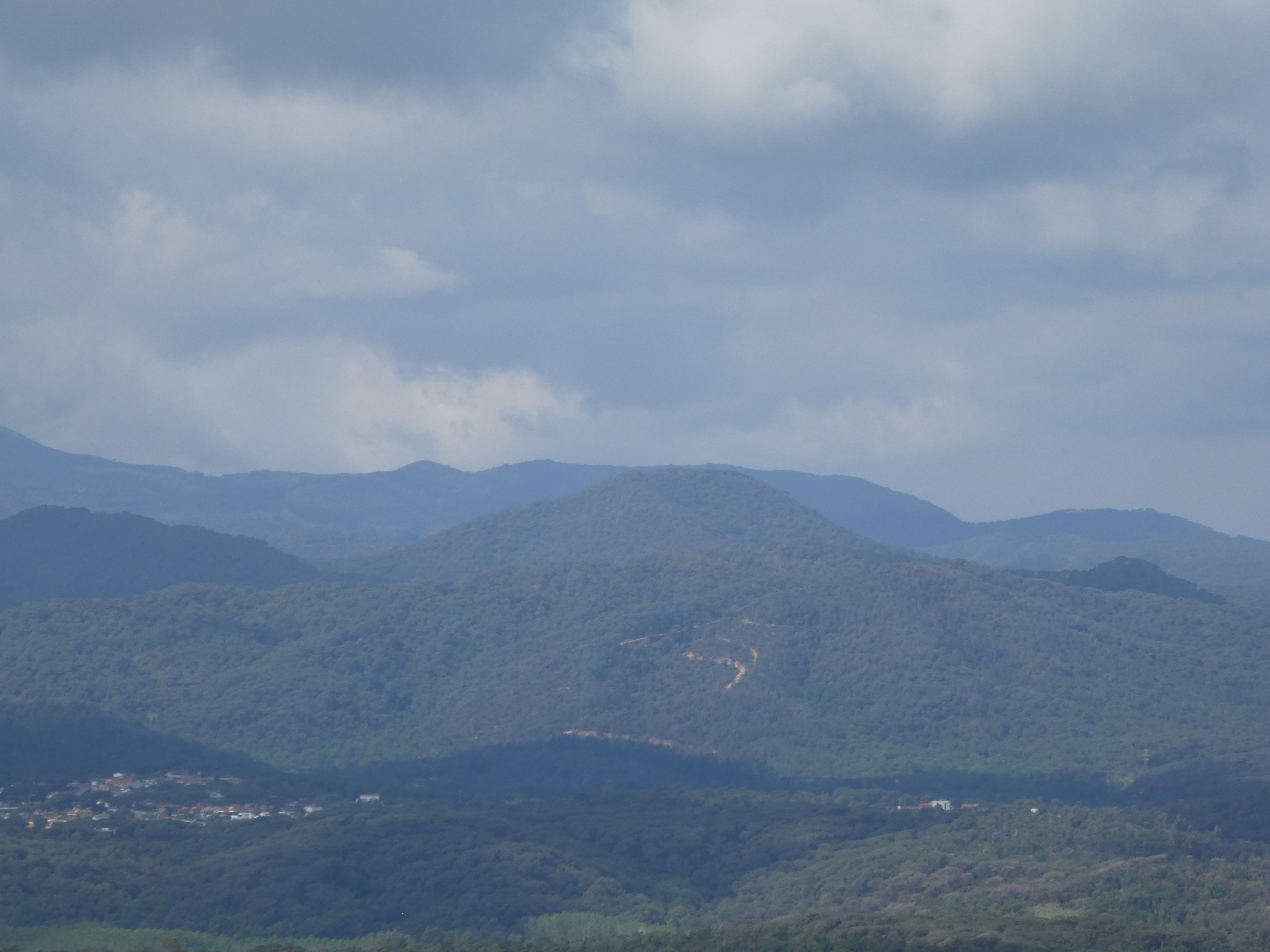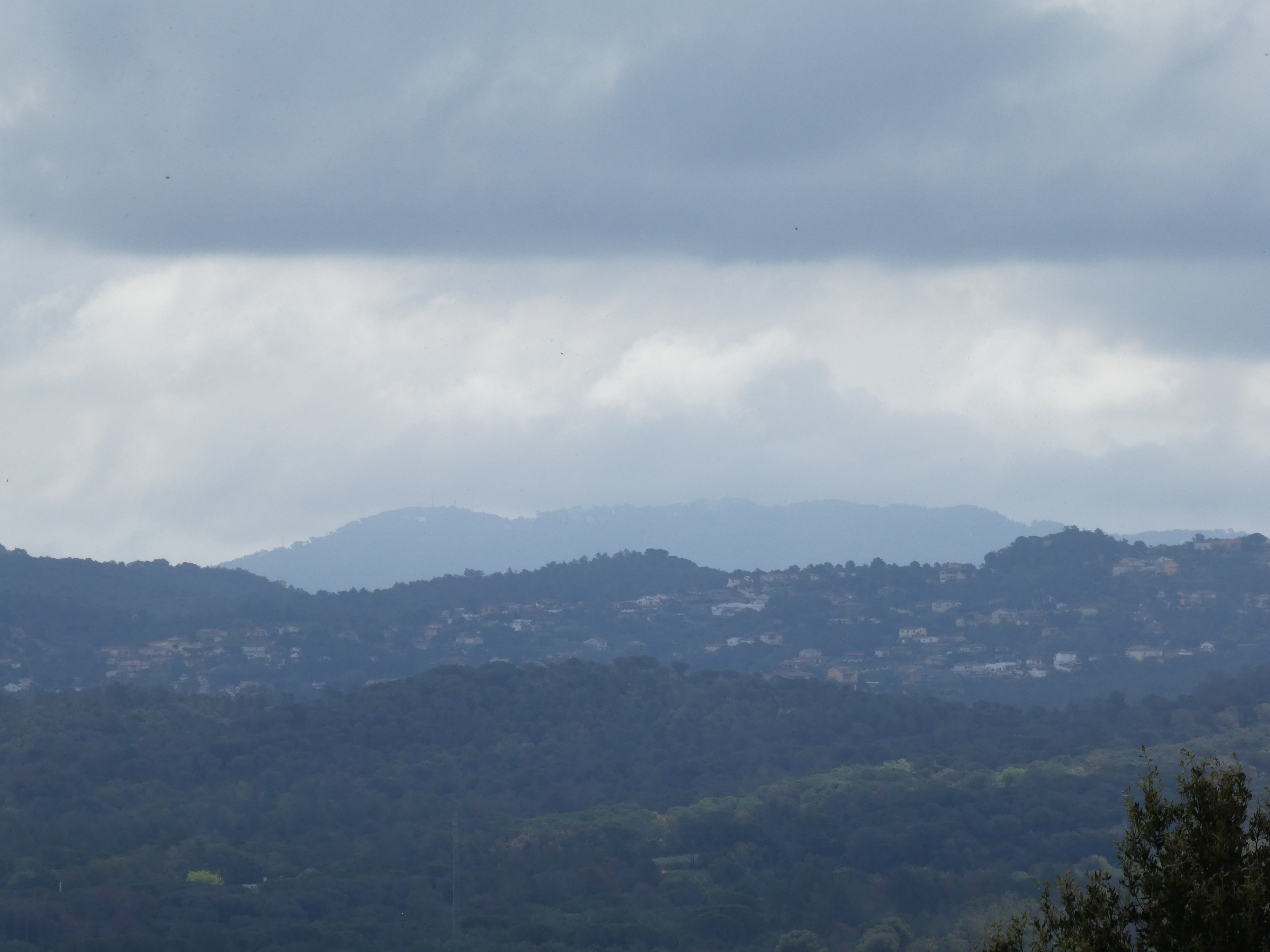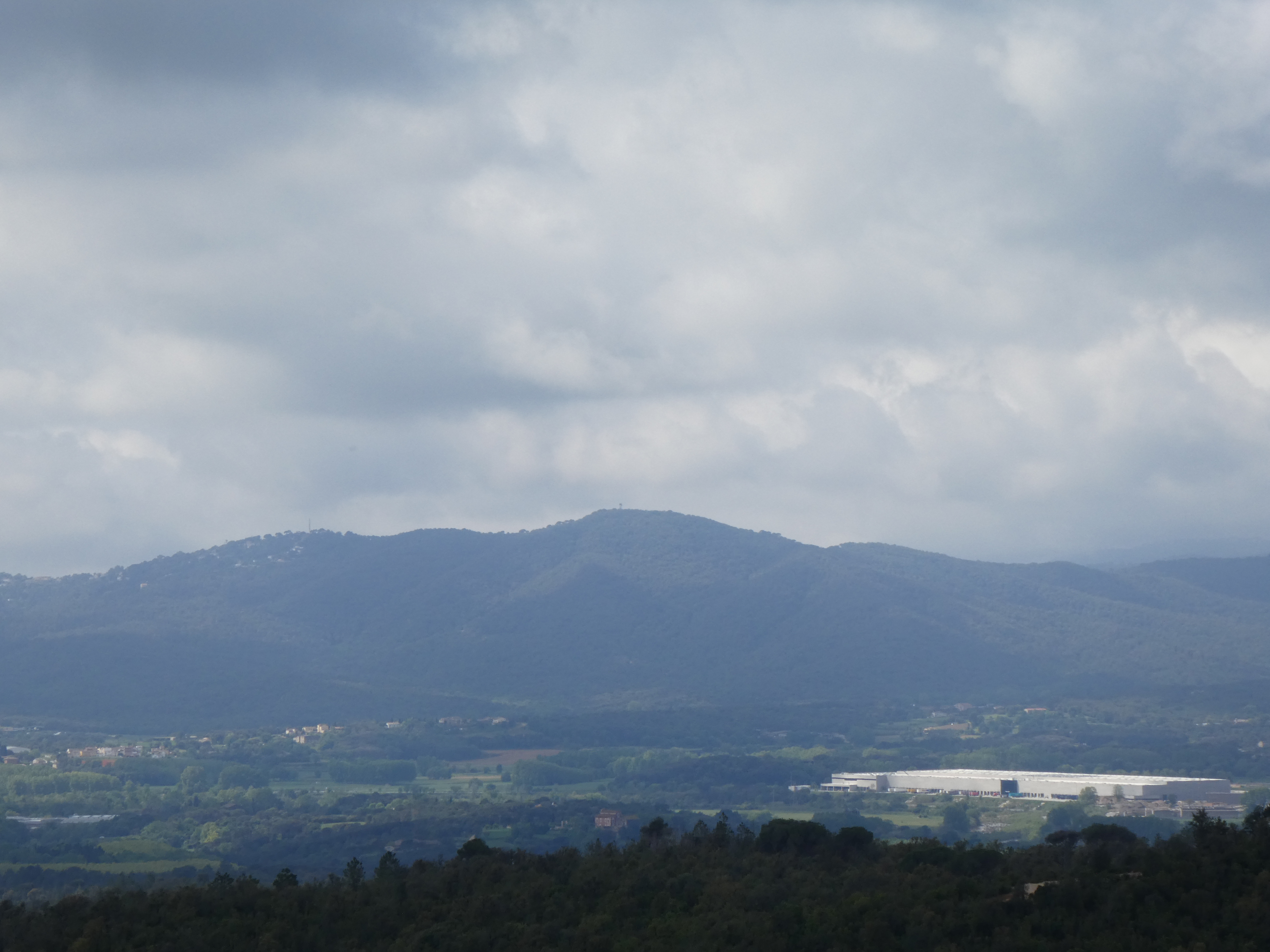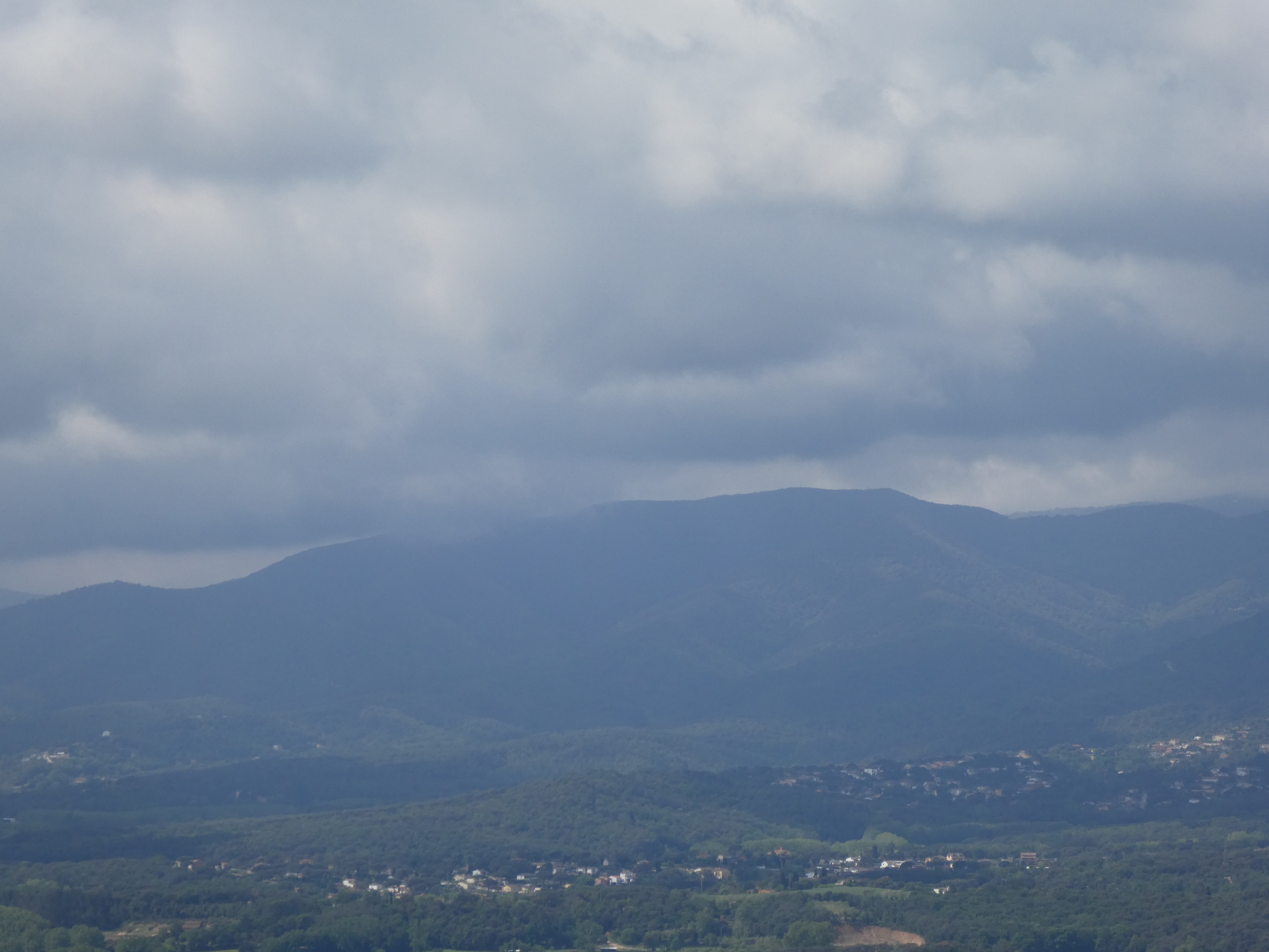 Zoom sur le Puig d'en Caselles (628 m) à gauche et le Turó Gros (758 m) à droite dans les nuages ... en bas, on aperçoit Fogars de la Selva situé à 5 kilomètres