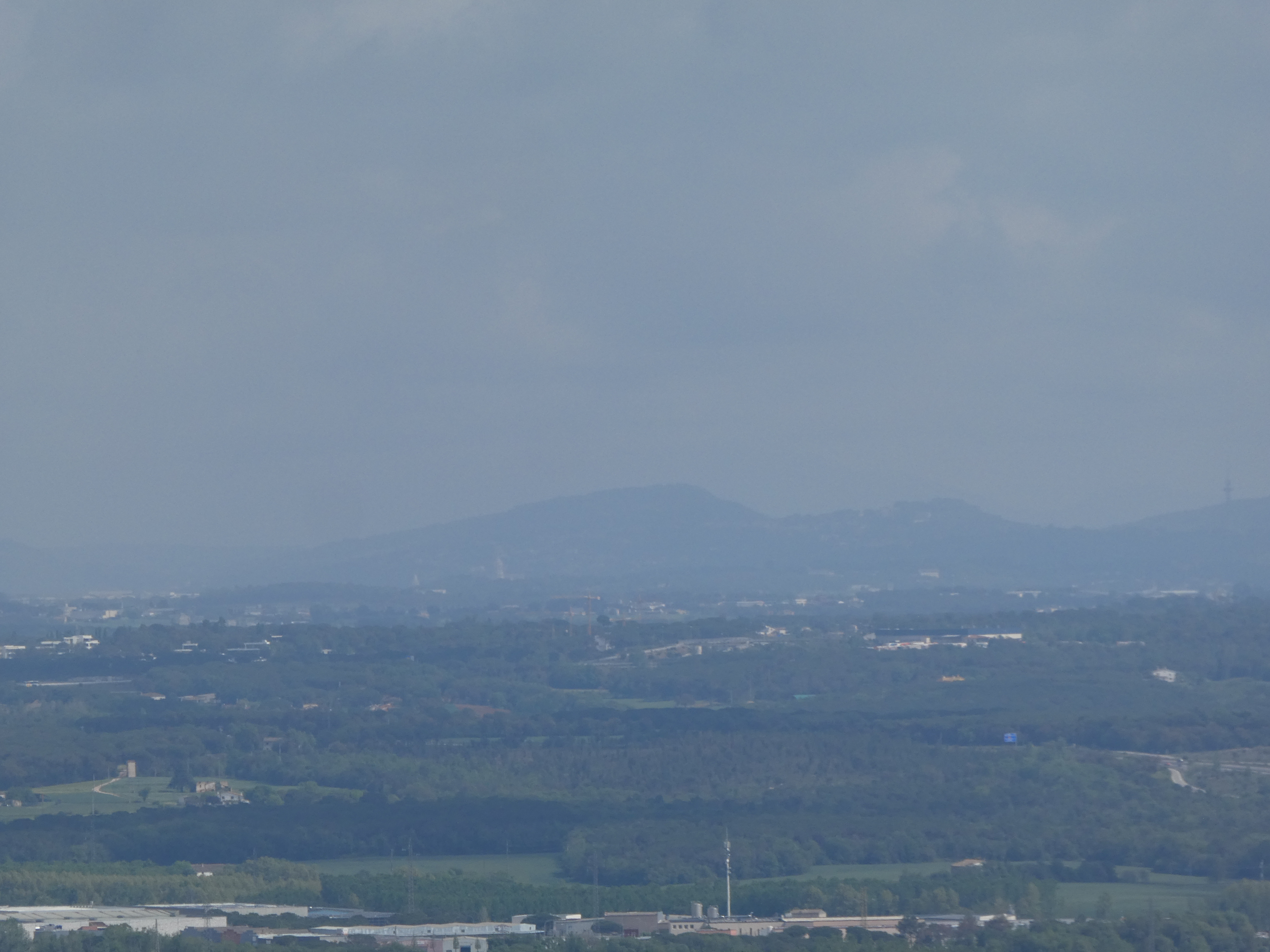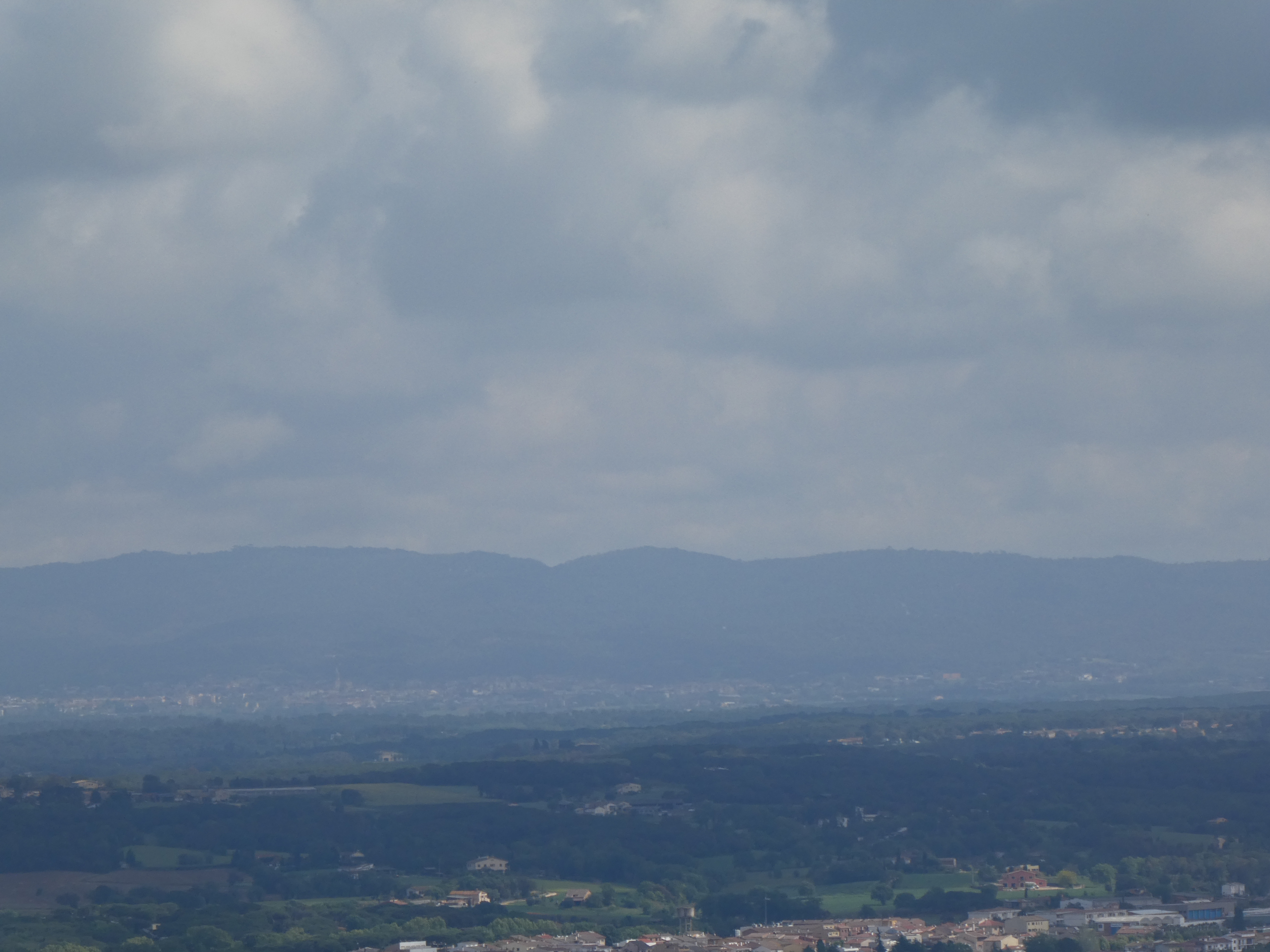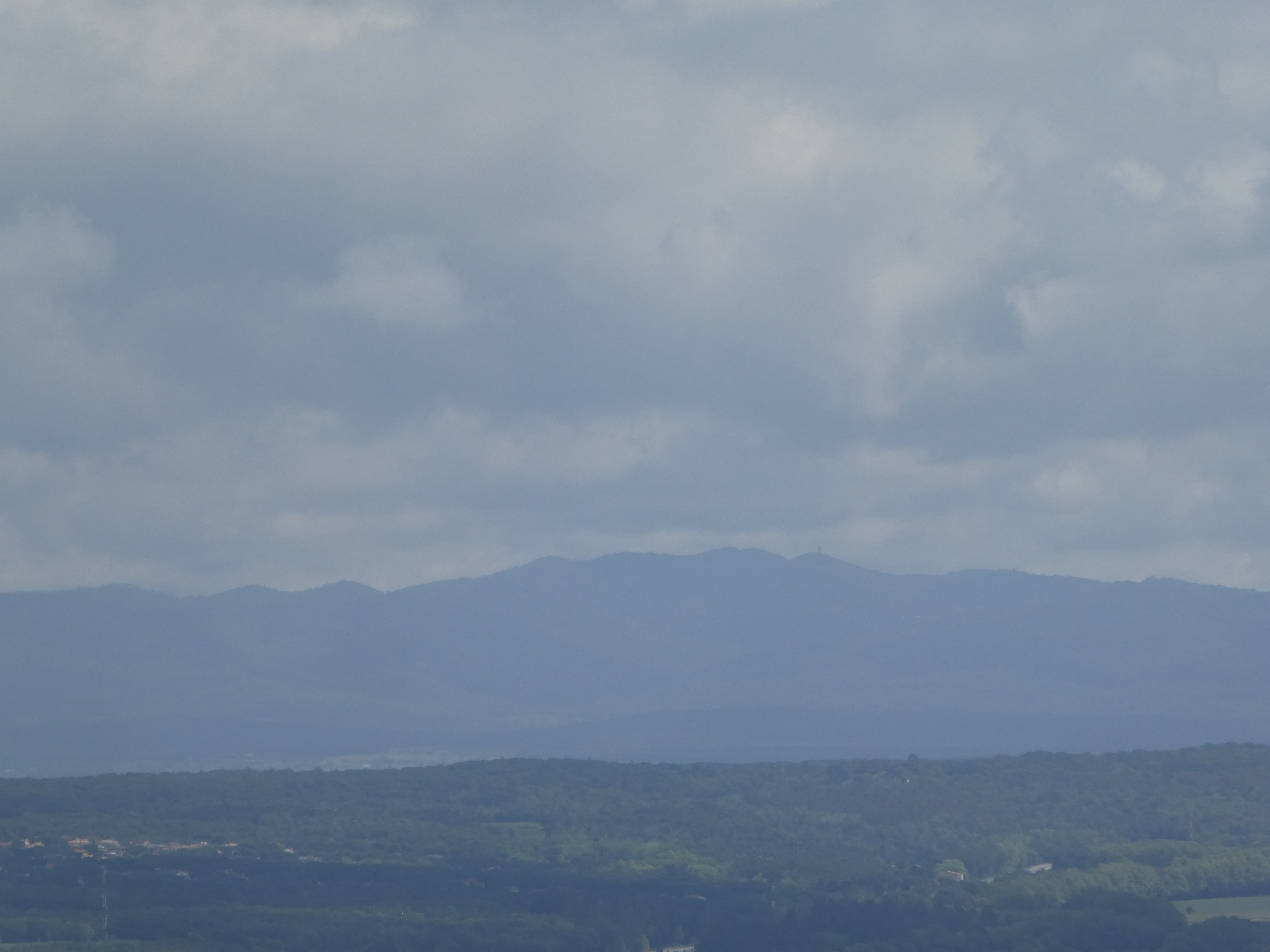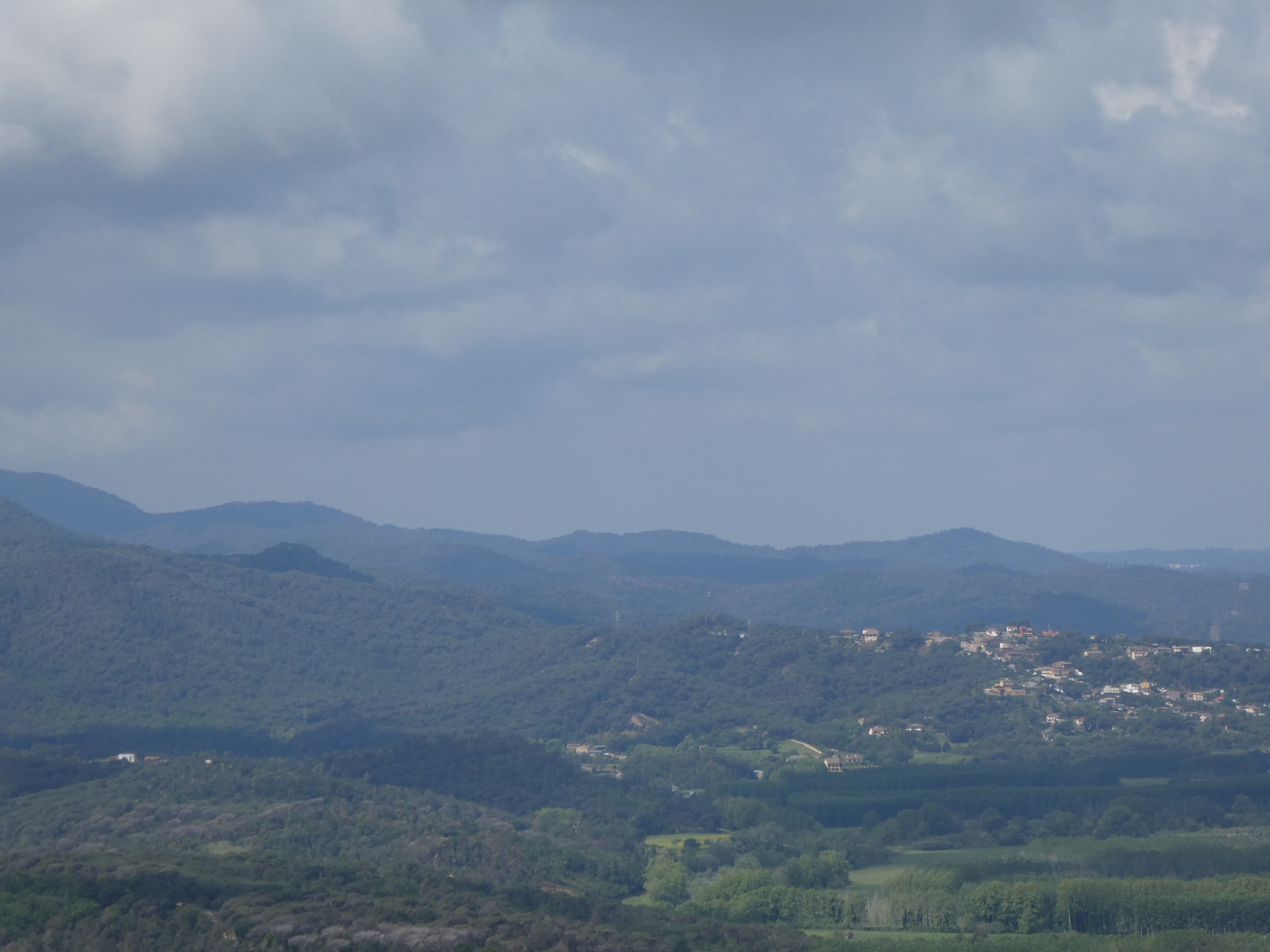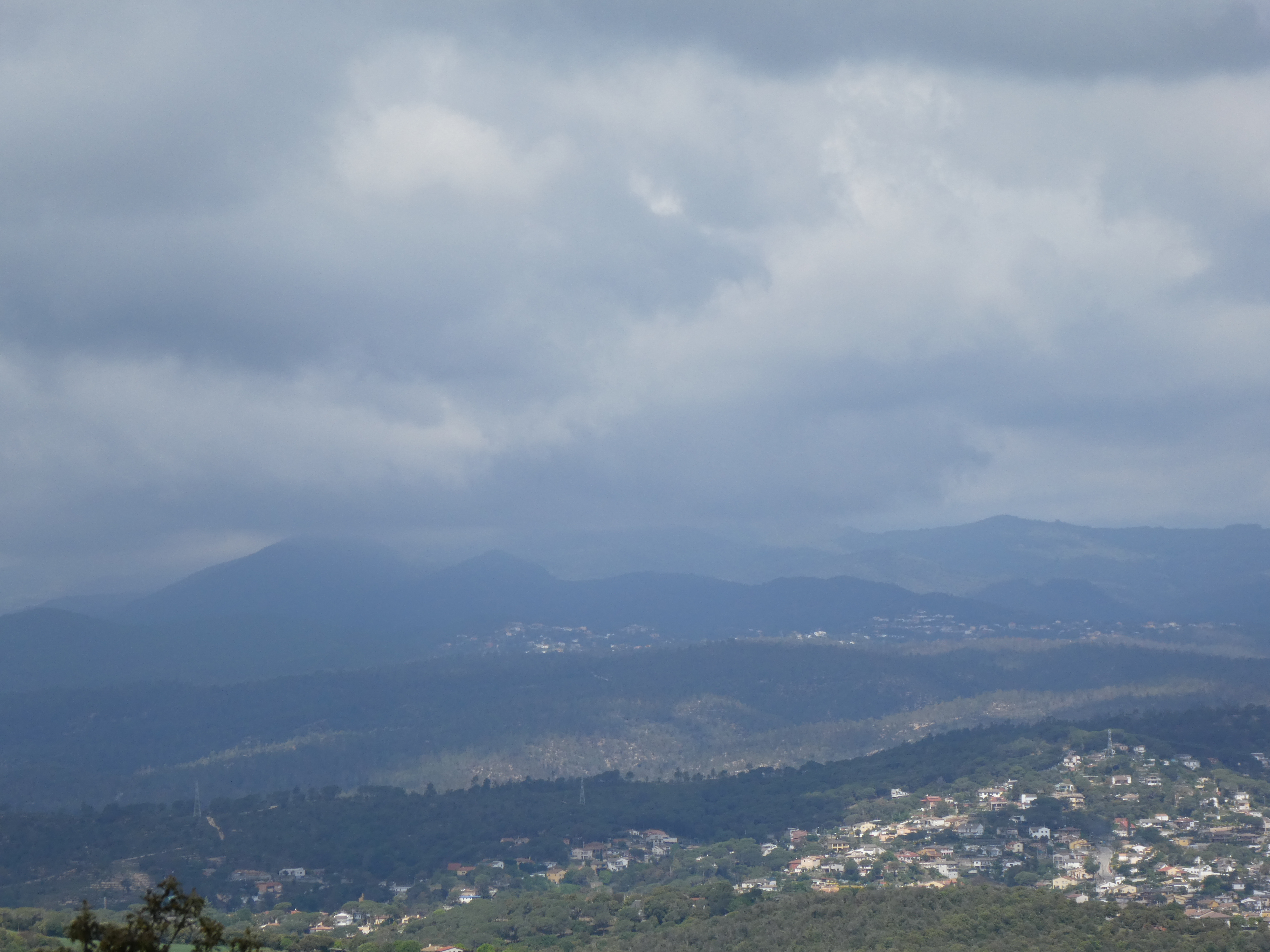 Zoom sur le Puig d'en Caselles (628 m) à gauche et le Turó Gros (758 m) à droite dans les nuages ... en bas, on aperçoit Fogars de la Selva situé à 5 kilomètres