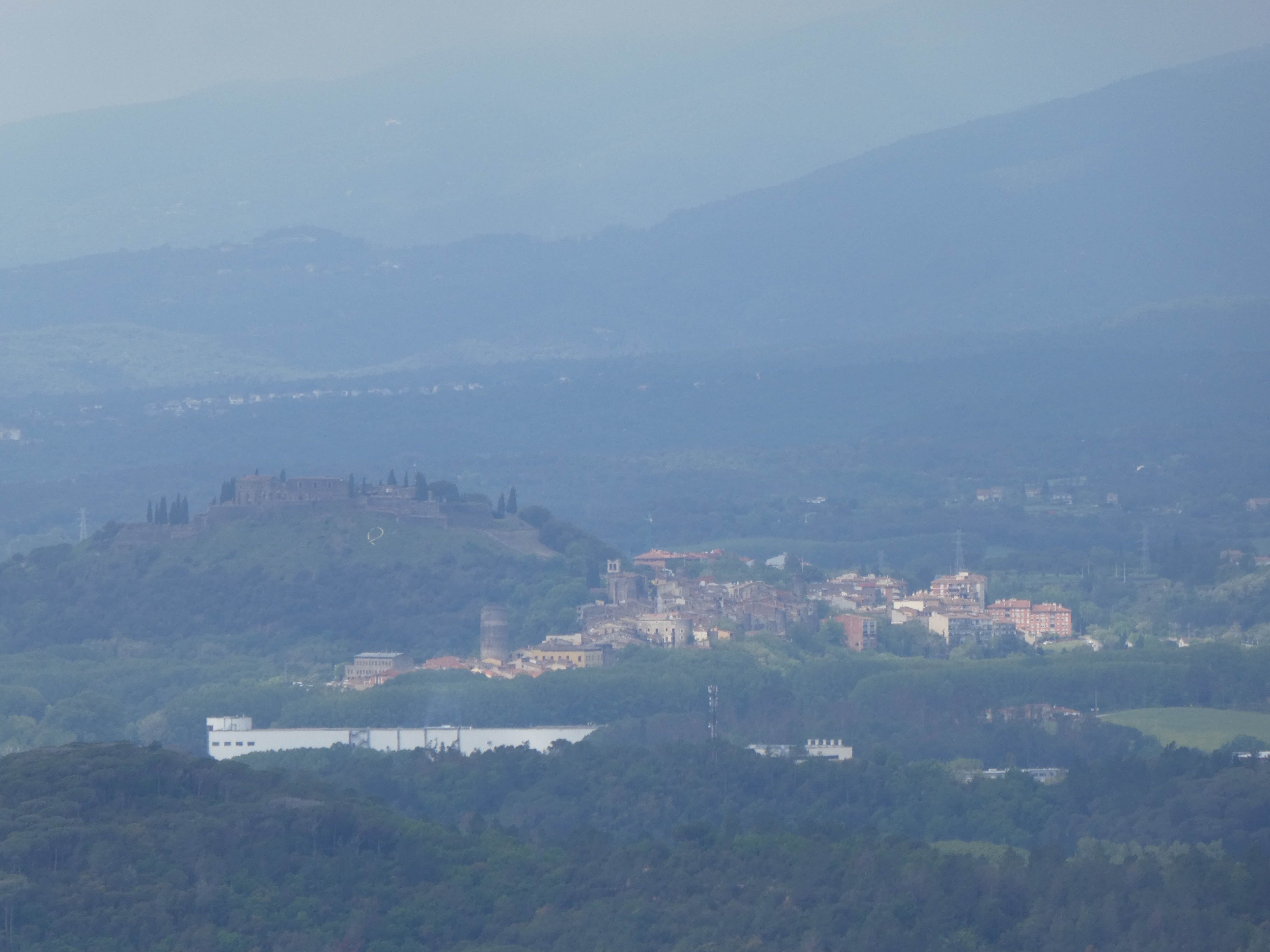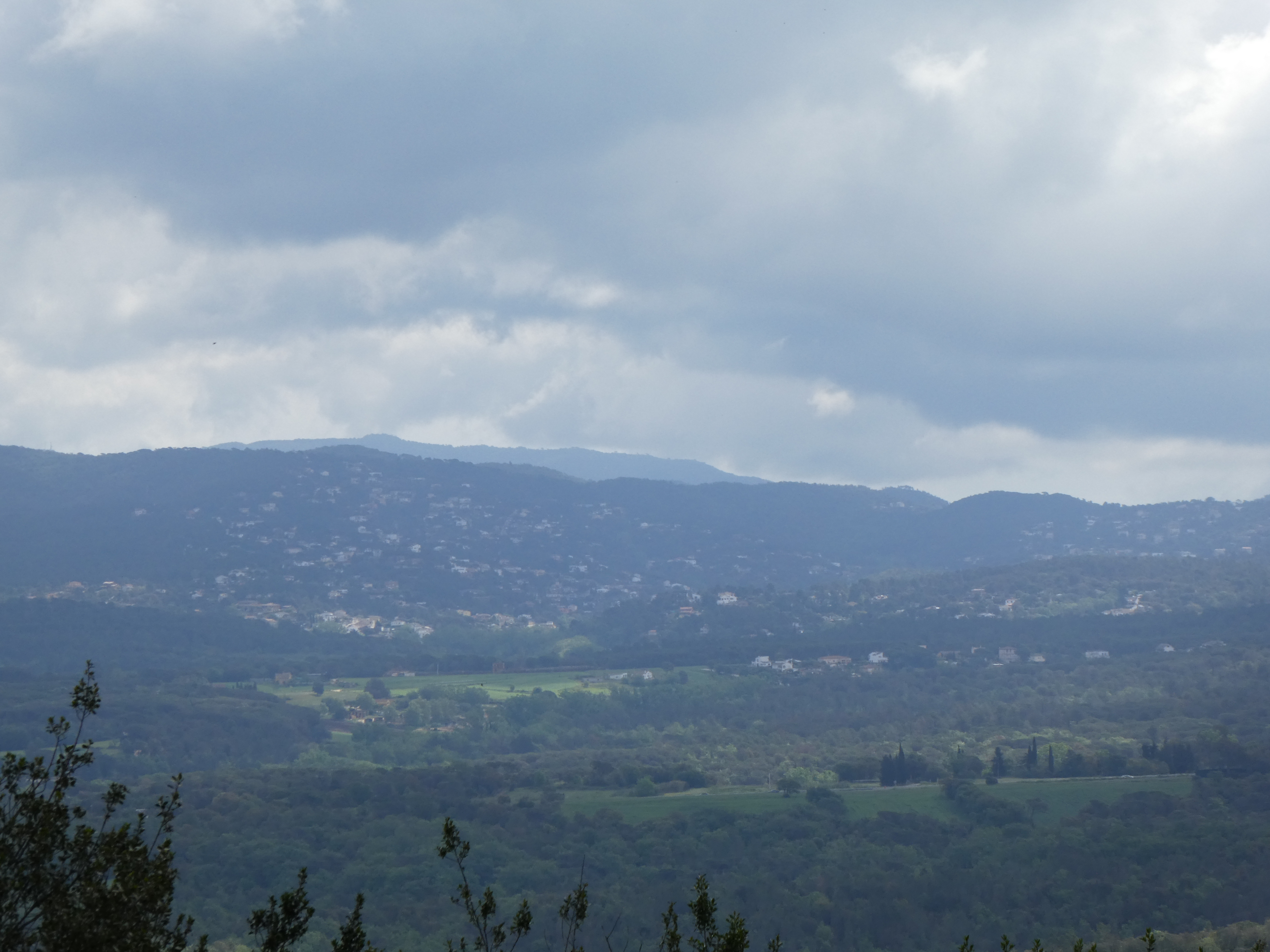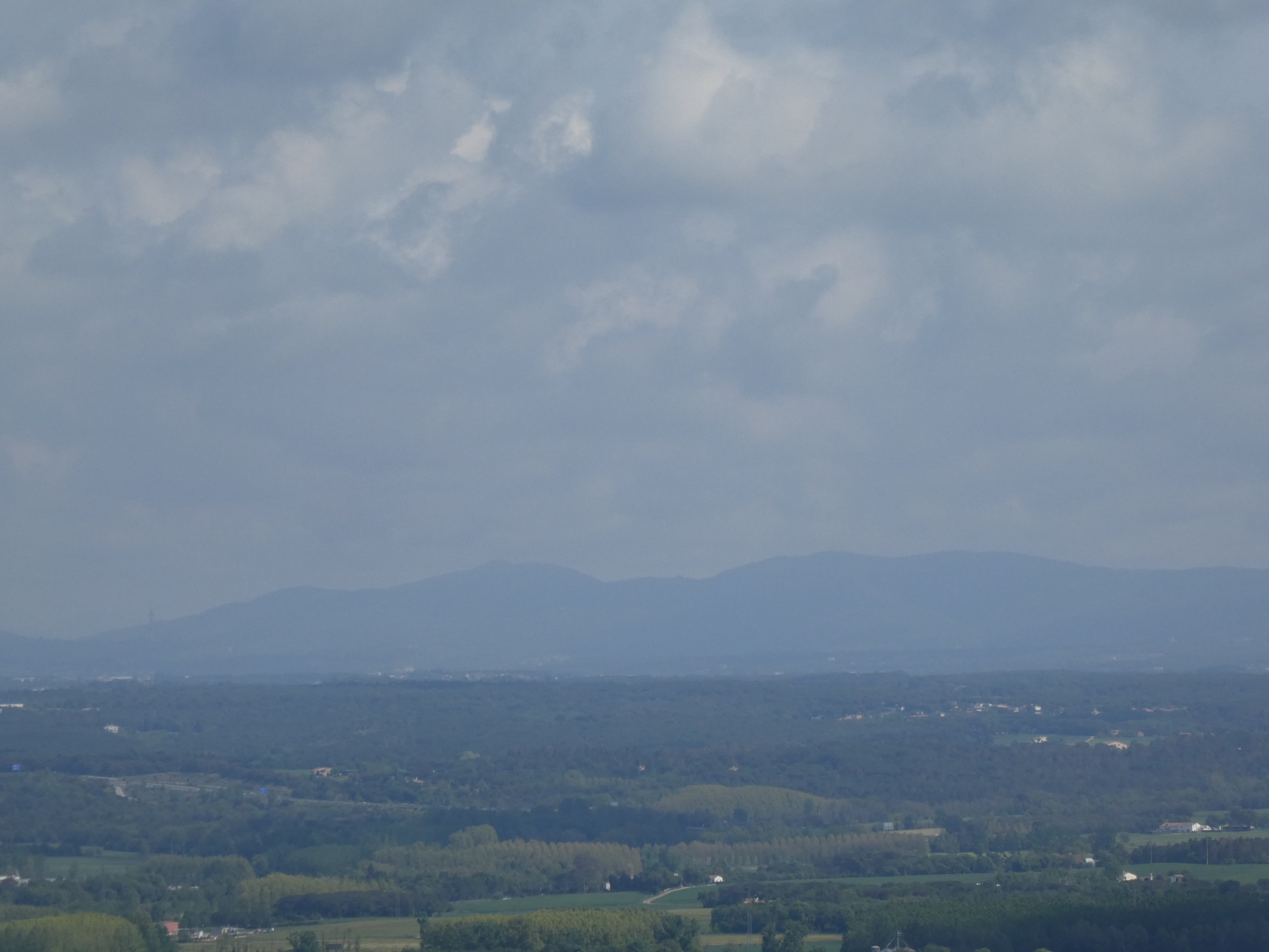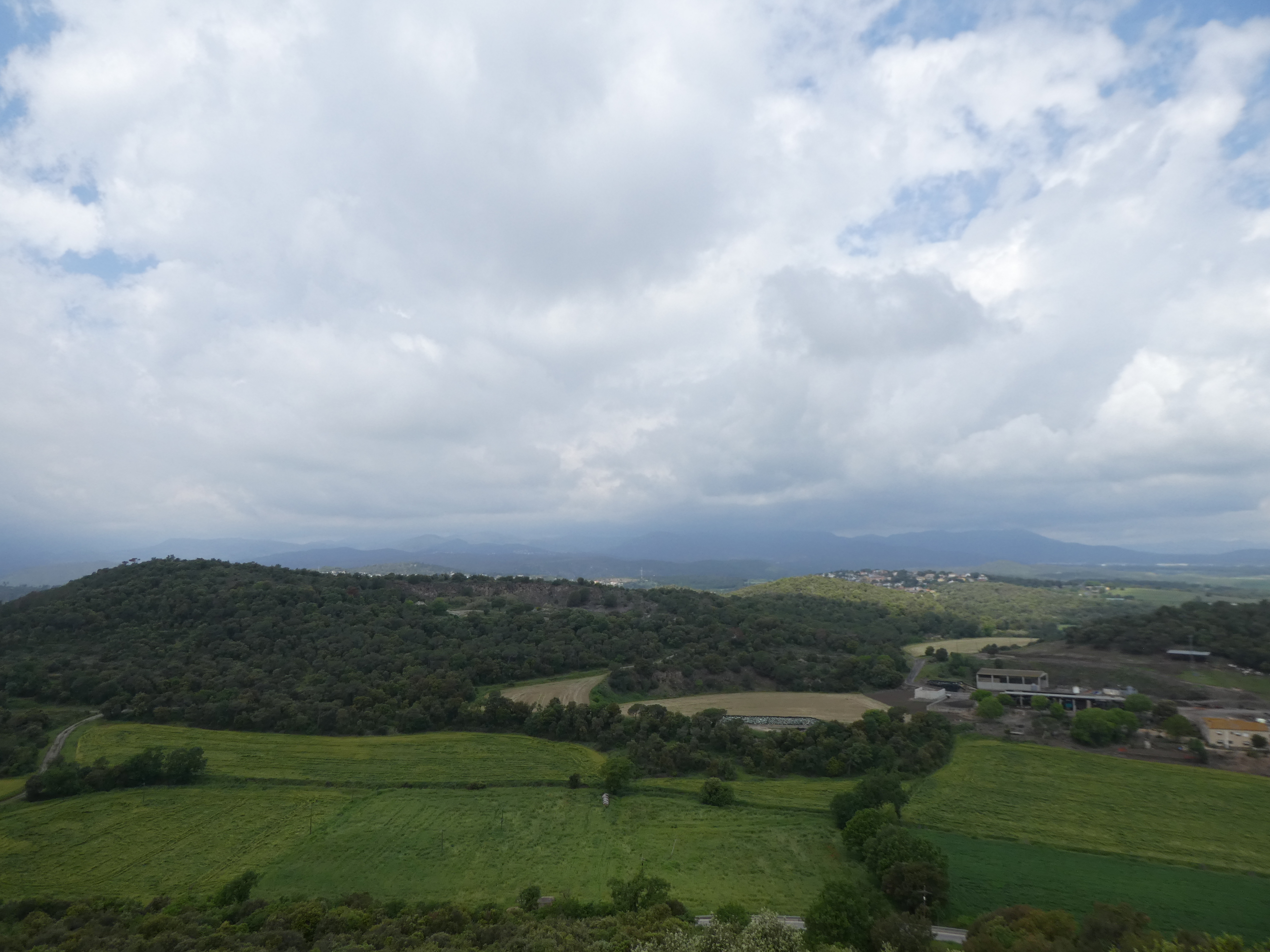 Zoom sur le Puig d'en Caselles (628 m) à gauche et le Turó Gros (758 m) à droite dans les nuages ... en bas, on aperçoit Fogars de la Selva situé à 5 kilomètres