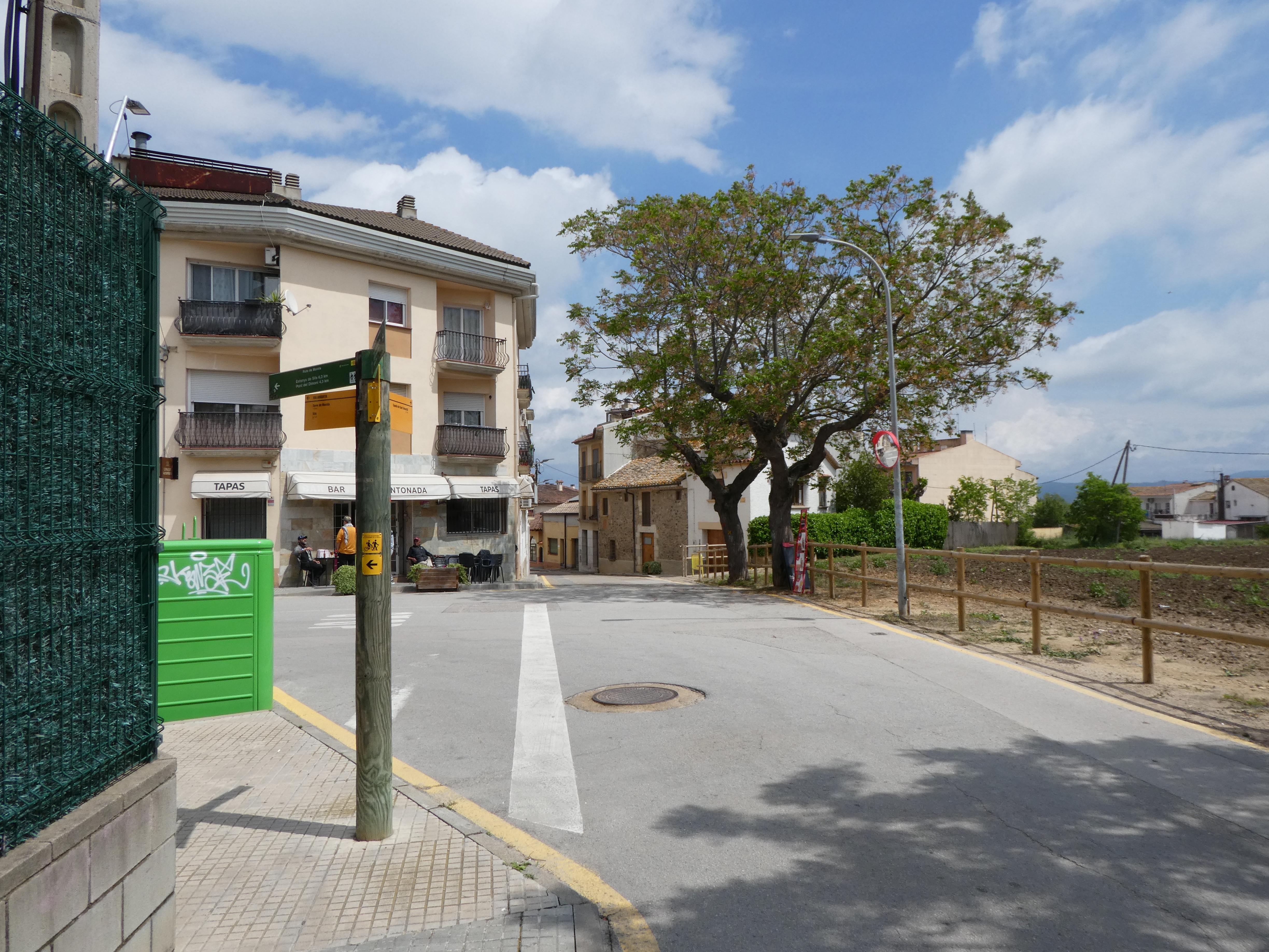 A cette intersection marquée par la présence d'un panneau directionnel (50 mètres après le précédent croisement), suivre la rue partant sur la gauche direction Maçanet de la Selva - Camp de Futbol, balisé en jaune et bleu, et en orange