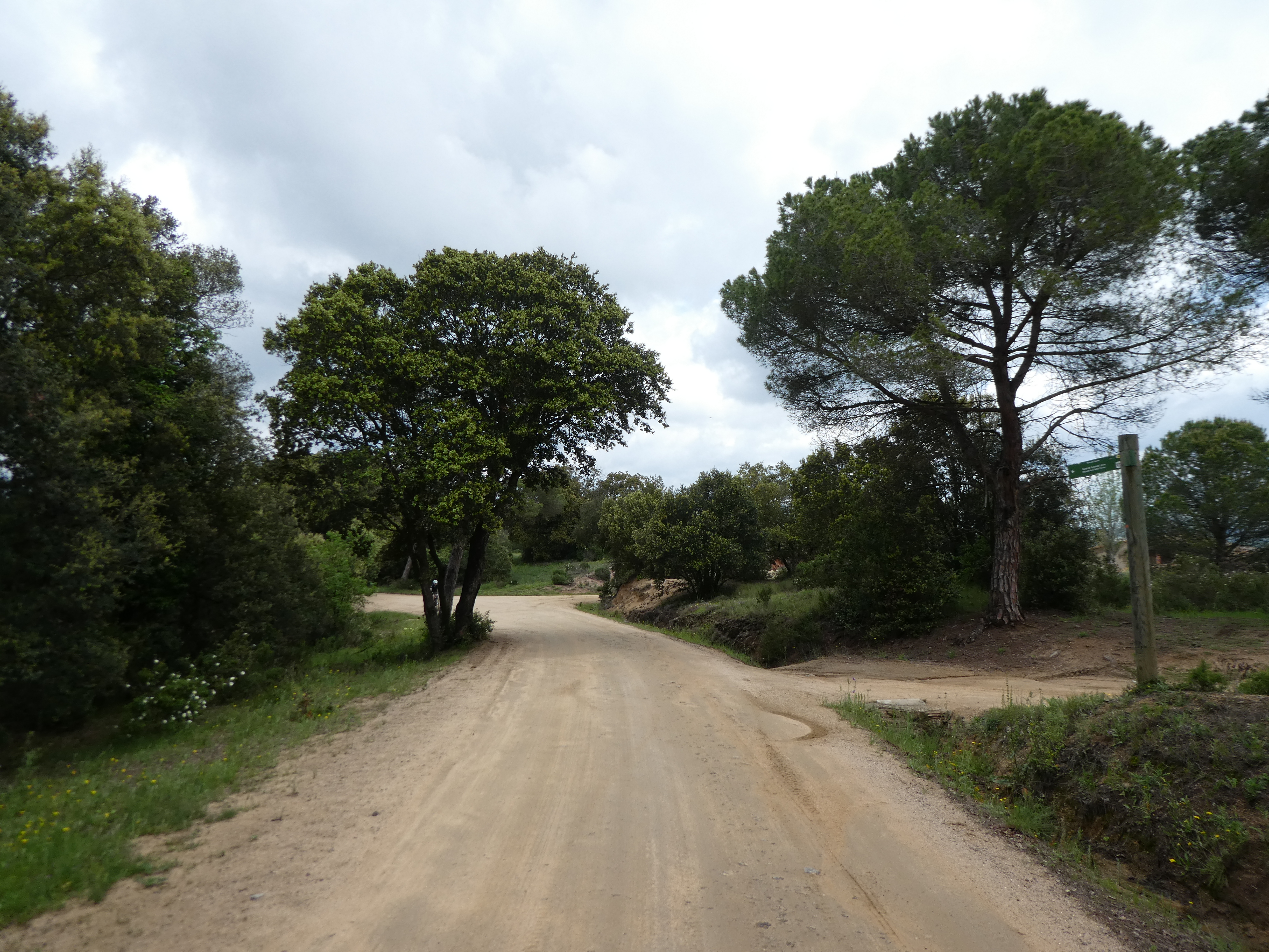 A ce croisement avec le chemin venant du Turó de Puigmarí marqué par la présence d'un panneau directionnel (400 mètres après avoir quitté le Castell de Torcafelló), suivre le large chemin partant tout droit direction Maçanet de la Selva, balisé en jaune, et en orange dorénavant