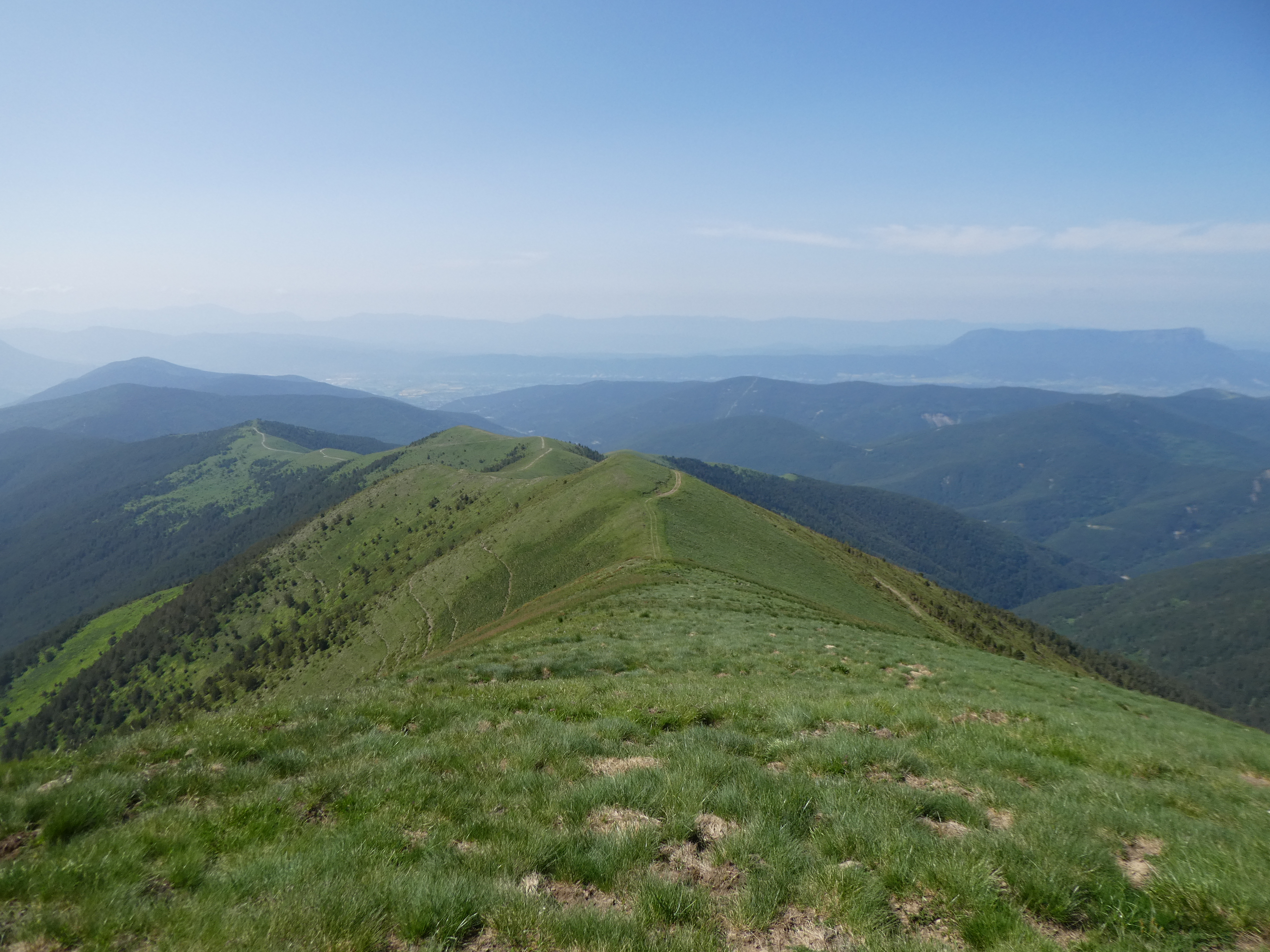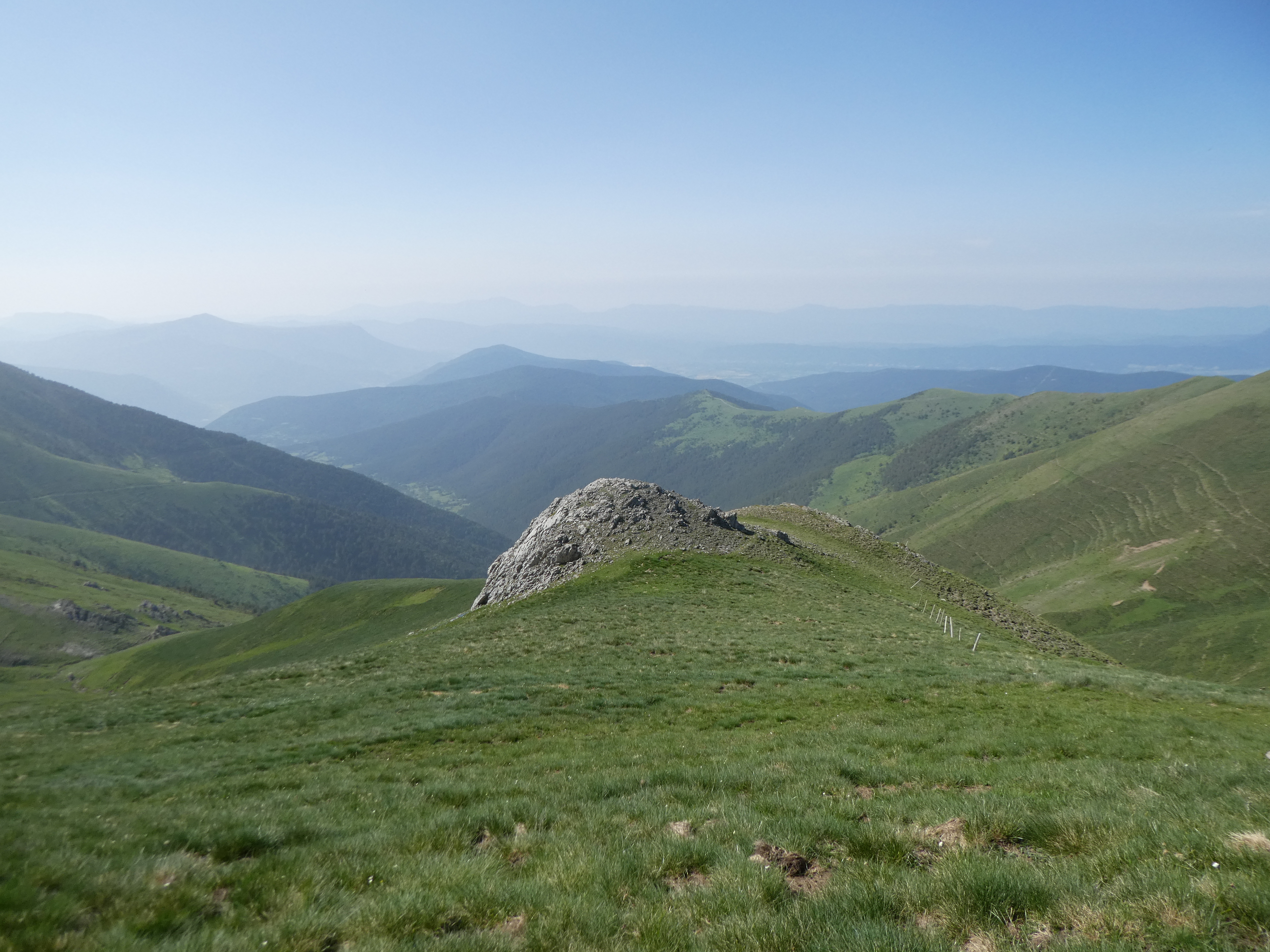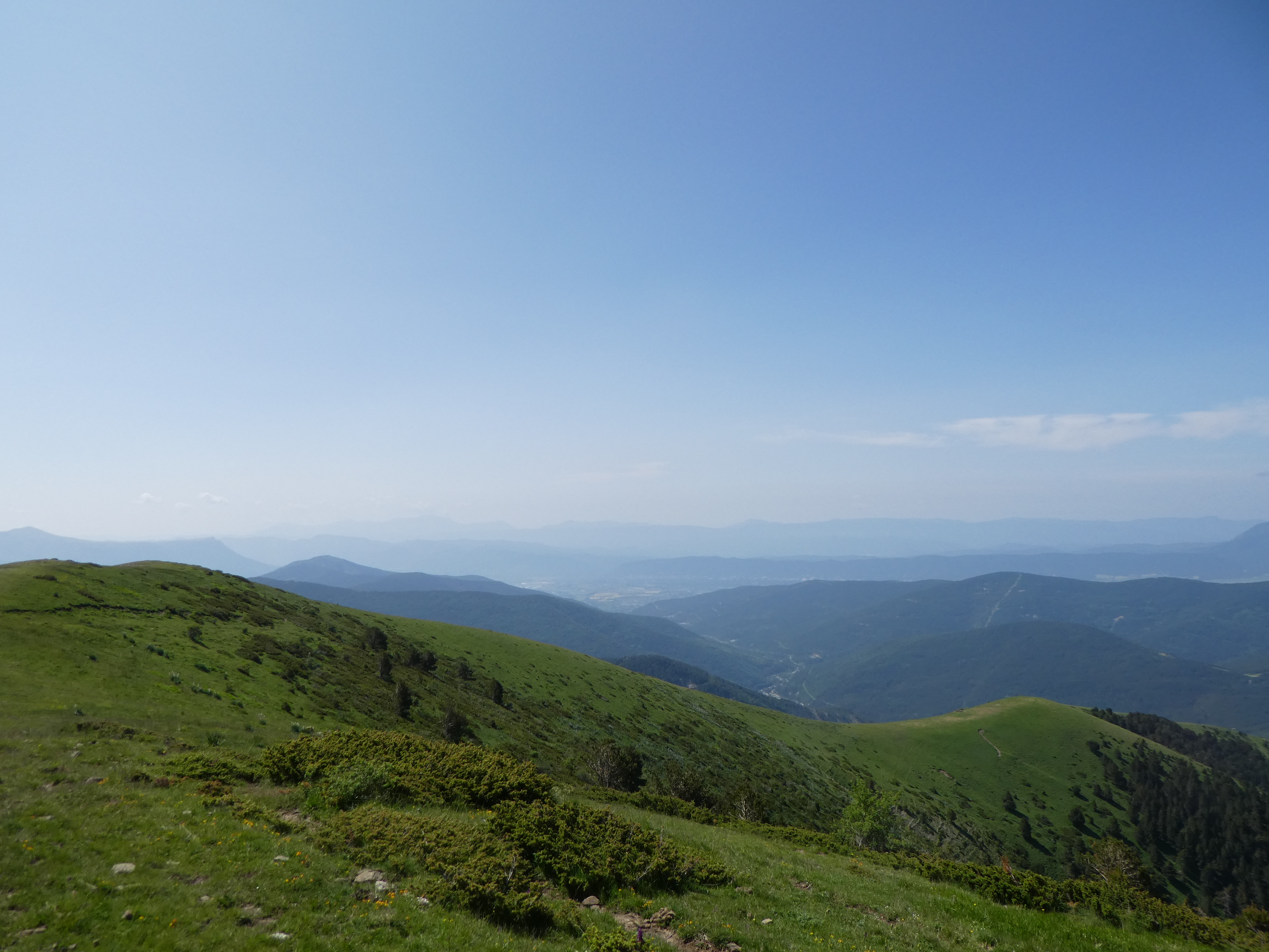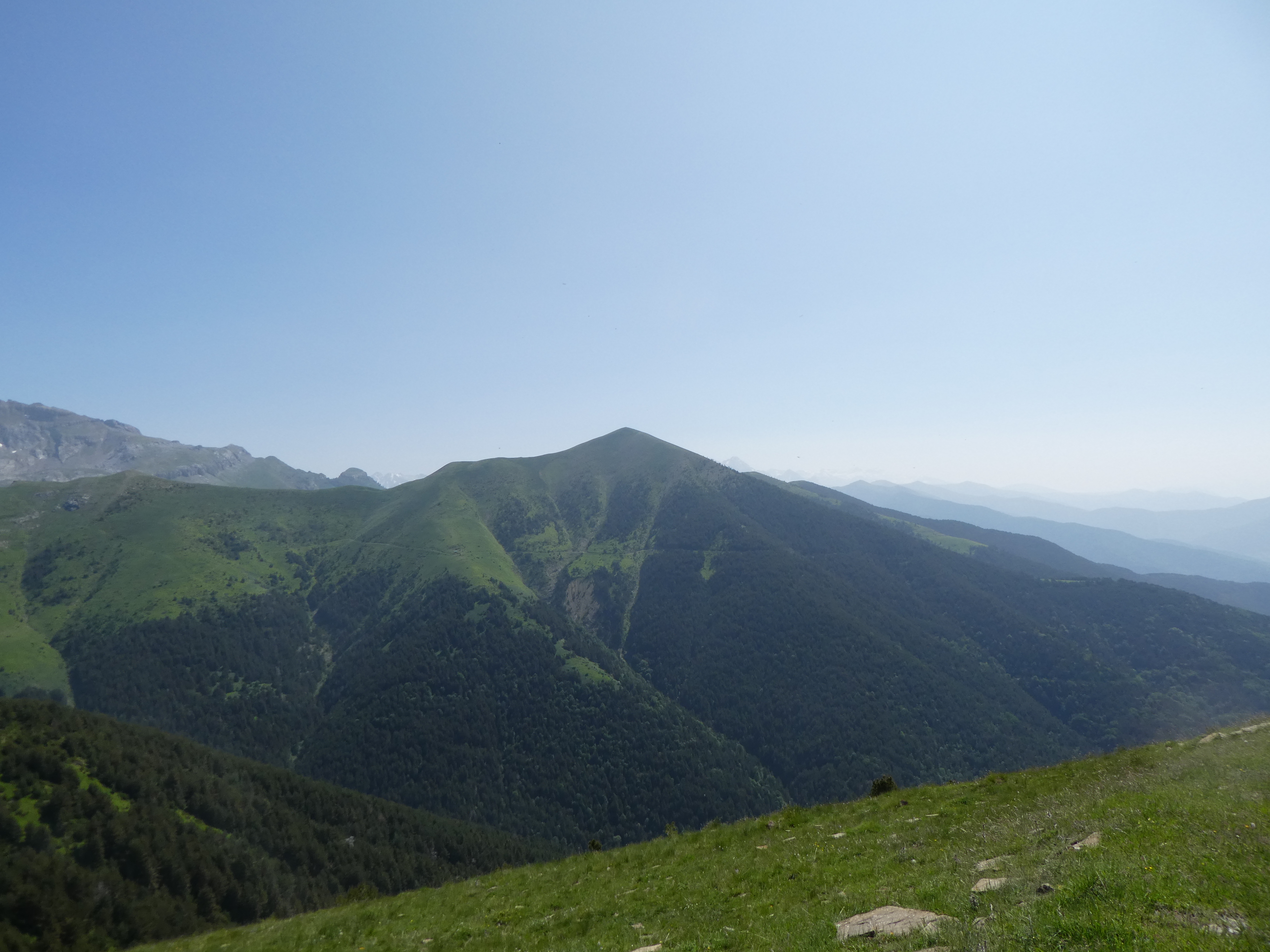 Arrivée au sommet de la Cerruza (2009 m) : beau panorama malgré la présence de brume de chaleur sur les sommets du massif de la Peña Telera, de l'Alto Gállego, du Sobrarbe, de la Jacetania ainsi que sur la Valle de Biescas