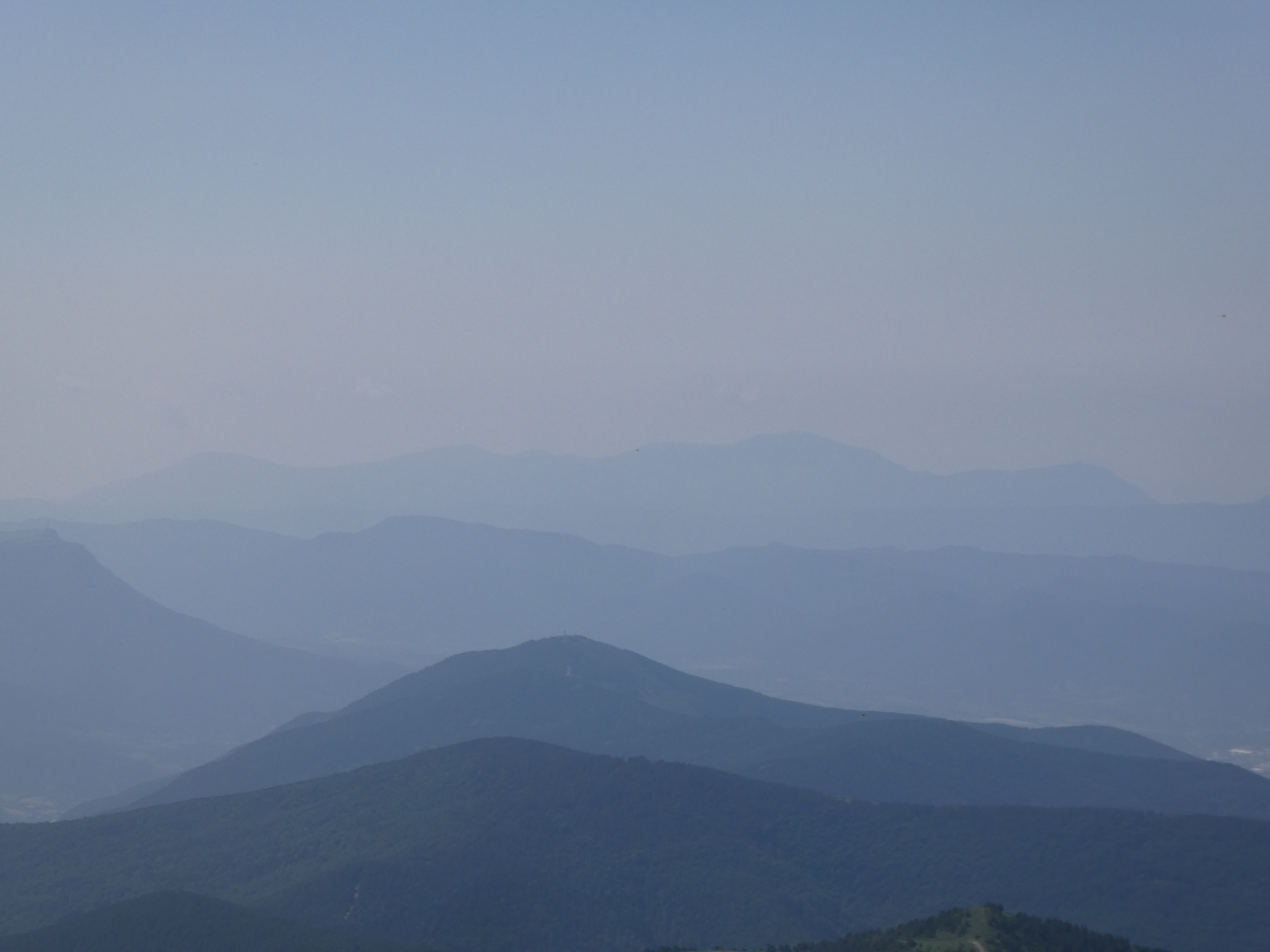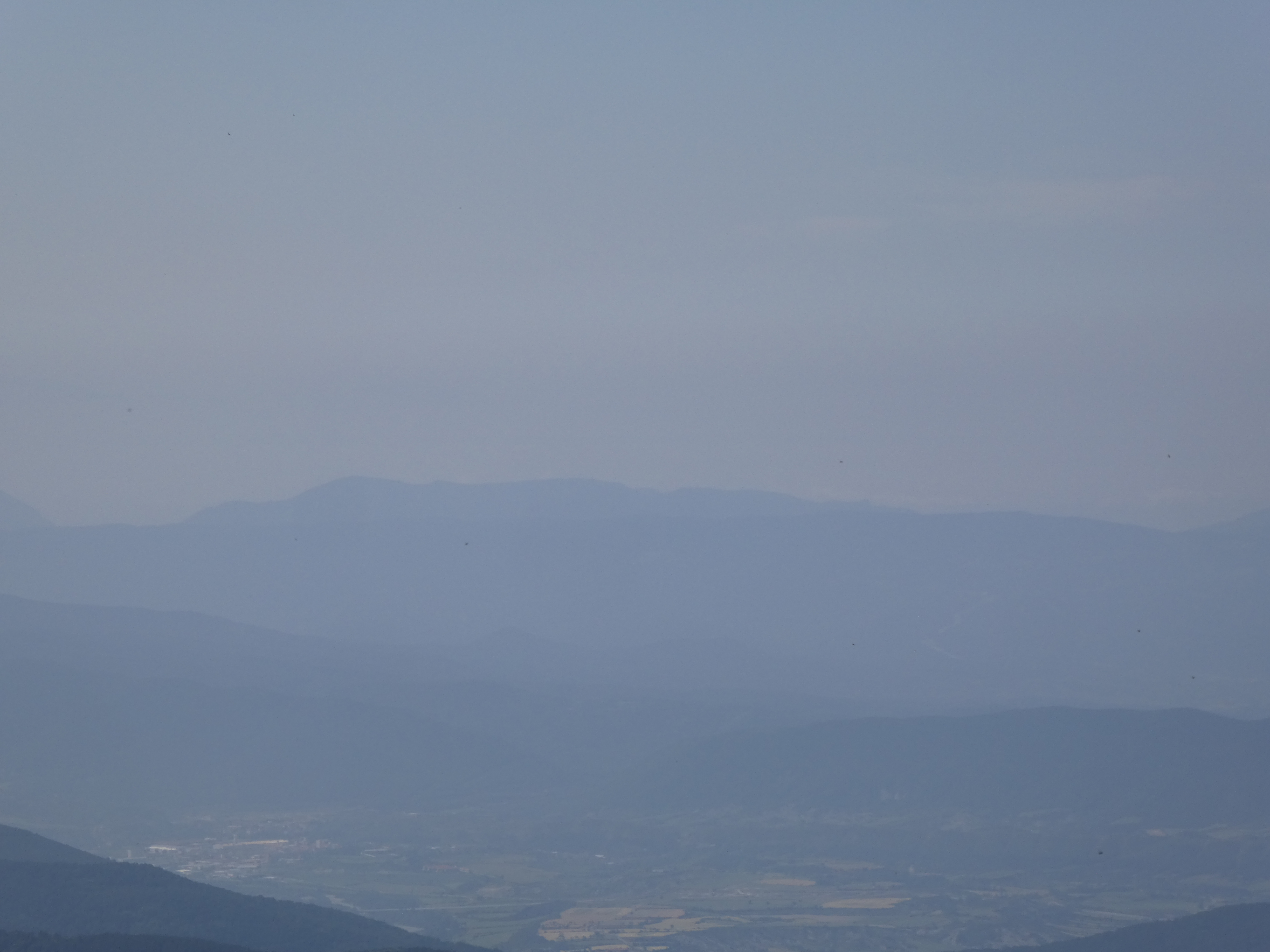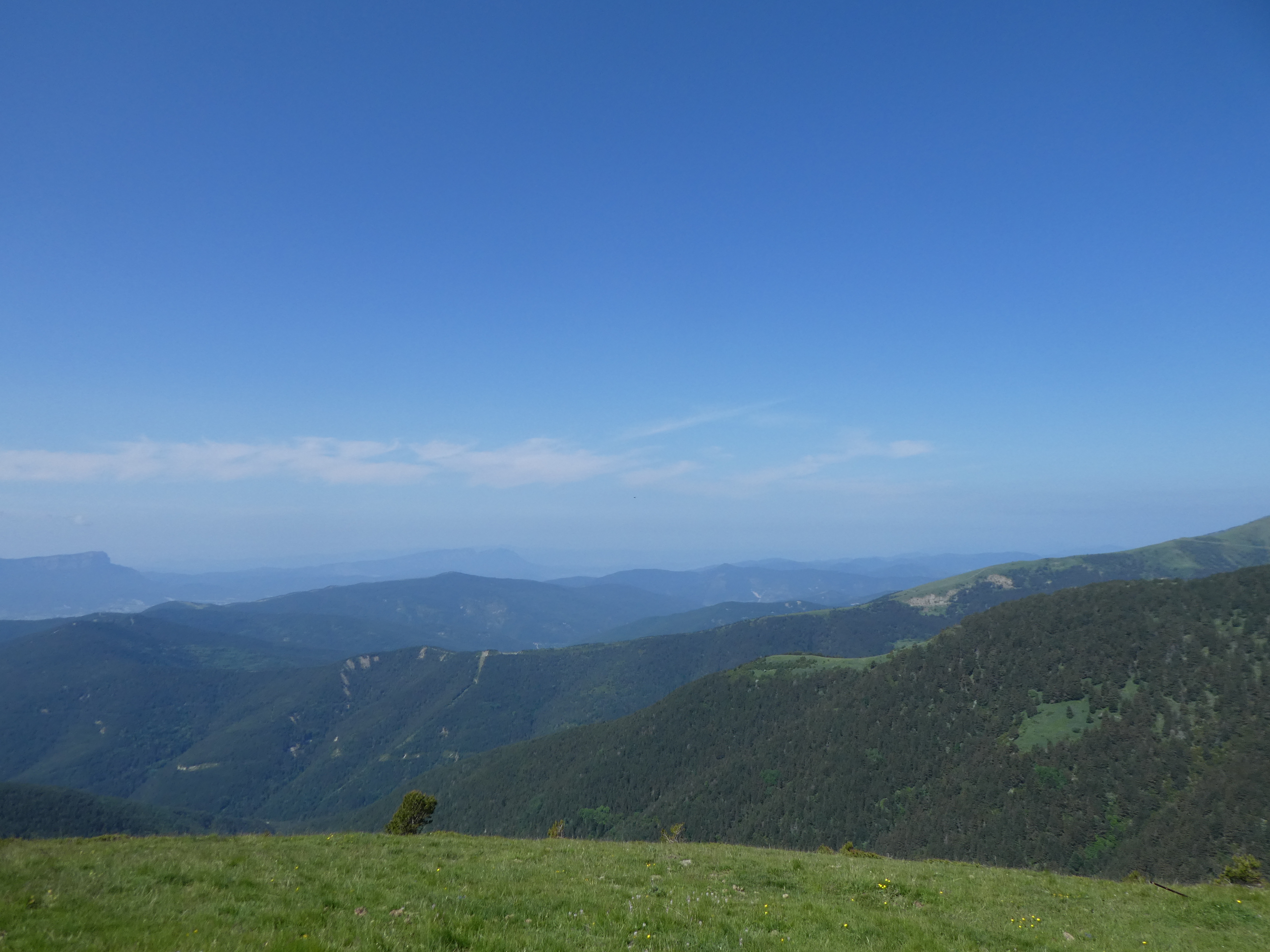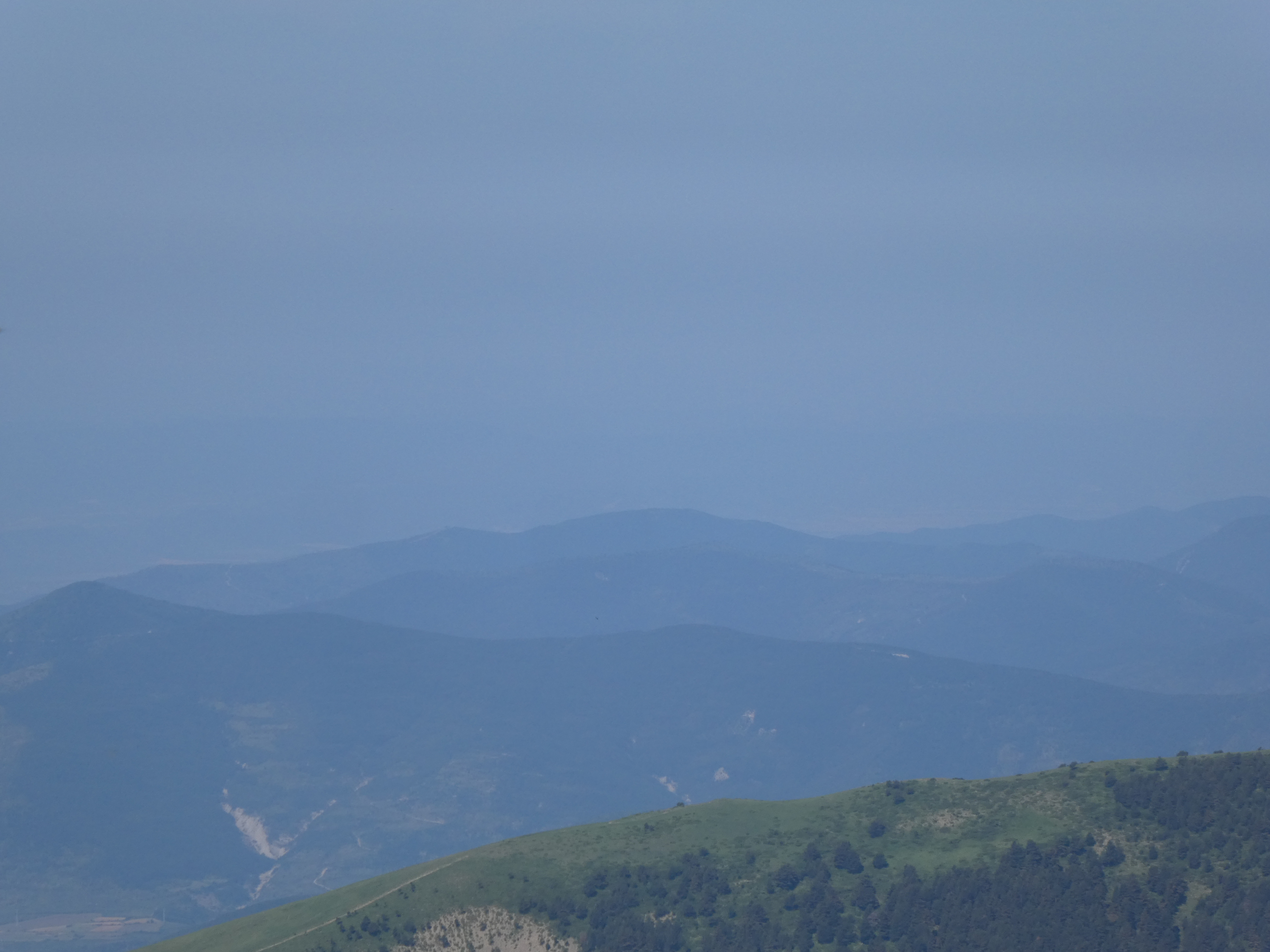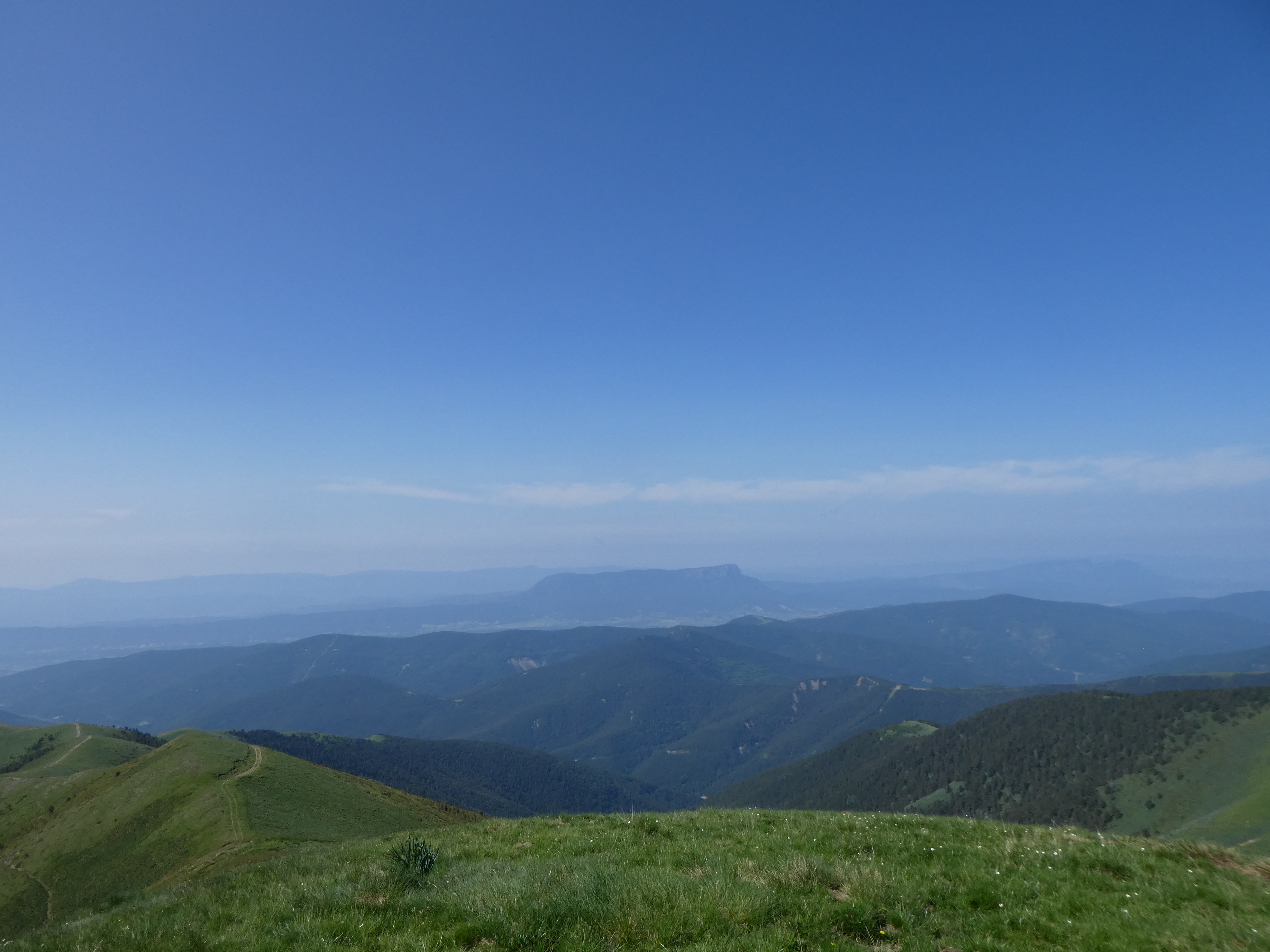 Arrivée au sommet de la Cerruza (2009 m) : beau panorama malgré la présence de brume de chaleur sur les sommets du massif de la Peña Telera, de l'Alto Gállego, du Sobrarbe, de la Jacetania ainsi que sur la Valle de Biescas