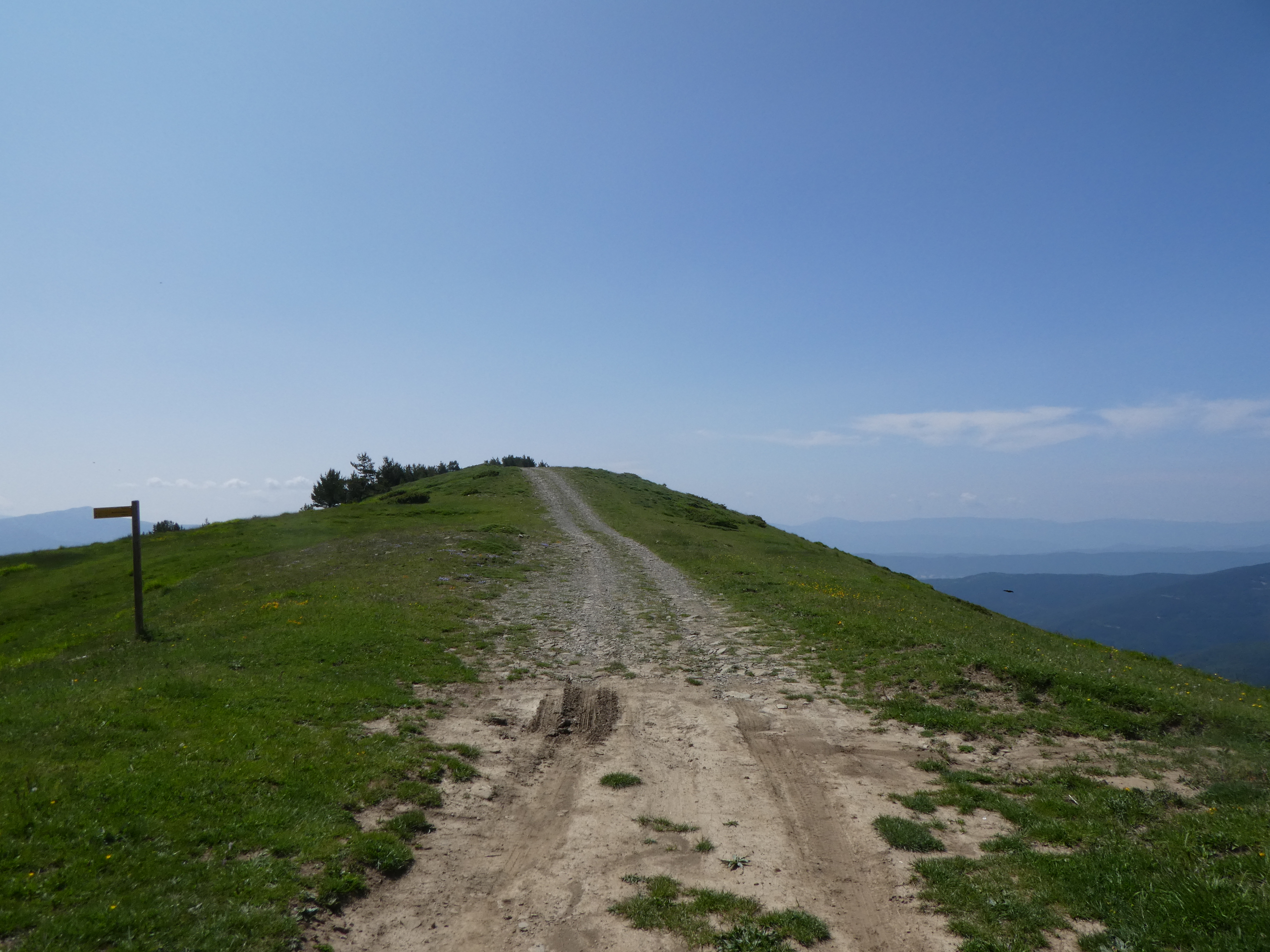 A ce croisement cairné où le chemin coupe la piste à la quatrième reprise (1000 mètres après le précédent mentionné), suivre la piste partant sur la gauche vers l'antenne direction Cerruza