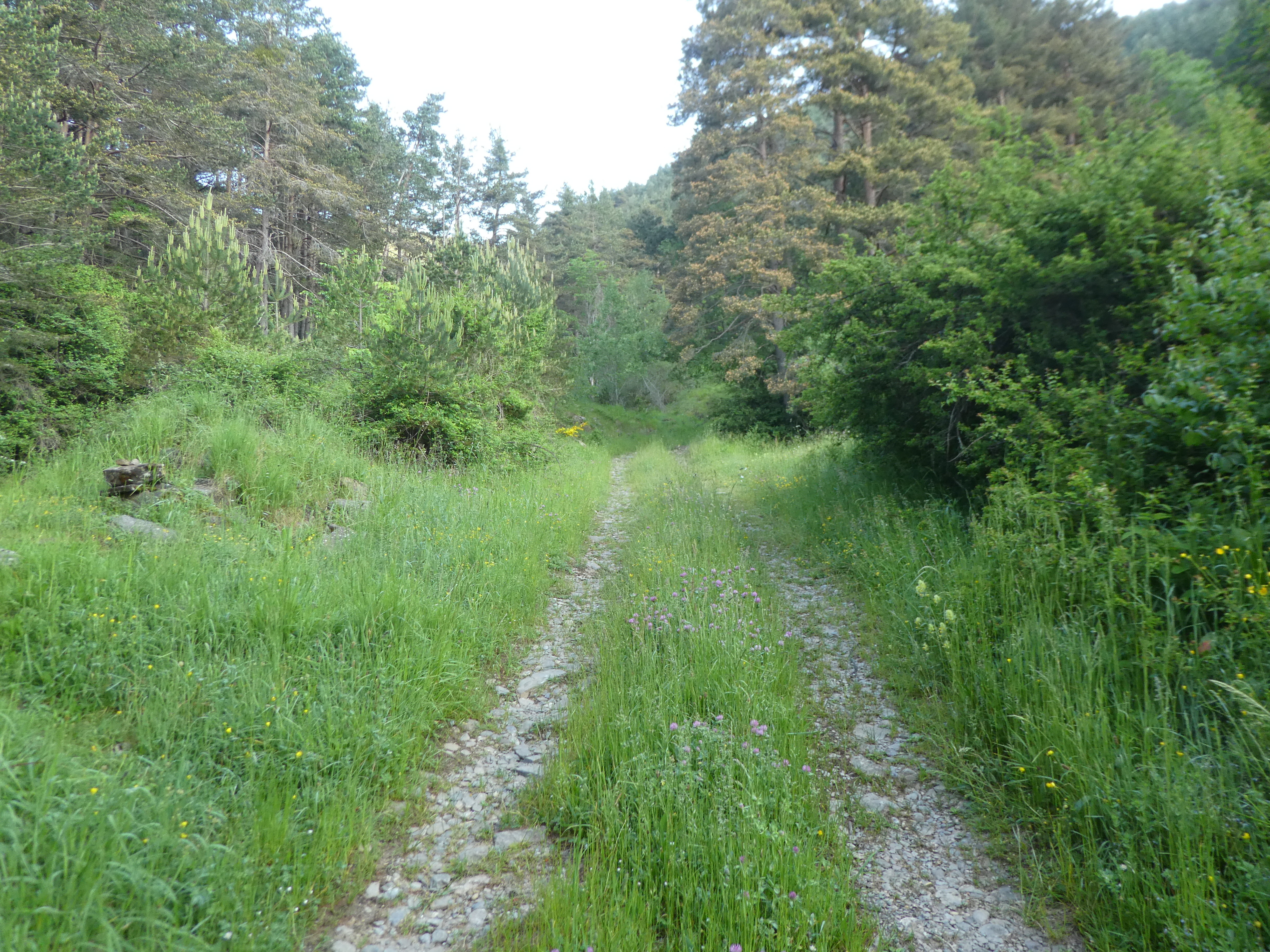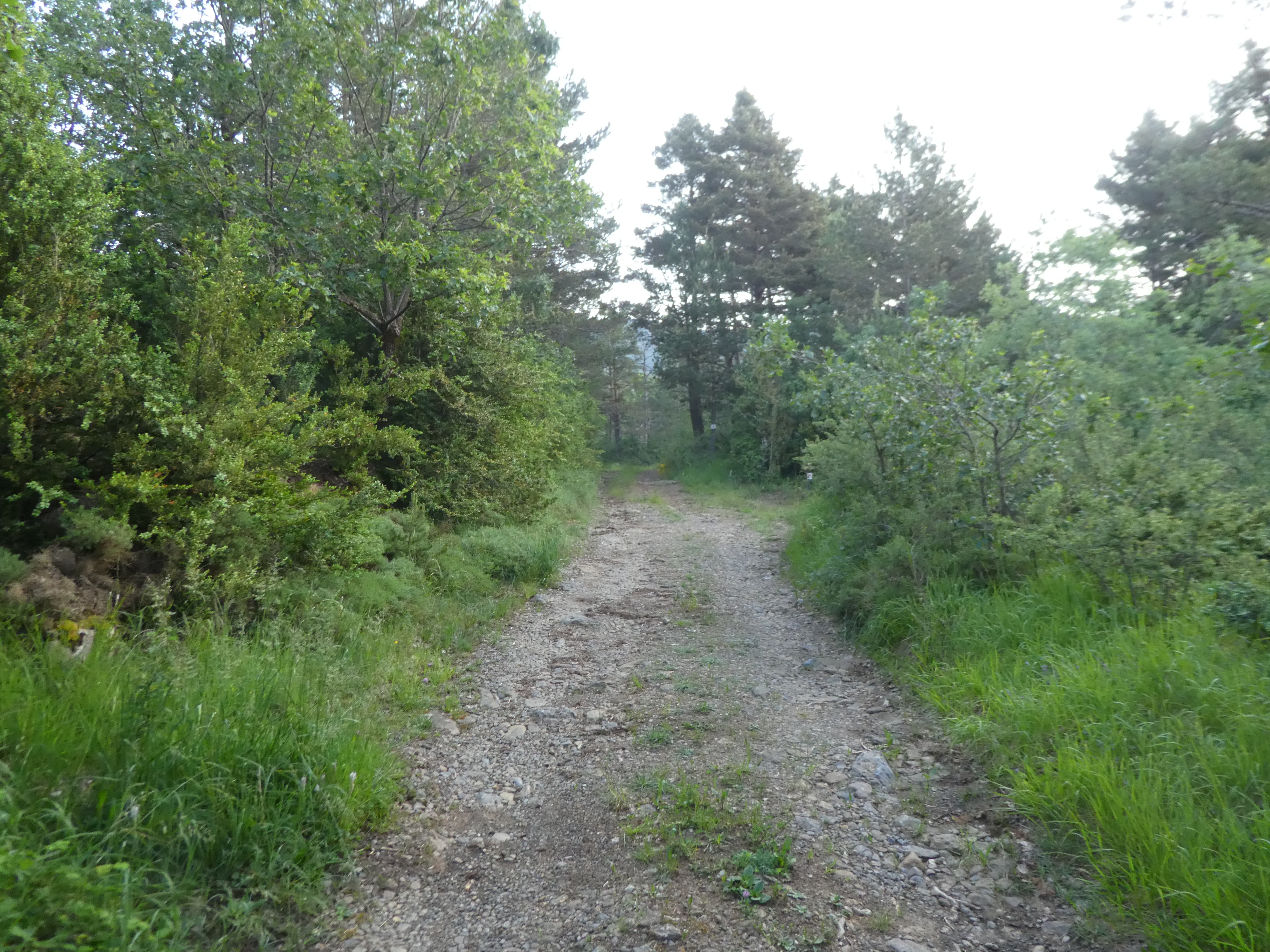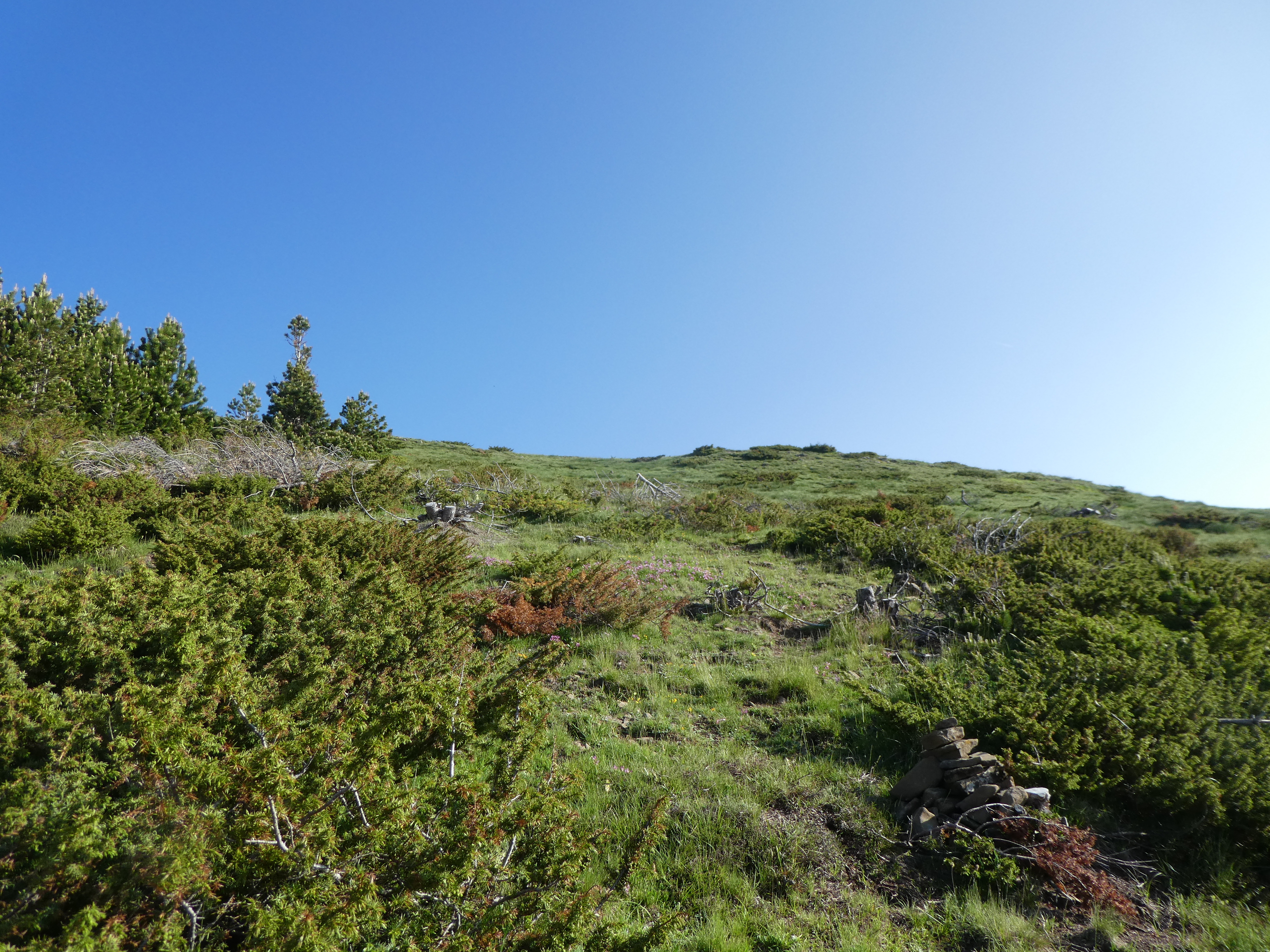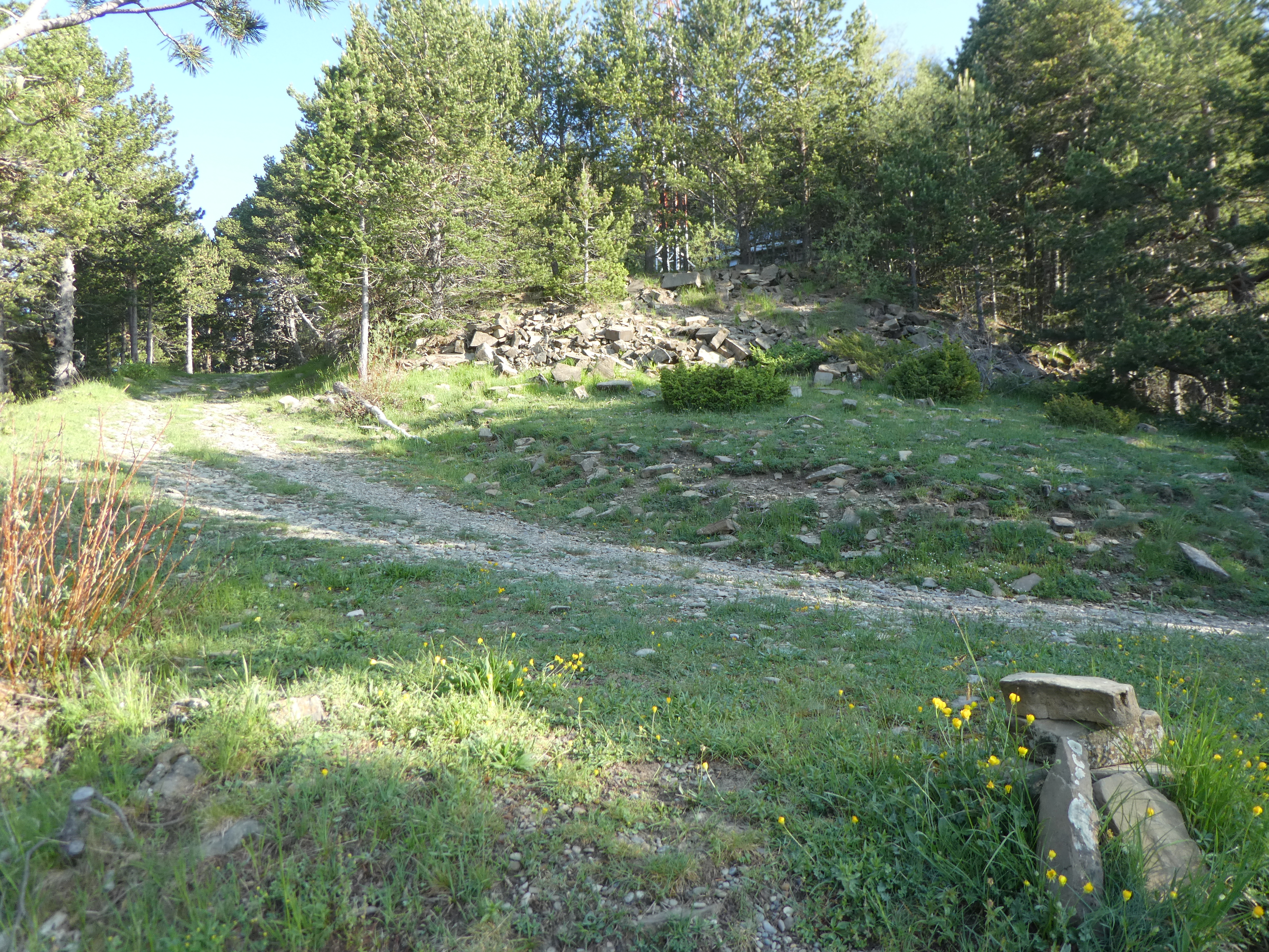 A ce croisement cairné avec le chemin raccourci coupant la piste menant à l'antenne de la Cerruza (200 mètres après le précédent mentionné), suivre ce dernier montant de biais sur la droite direction Cerruza, aucun balisage (ce chemin va couper à trois reprises la piste)