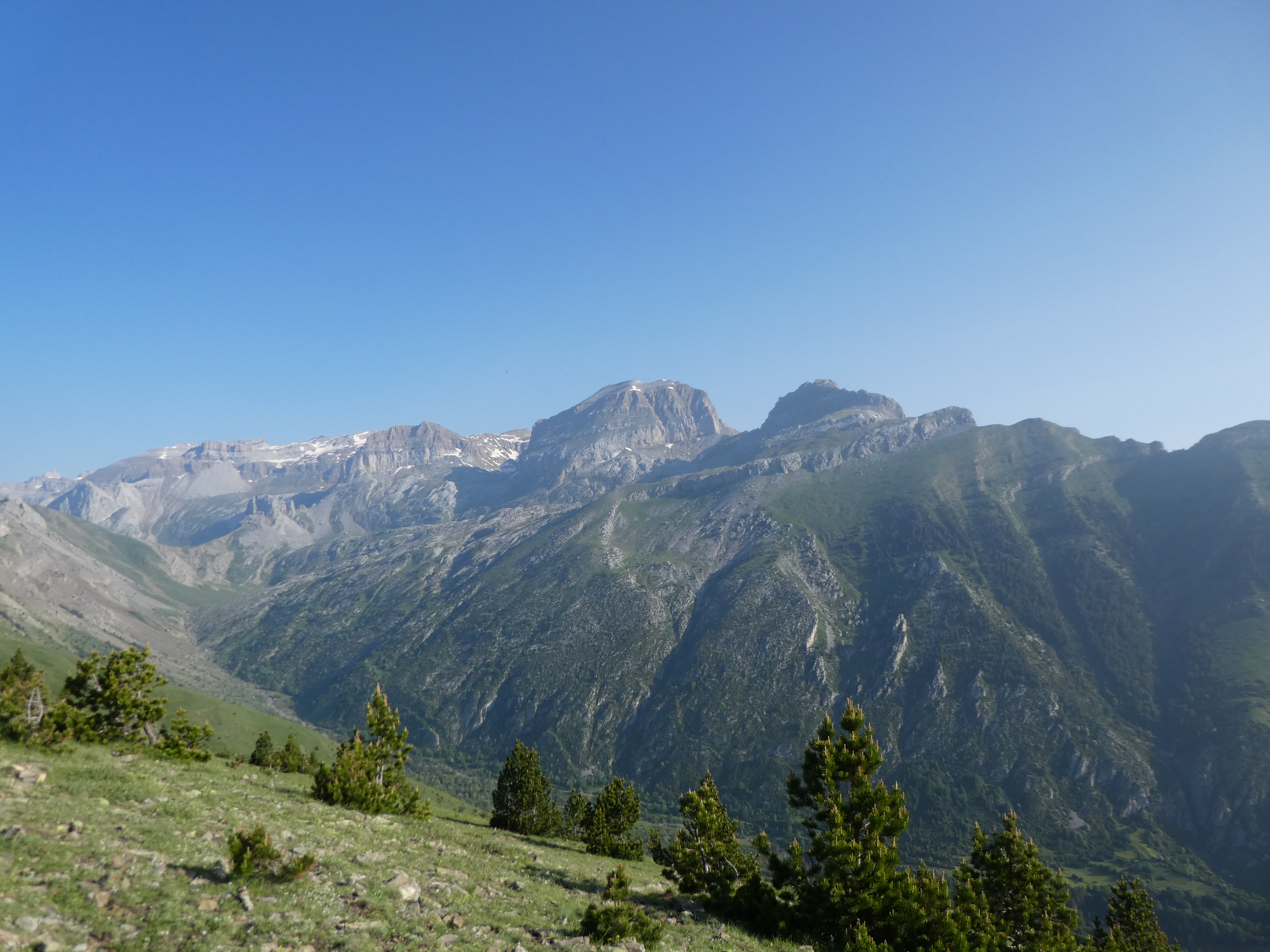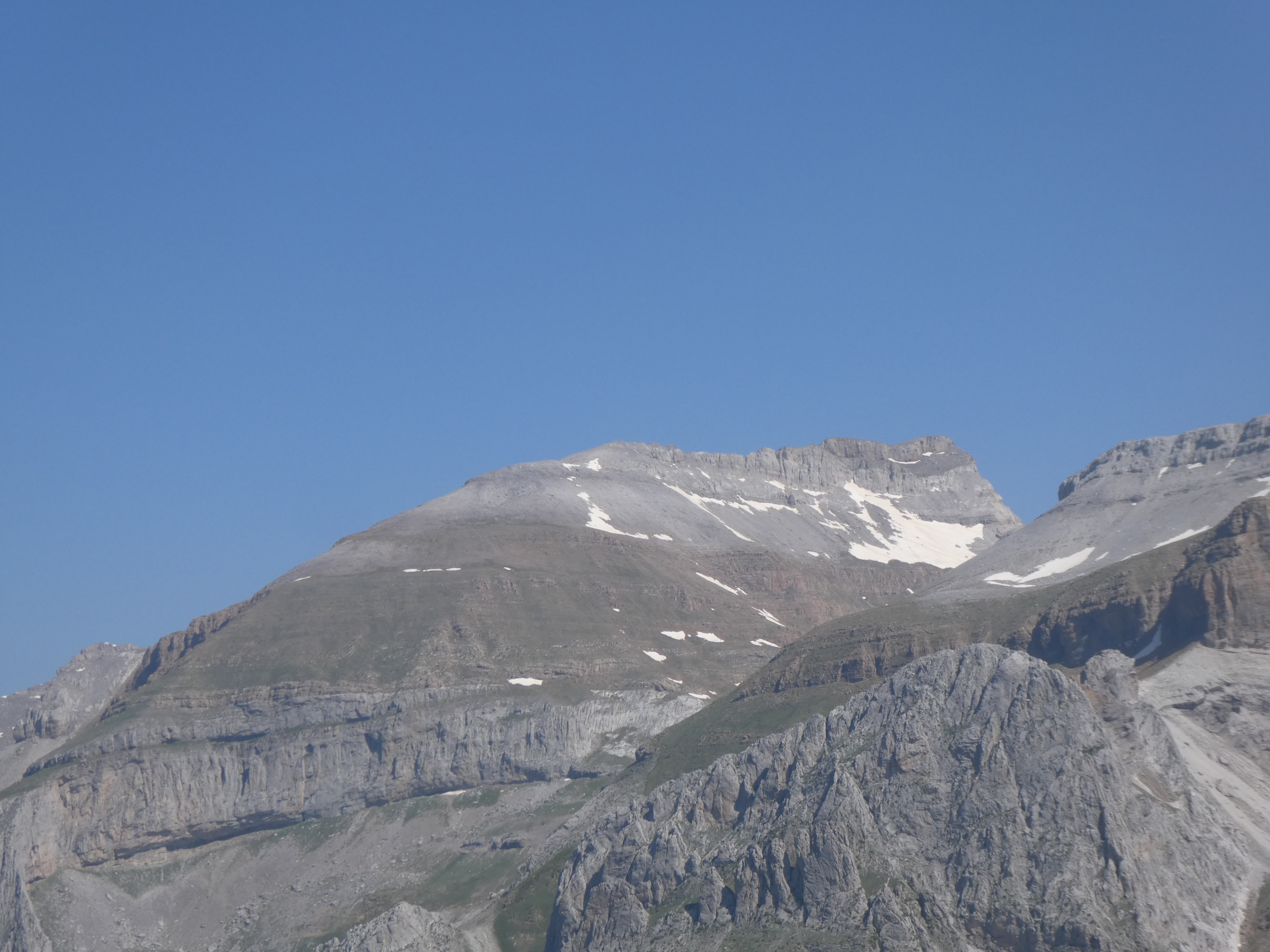 Zoom sur le Pico de Marboré (3252 m) à gauche, le Cilindro de Marboré (3325 m) au centre-gauche, le Monte Perdido (3355 m) au centre et le Pico de Añisclo (3259 m) au centre-droit