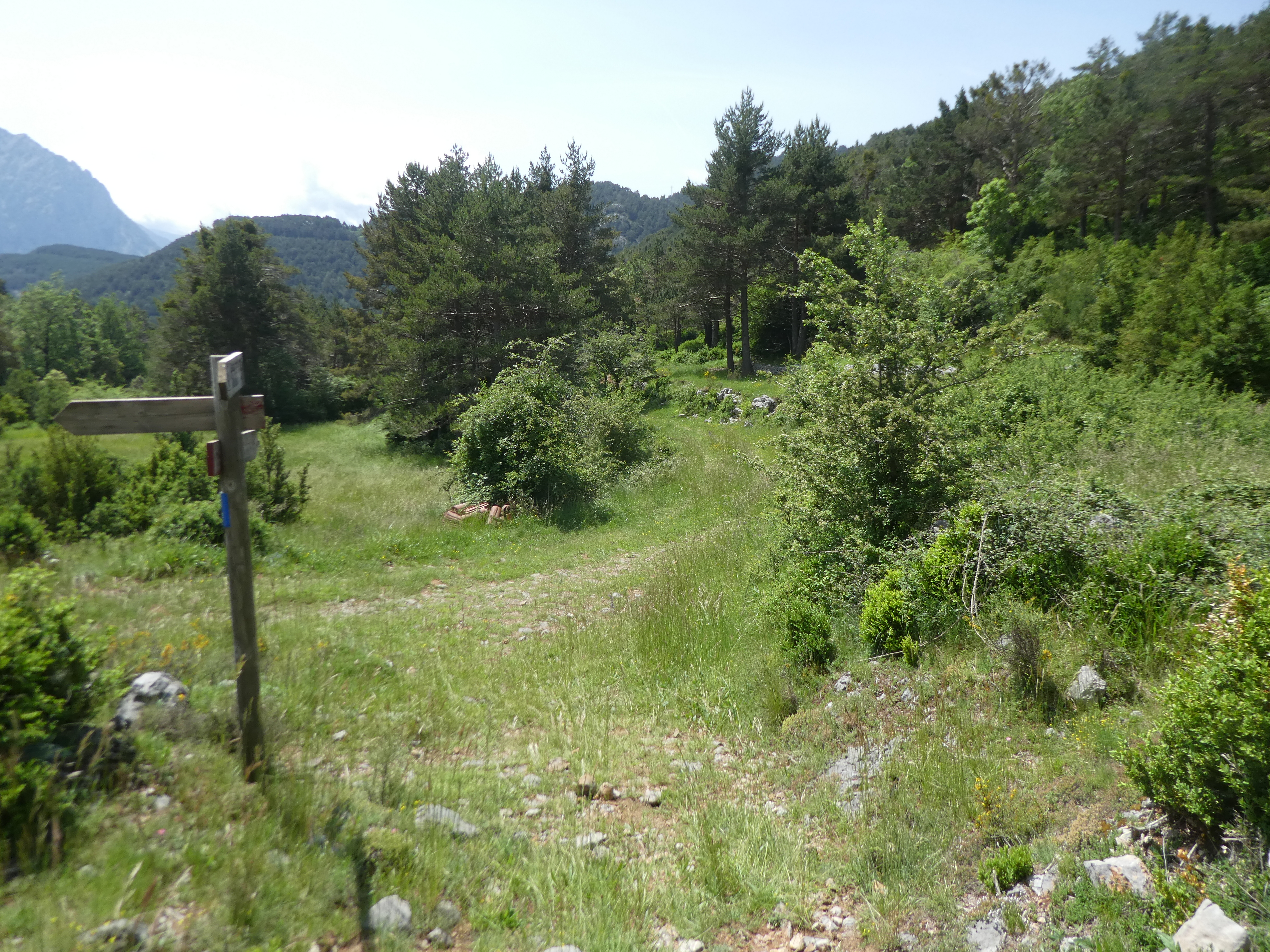 A ce croisement avec le GR19.1 marqué par la présence d'un panneau directionnel (50 mètres après le départ), suivre ce dernier partant sur la gauche direction Bielsa (por el Portiello), balisé en rouge et blanc dorénavant