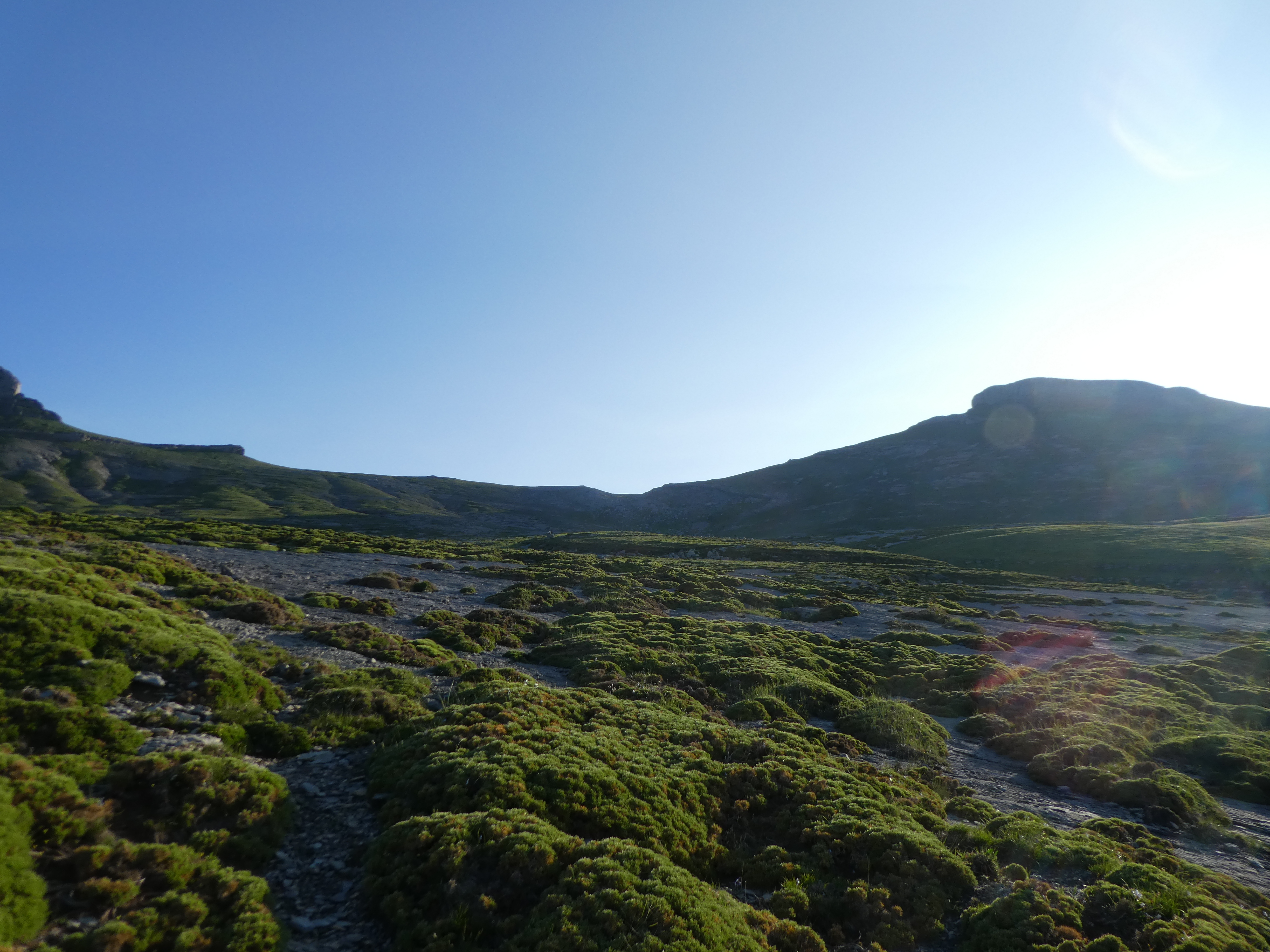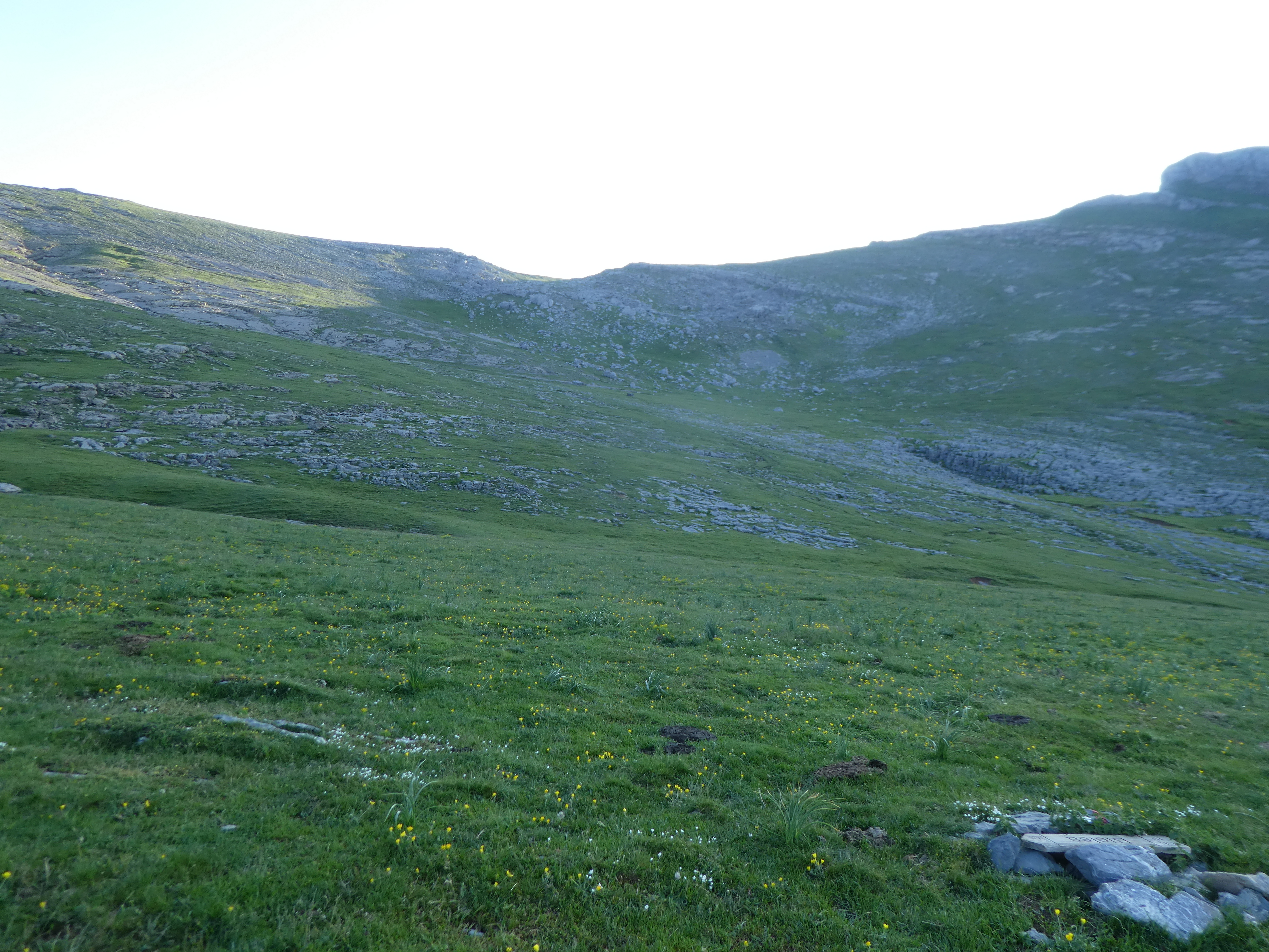 Dès que la pente herbeuse située sous les falaises de la Sierra de las Sucas est atteinte (300 mètres après avoir quitté le "couloir"), suivre le semblant de chemin partant tout droit et perdant peu d'altitude direction Portiello de Tella