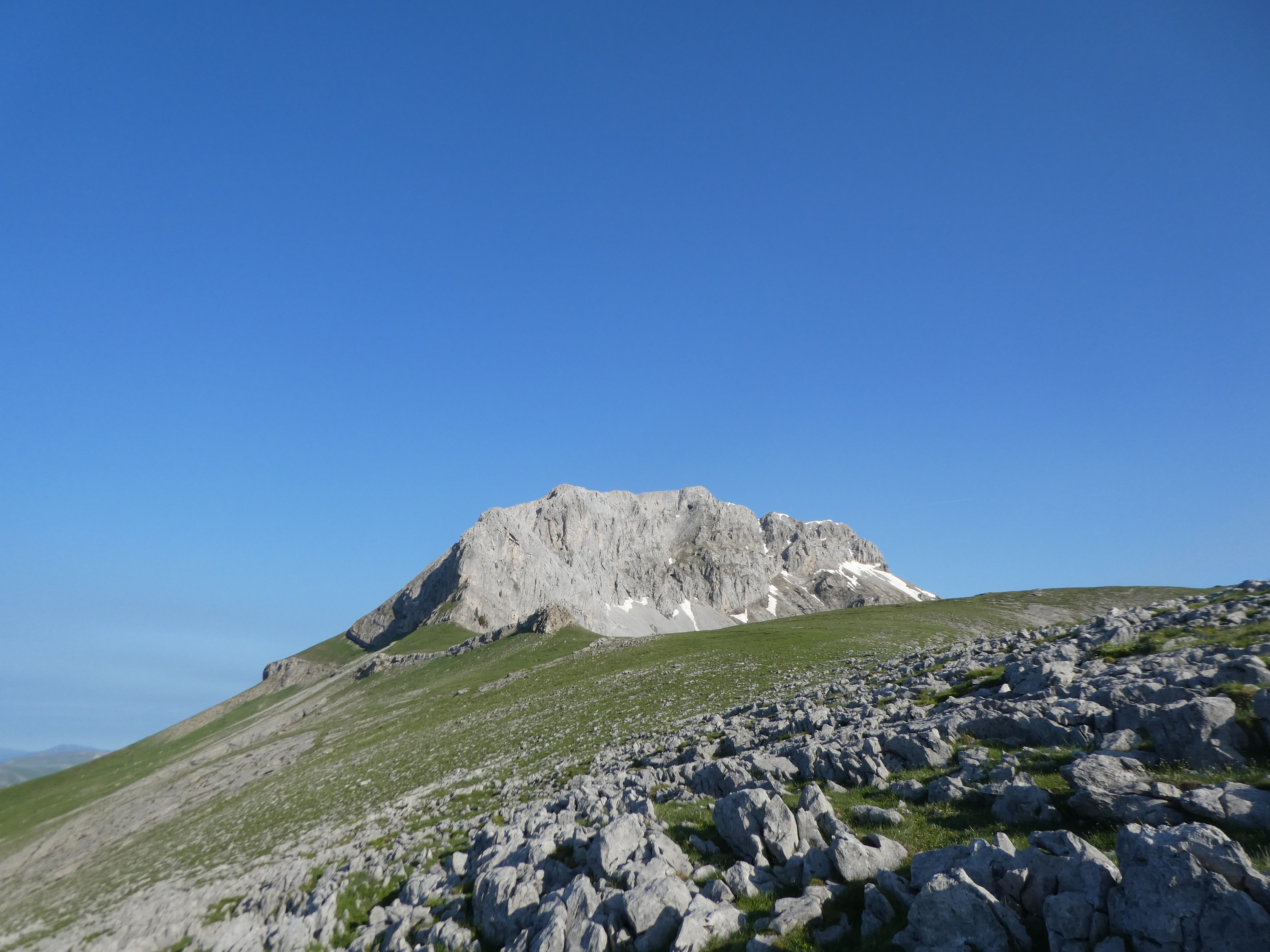 Dès que le bas du "couloir" est atteint (300 mètres après avoir avoir quitté le fil de crête), continuer à descendre à vue légèrement sur la gauche pour atteindre la pente herbeuse passant sous la crête direction Portiello de Tella