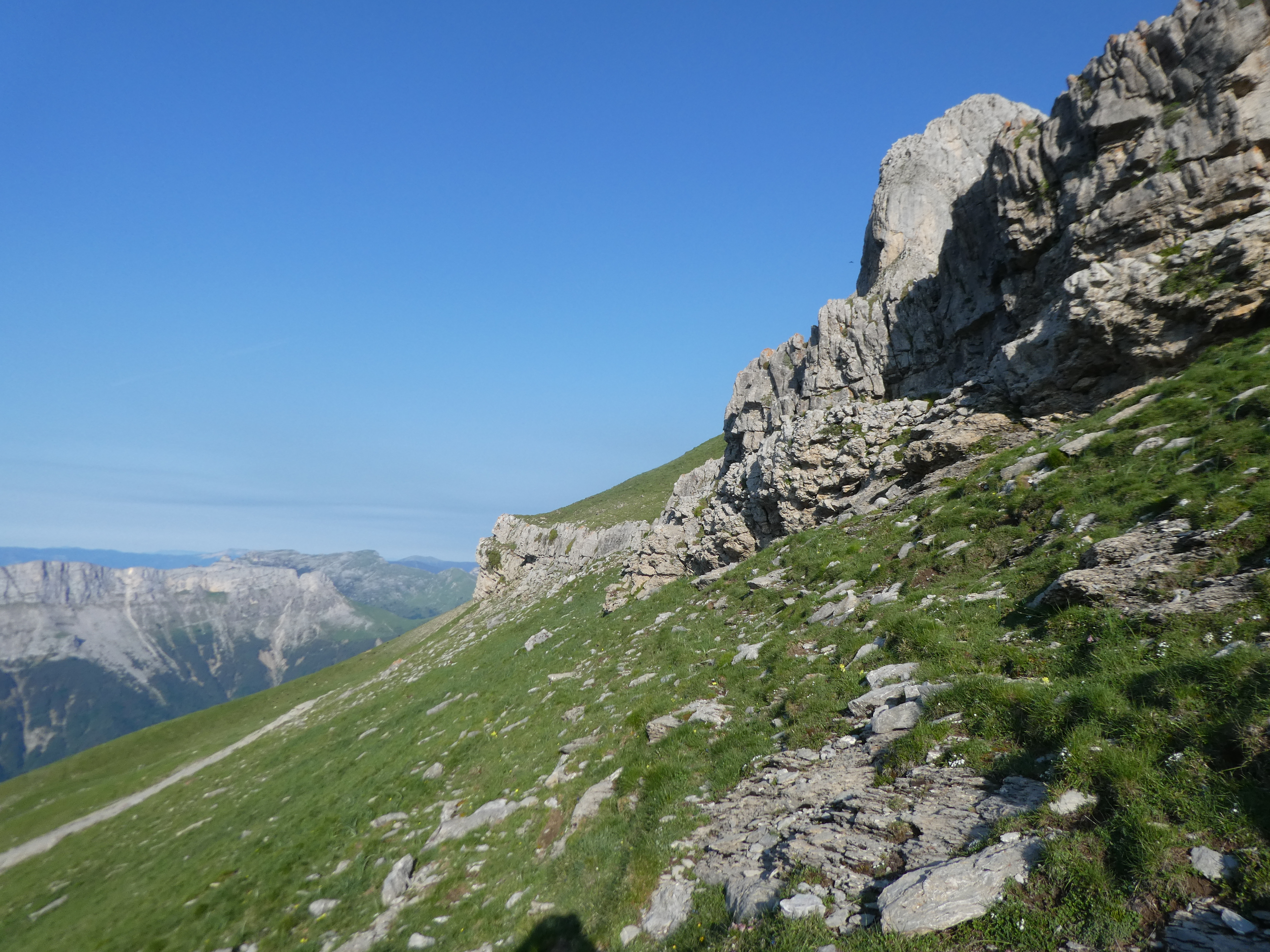 Le début du parcours à flanc de falaise de la Pala de Montinier (ne pas prendre trop d'altitude jusqu'à atteindre le pierrier)