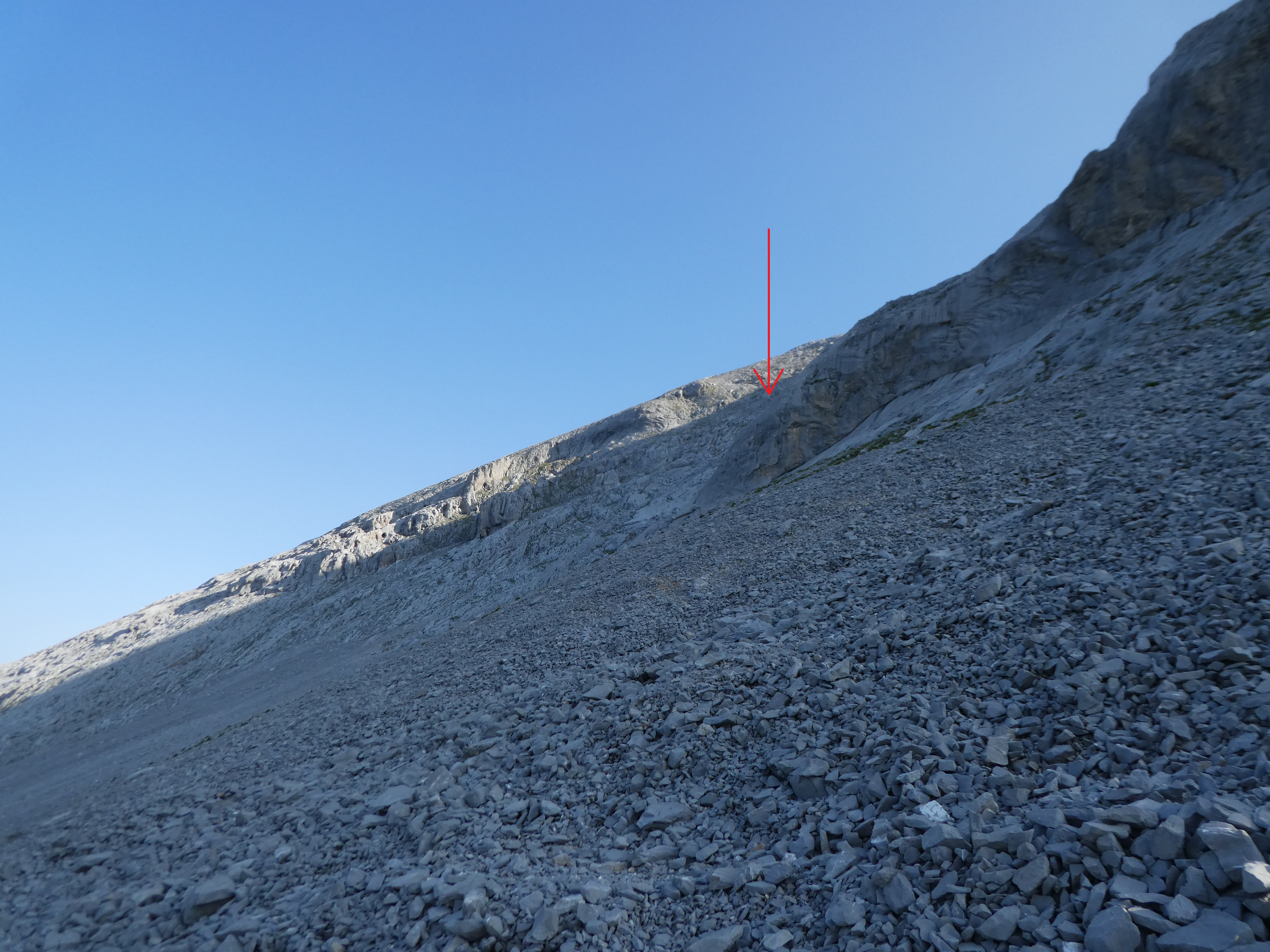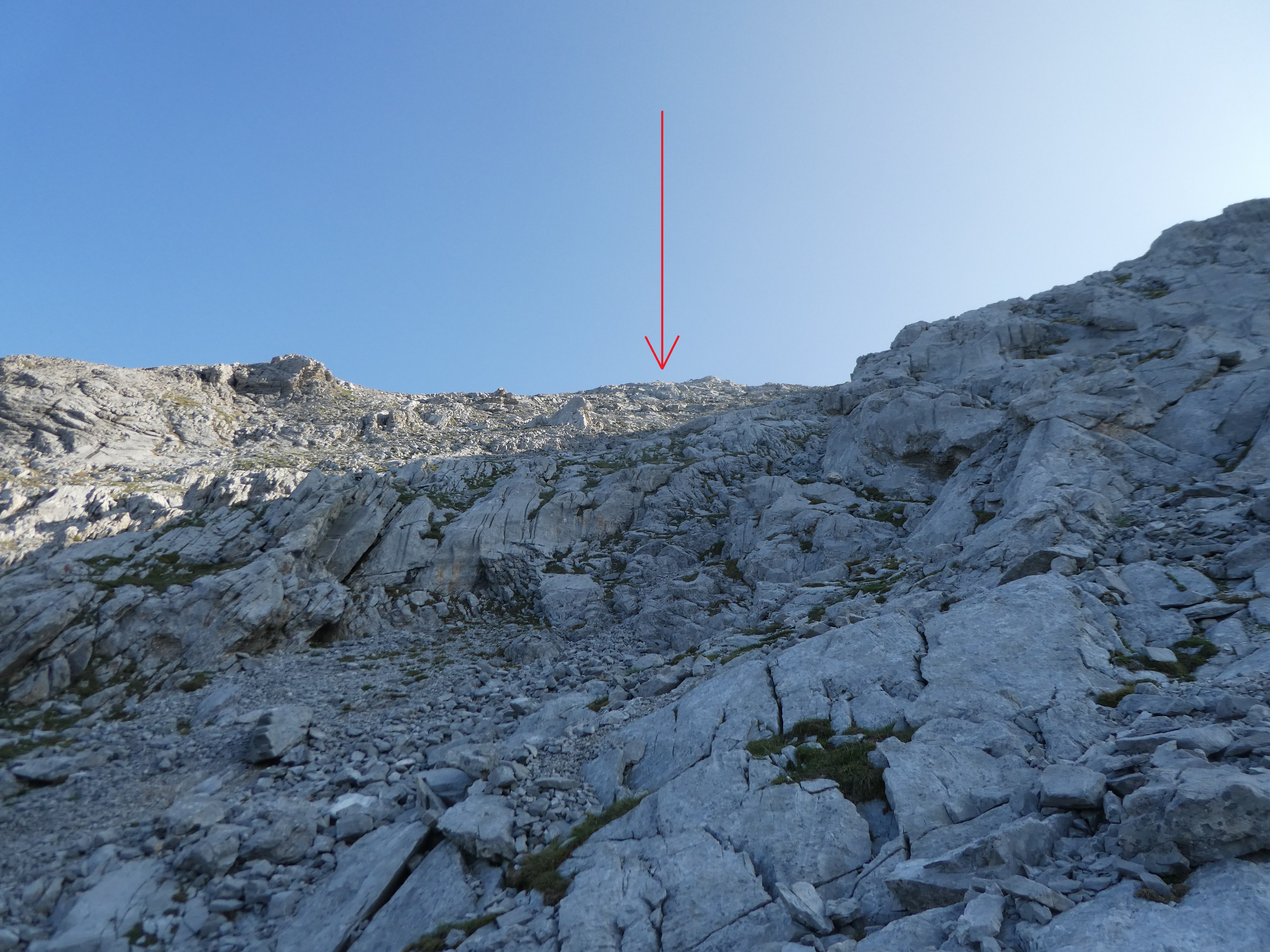Dès que le bas du "couloir" est atteint (300 mètres après avoir atteint le pierrier), continuer de monter à vue vers le sommet de la crête pour atteindre son point faible direction Pala de Montinier