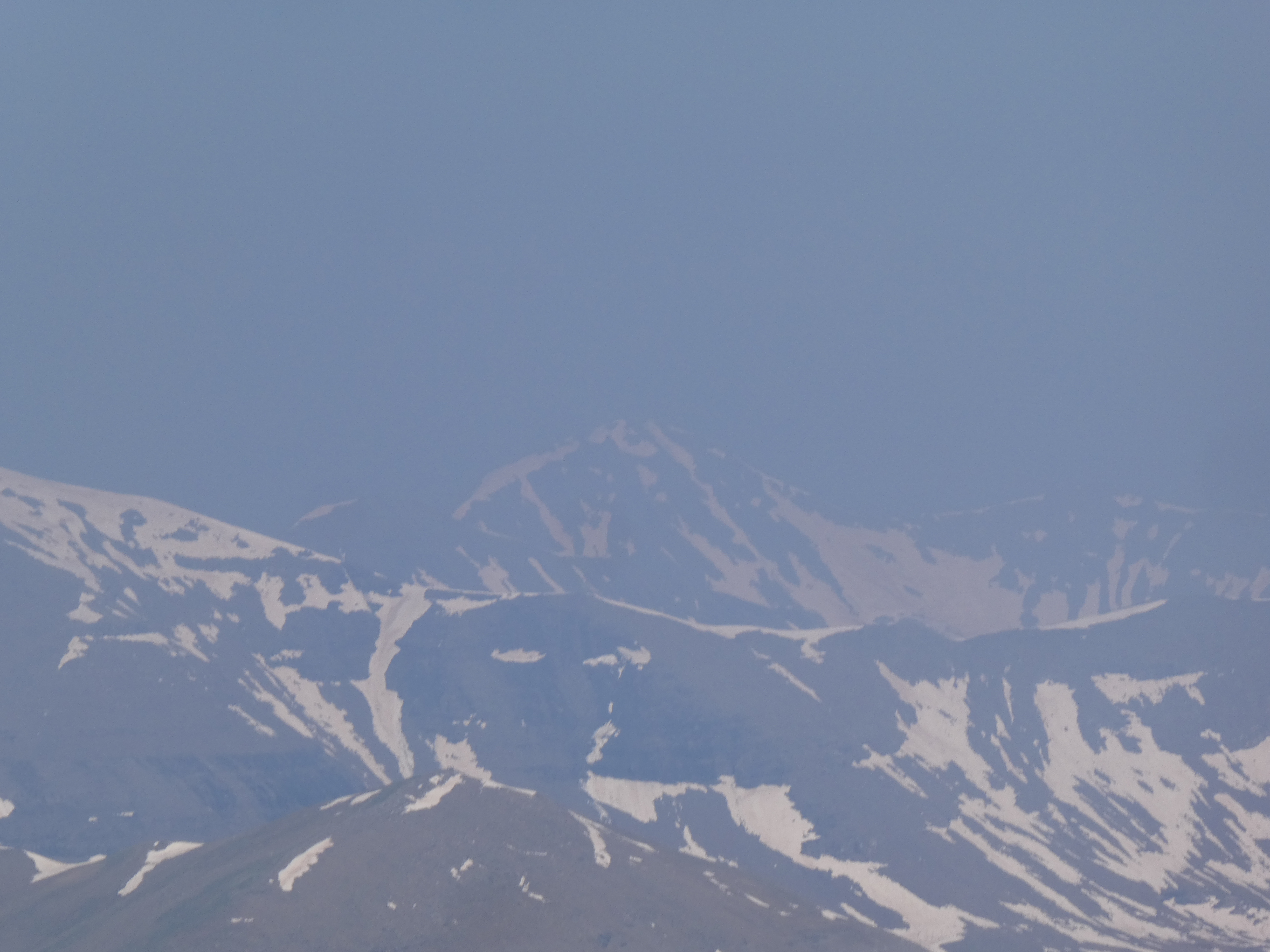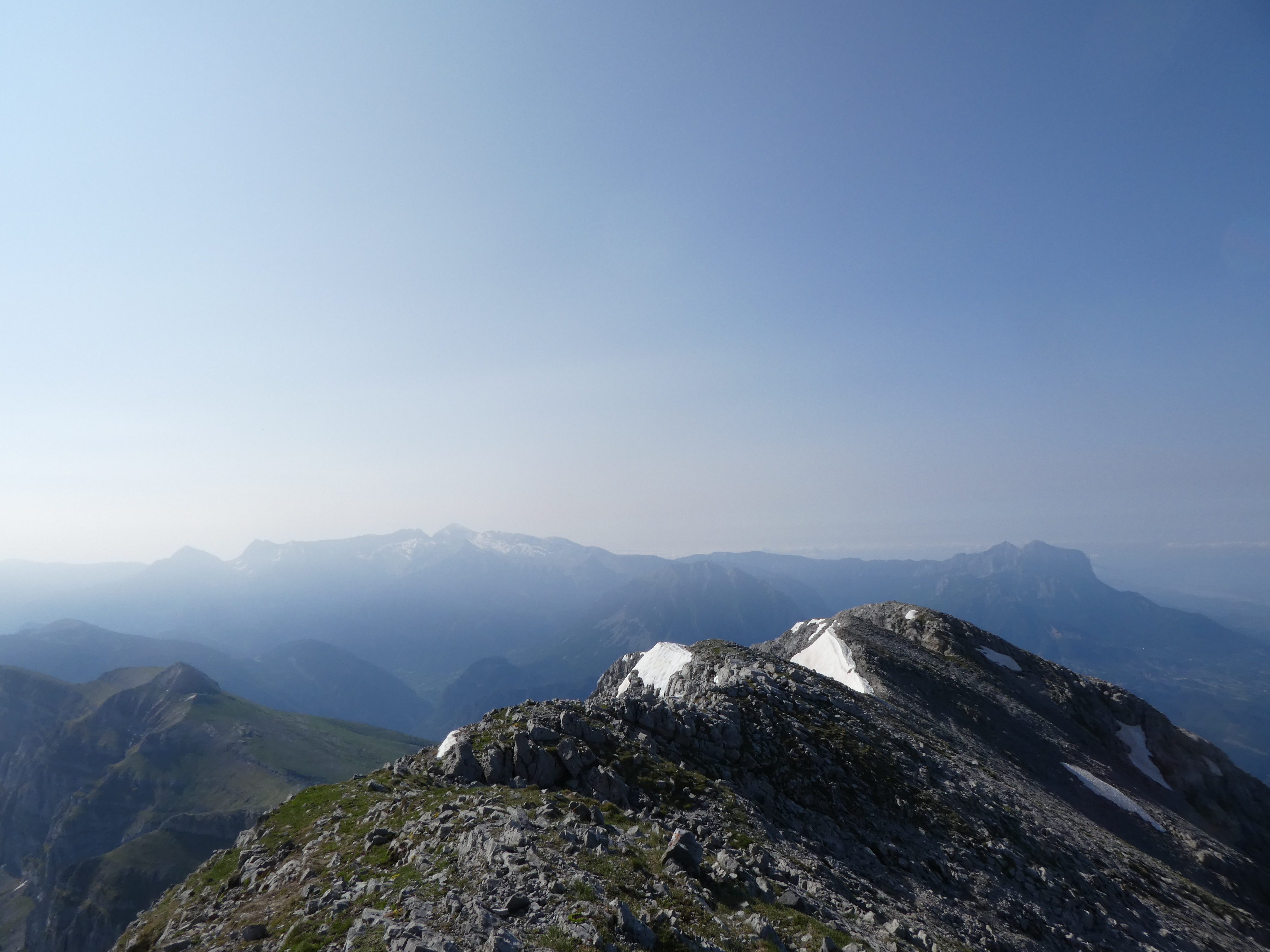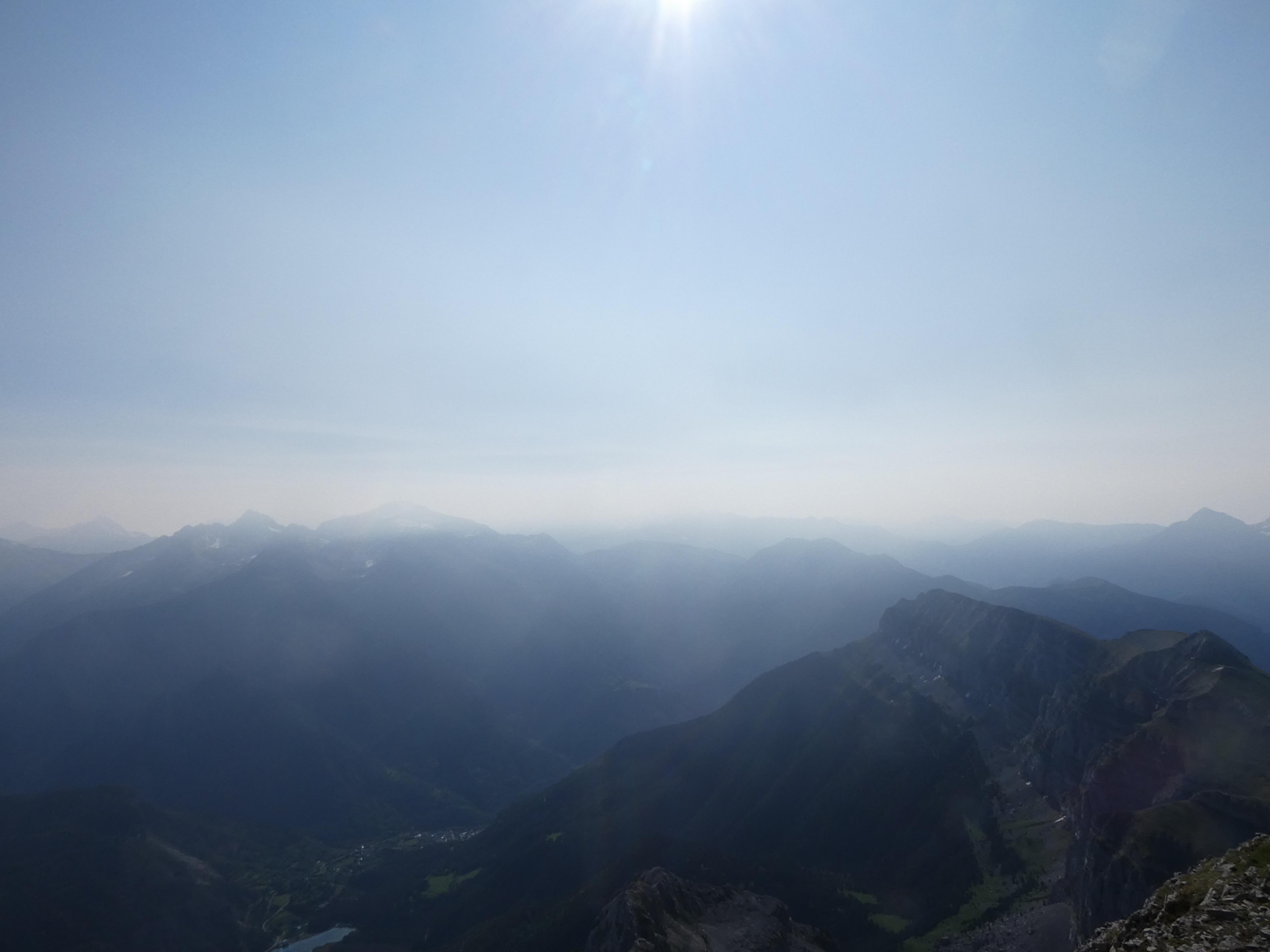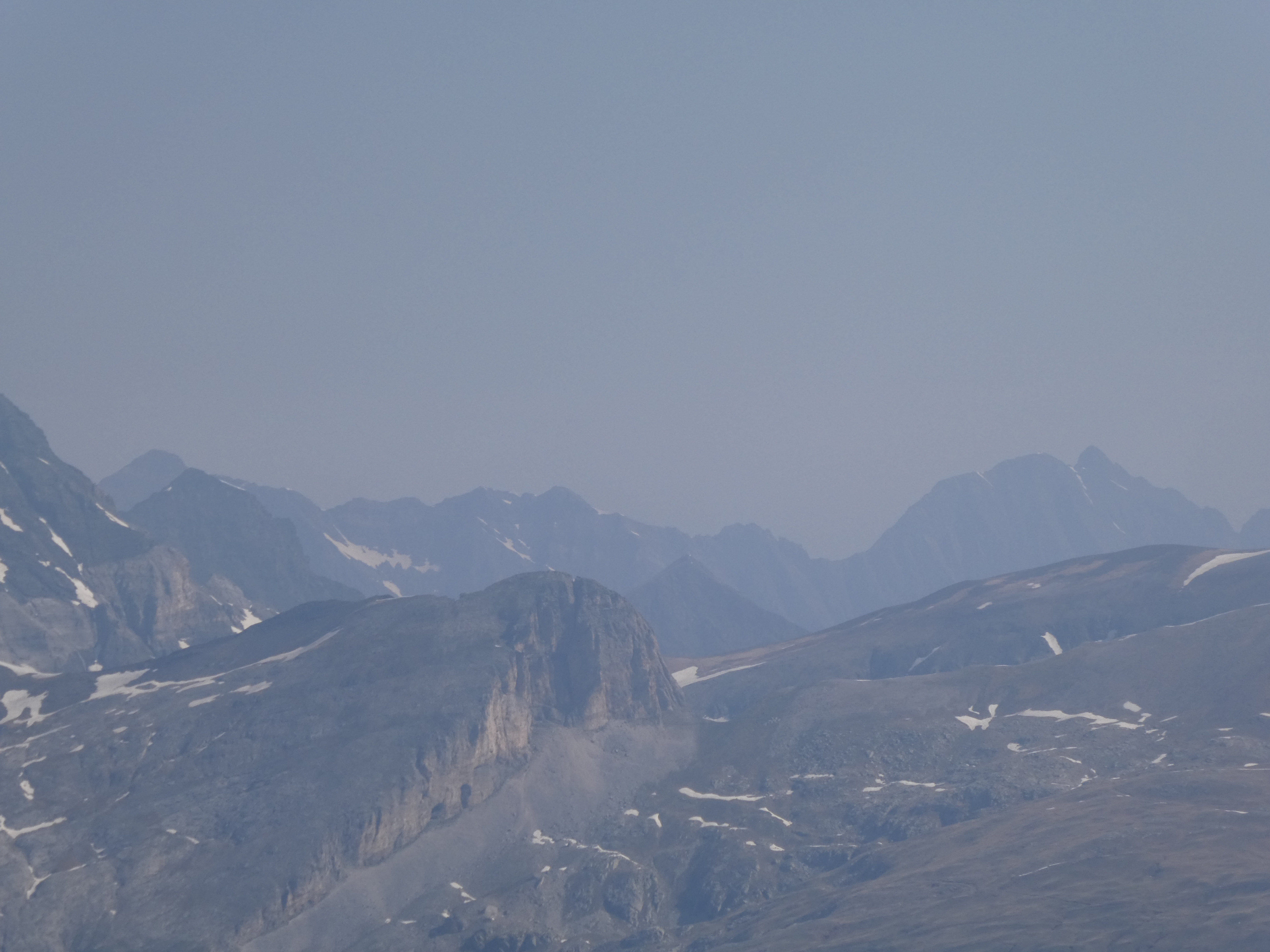 Arrivée au sommet de la Pala de Montinier (2593 m) : beau panorama malgré la présence de poussière dans l'atmosphère sur les sommets du Sobrarbe, de la Vallée de Gavarnie, de la Haute Vallée d'Aure, de la Ribagorza, du Somontano de Barbastro, de la Hoya de Huesca, de l'Alto Gállego ainsi que la Valle de la Cinca