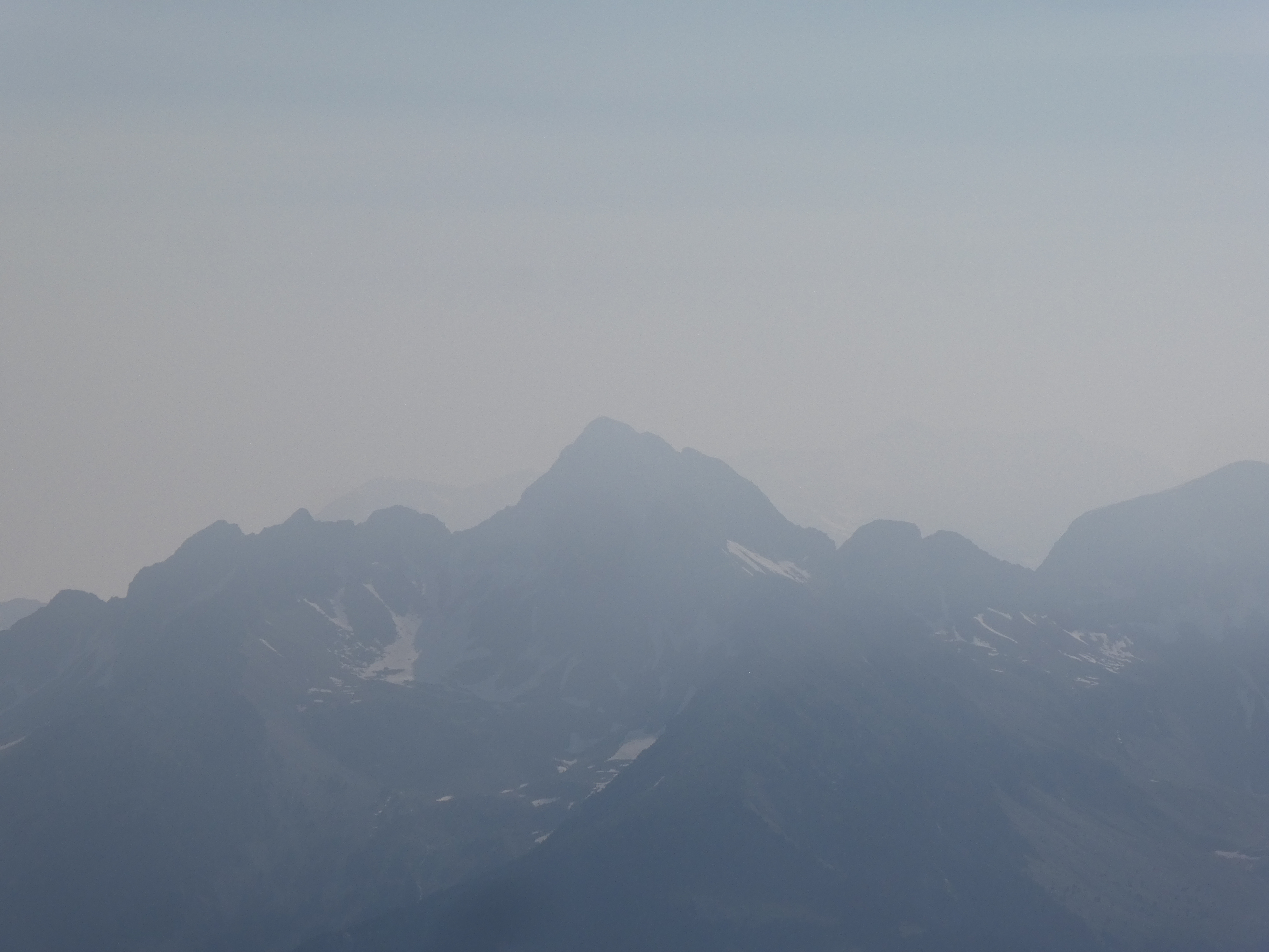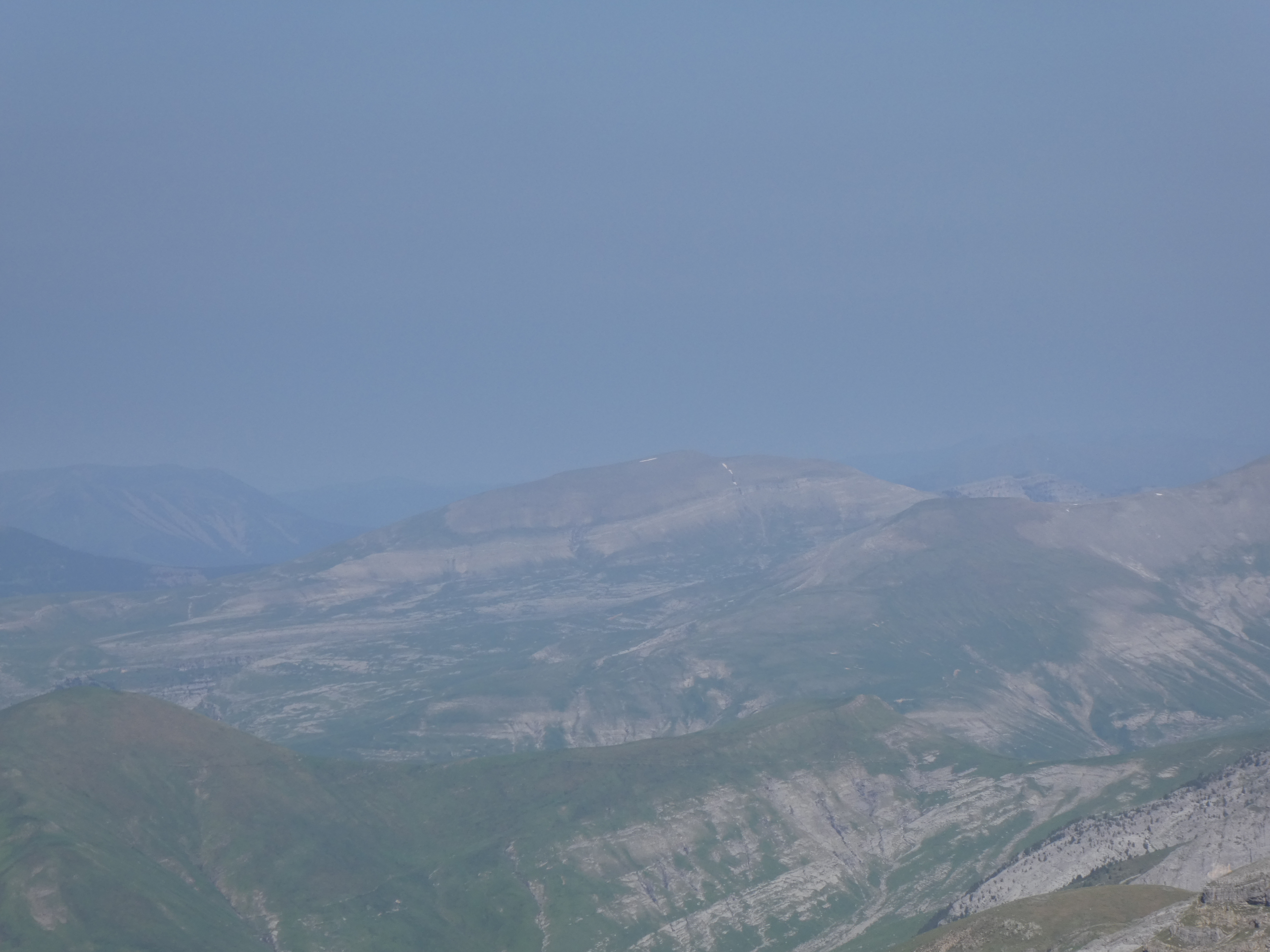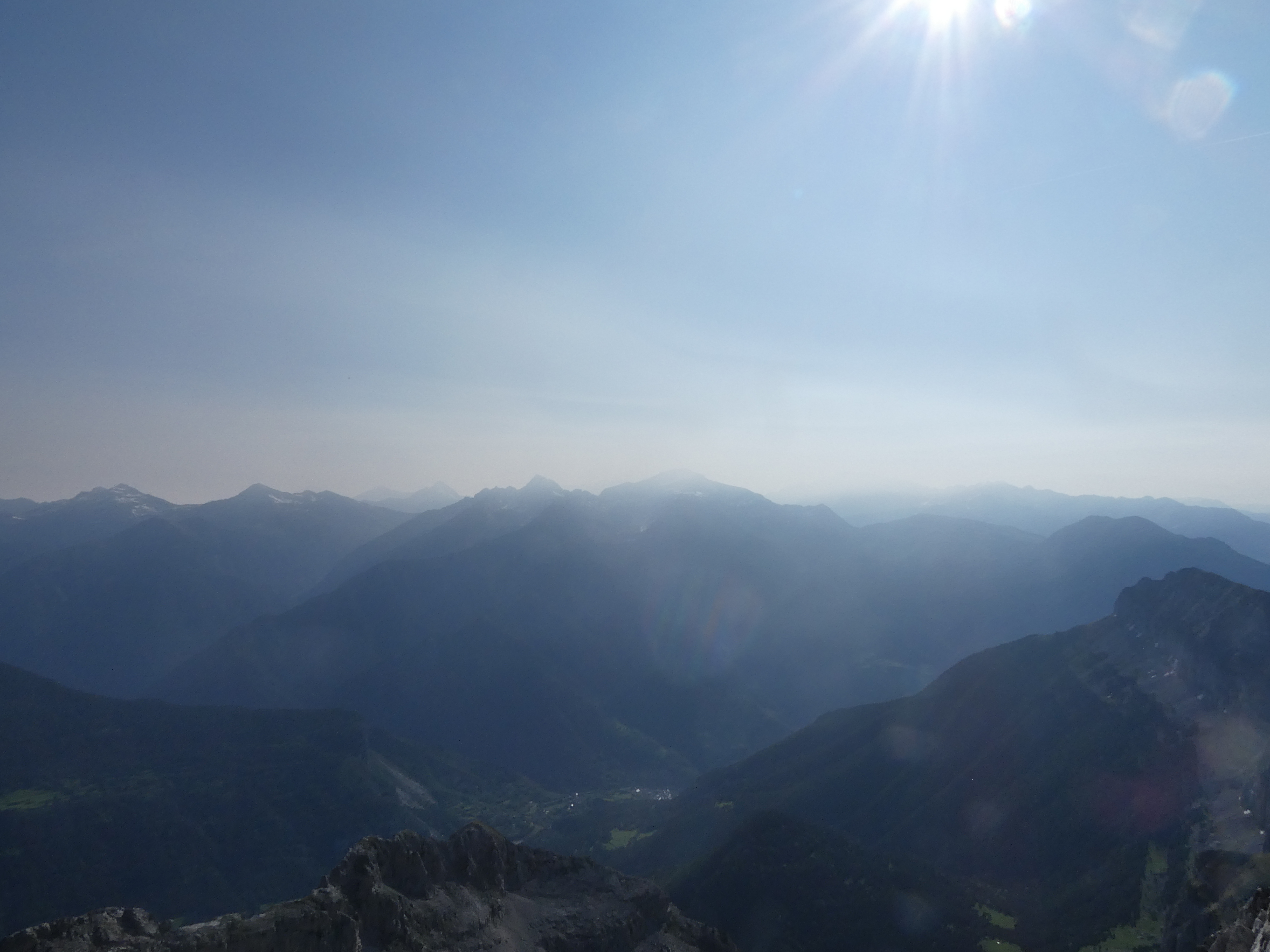 Arrivée au sommet de la Pala de Montinier (2593 m) : beau panorama malgré la présence de poussière dans l'atmosphère sur les sommets du Sobrarbe, de la Vallée de Gavarnie, de la Haute Vallée d'Aure, de la Ribagorza, du Somontano de Barbastro, de la Hoya de Huesca, de l'Alto Gállego ainsi que la Valle de la Cinca