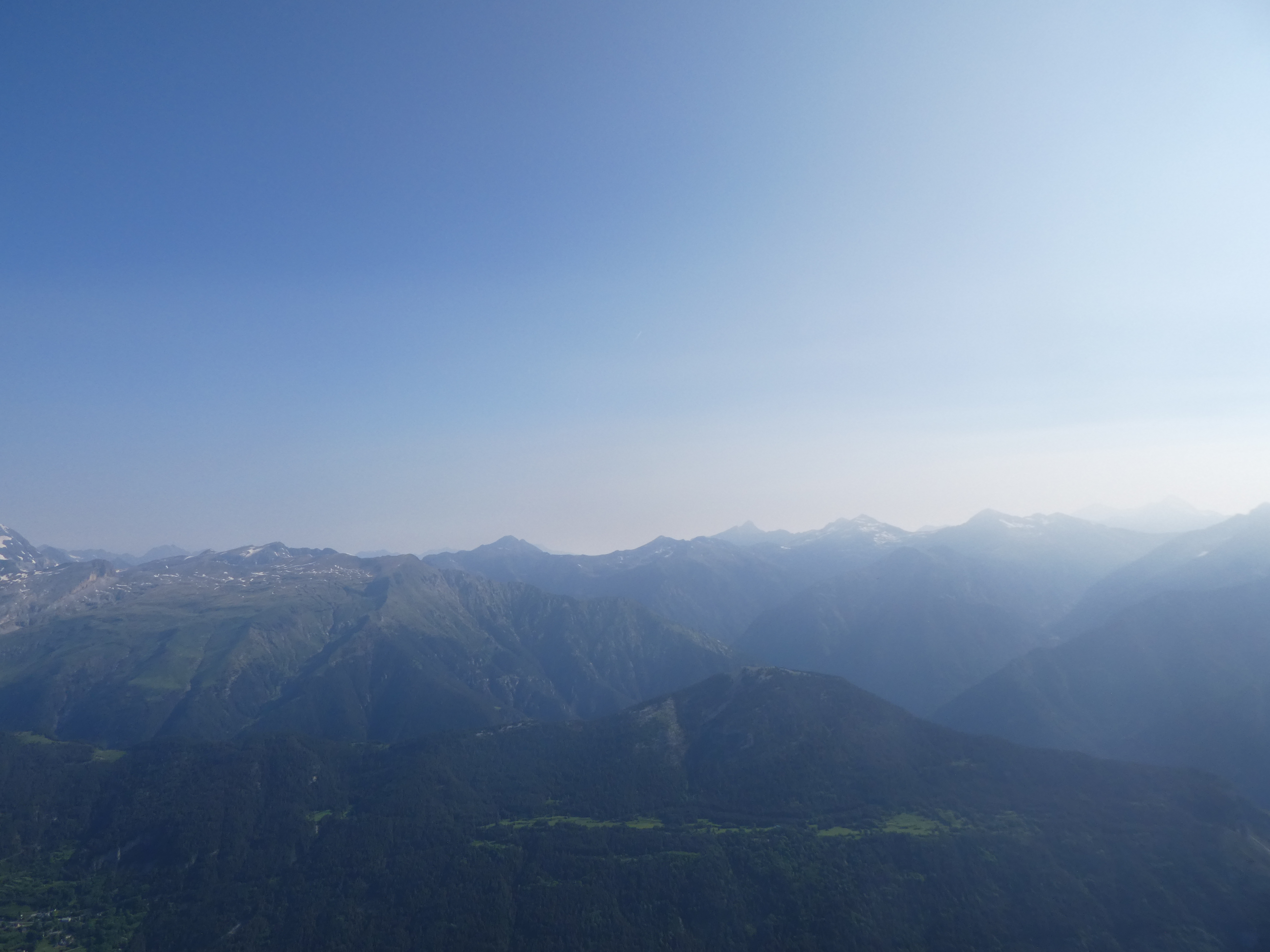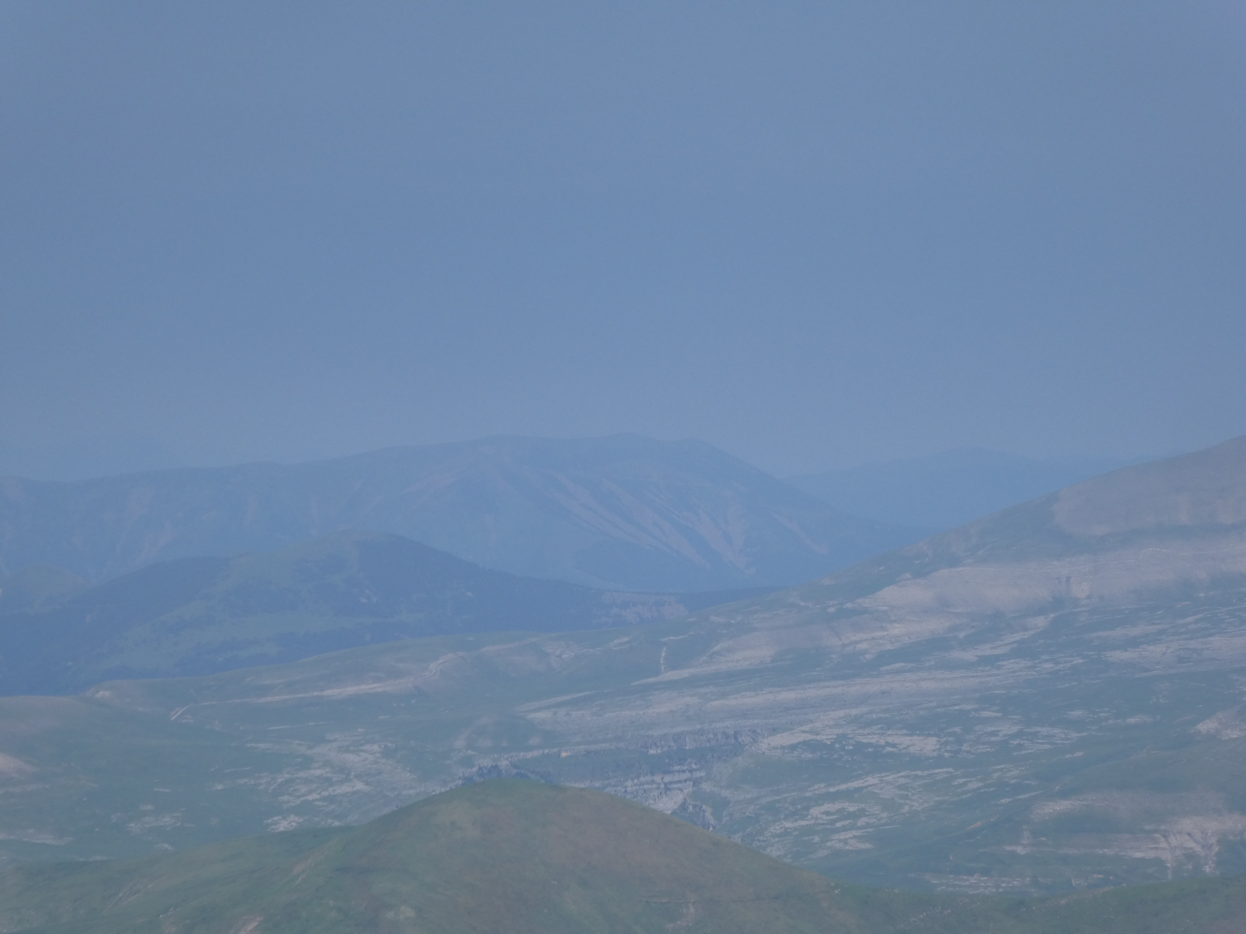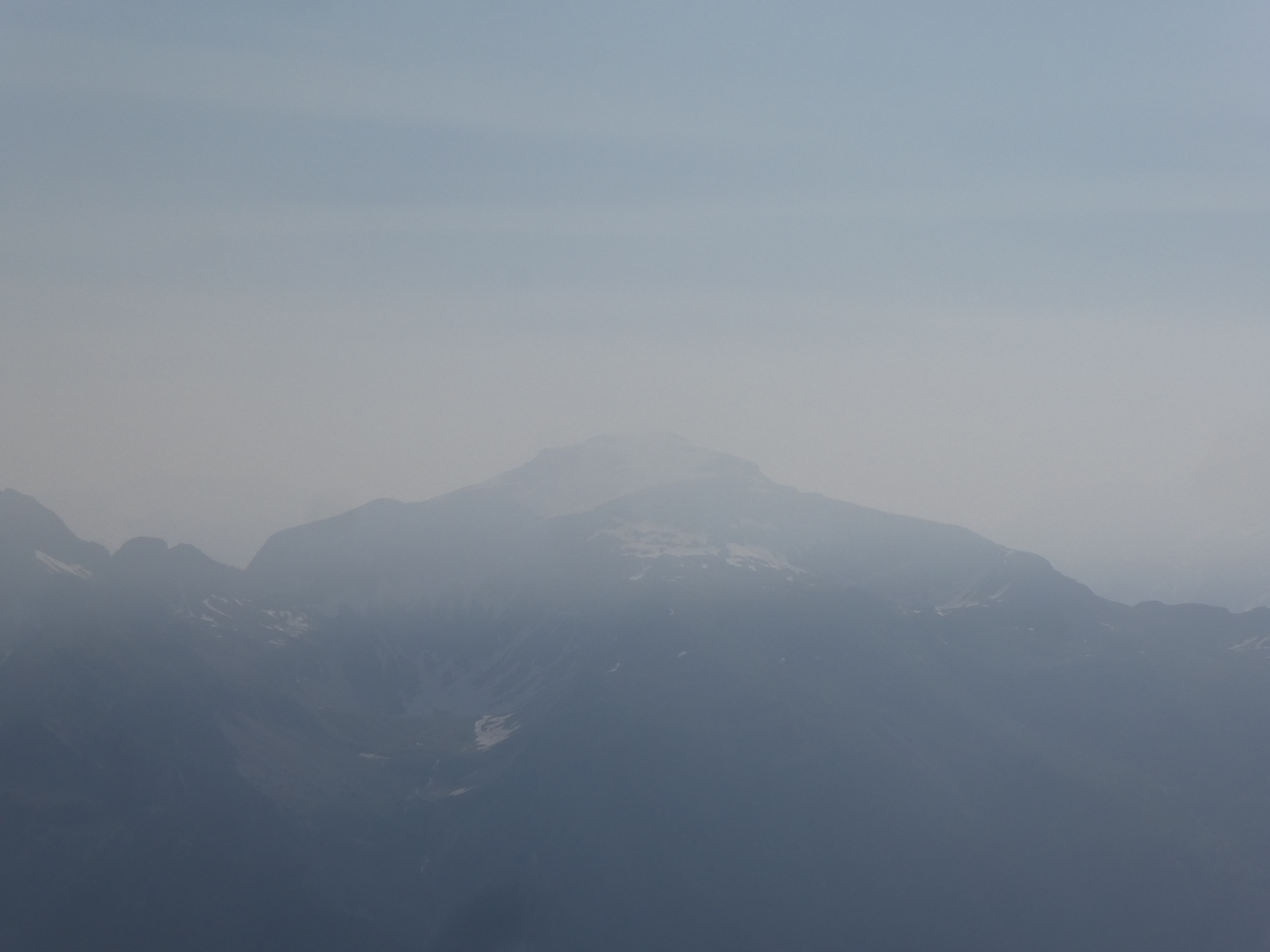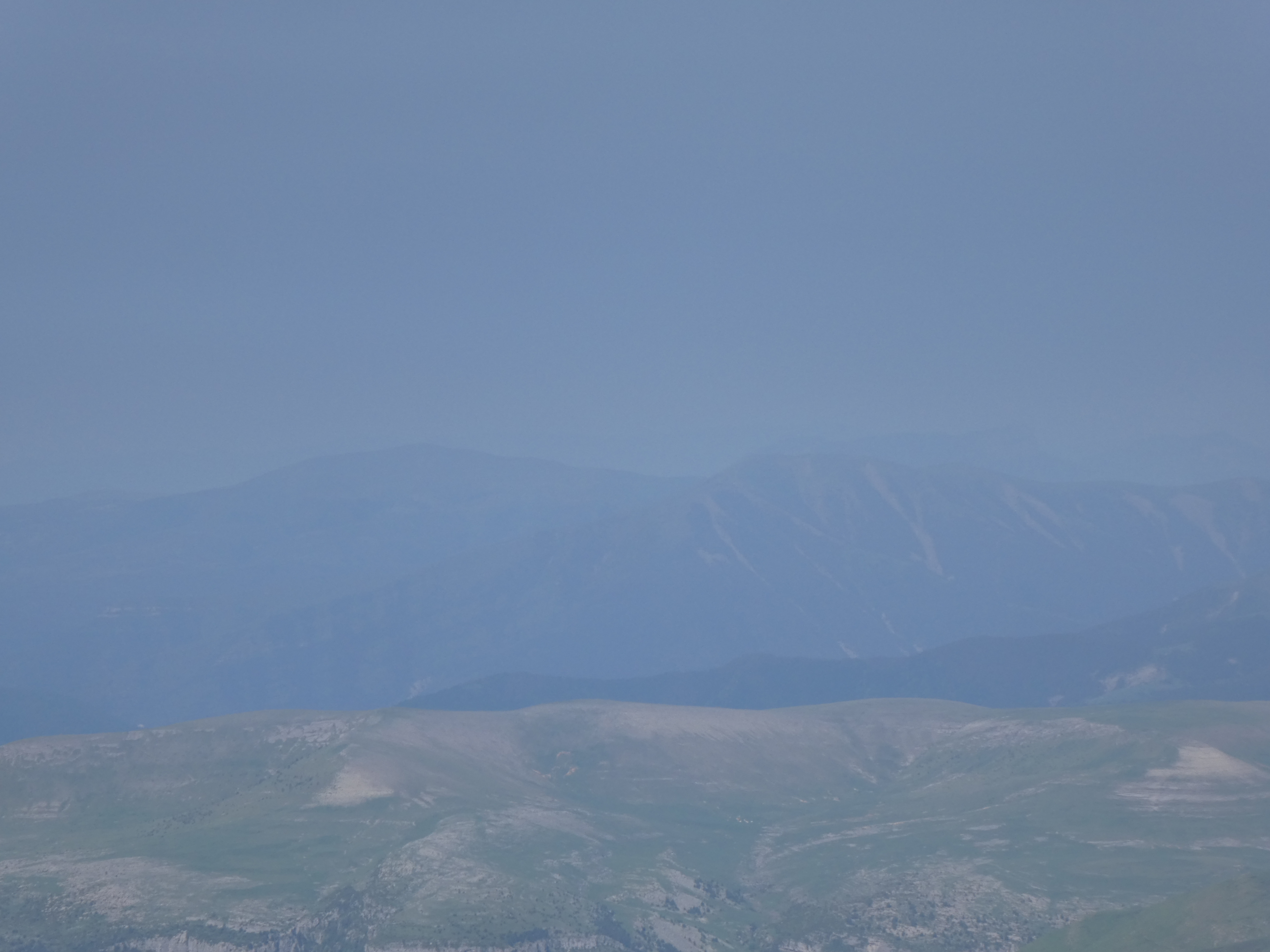 Arrivée au sommet de la Pala de Montinier (2593 m) : beau panorama malgré la présence de poussière dans l'atmosphère sur les sommets du Sobrarbe, de la Vallée de Gavarnie, de la Haute Vallée d'Aure, de la Ribagorza, du Somontano de Barbastro, de la Hoya de Huesca, de l'Alto Gállego ainsi que la Valle de la Cinca