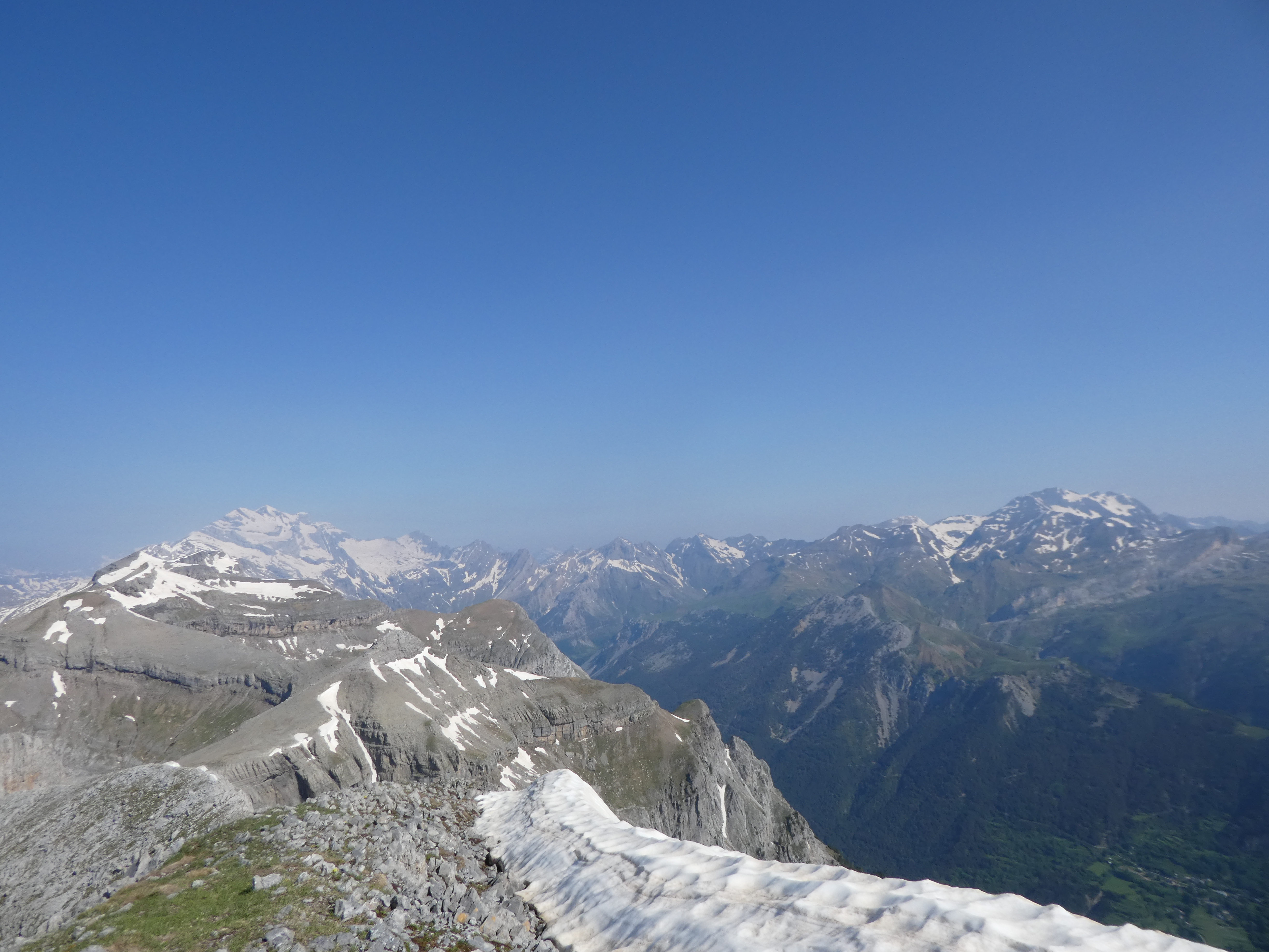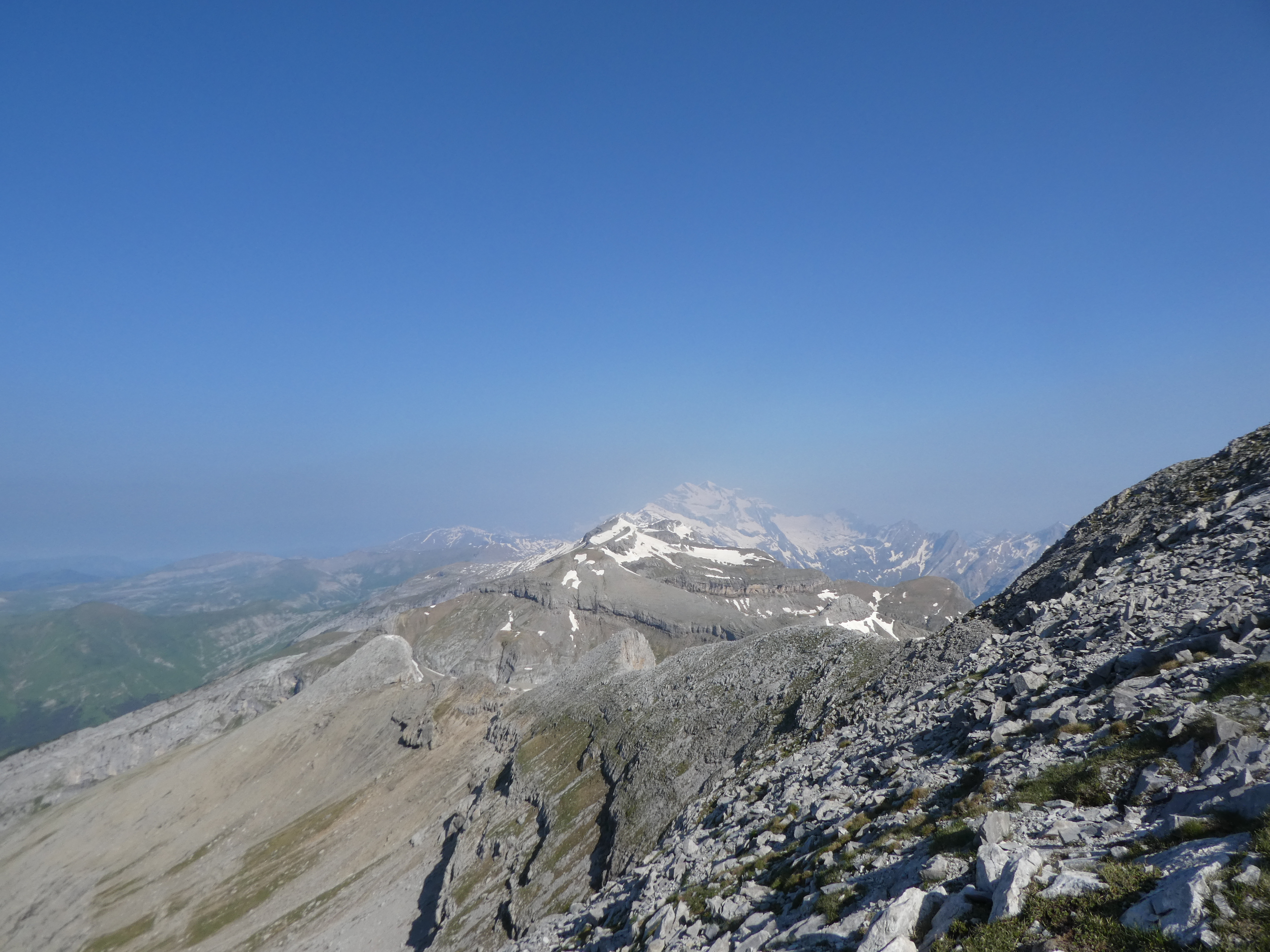 Zoom sur le Pico de Añisclo ou Soum de Ramond (3257 m) au centre-gauche, le Monte Perdido (3355 m) au centre, le Cilíndro de Marboré (3325 m) au centre-gauche et le Pico de Marboré (3252 m) à droite