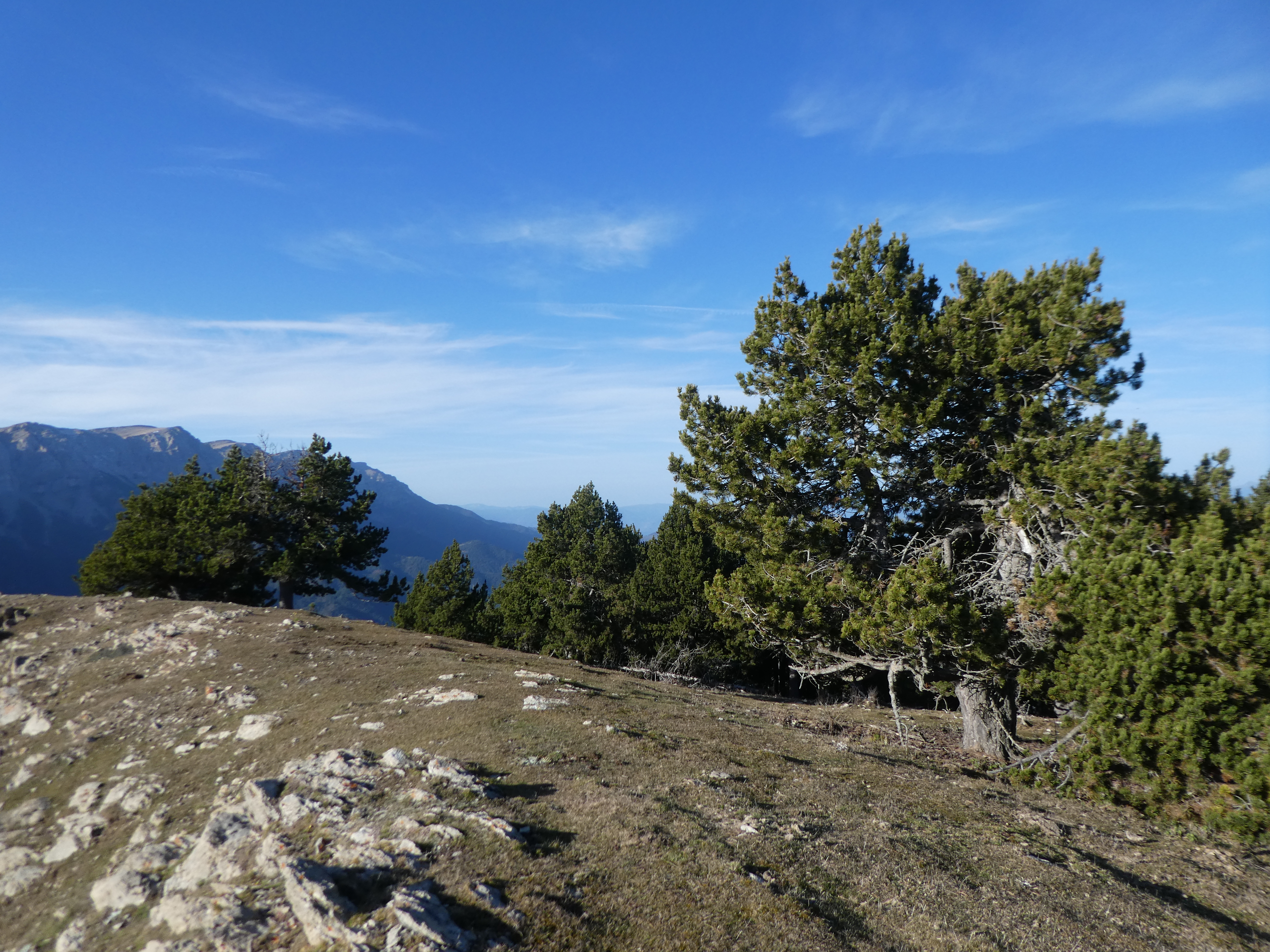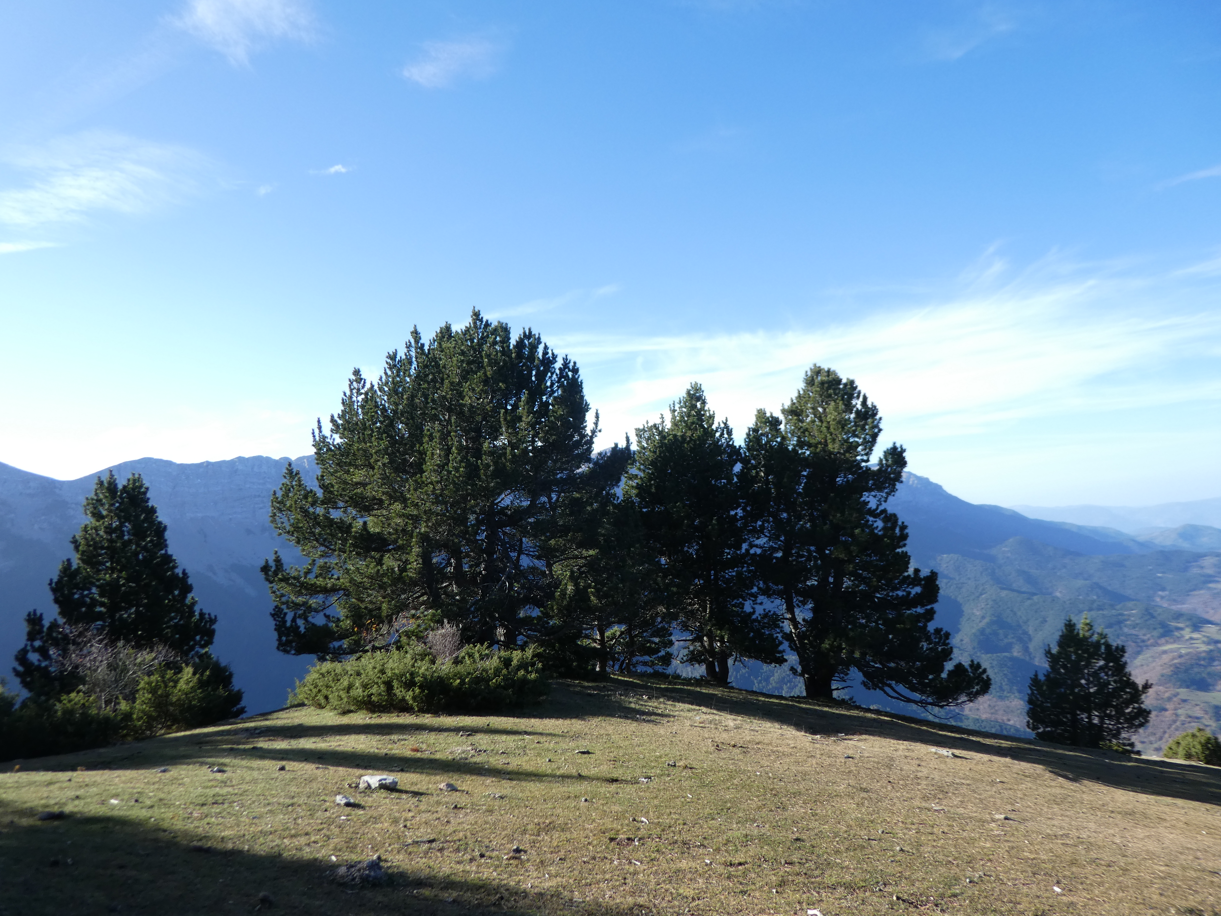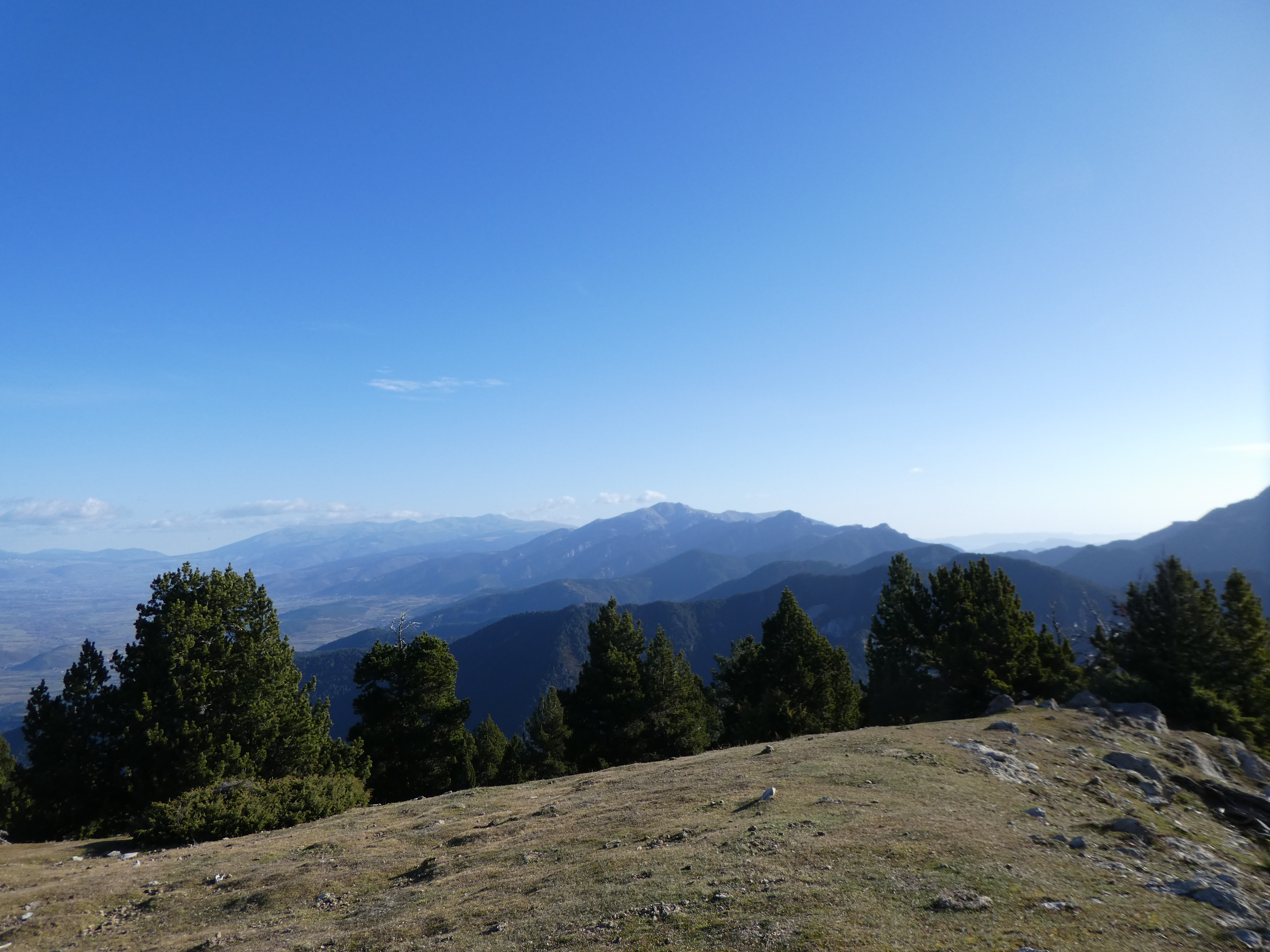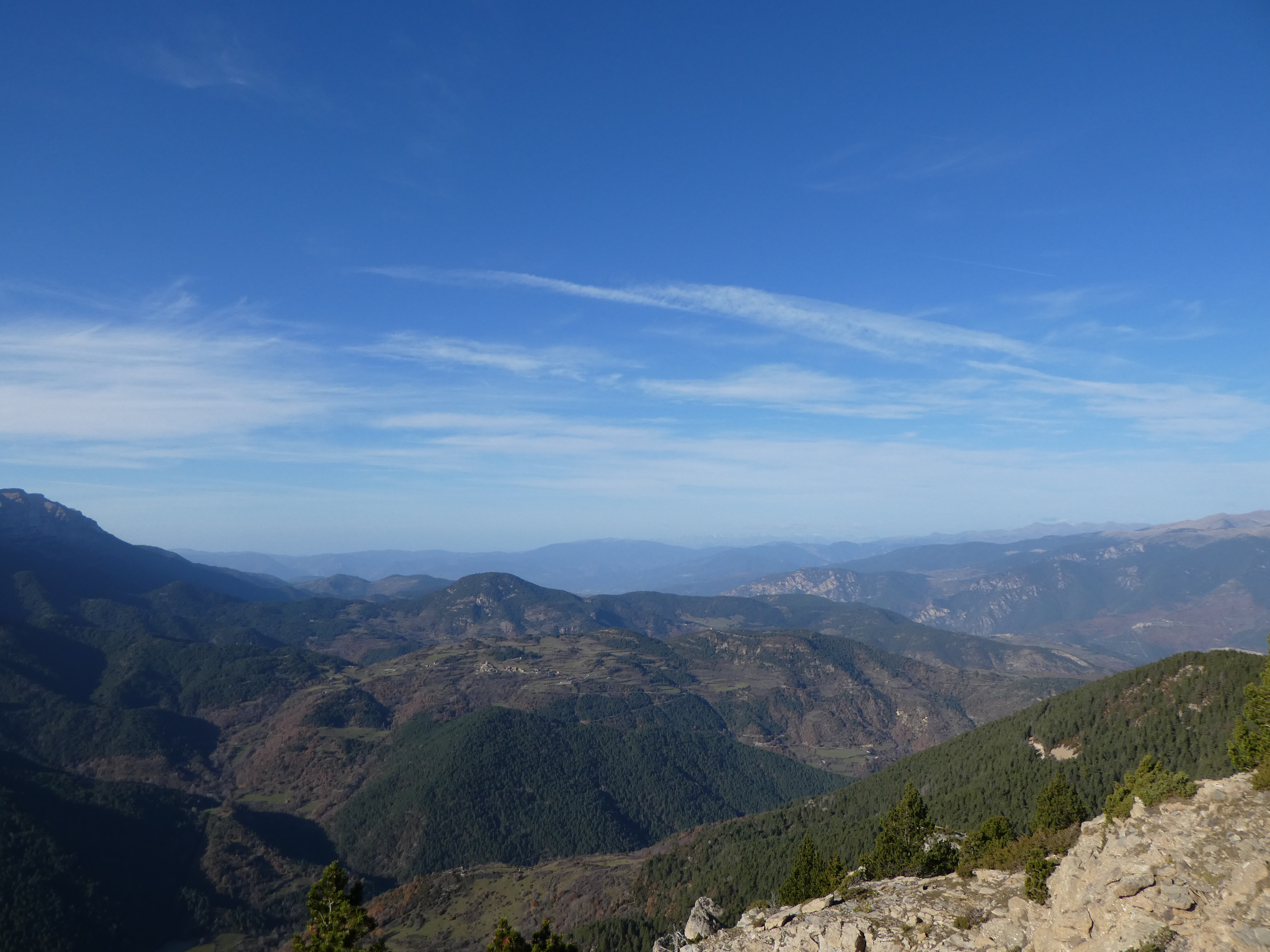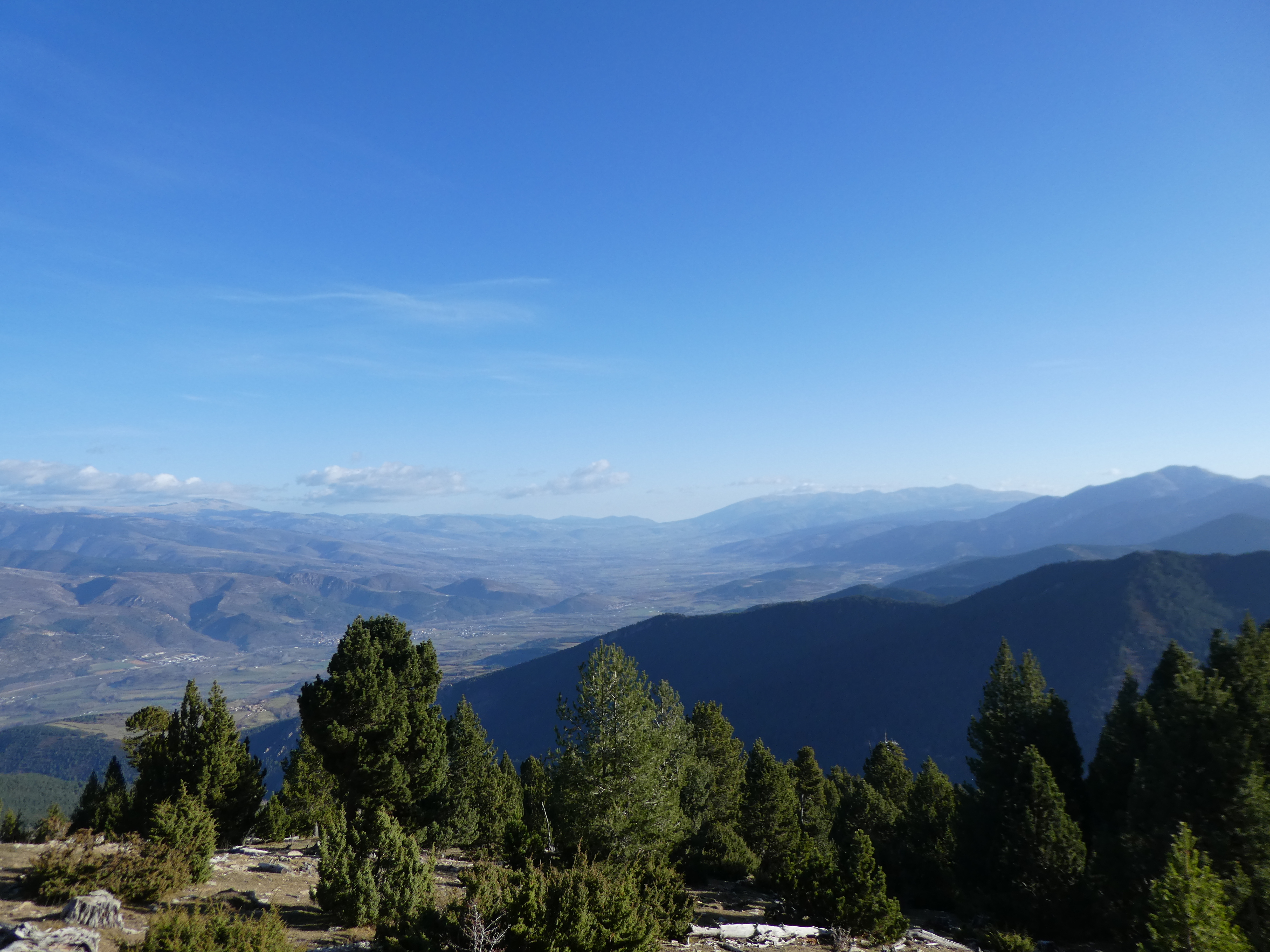 Arrivée au sommet de la Roca Gran (2088 m) : beau panorama malgré la présence de végétation sur les sommets de la Serra del Cadí, de l'Alt Urgell, de la Cerdanya, de la Haute-Cerdagne, du Haut-Conflent ainsi que sur la Vall del Segre