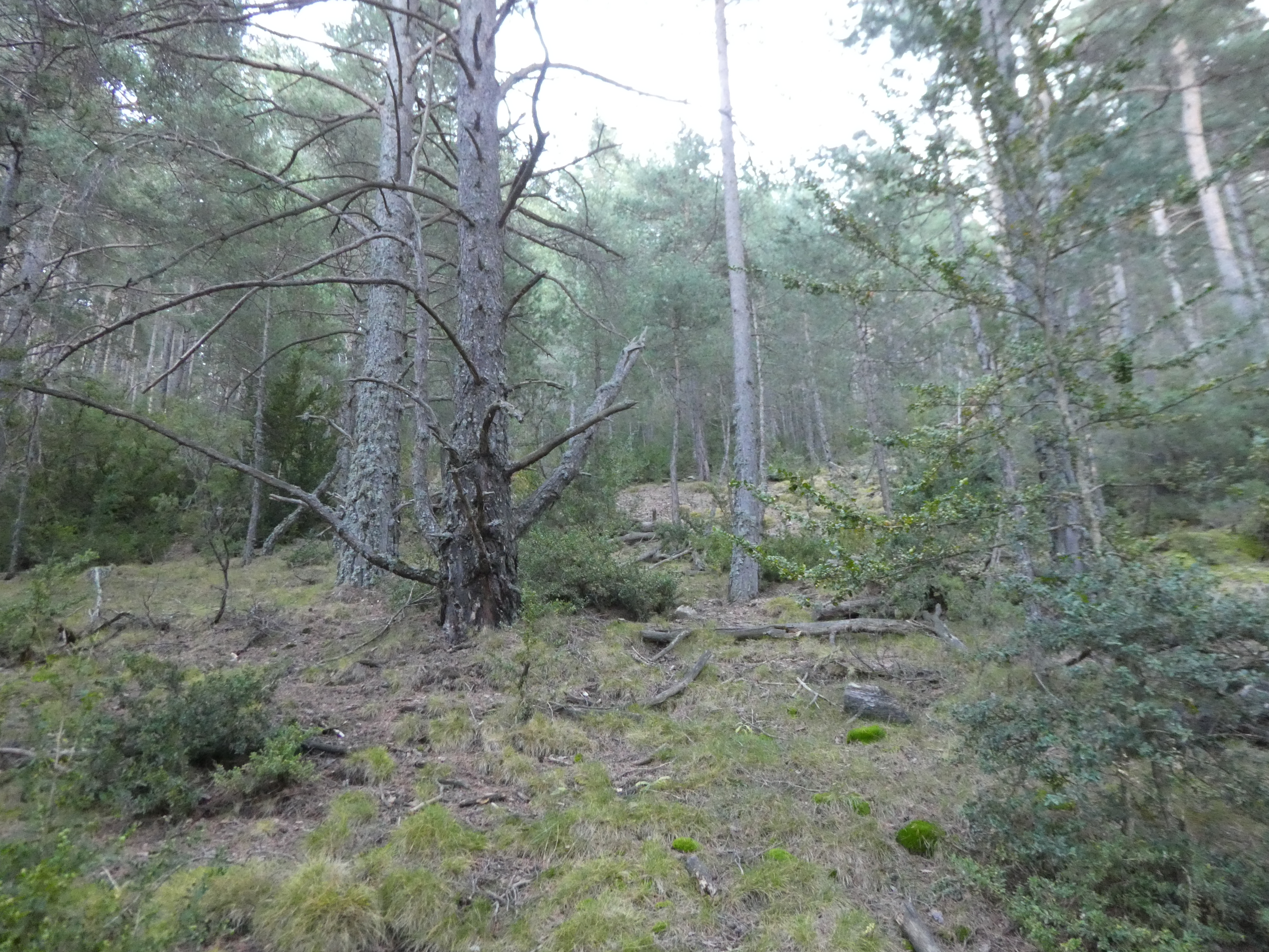 Dès qu'il n'est plus possible de suivre la crête vers l'Ouest (200 mètres après avoir quitté la Roca Gran), suivre la ligne de crête descendant sur la droite vers le Nord-Ouest direction Montellà