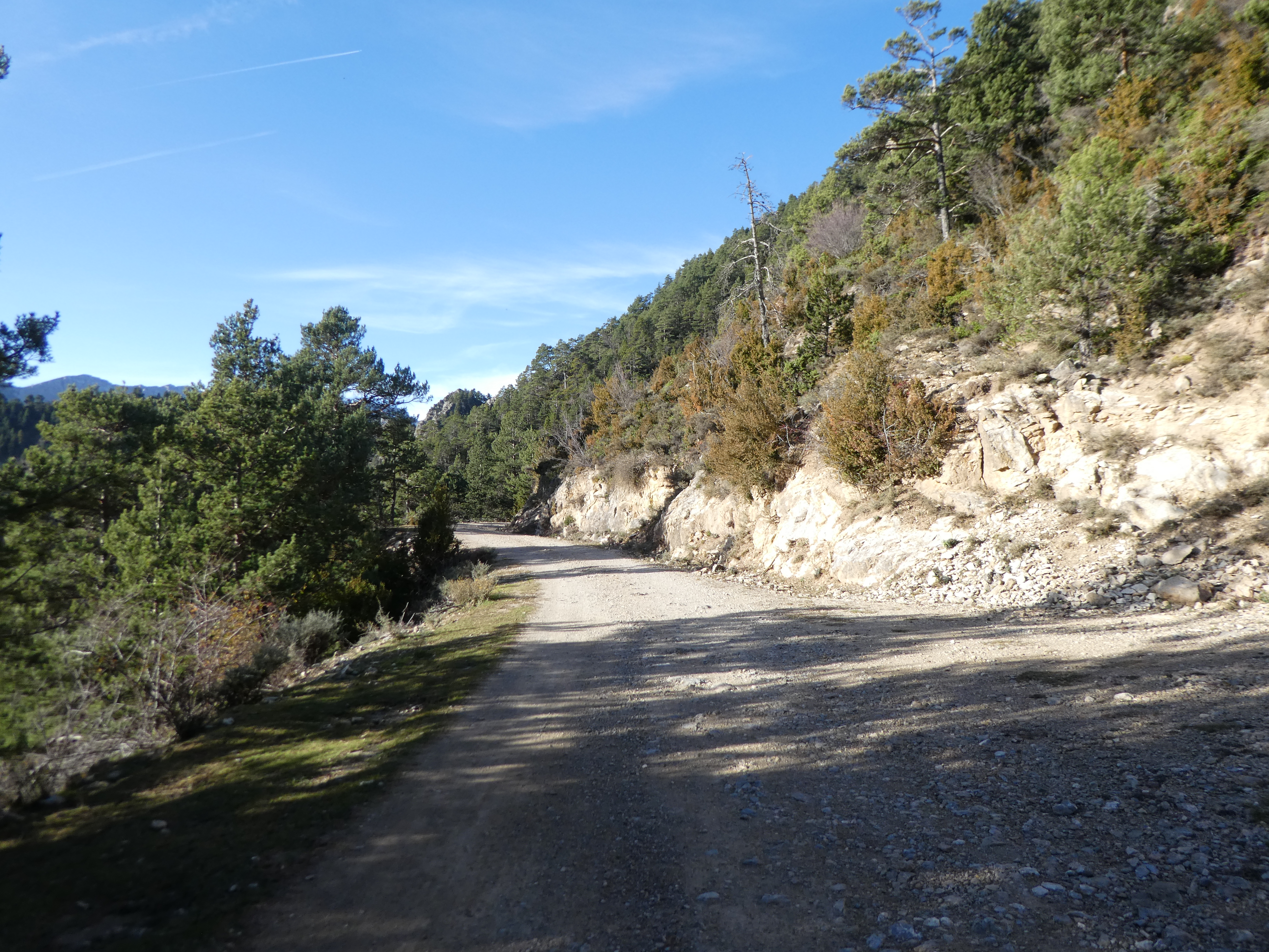 A ce croisement avec la piste faisant la liaison entre le Pla de la Bassa et le Coll de Guillera (1400 mètres après le précédent), suivre cette dernière partant légèrement sur la droite direction Montellà, balisé en jaune