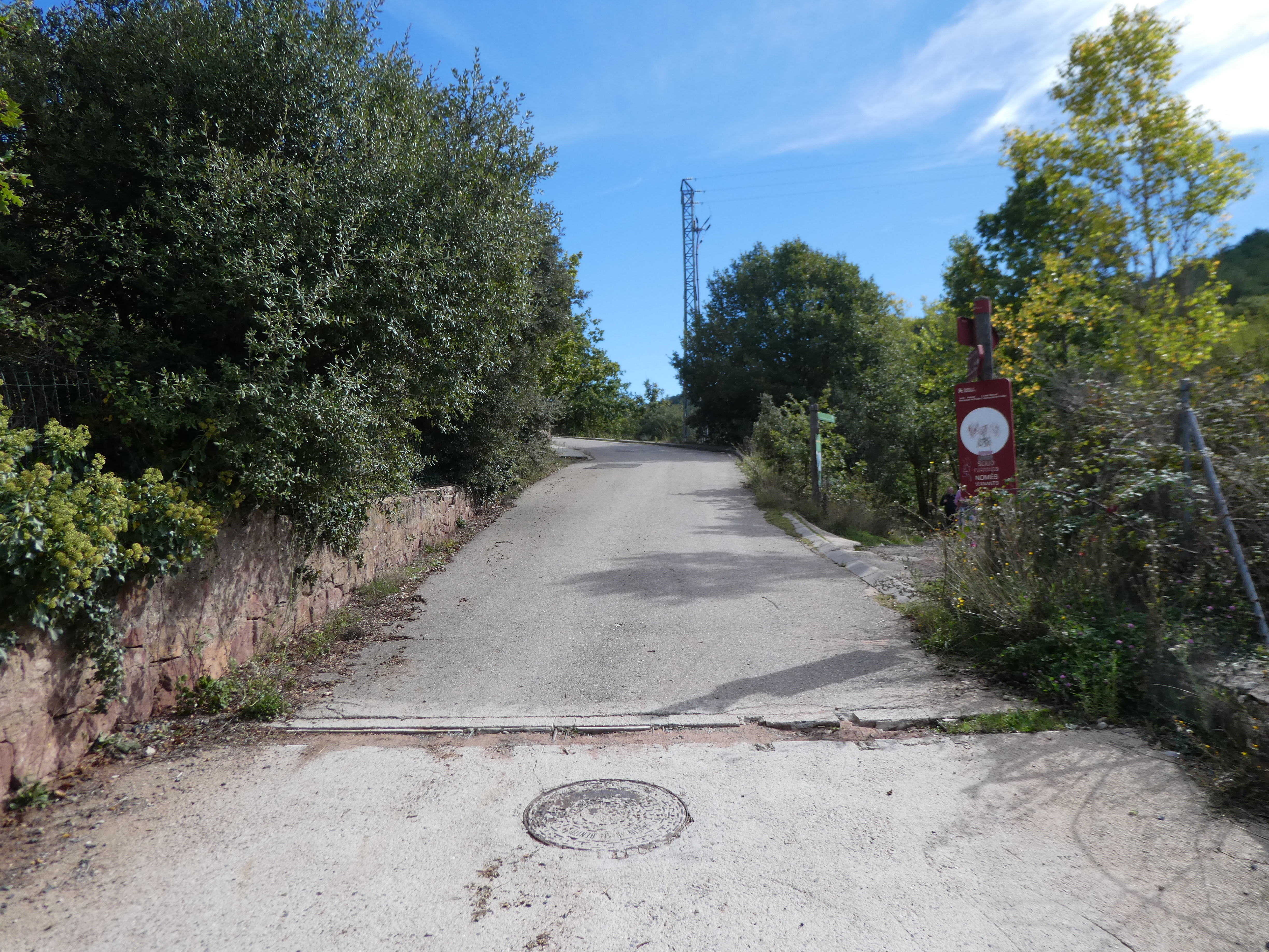 A ce croisement marqué par la présence d'un panneau directionnel (150 mètres après le précédent), suivre le chemin partant tout droit en face de la route direction Capafonts (per l'Ermita de l'Abellera), balisé sporadiquement en bleu et jaune