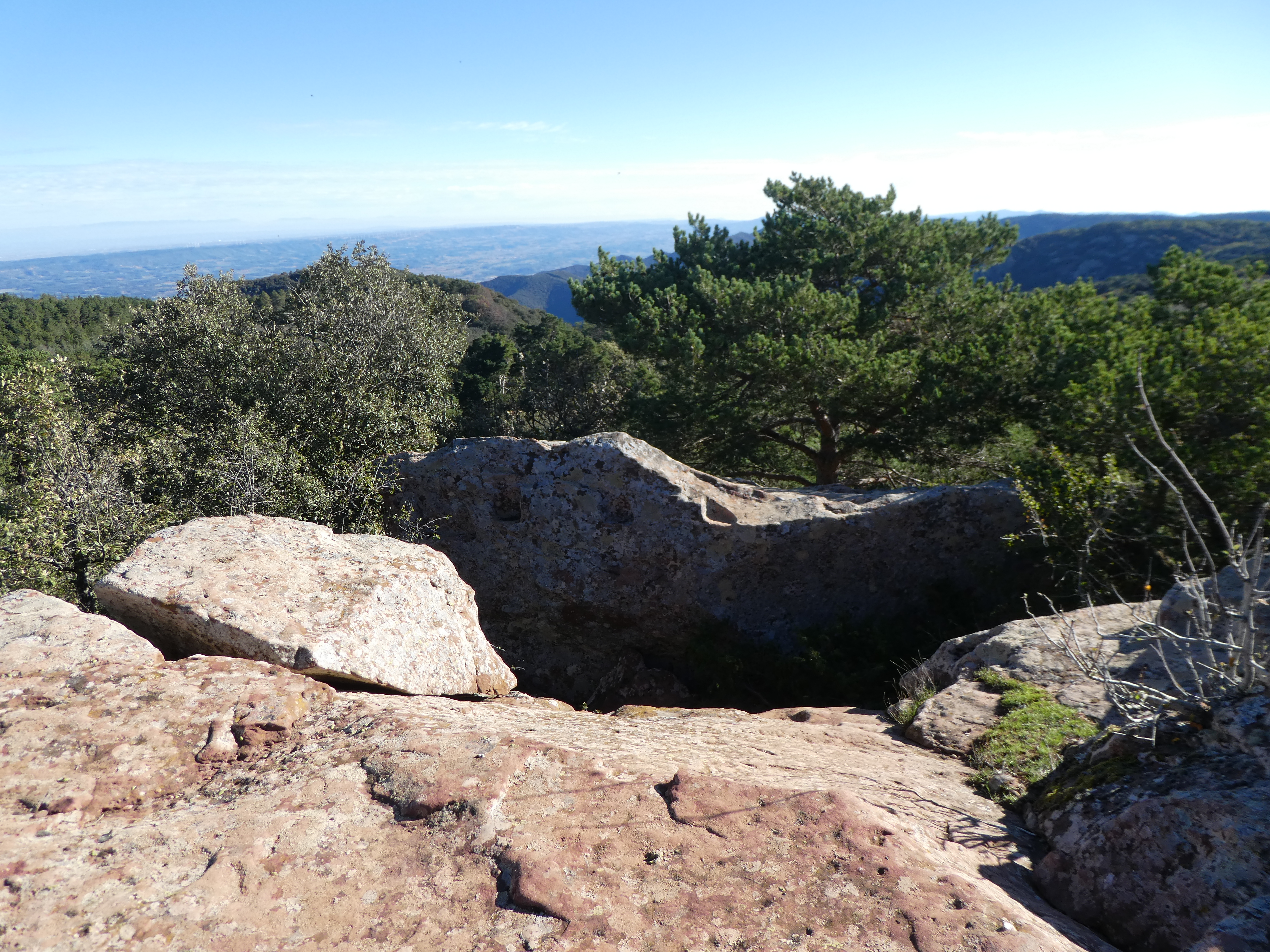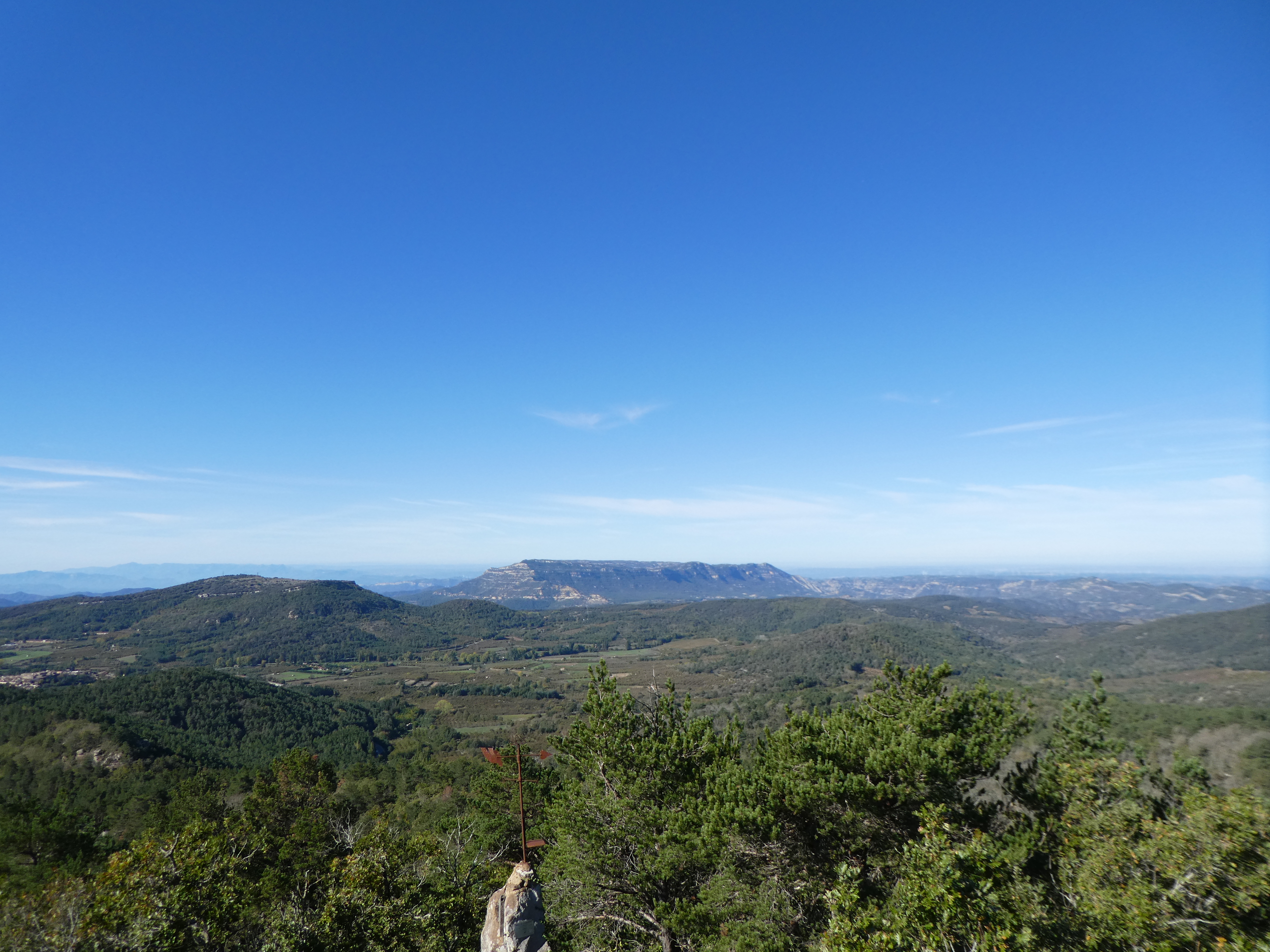 Arrivée au sommet de la Roca del Gríngol (1177 m) : beau panorama sur les sommets du Baix Camp, de l'Alt Urgell, du Solsonès, du Berguedà, de la Conca de Barberà, de la Vall de l'Ebre ainsi que sur la plaine de Lérida