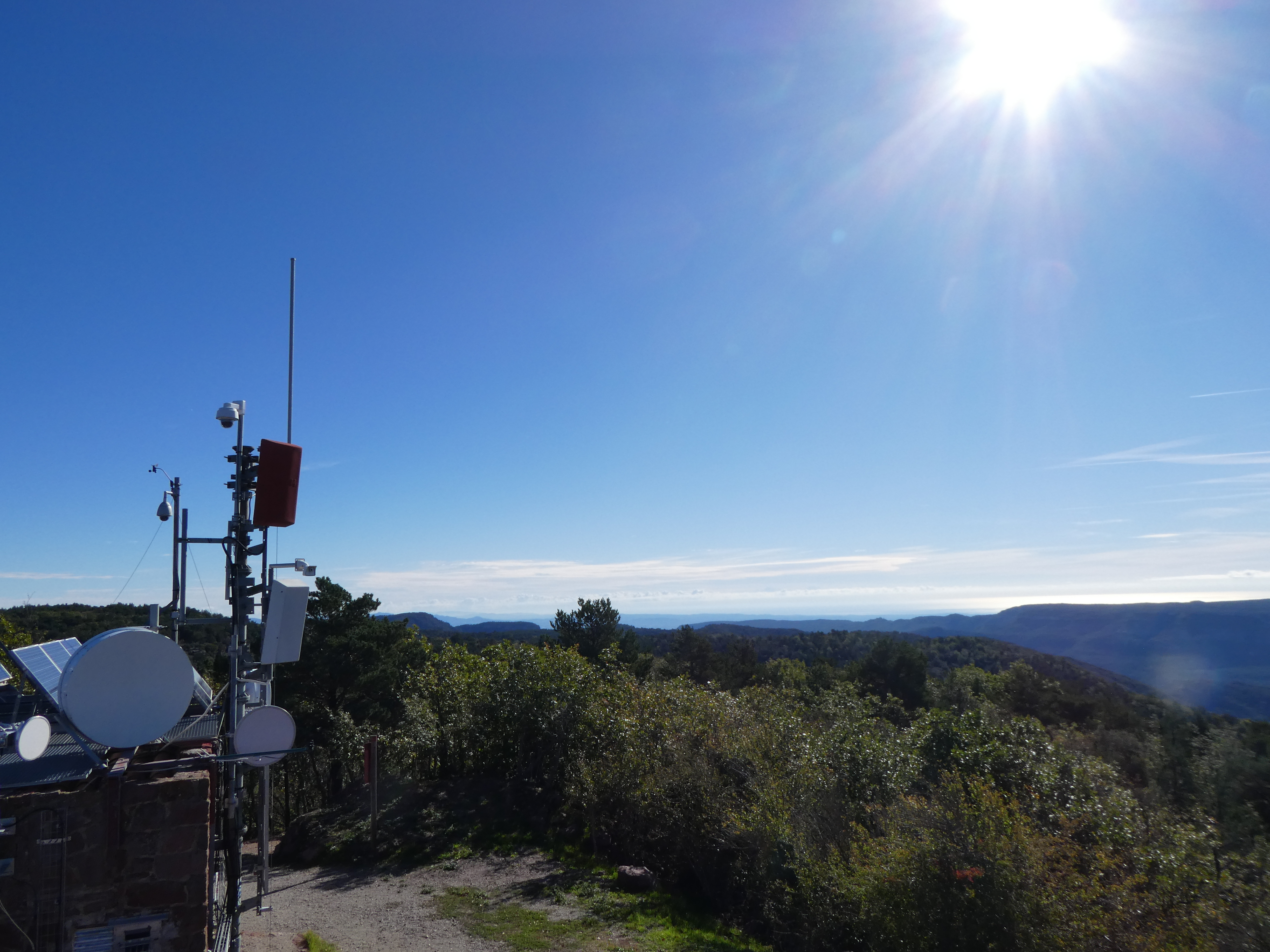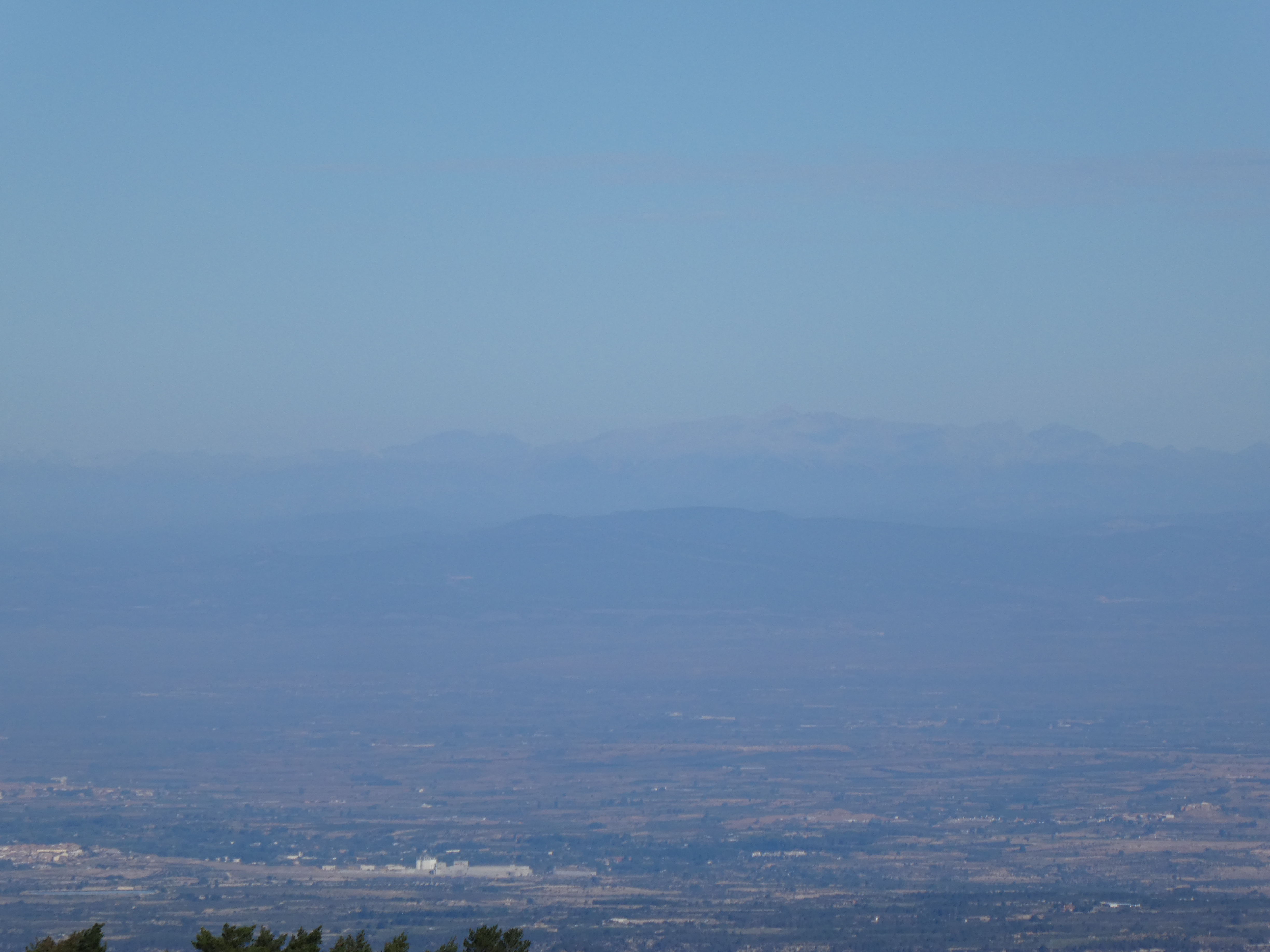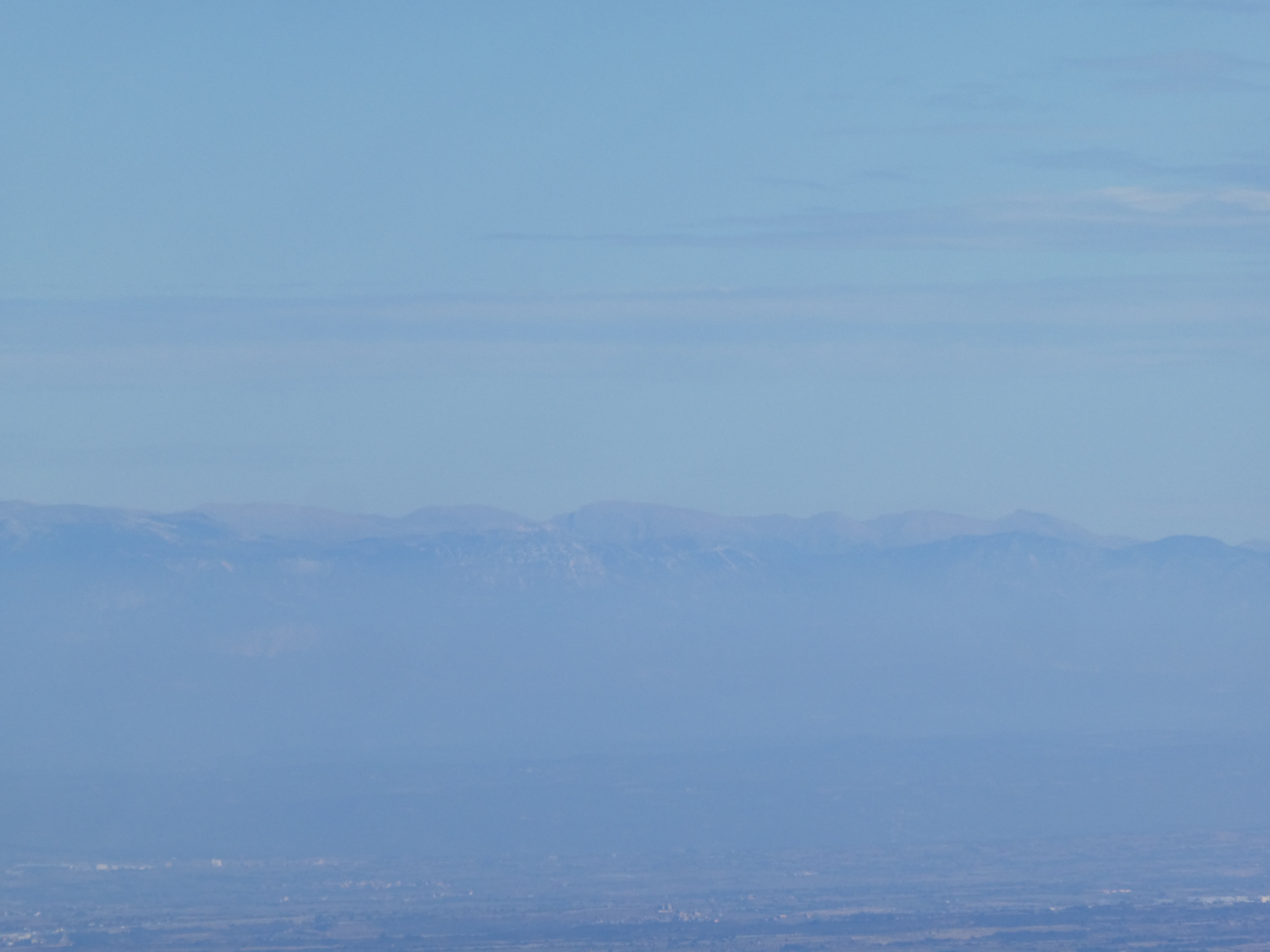 Zoom sur la Cambra d'Ase (2750 m) à gauche, le Puigmal (2910 m) et le Pic Superior de la Vaca (2826 m) au centre, et le Bastiments (2881 m) et el Balandrau (2586 m) à droite situés à près de 150 kilomètres !