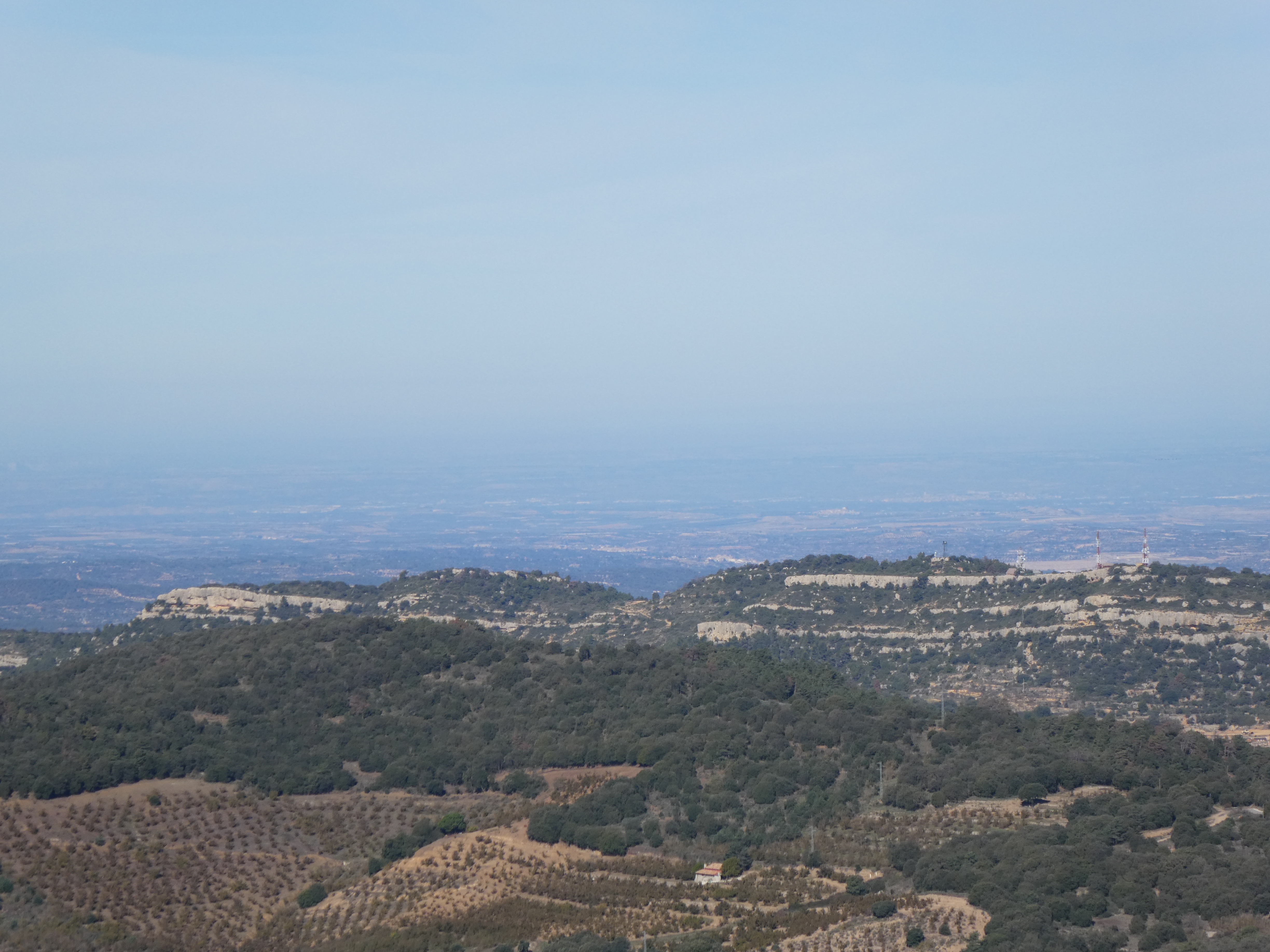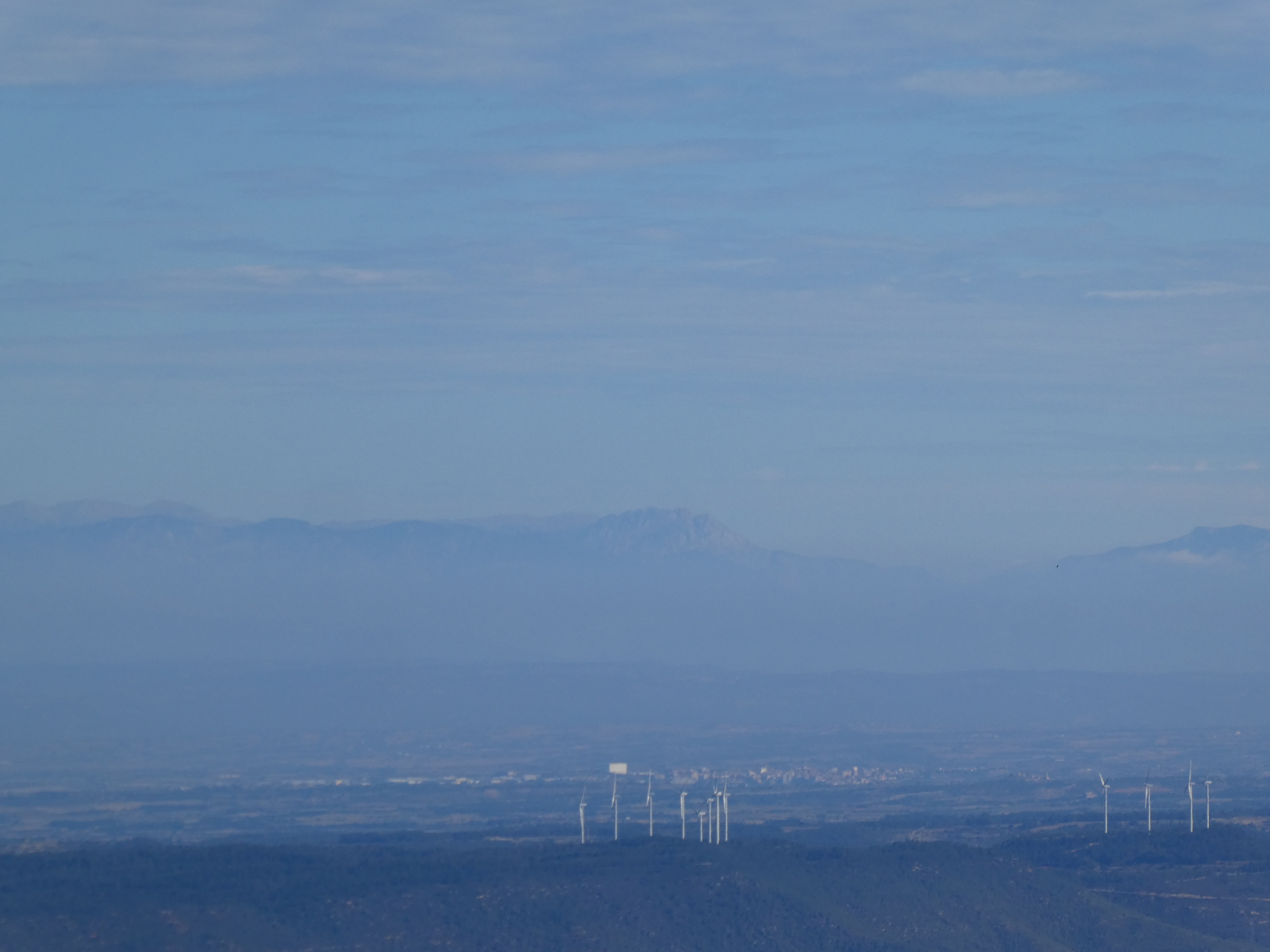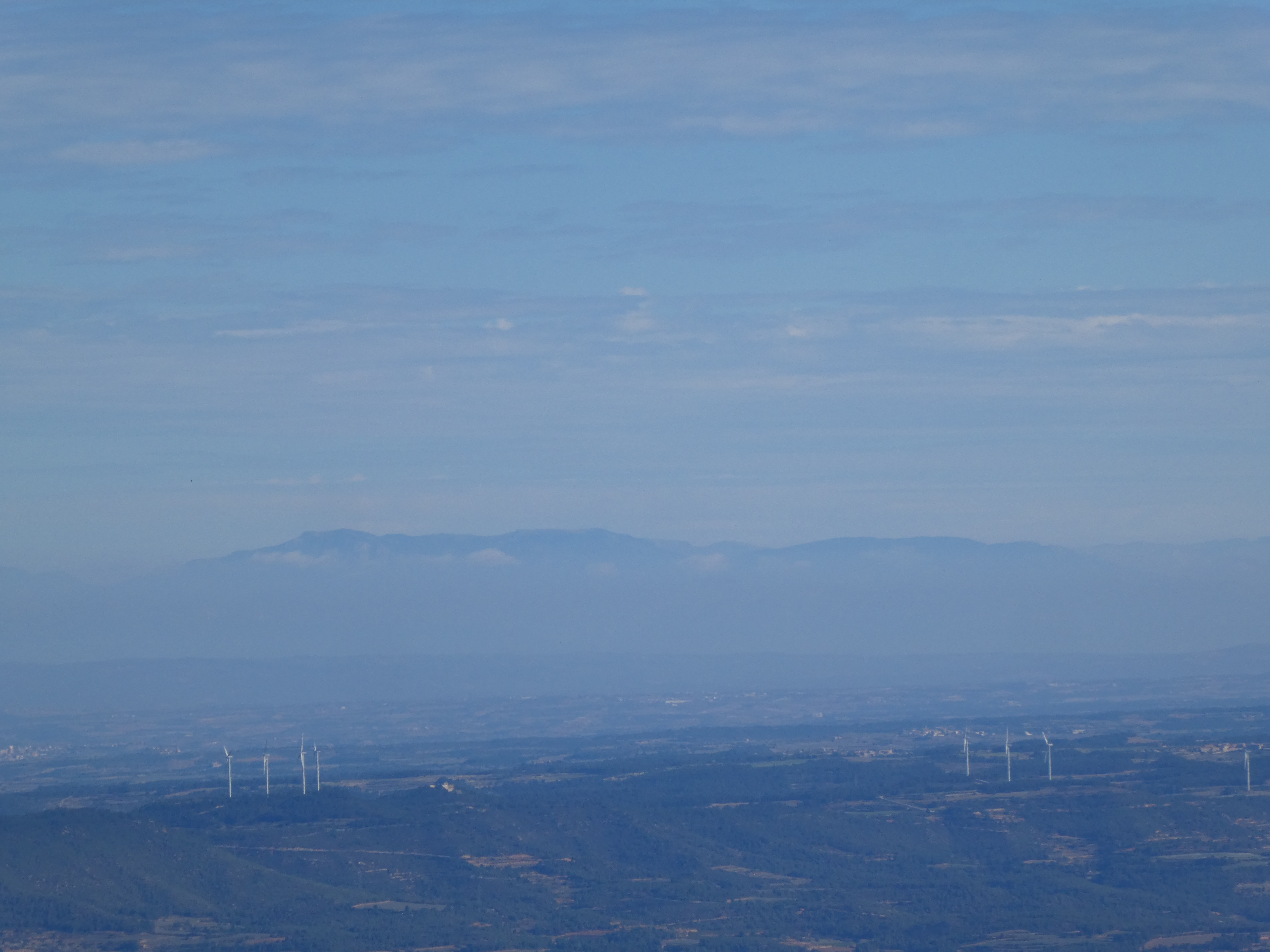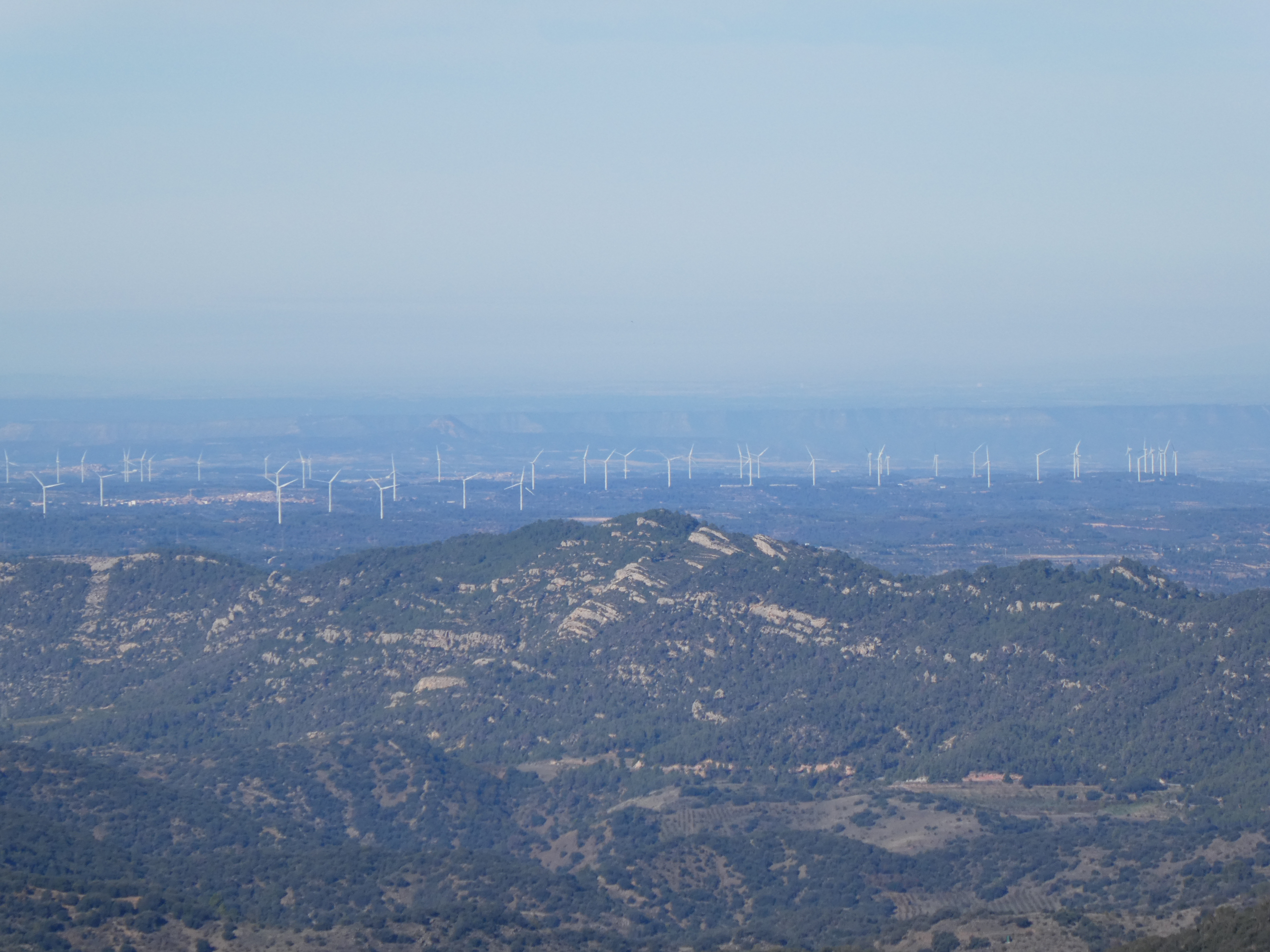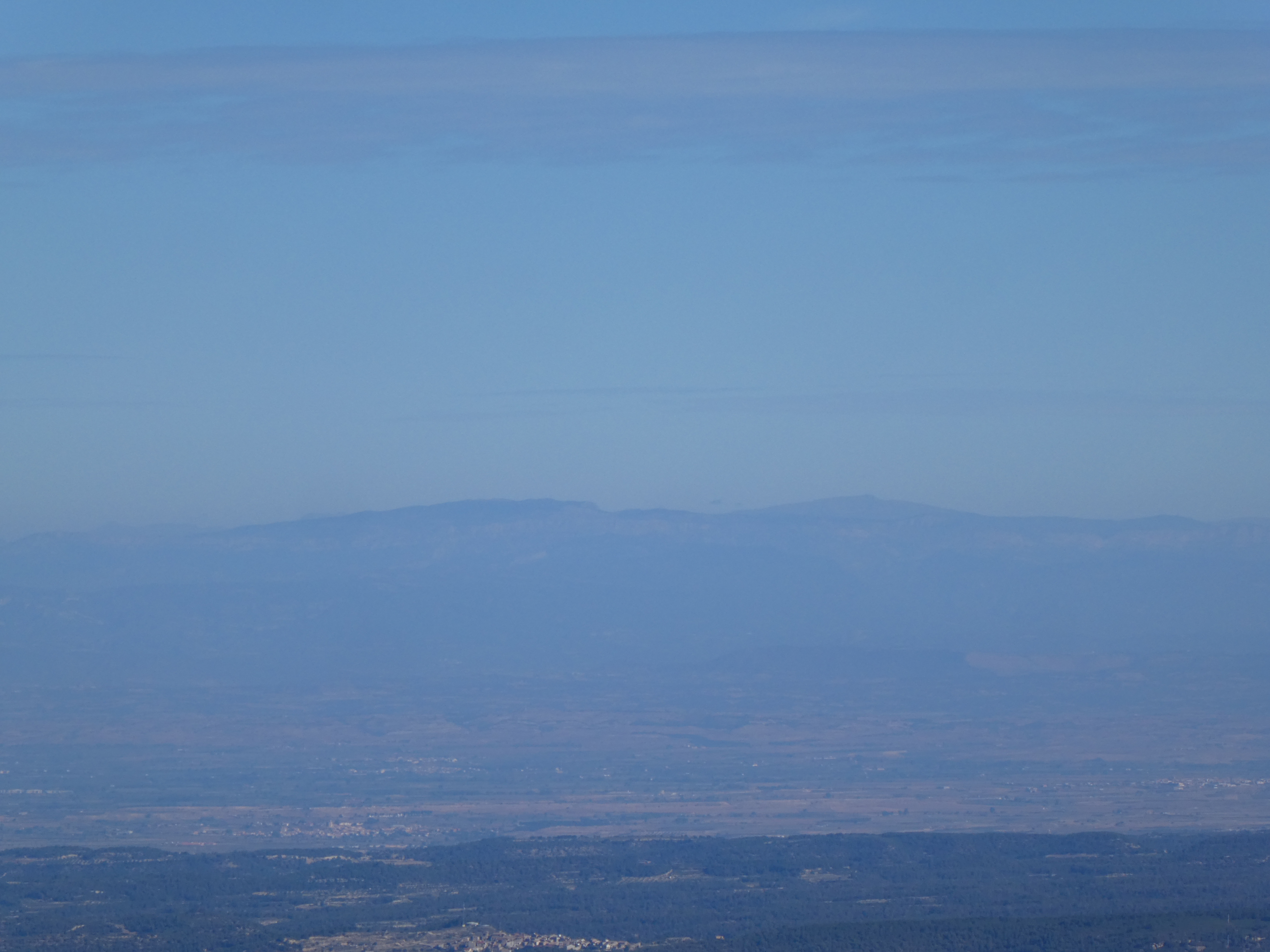 Arrivée au sommet du Tossal de la Baltasana (1201 m) : beau panorama sur les sommets du Baix Camp, de la Vall de l'Ebre, de la Terra Alta, du Priorat, de les Garrigues, du Pallars Jussà, de l'Alt Urgell, du Solsonès, du Berguedà ainsi que sur la plaine de Lérida