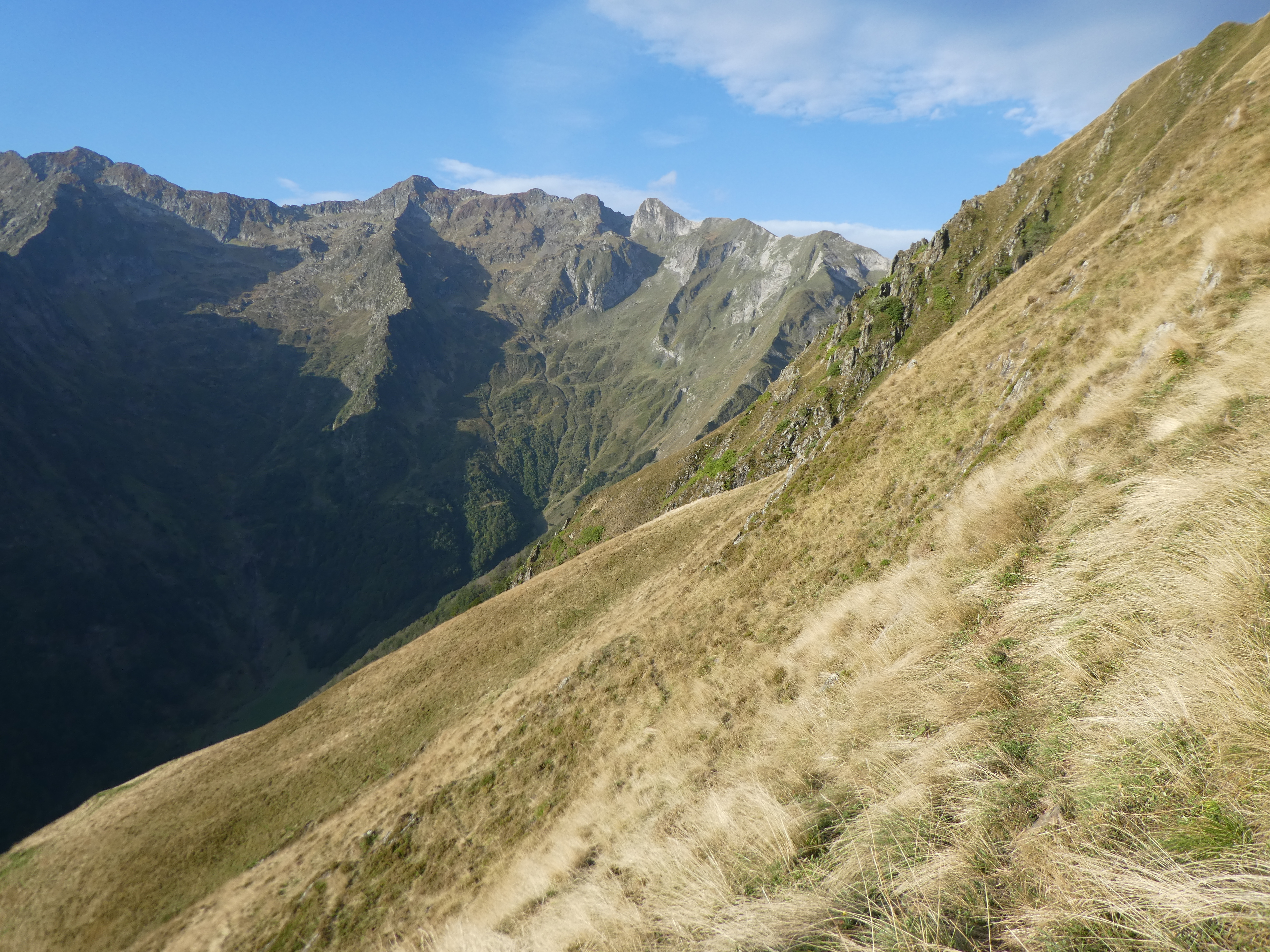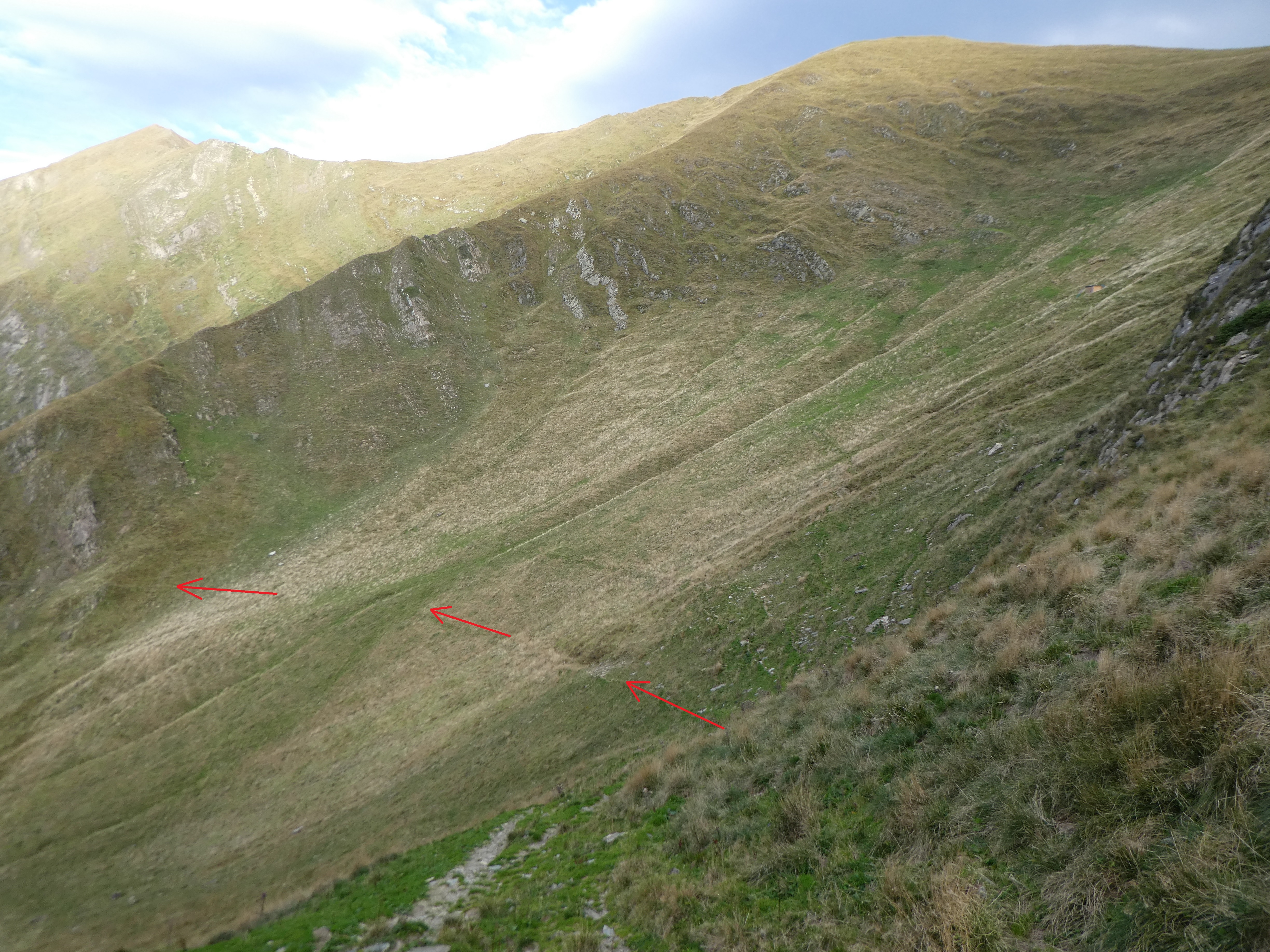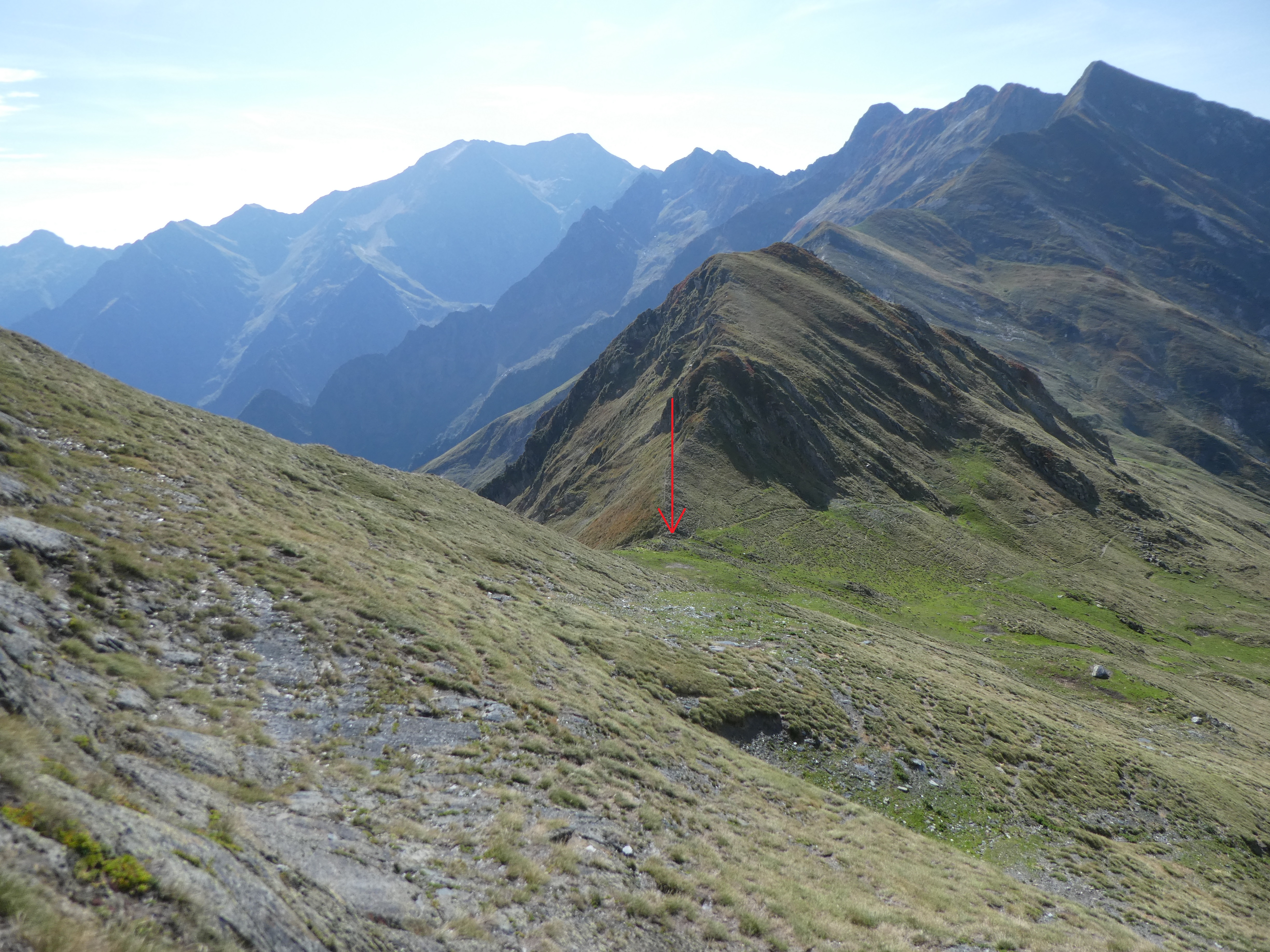 Dès que le faux-col est atteint (500 mètres après avoir atteint le couloir herbeux très raide), suivre le chemin partant tout droit et perdant un peu d'altitude direction Lane Fomente (le but est de rejoindre la ligne de crête du Lane Formente située en face) (quelques marques de peinture bleue sont présentes sur le chemin aidant à la progression)
