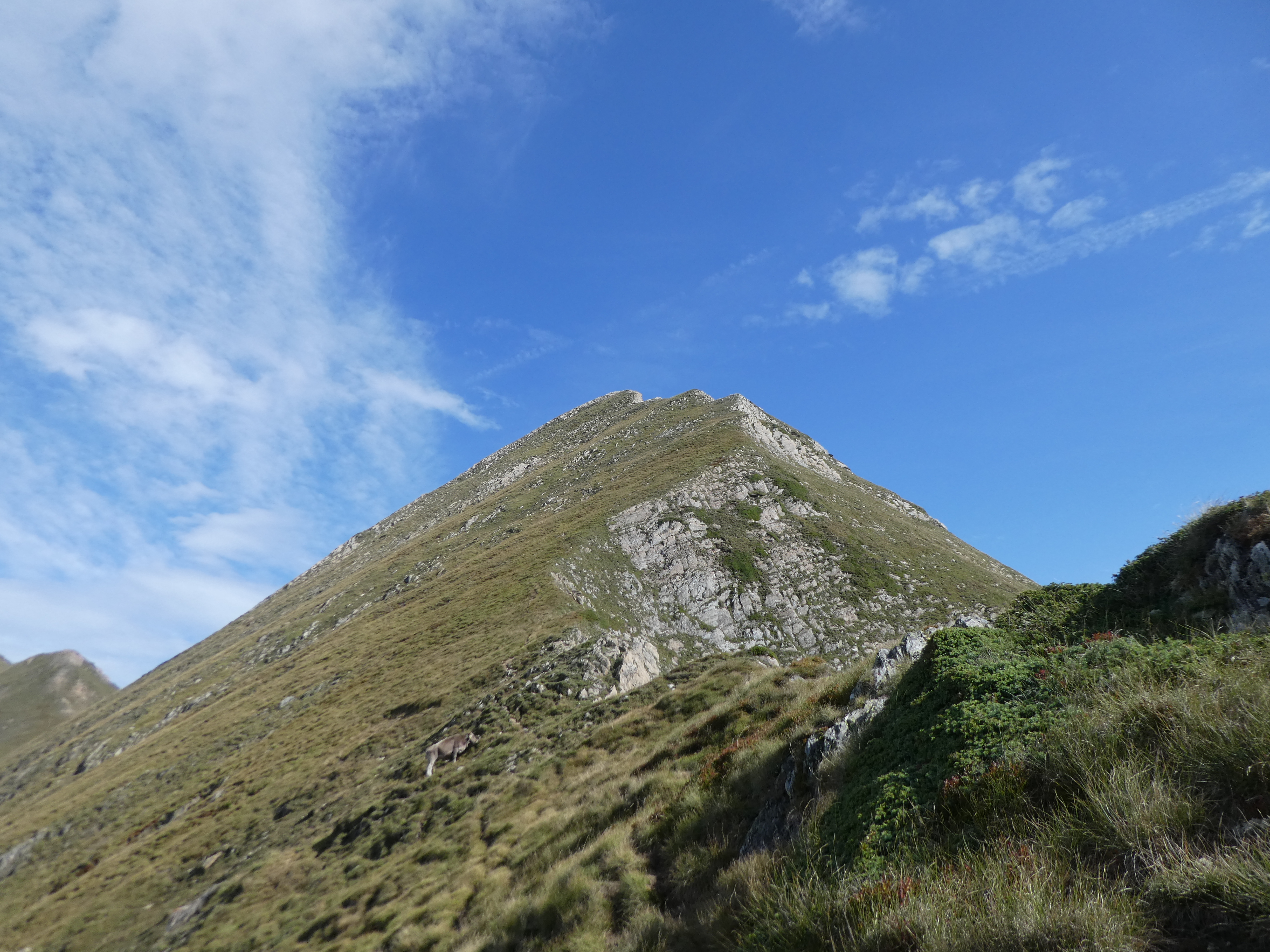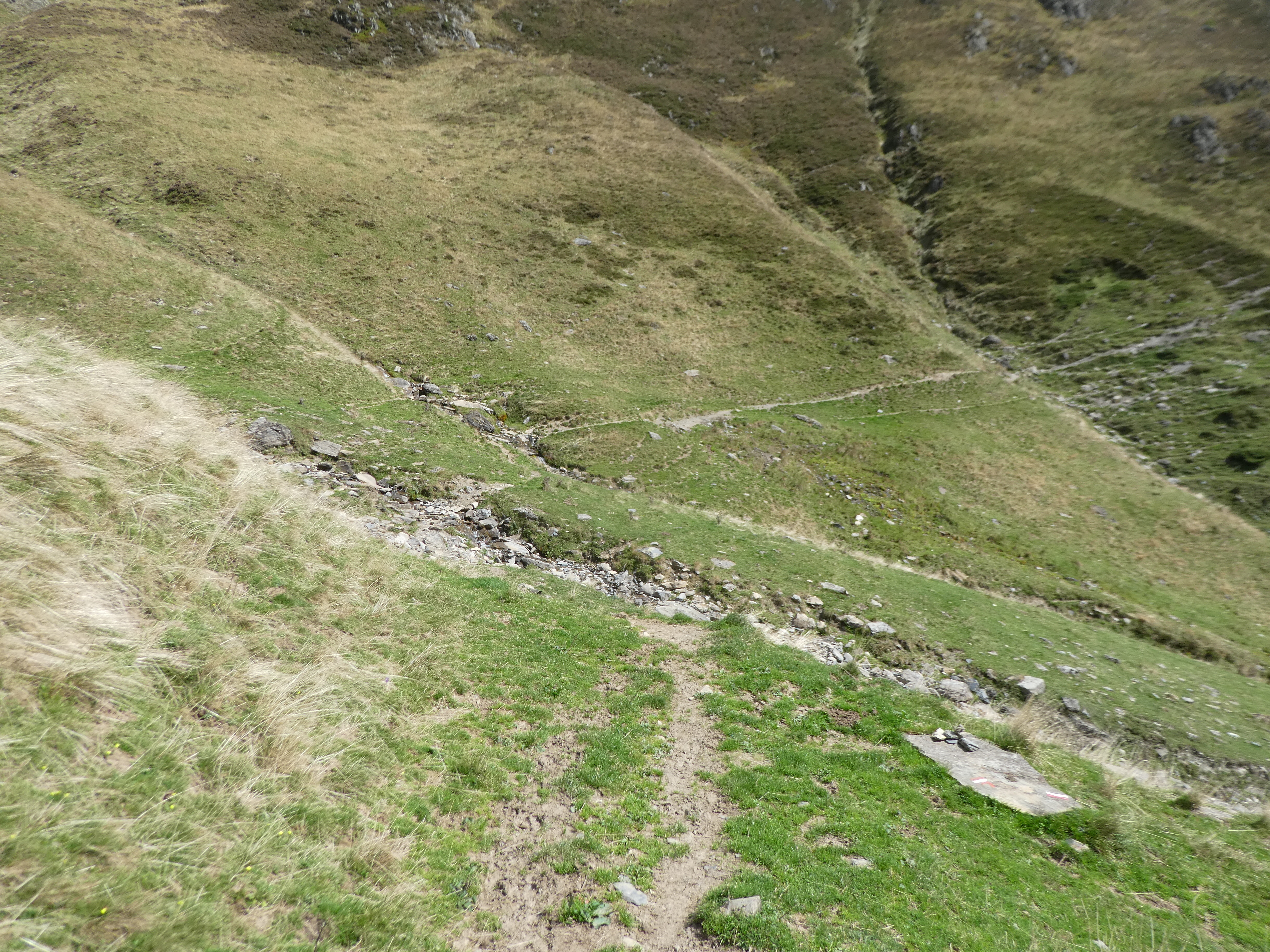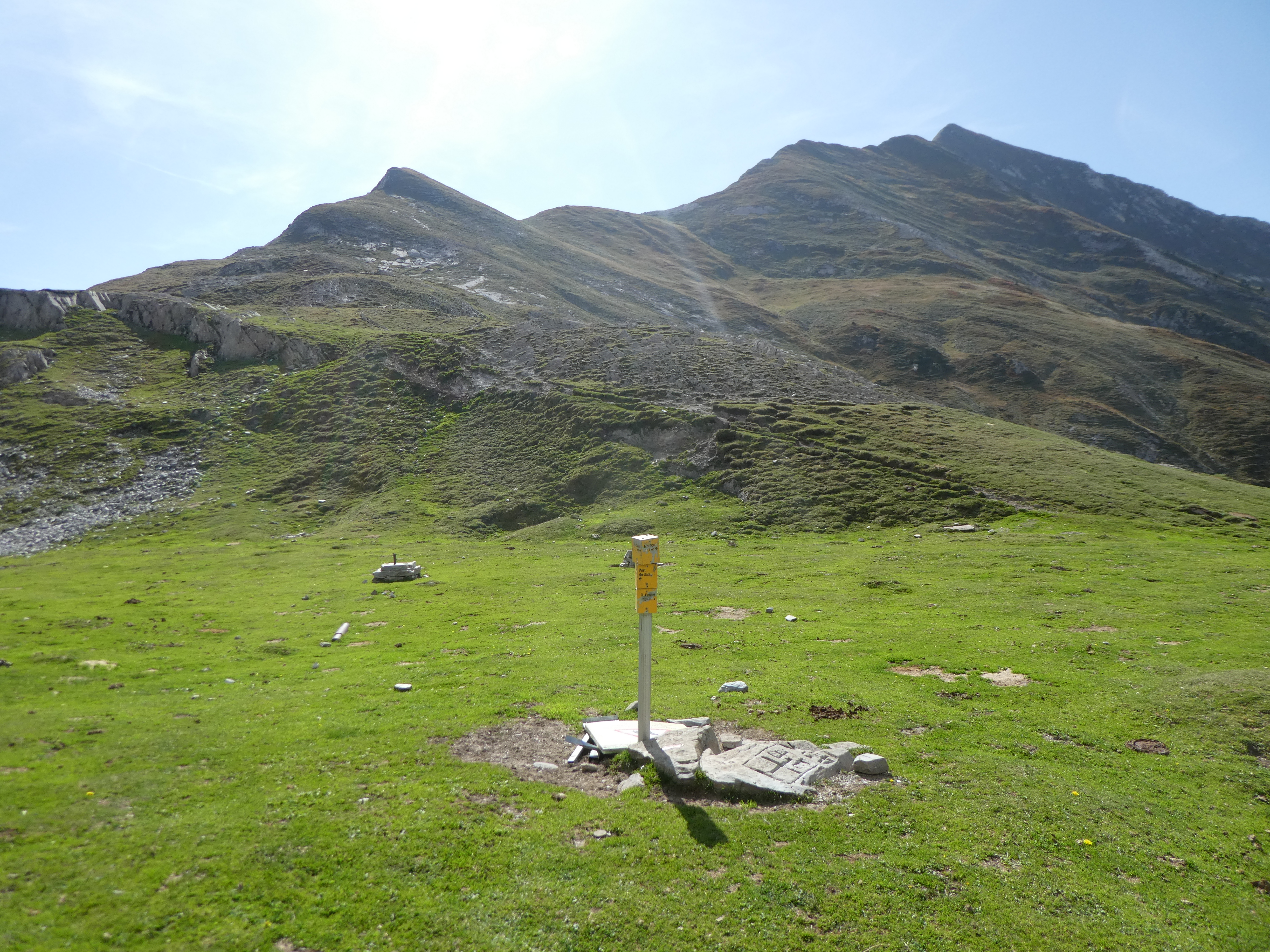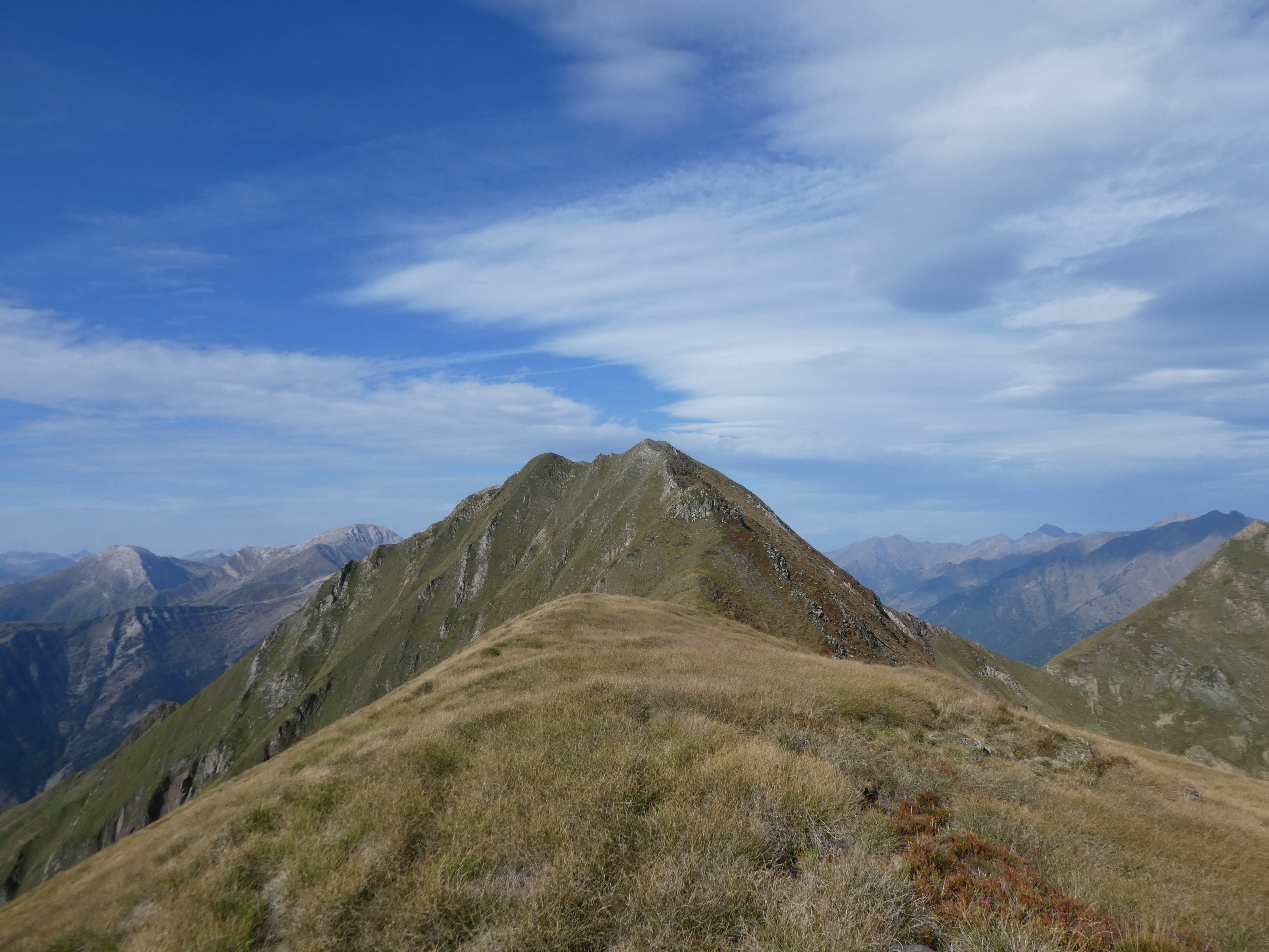 Dès que le faux-col est atteint (500 mètres après avoir atteint le couloir herbeux très raide), suivre le chemin partant tout droit et perdant un peu d'altitude direction Lane Fomente (le but est de rejoindre la ligne de crête du Lane Formente située en face) (quelques marques de peinture bleue sont présentes sur le chemin aidant à la progression)