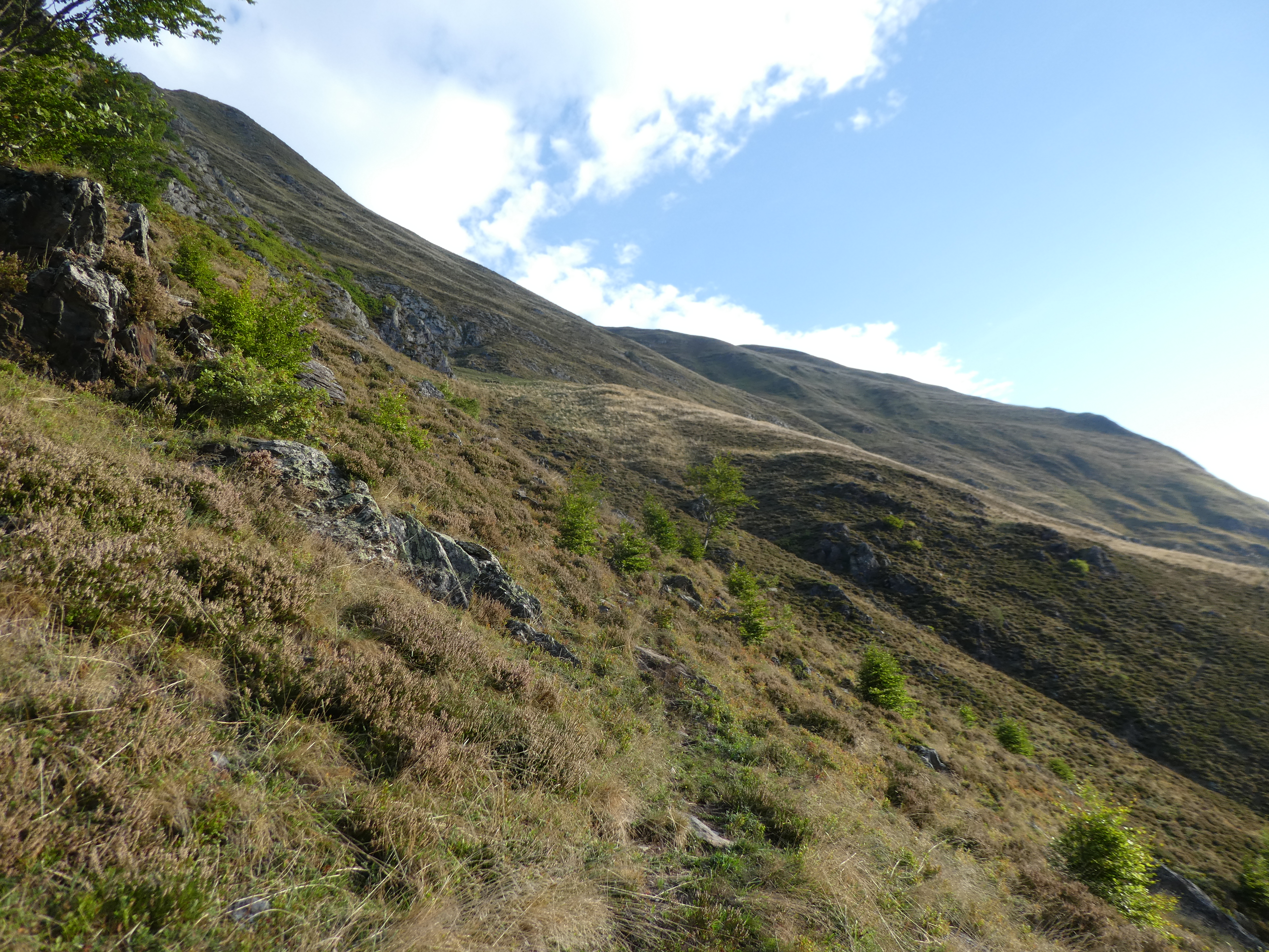 Vue sur la raide montée en dévers vers le faux-sommet du Pic de Montaud