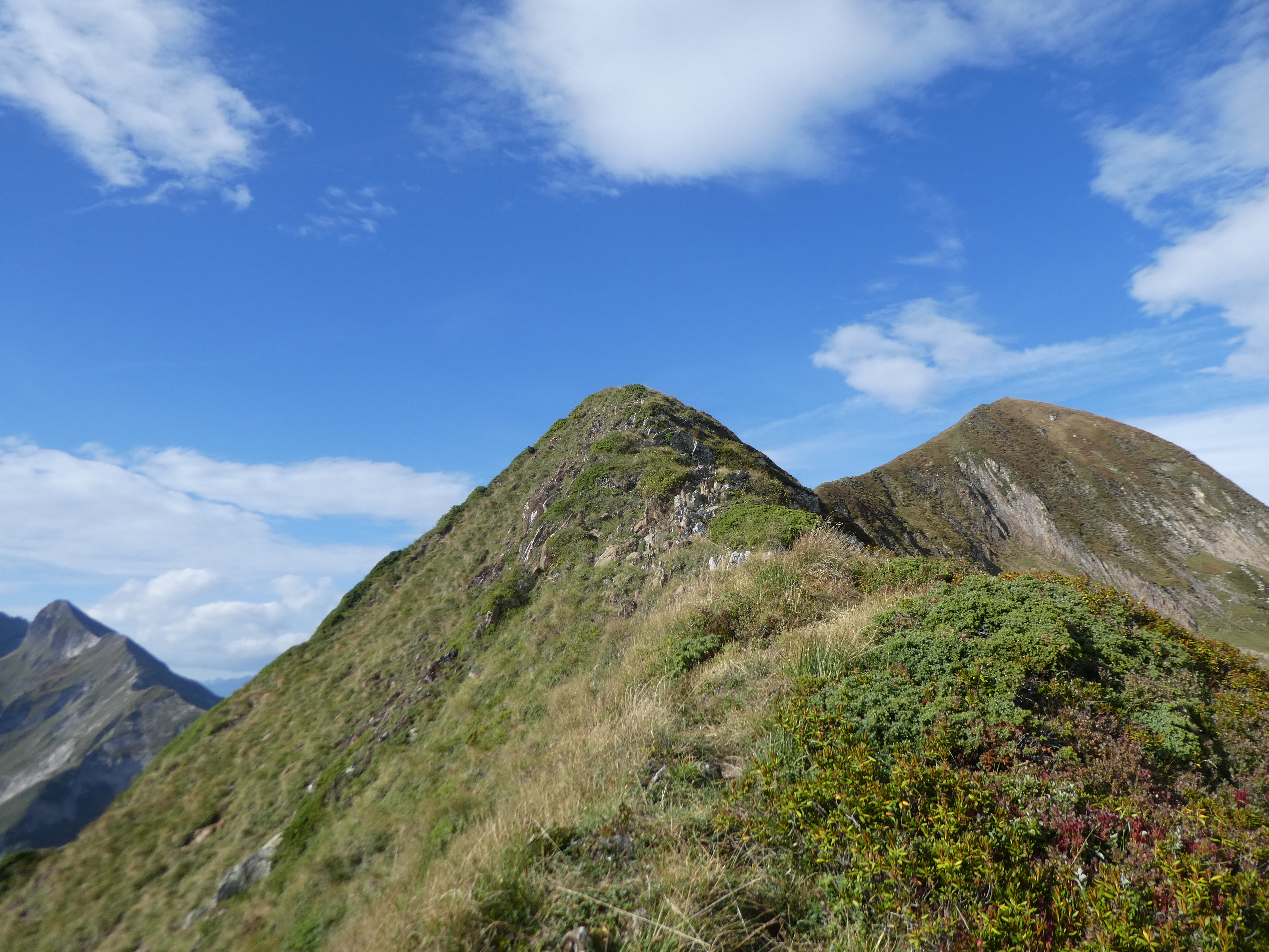 Dès que le chemin de crête vient buter contre ce piton rocheux (200 mètres après le col), contourner ce dernier sur la gauche puis suivre de nouveau le fil de crête direction Pic de Montaud