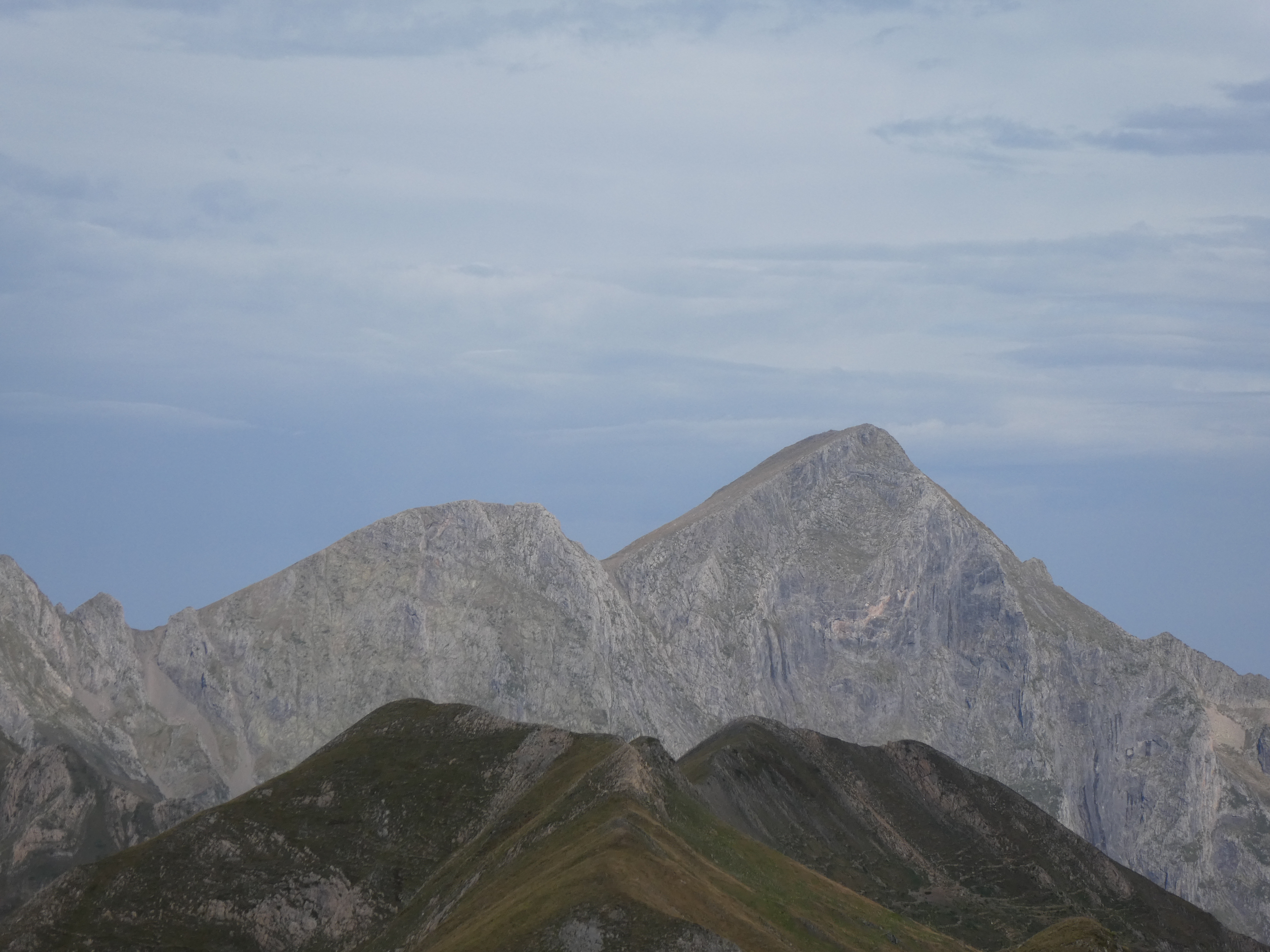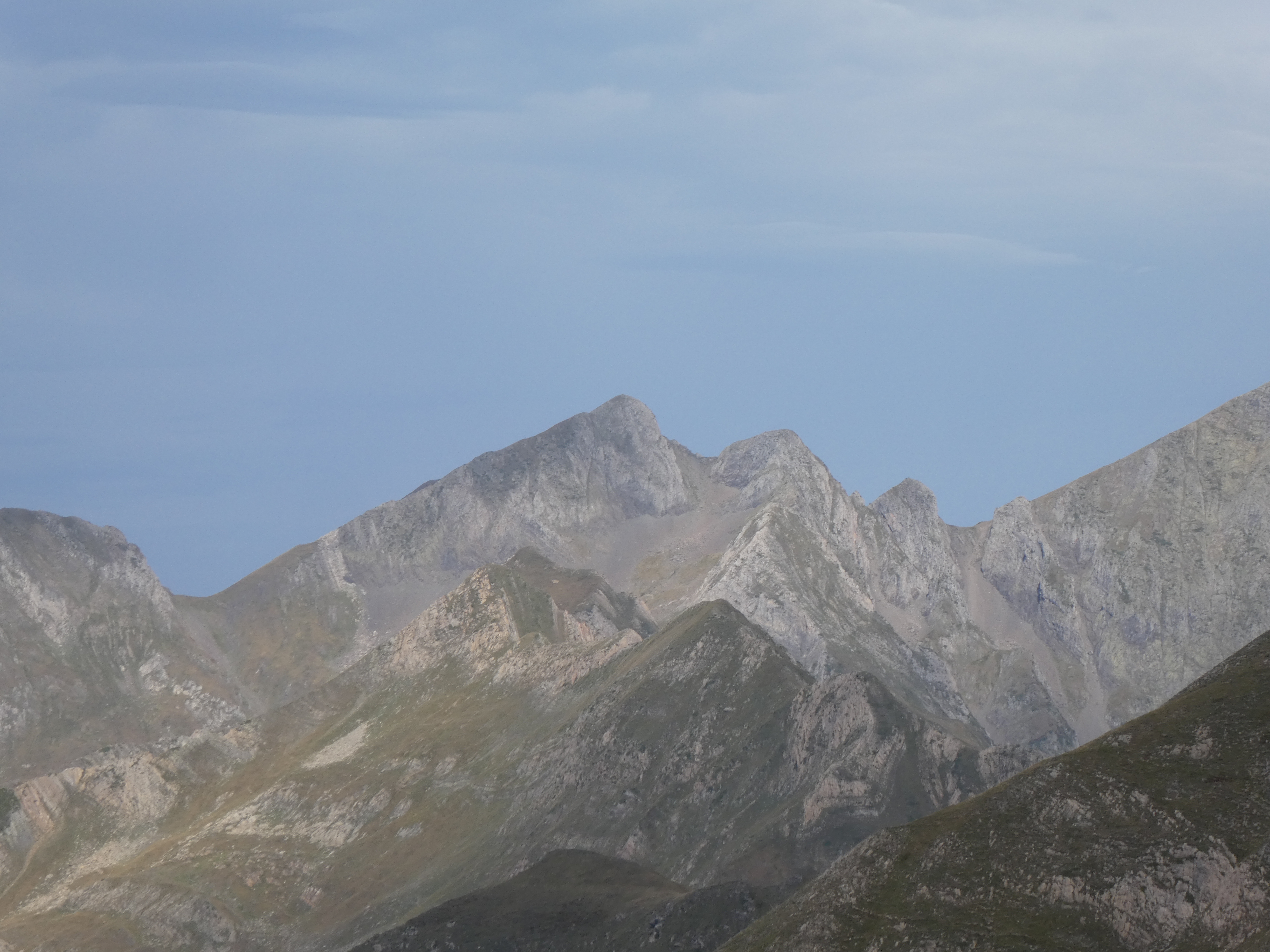 Zoom sur la Pique d'Estats (3143 m) à gauche et le Pic dels Estanys (2946 m) à droite