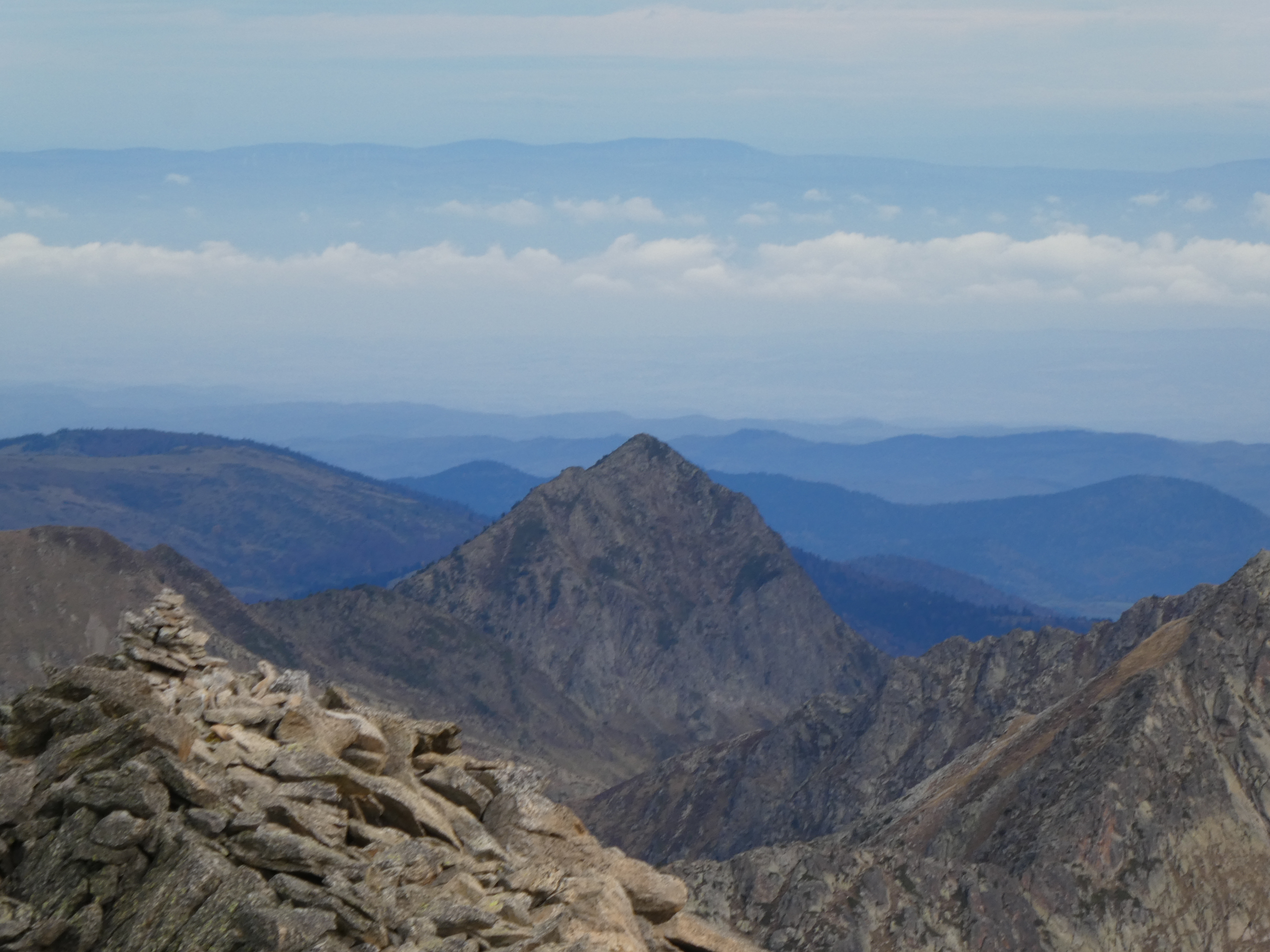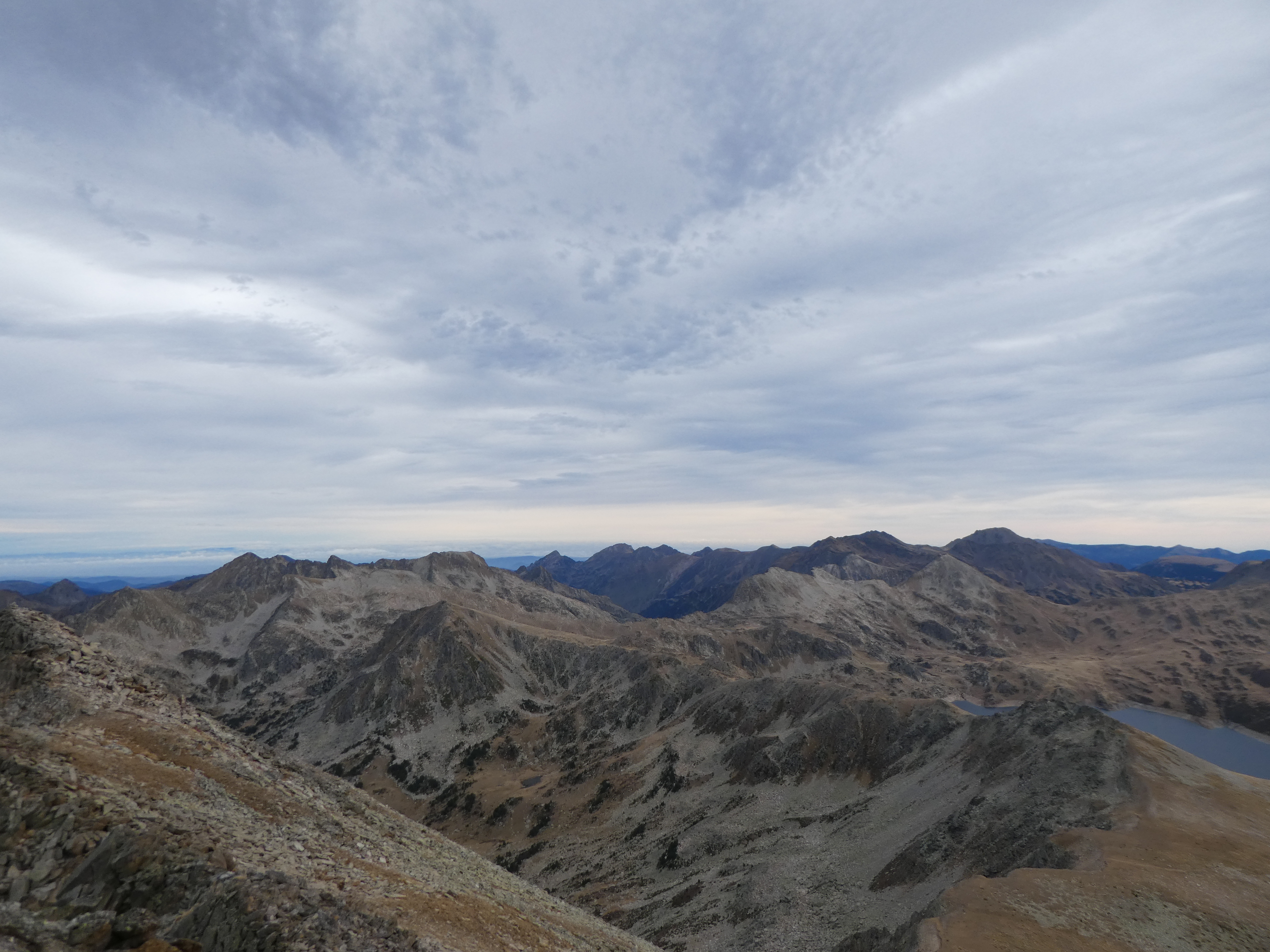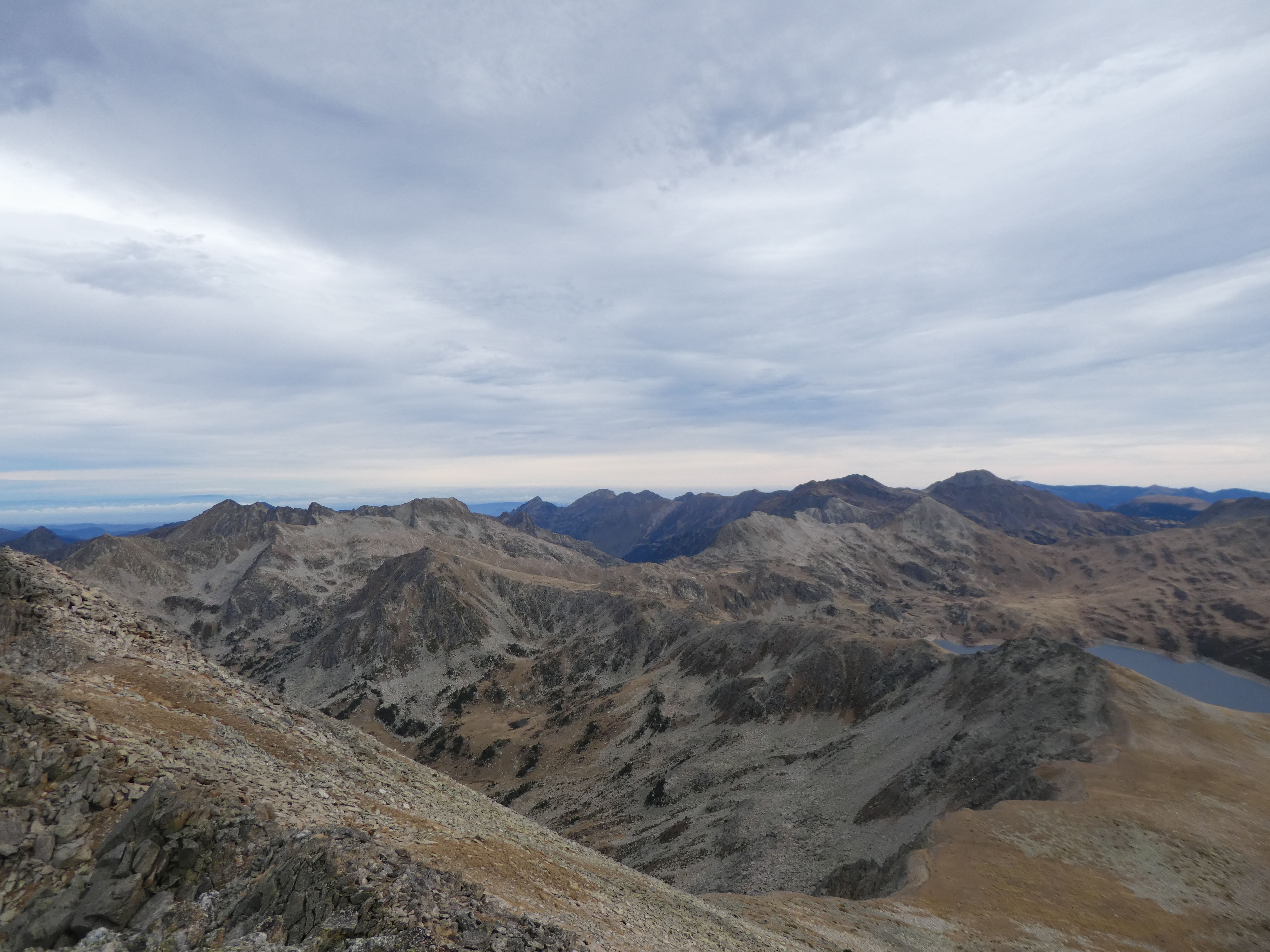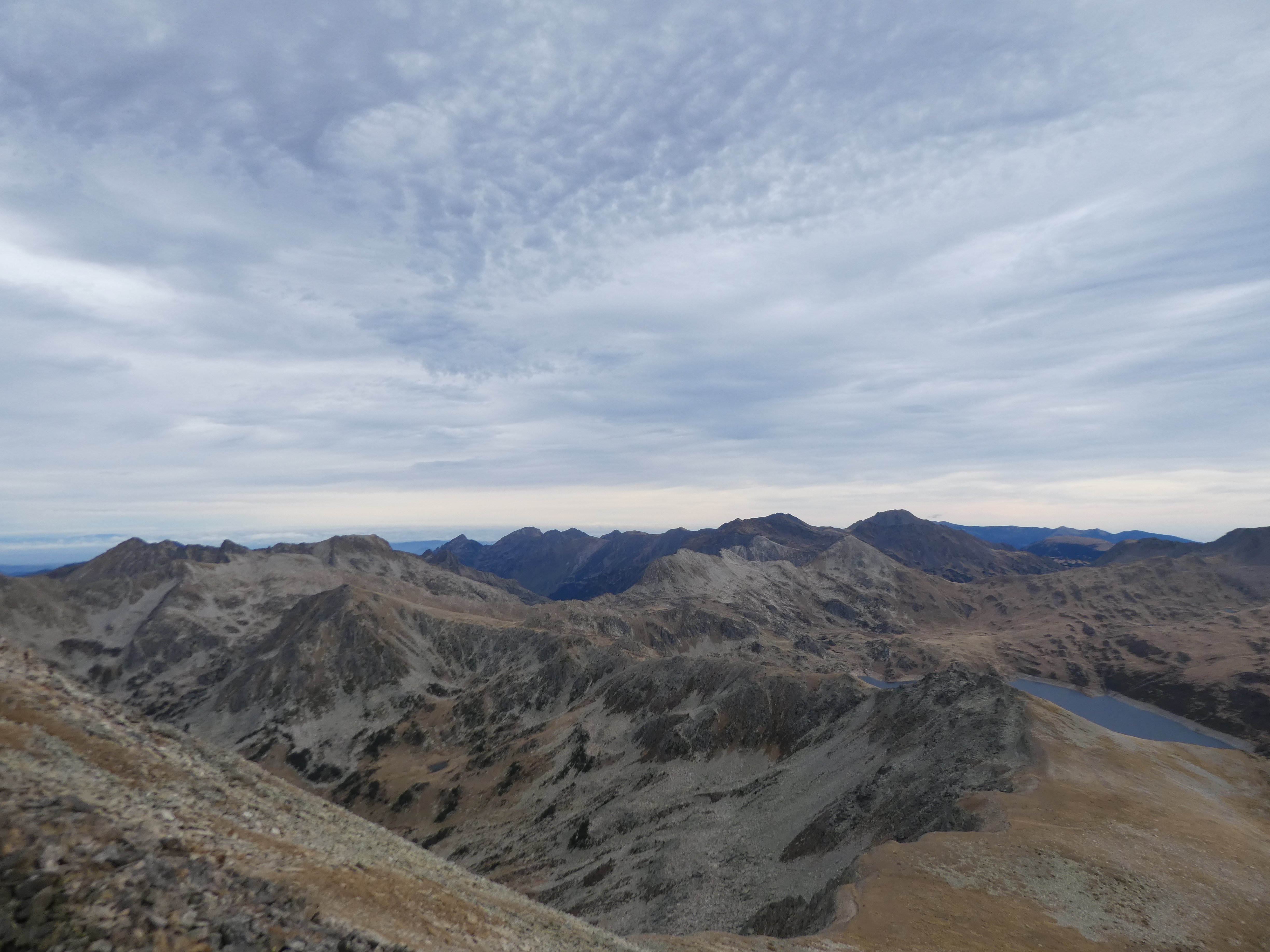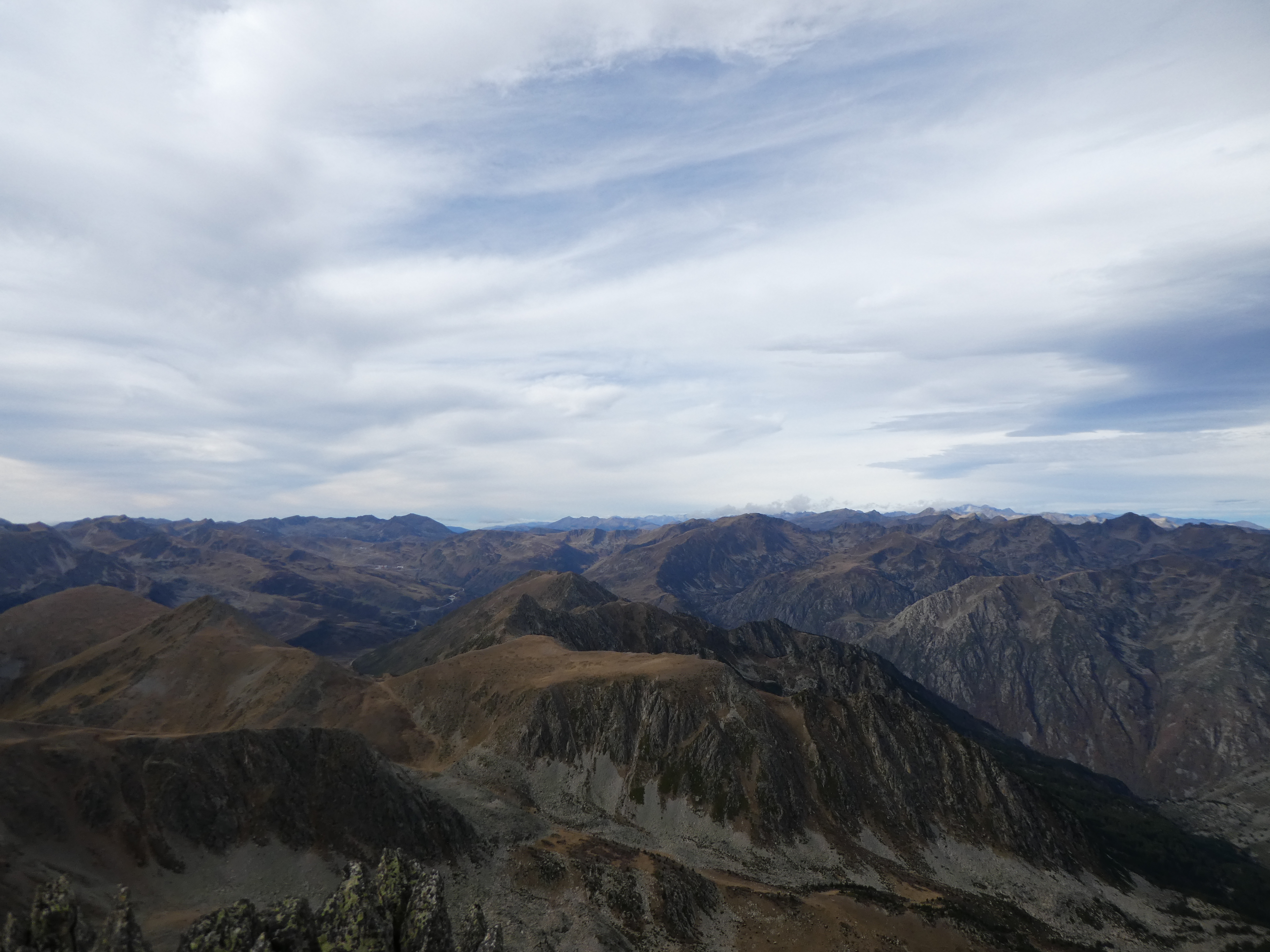 Arrivée au sommet du Puig Pedros Nord (2830 m) : beau panorama sur les sommets de la Haute-Ariège, du Donezan, du Capcir, de la Haute-Cerdagne, de la Cerdanya, de l'Alt Urgell, de l'Andorre, du Pallars Sobirà et des Monts d'Olmes