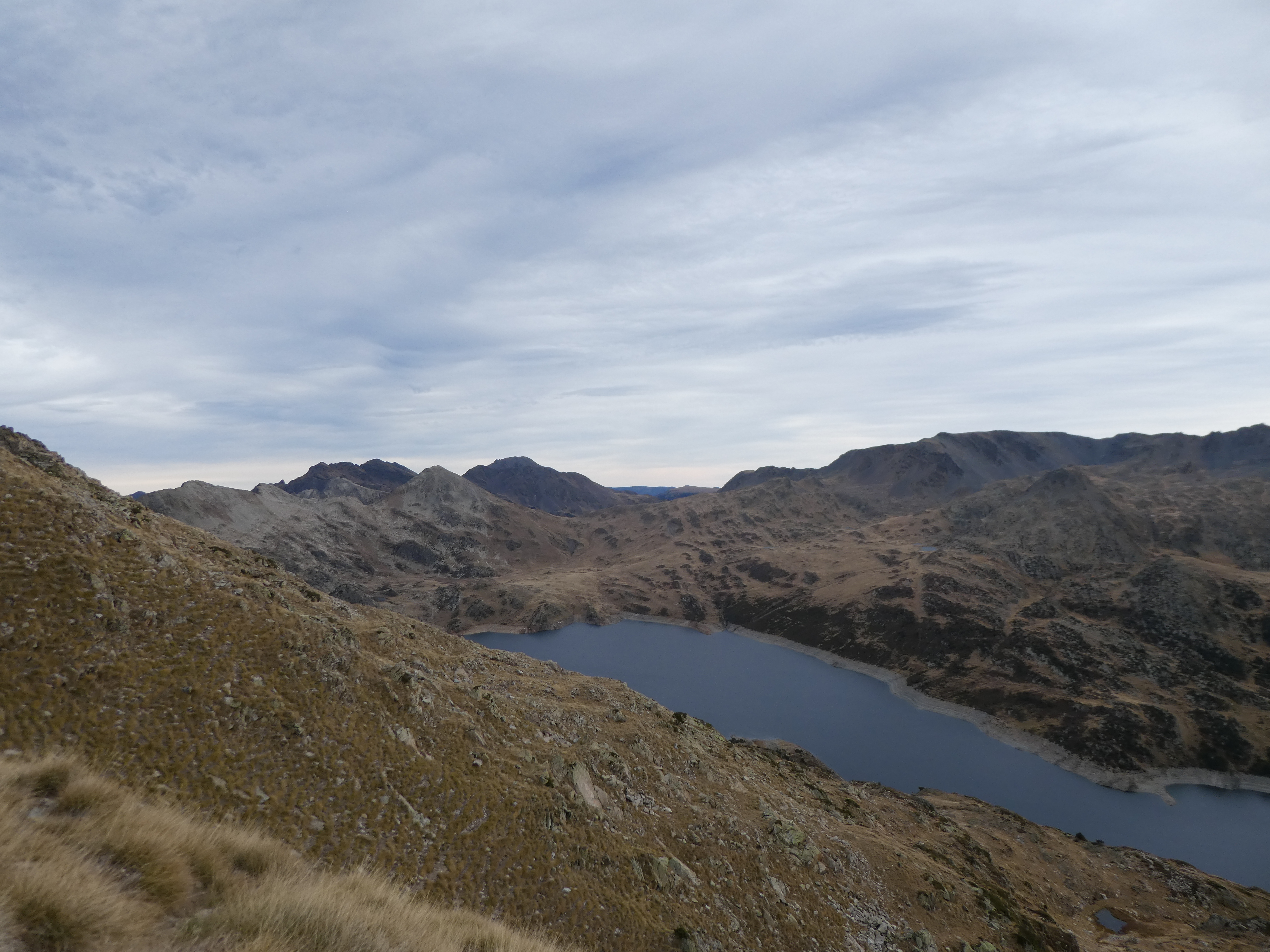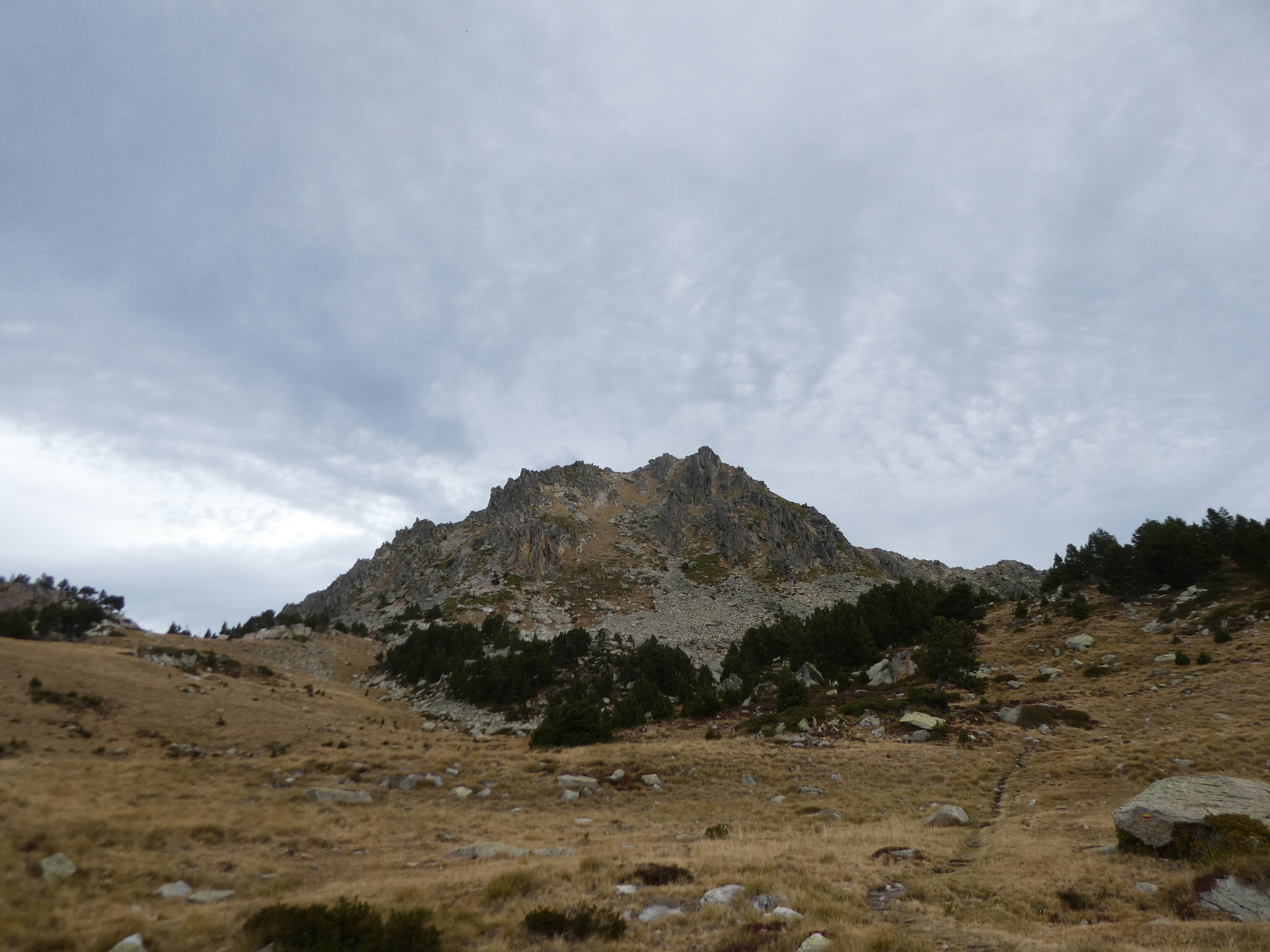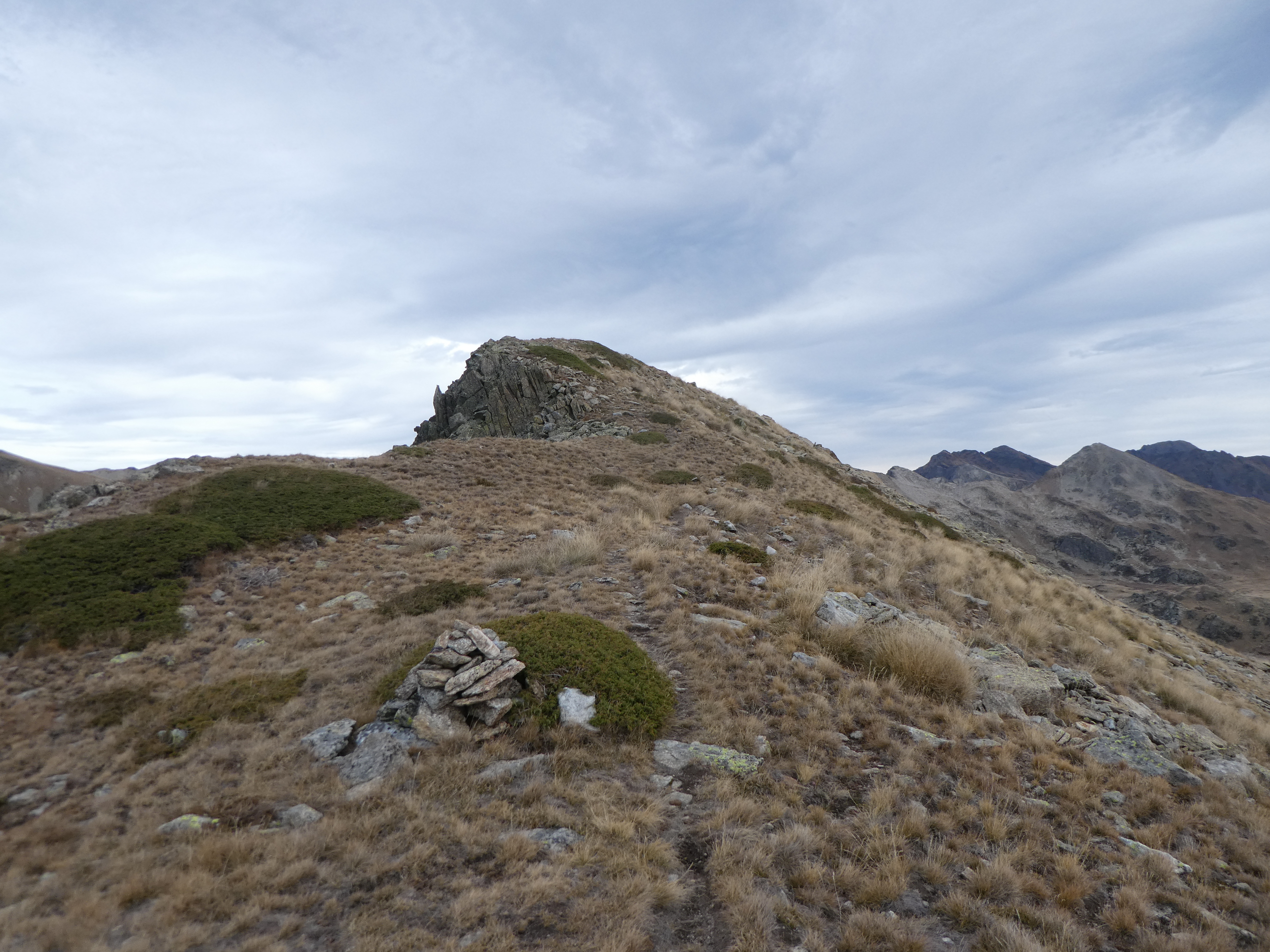 Dès que le fil de crête du Cirque du Pedros est atteint (300 mètres après avoir quitté le Puig Pedros Sud), suivre le semblant de chemin cairné partant tout droit direction Étang des Bésines