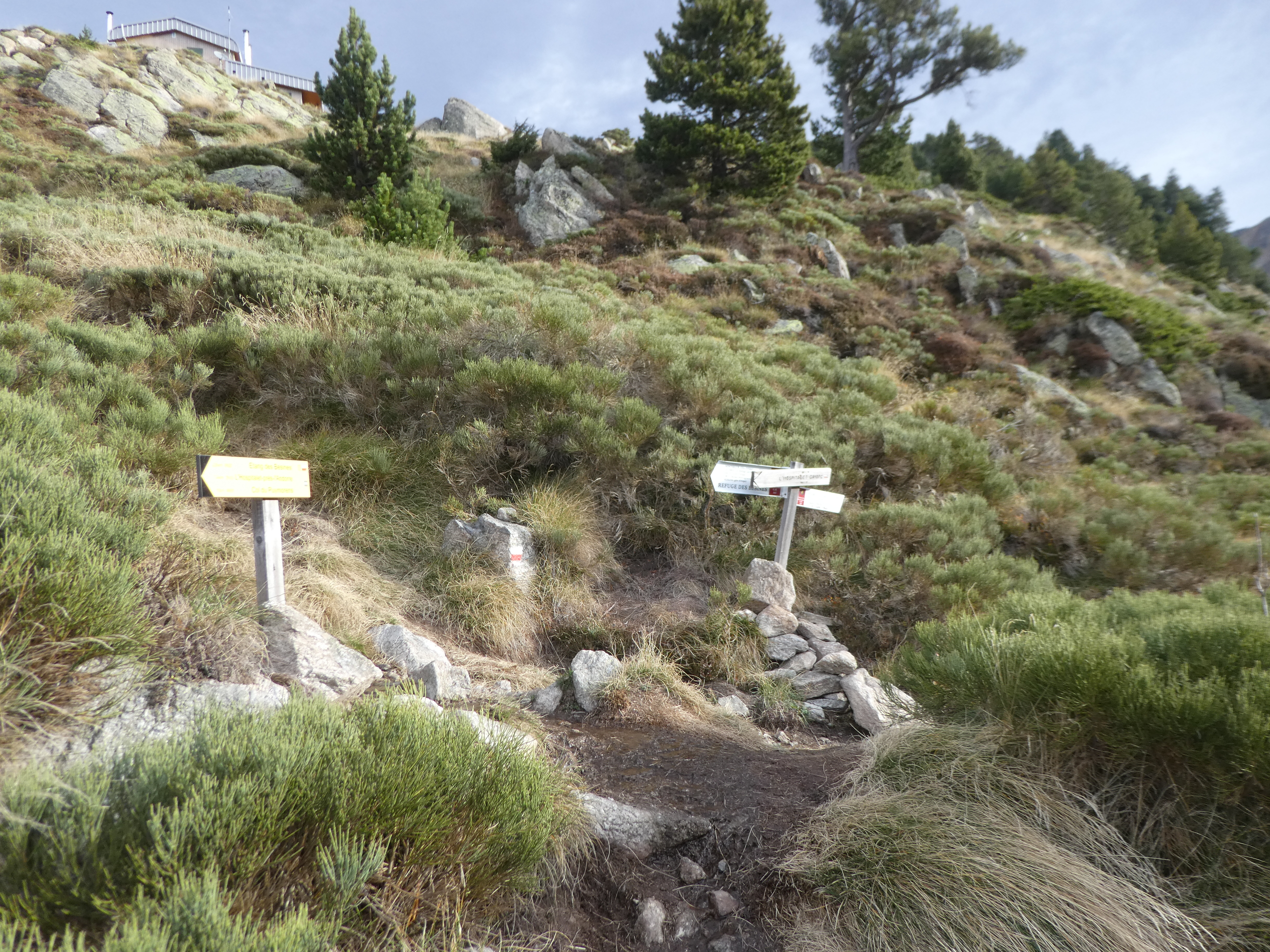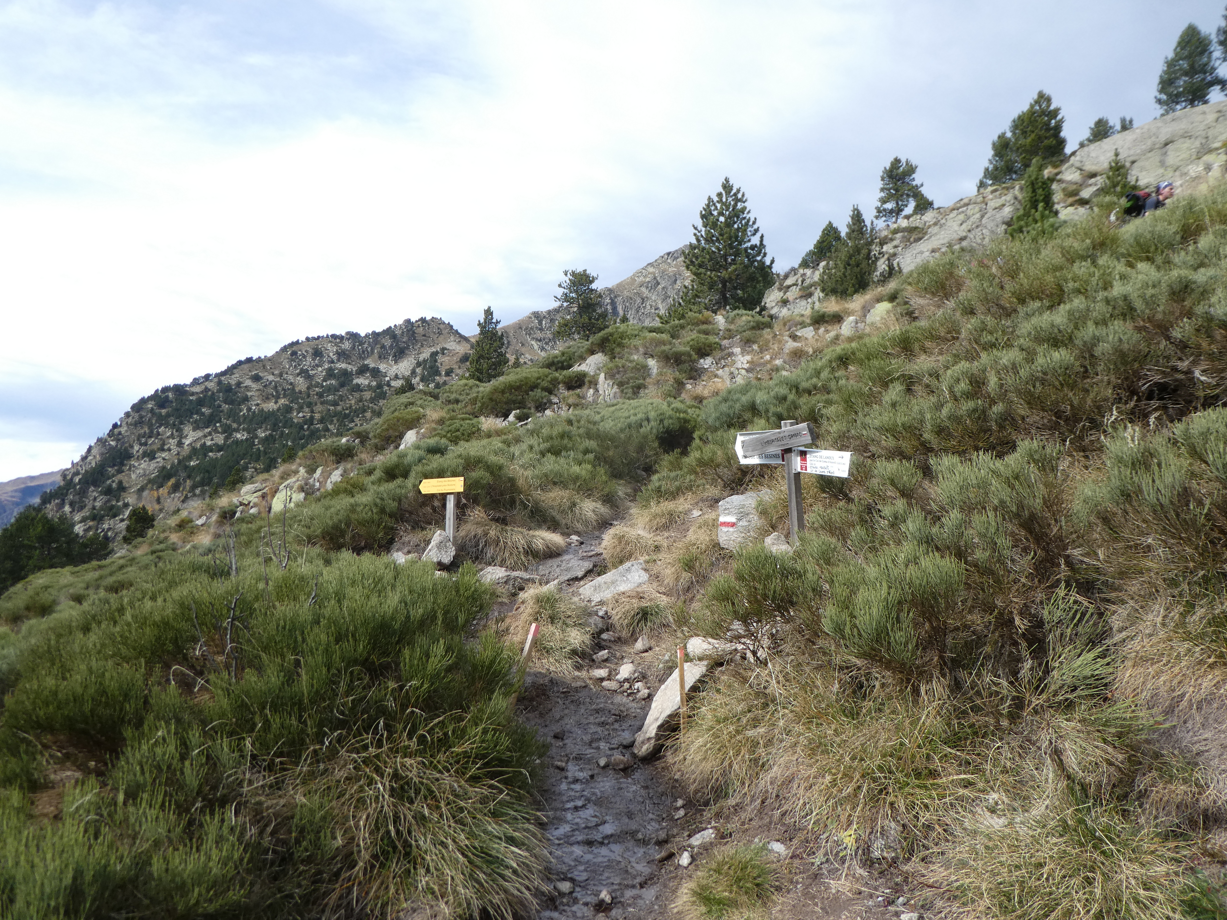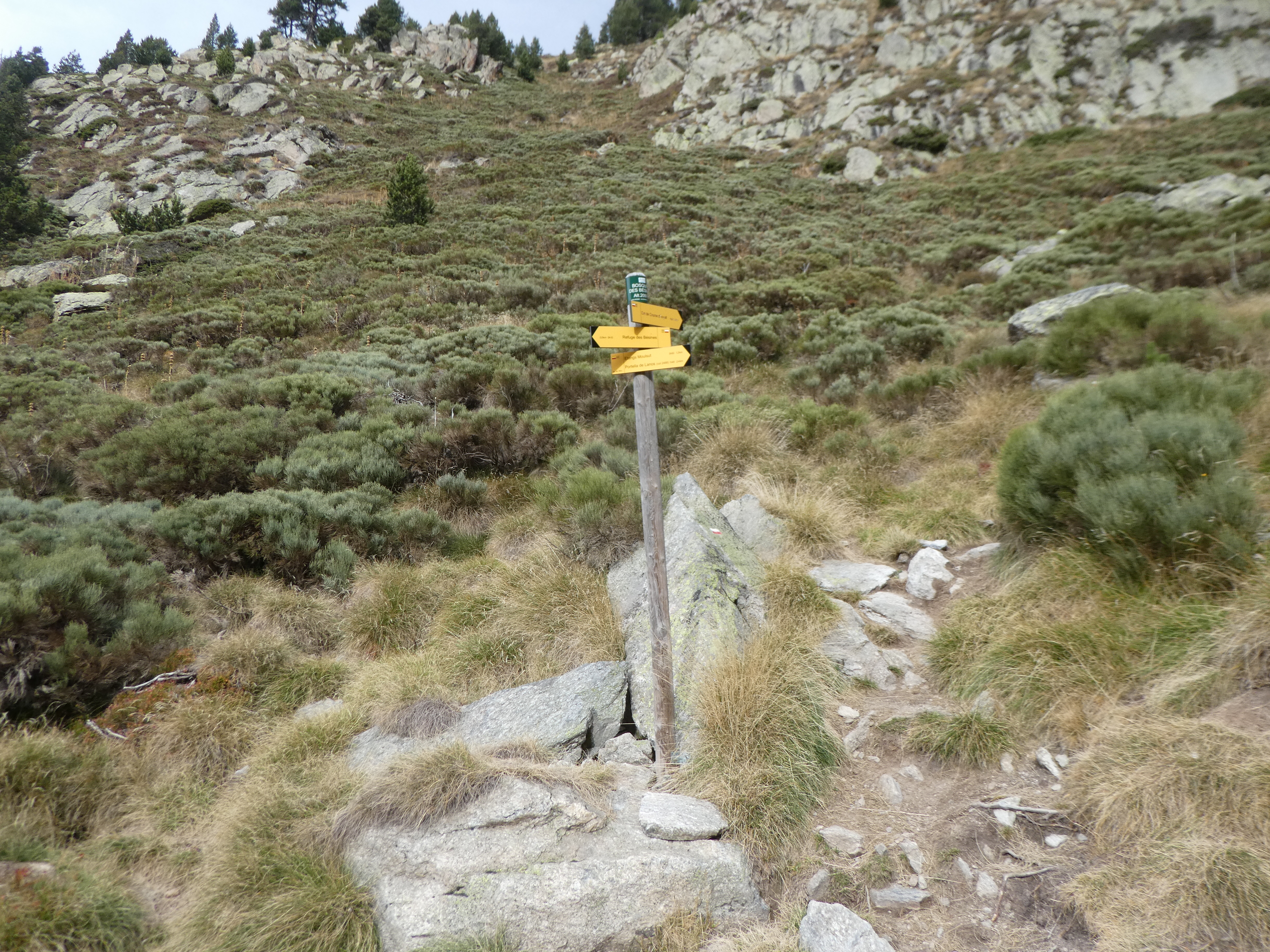 A ce croisement situé à proximité du Refuge des Bésines marqué par la présence d'un panneau directionnel (1700 mètres après avoir passé l'Étang des Bésines), suivre le chemin partant sur la droite direction Coll de Coma d'Anyell, balisé en rouge et blanc