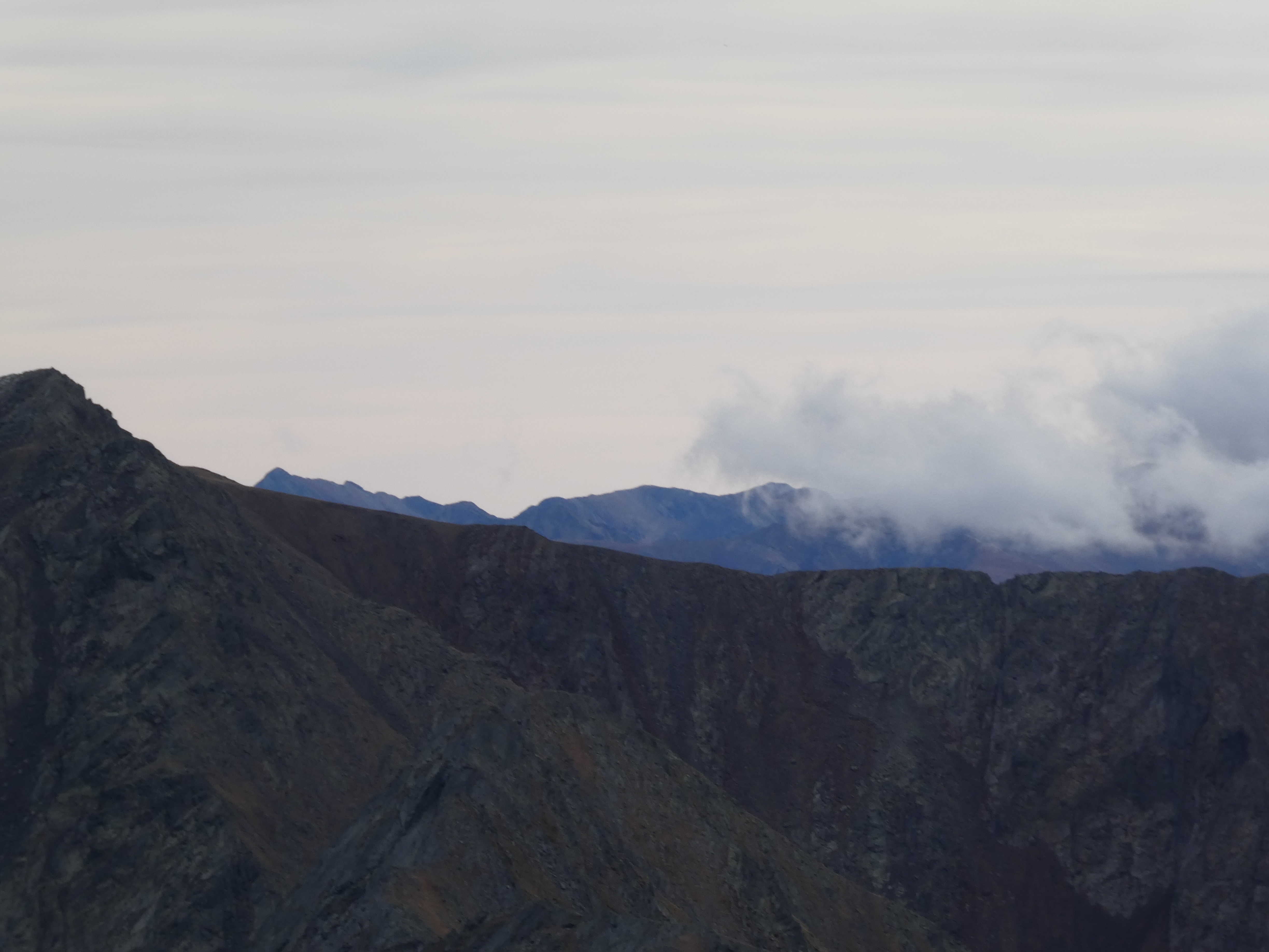 Zoom sur le Pic de l'Infern (2868 m) à gauche, le Pic Inferior de la Vaca (2820 m) au centre et le Pic Superior de la Vaca (2826 m) à droite dans les nuages