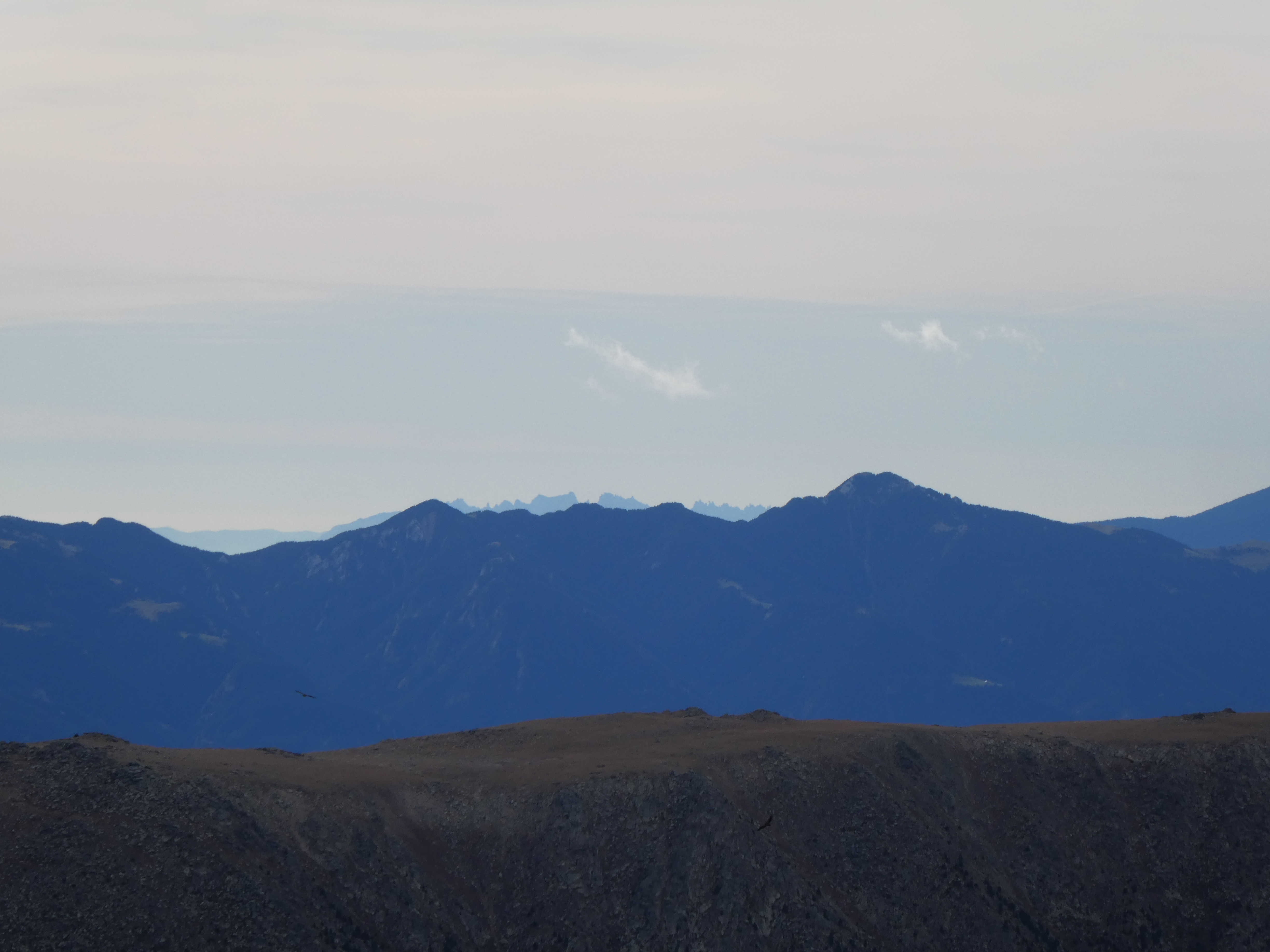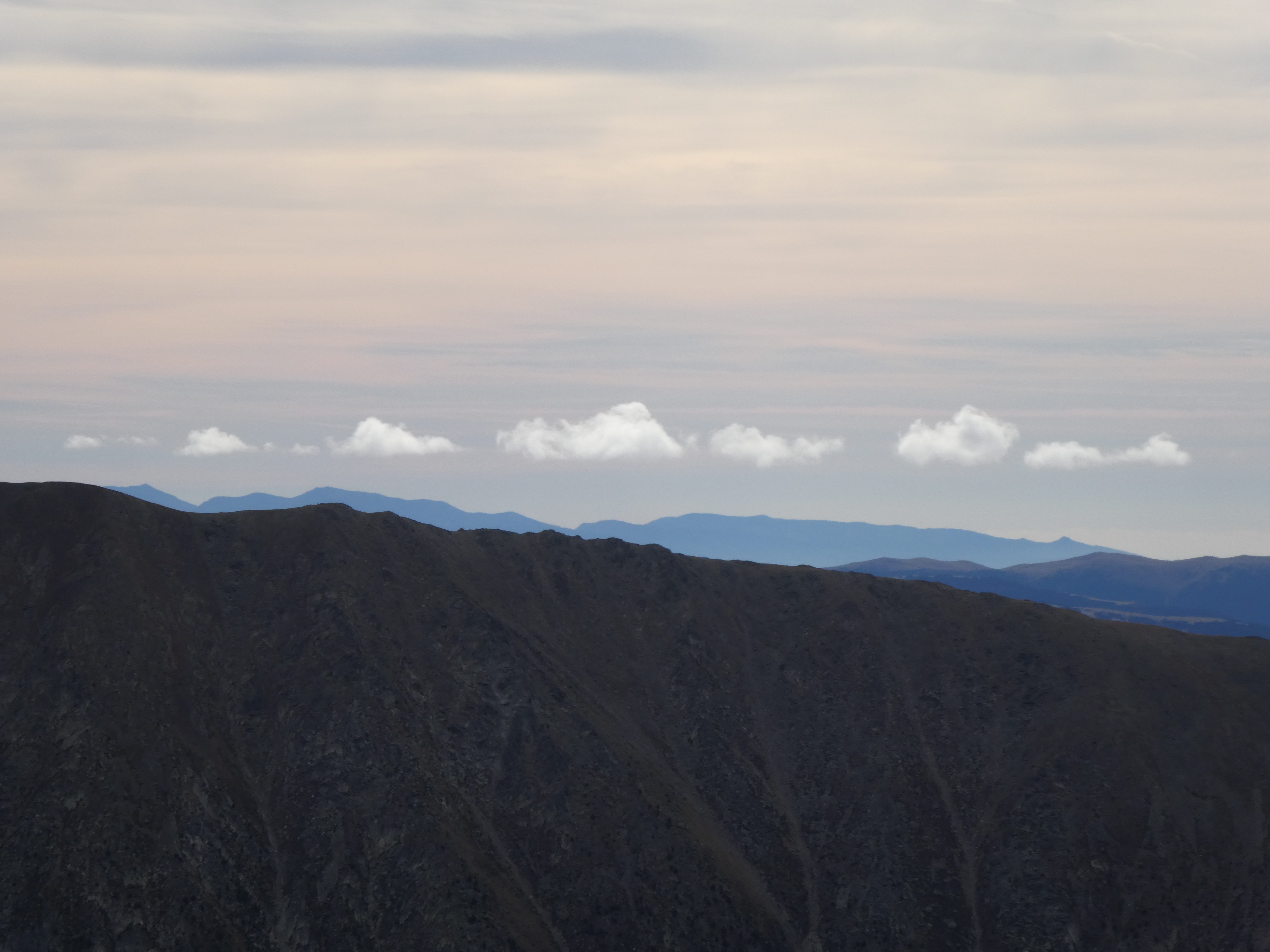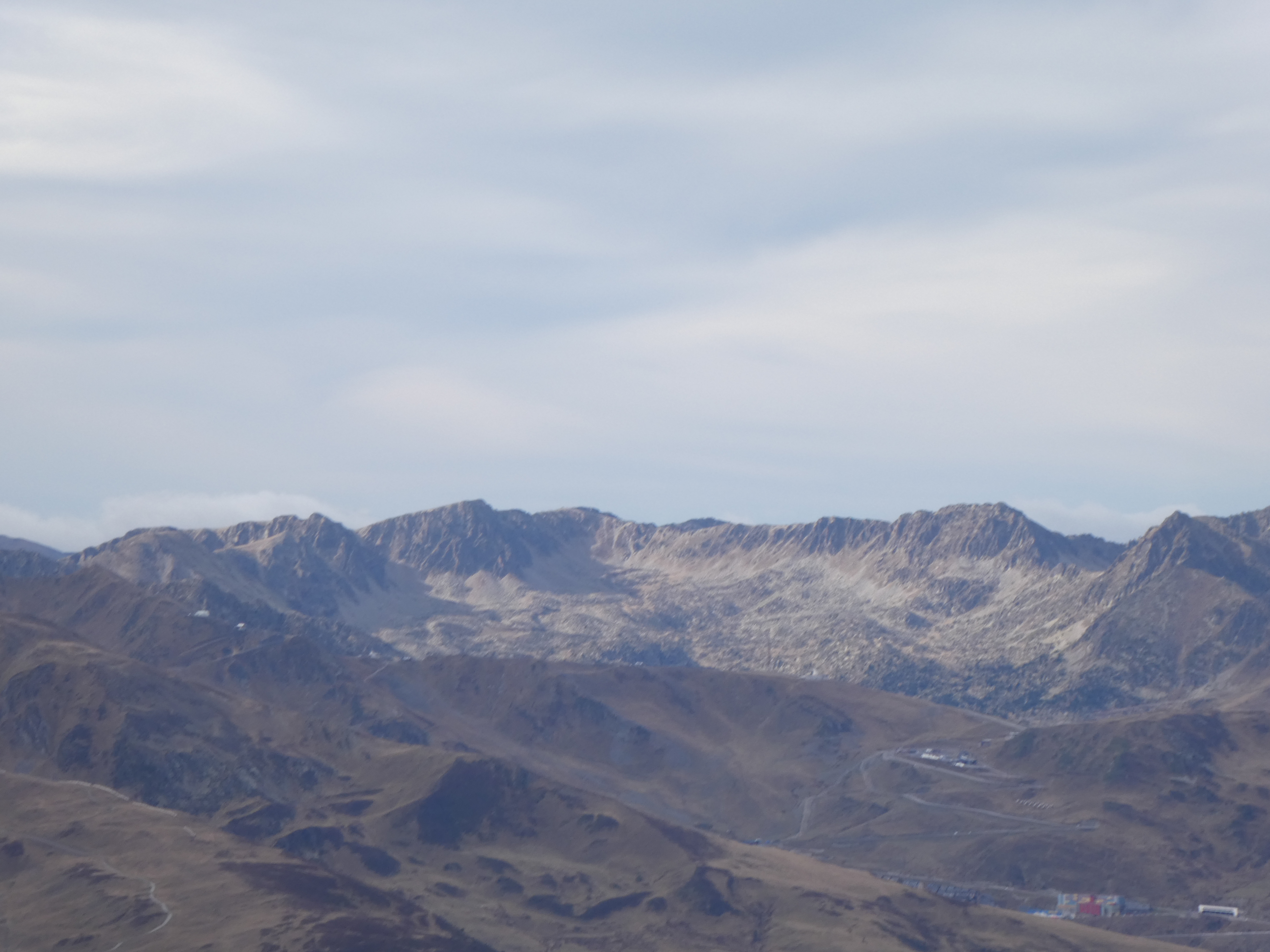 Zoom sur les Suquetes (2200 m) au centre-gauche et les Penyes Altes de Moixeró (2274 m) au centre-droit ... en arrière-plan, on aperçoit les sommets dentelés du massif de Montserrat