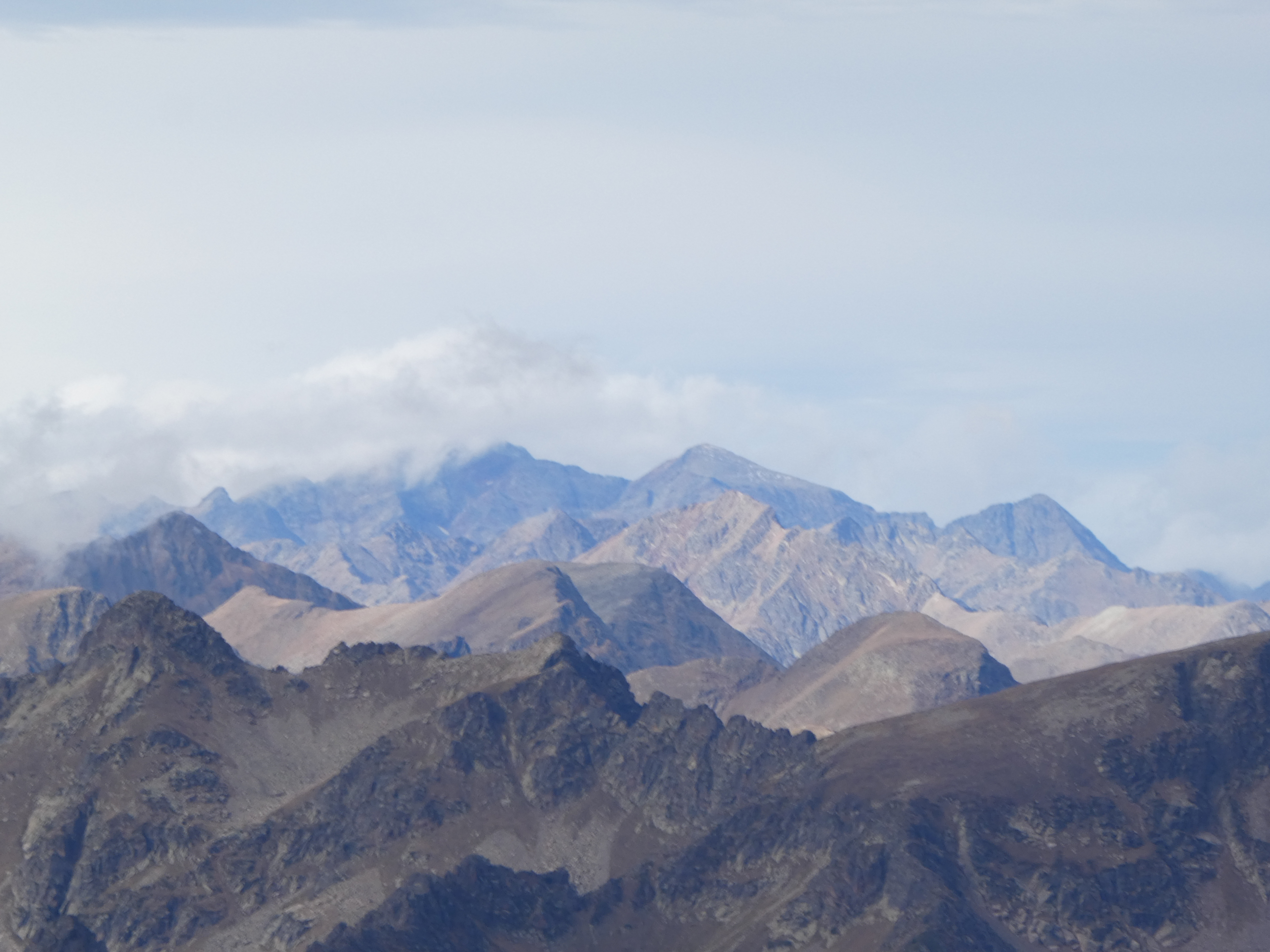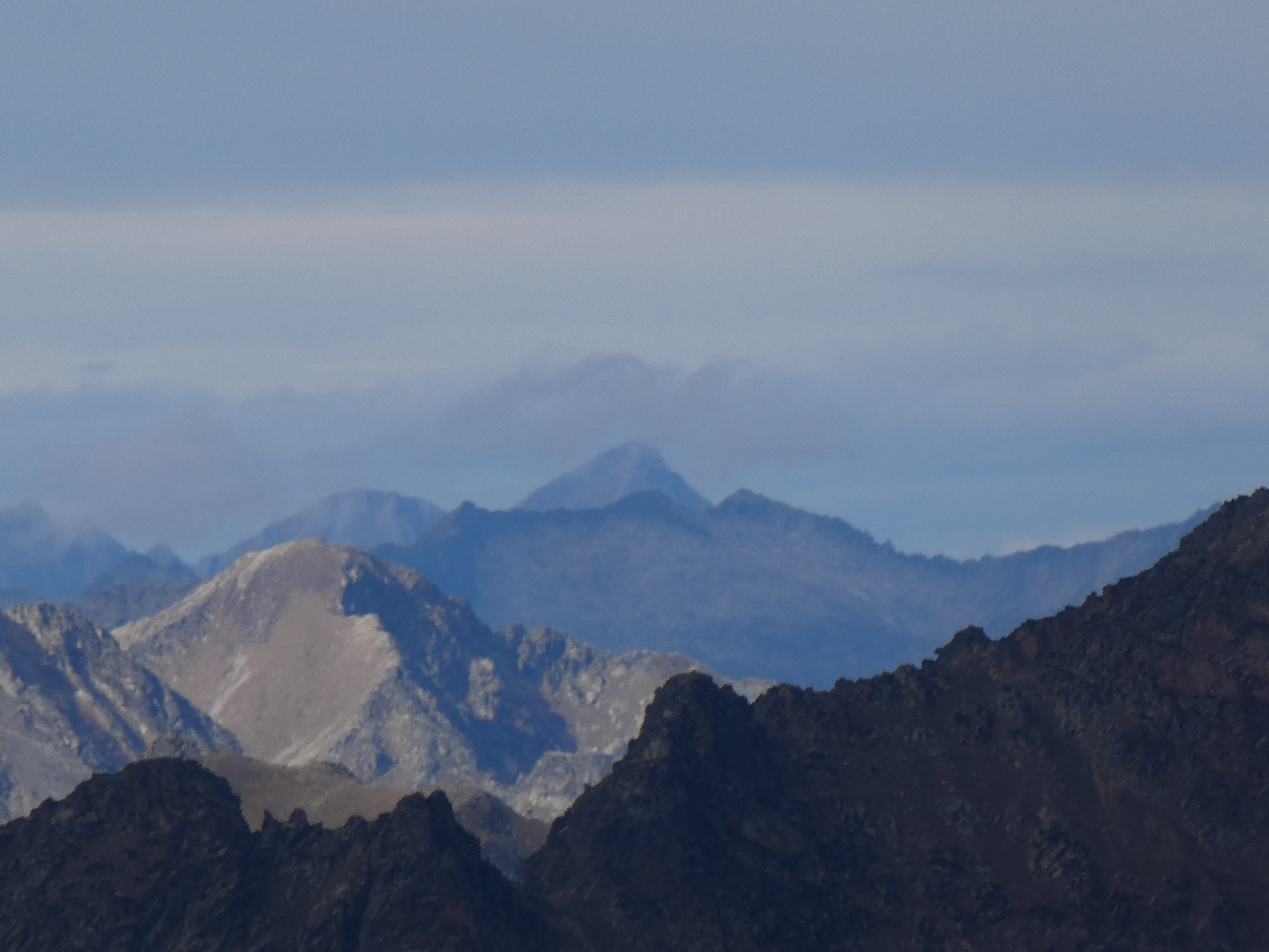 Zoom sur le Pic de l'Estanyó (2915 m) partiellement dans les nuages au centre-gauche et le Pic de la Cabaneta (2862 m) au centre-droit