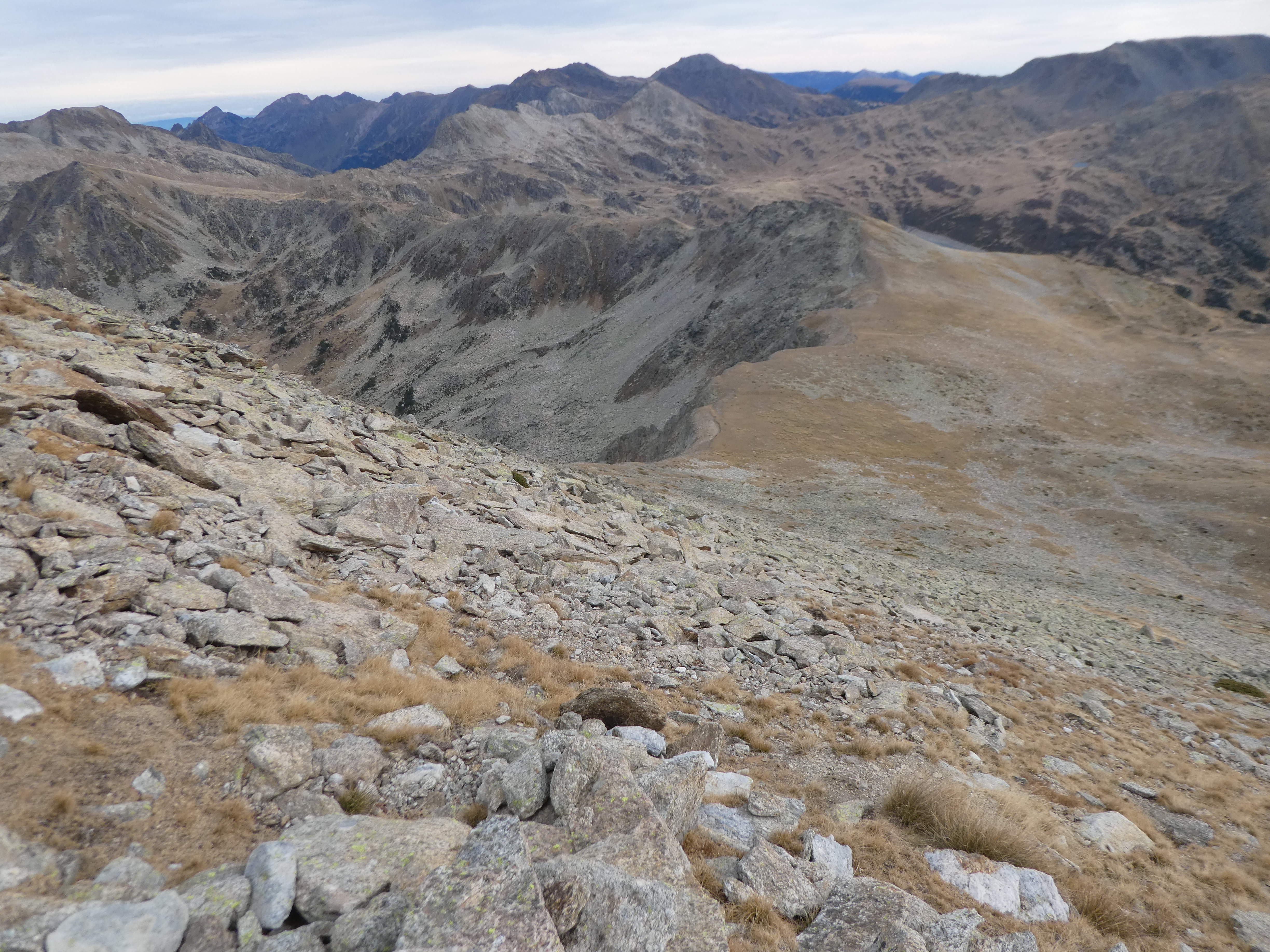 Redescendre du sommet en visant le pied du Puig Pedros Sud et le chemin de crête du Cirque du Lanos direction Étang des Bésines