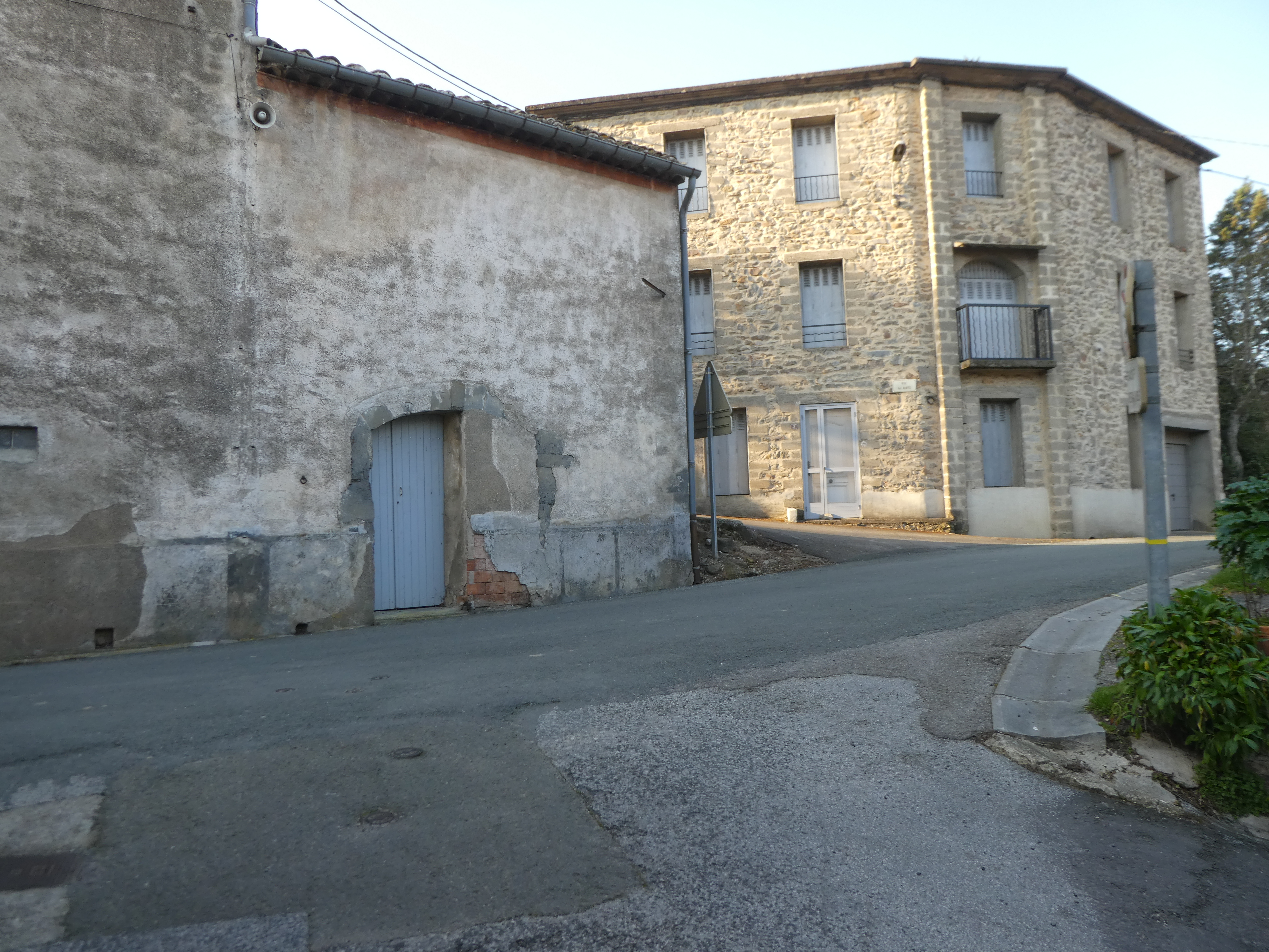 Départ Saint-Pierre-des-Champs - Mairie (142 m) : suivre la rue partant tout droit vers la D212 direction Col des Maures, balisé sporadiquement en jaune (ignorer la croix jaune sur l'arbre de droite)
