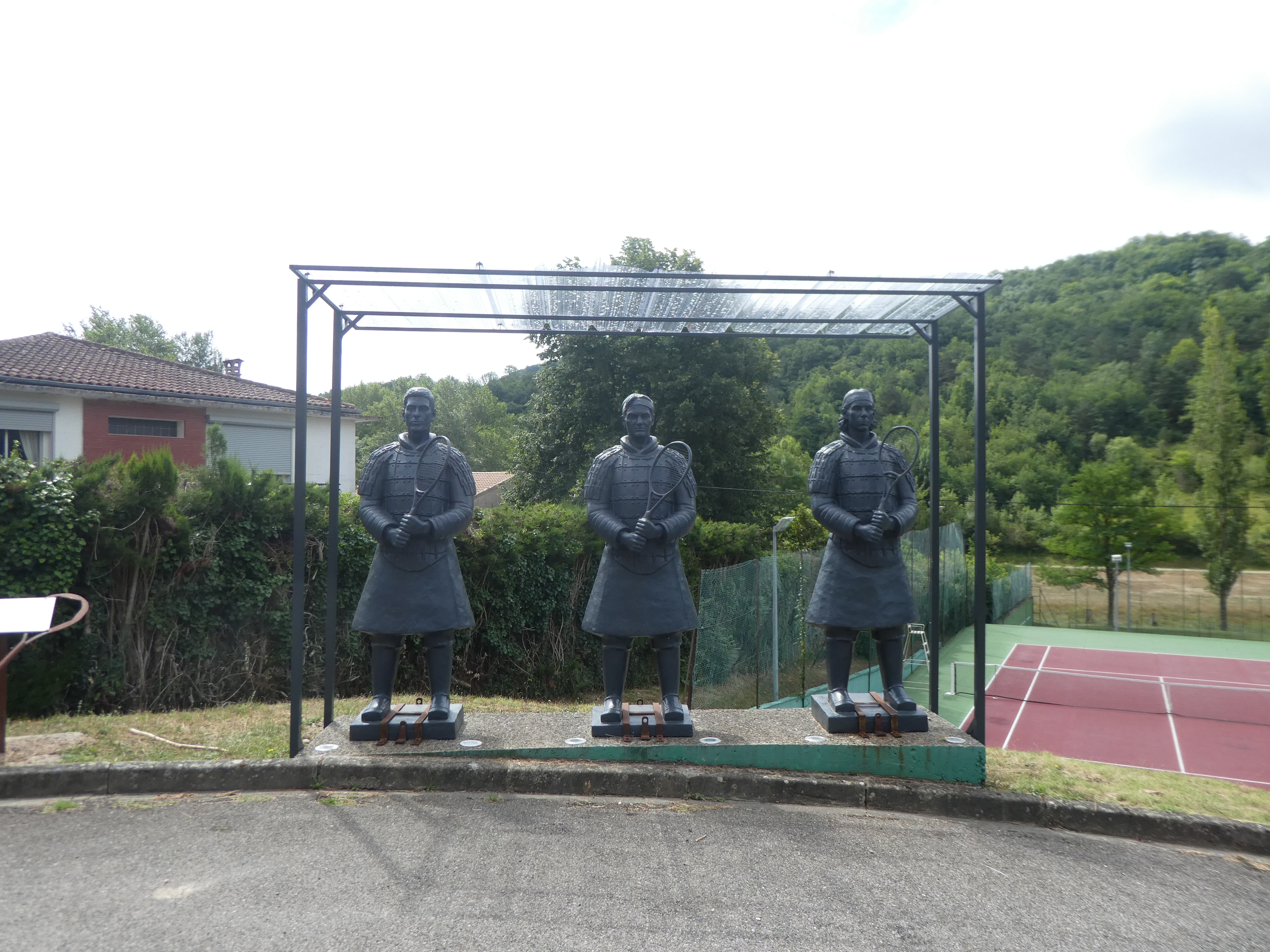 Statue représentant Djokovic, Federer et Nadal située près du club de tennis de Chalabre