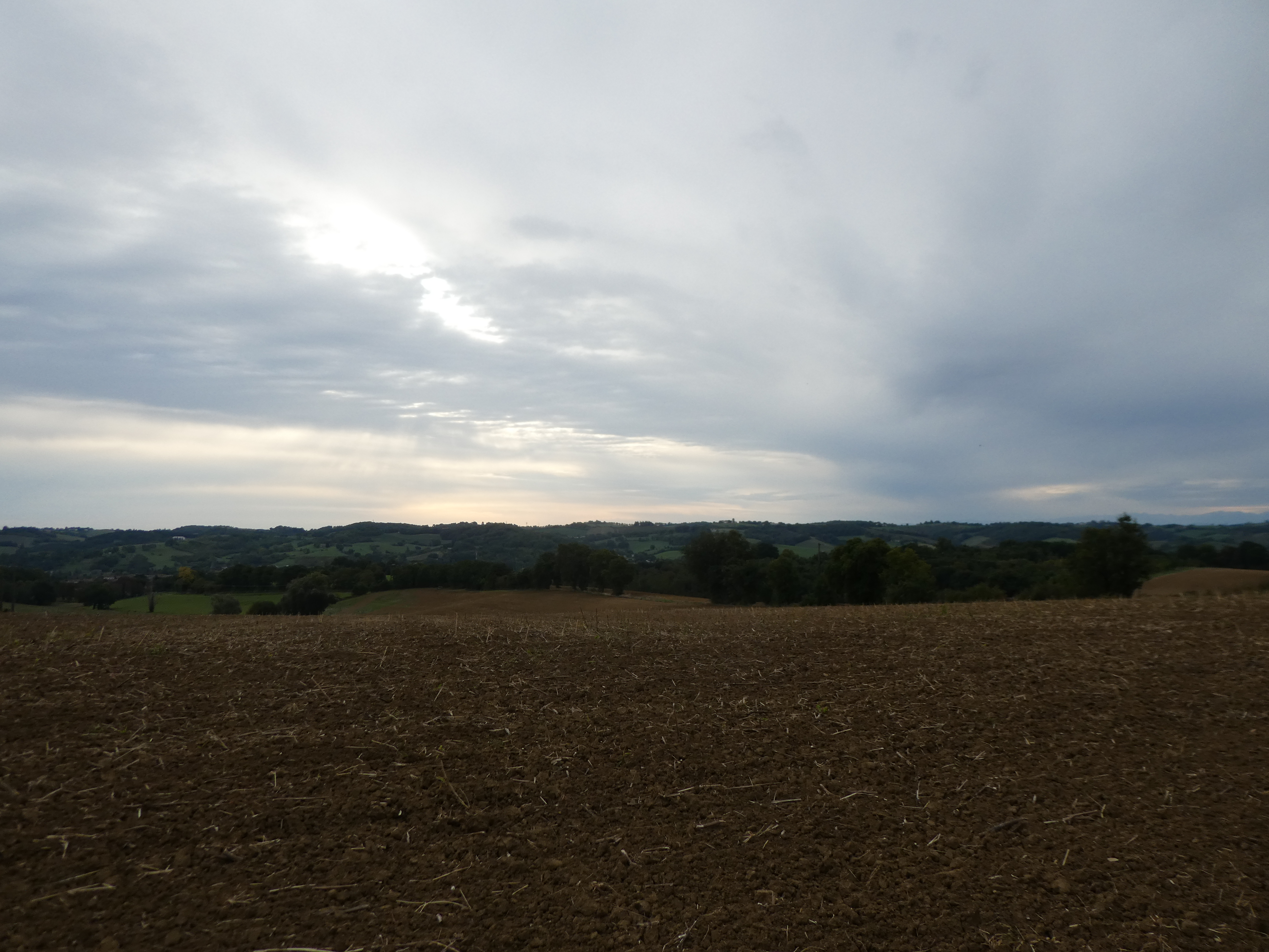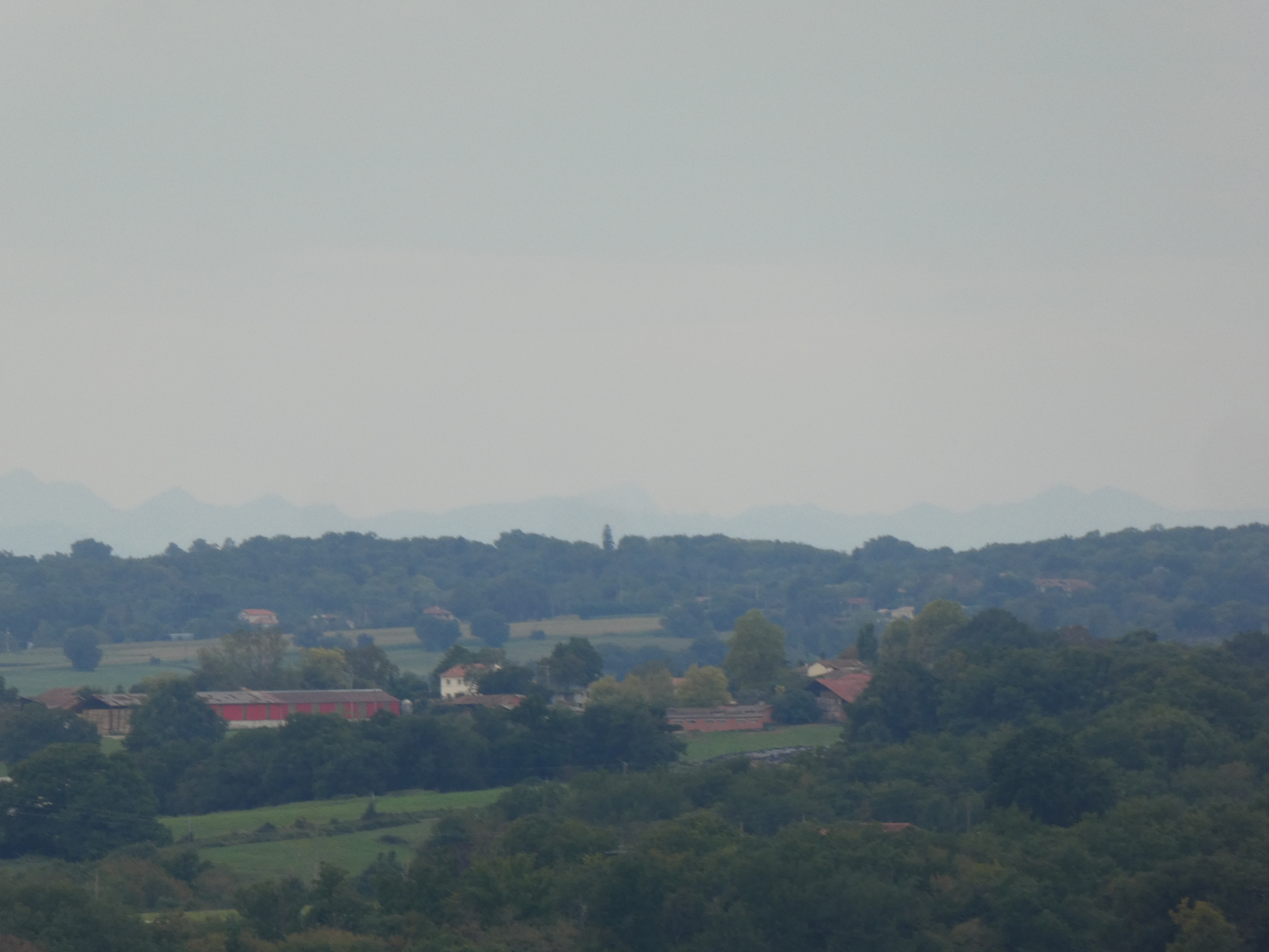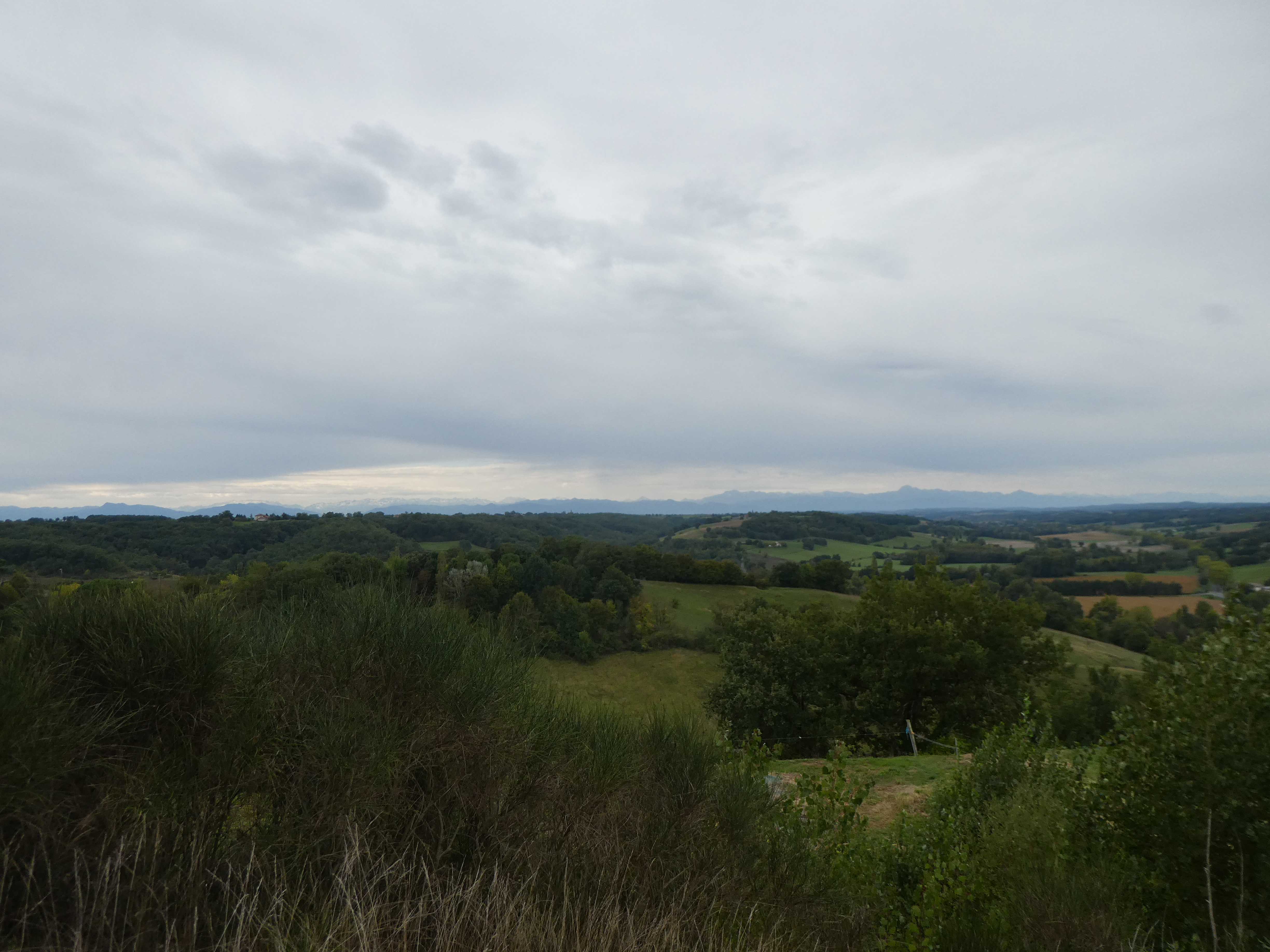 Arrivée au sommet du Plèche (290 m) : beau panorama malgré le ciel couvert sur les sommets de la Haute-Ariège, du Couserans, des Pyrénées Haut-Garonnaises, de la Vallée d'Aure et du Louron, de la Haute-Bigorre, de la Vallée des Gaves, de la Vallée du Valentin et de l'Ouzom ainsi que sur la plaine haut-garonnaise