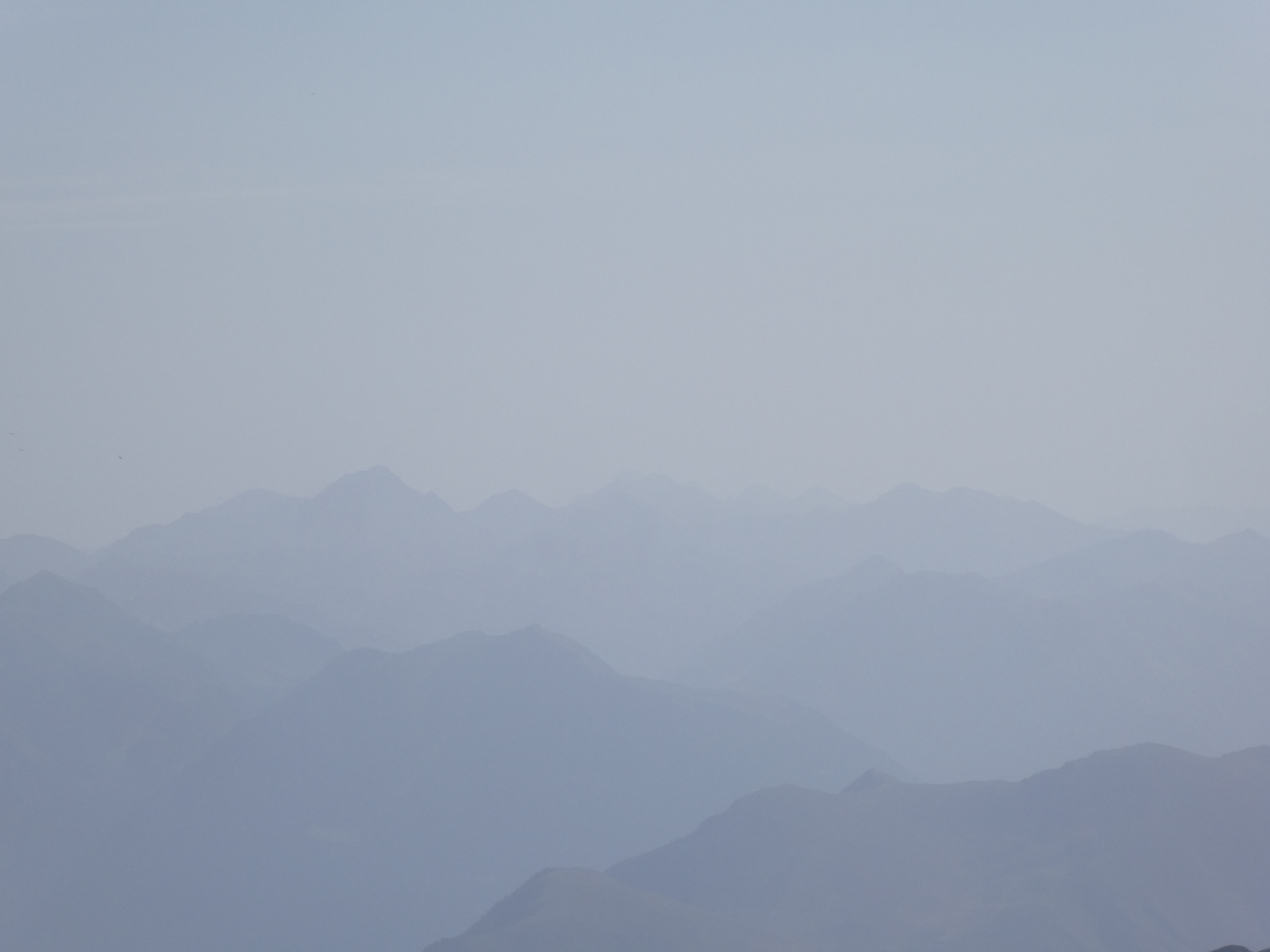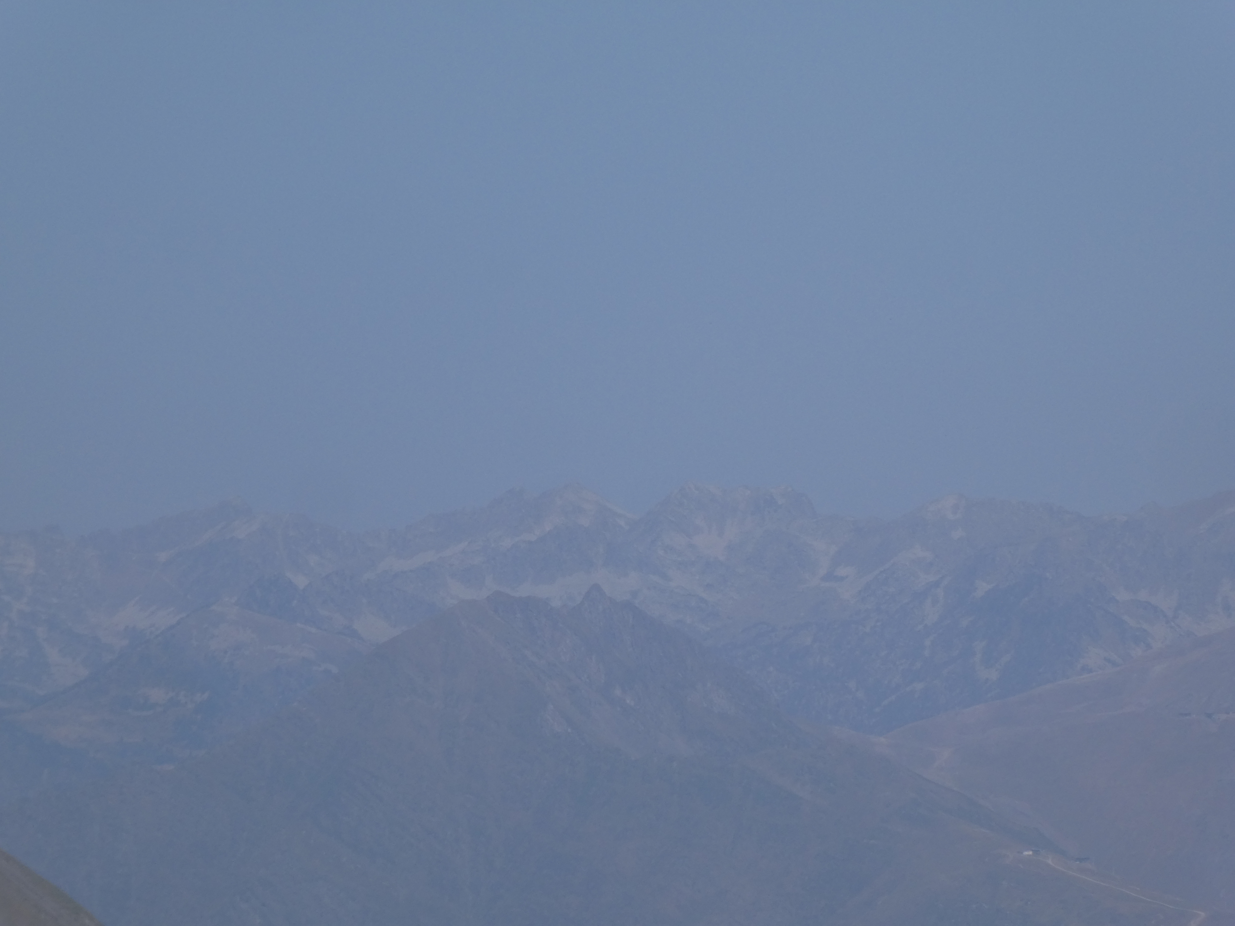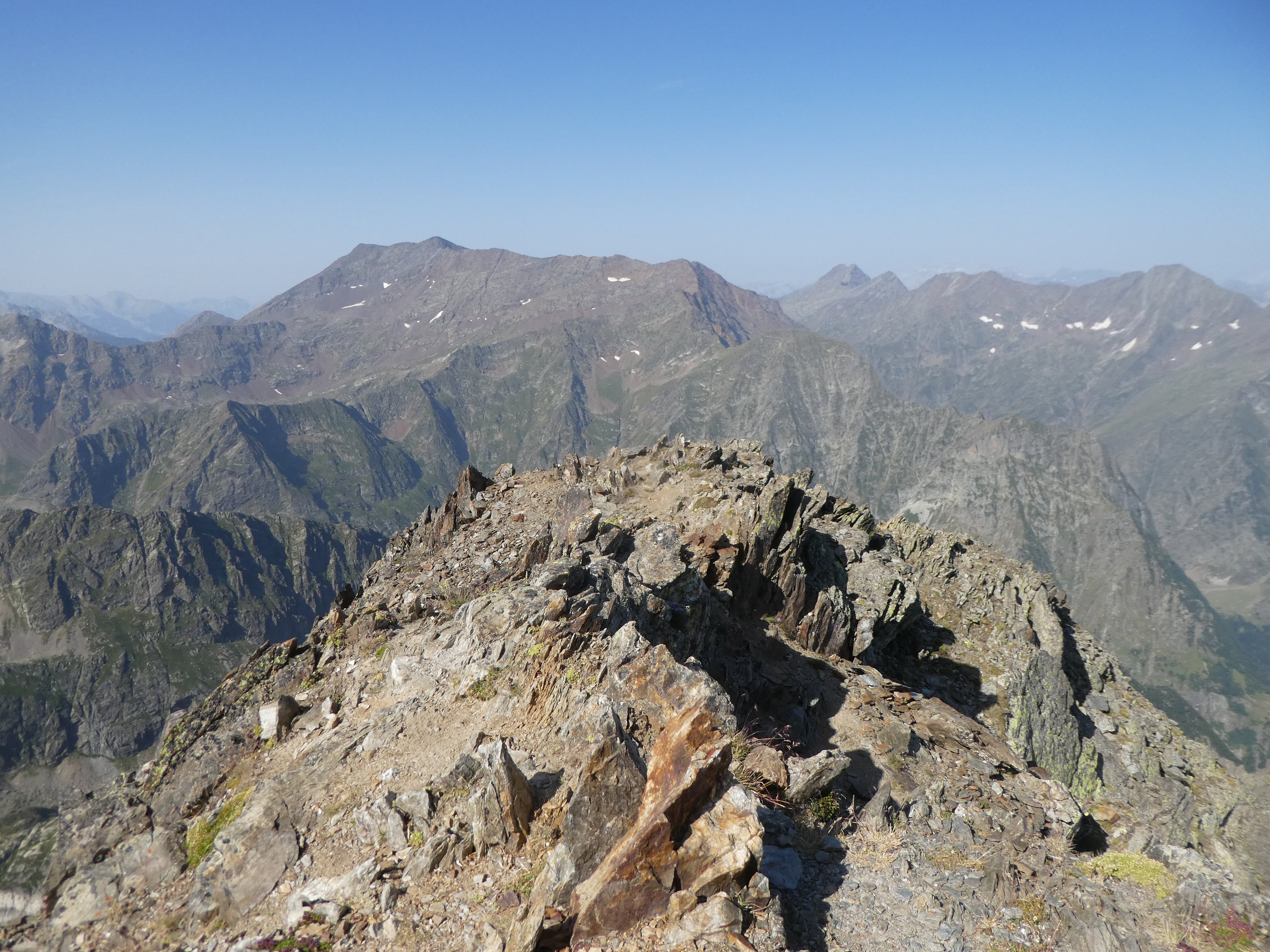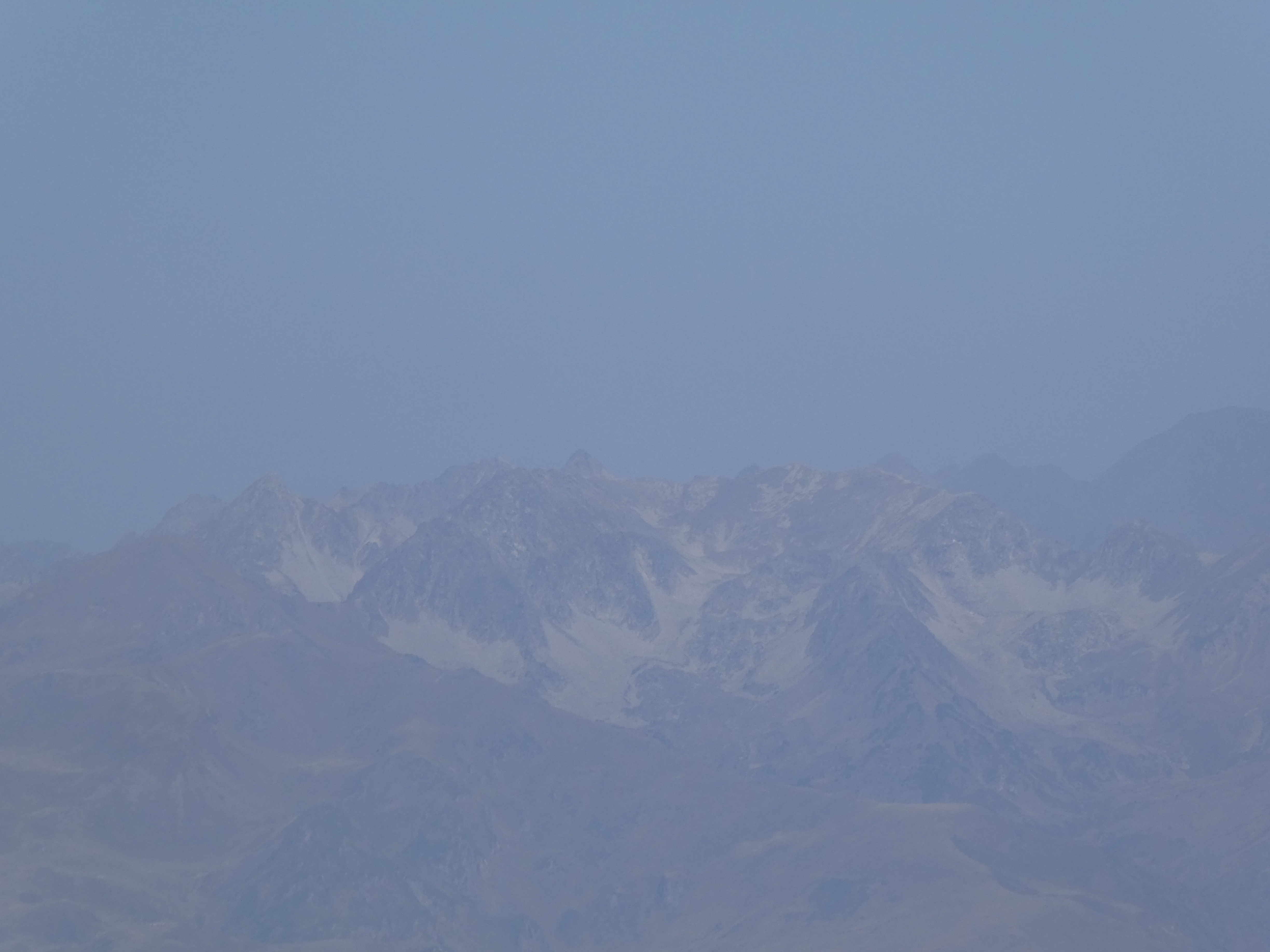 Arrivée au sommet du Pic de Hourgade (2964 m) : beau panorama malgré la présence de brume de chaleur sur les sommets des Pyrénées Haut-Garonnaises, de la Vallée d'Aure et du Louron, de la Vallée des Gaves, de la Haute-Bigorre, du Couserans, du Pallars Sobirà, du Val d'Aran, de la Ribagorza, du Sobrarbe ainsi que sur la plaine haut-garonnaise