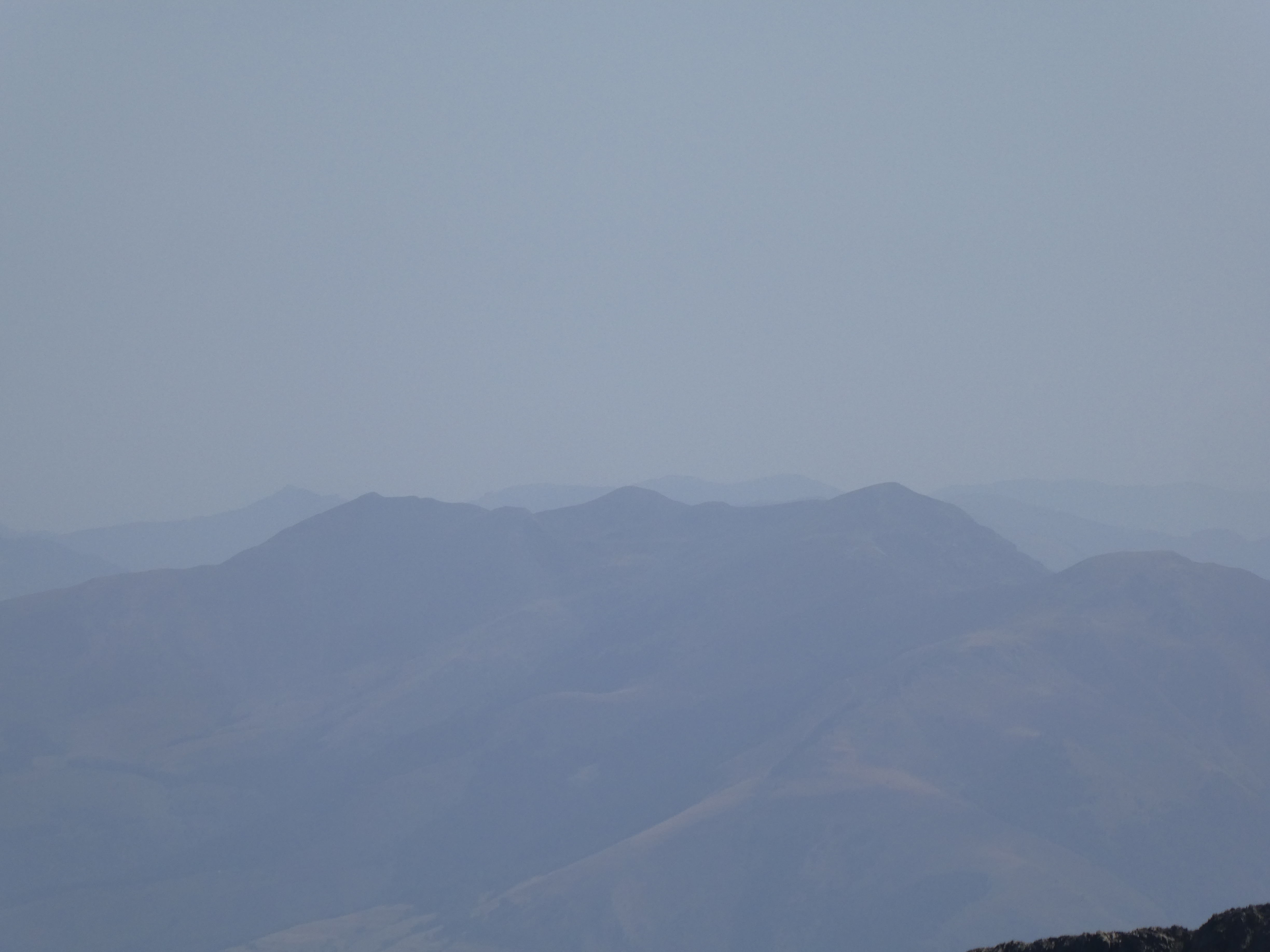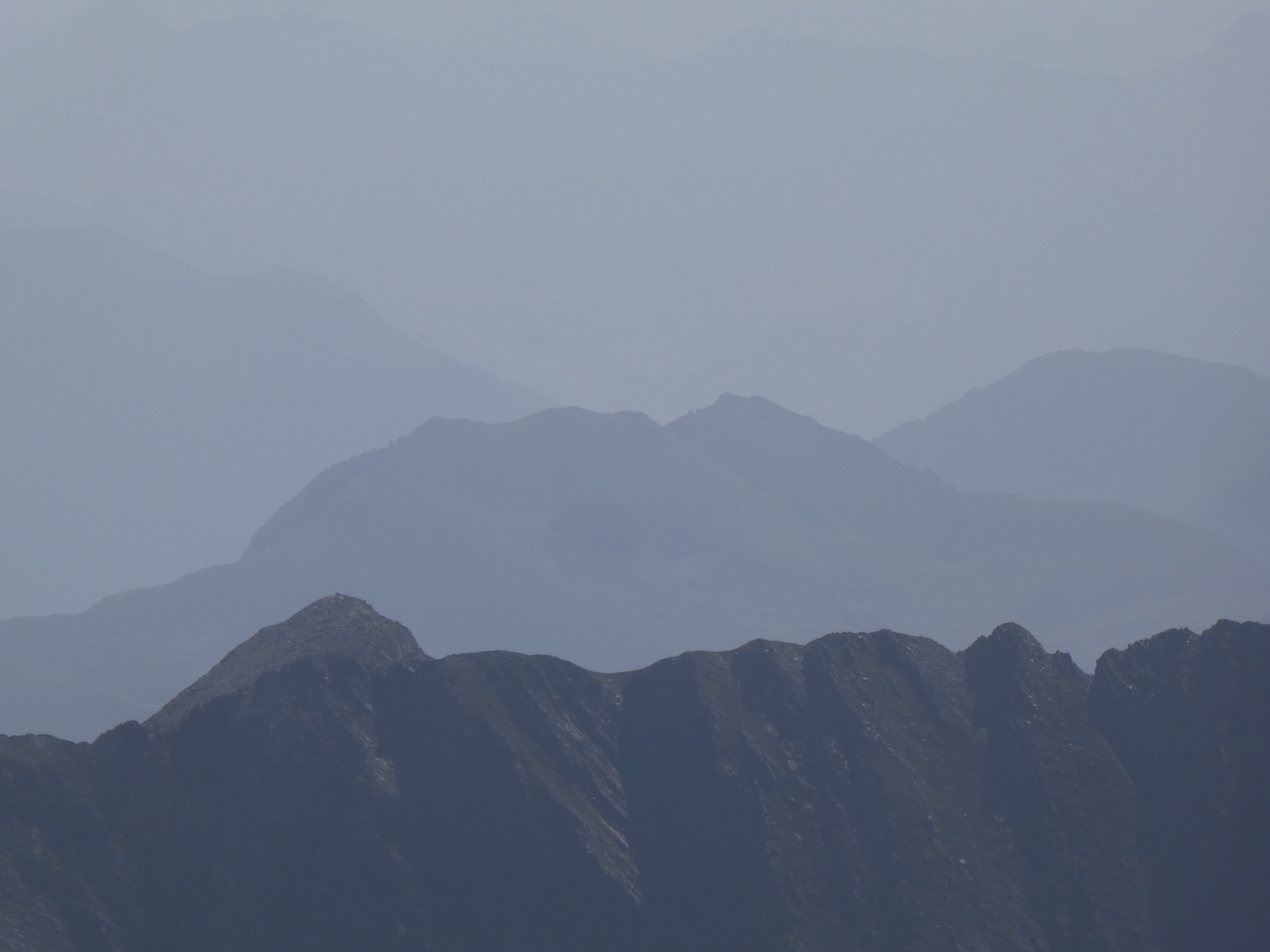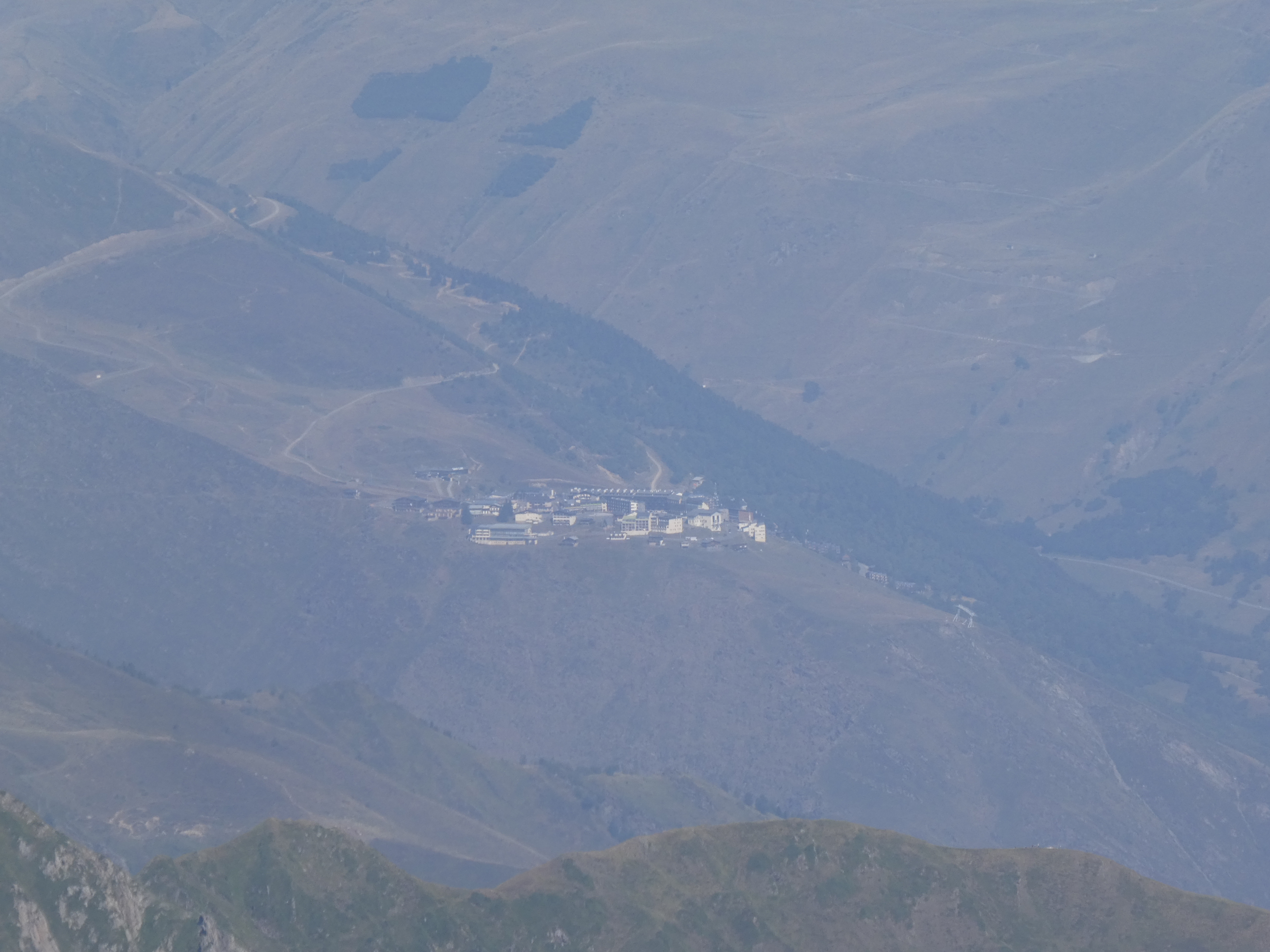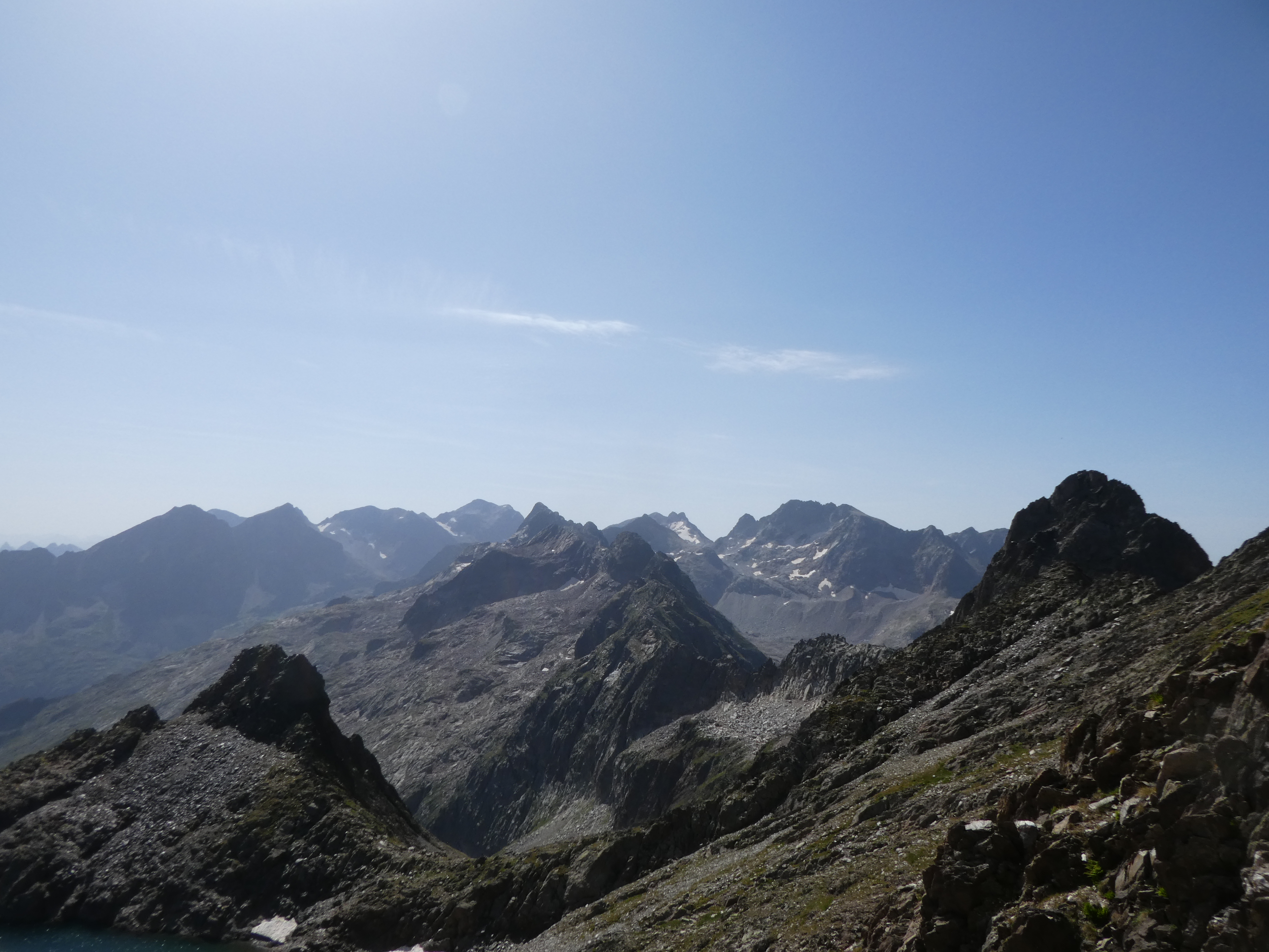 Arrivée au sommet du Pic de Hourgade (2964 m) : beau panorama malgré la présence de brume de chaleur sur les sommets des Pyrénées Haut-Garonnaises, de la Vallée d'Aure et du Louron, de la Vallée des Gaves, de la Haute-Bigorre, du Couserans, du Pallars Sobirà, du Val d'Aran, de la Ribagorza, du Sobrarbe ainsi que sur la plaine haut-garonnaise