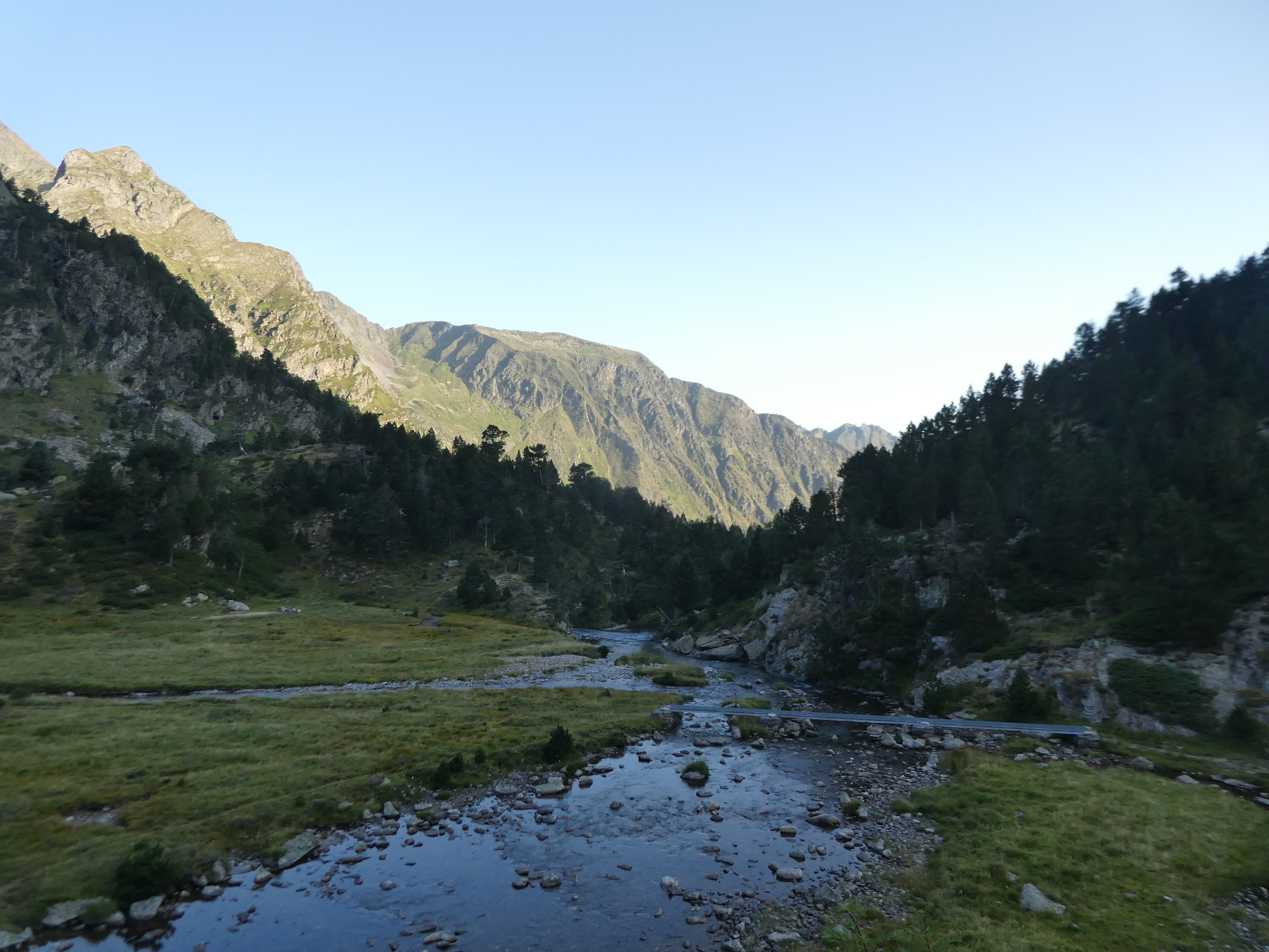 Le Pont d'Astau (1120 m) : suivre la route partant tout droit direction les Granges d'Astau, balisé en rouge et blanc